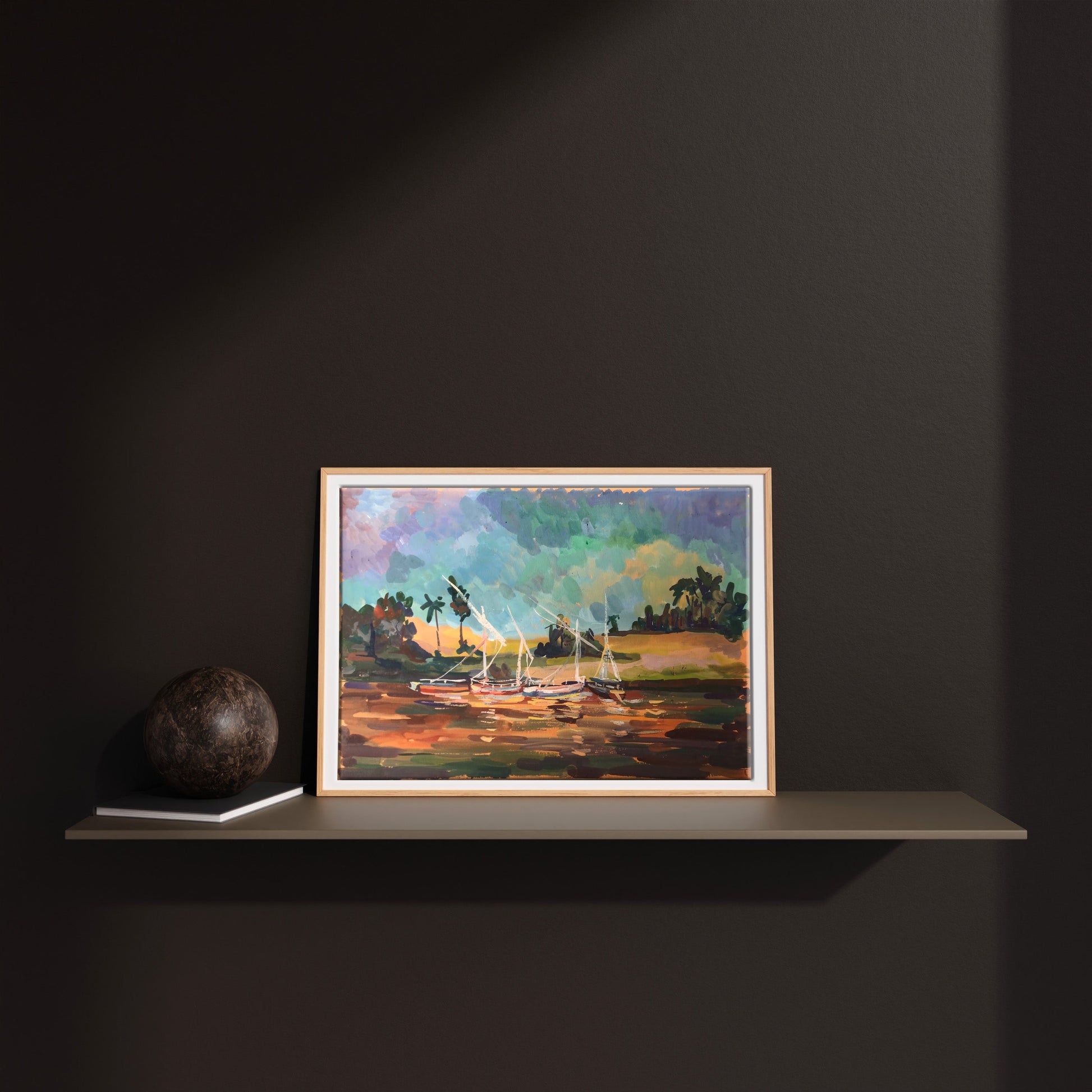 If you're looking for a breathtaking painting that will transport you to the shores of paradise, look no further than "Boats on the Shore." This beautiful painting features boats near the shore, with folded sails and palm trees adding to the idyllic scene. Whether you're looking to add a touch of luxury to your home or office, or simply want a stunning piece of art to admire, "Boats on the Shore" is sure to impress.