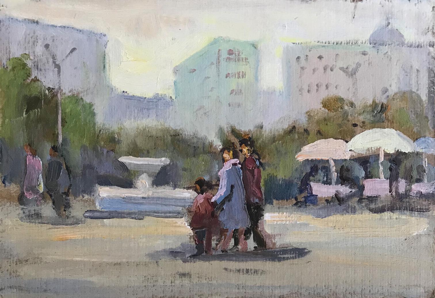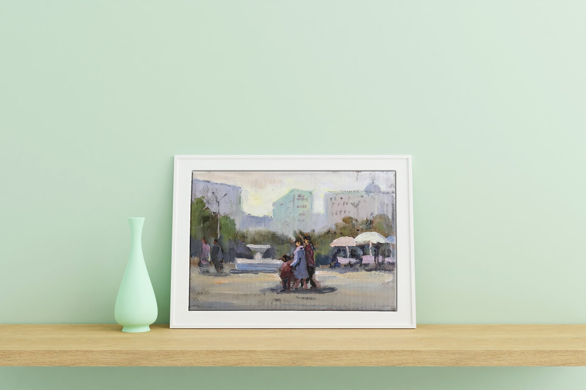 Introducing the painting "Walk through the city center"! This stunning piece captures the hustle and bustle of city life, with people walking through the square and enjoying the summer cafe. The tall houses around the square add to the feeling of grandeur, while the fountain in the center is a refreshing focal point. This painting would make a perfect addition to any home or office, and is sure to add a touch of elegance and sophistication. Order now and bring the energy of the city into your space!