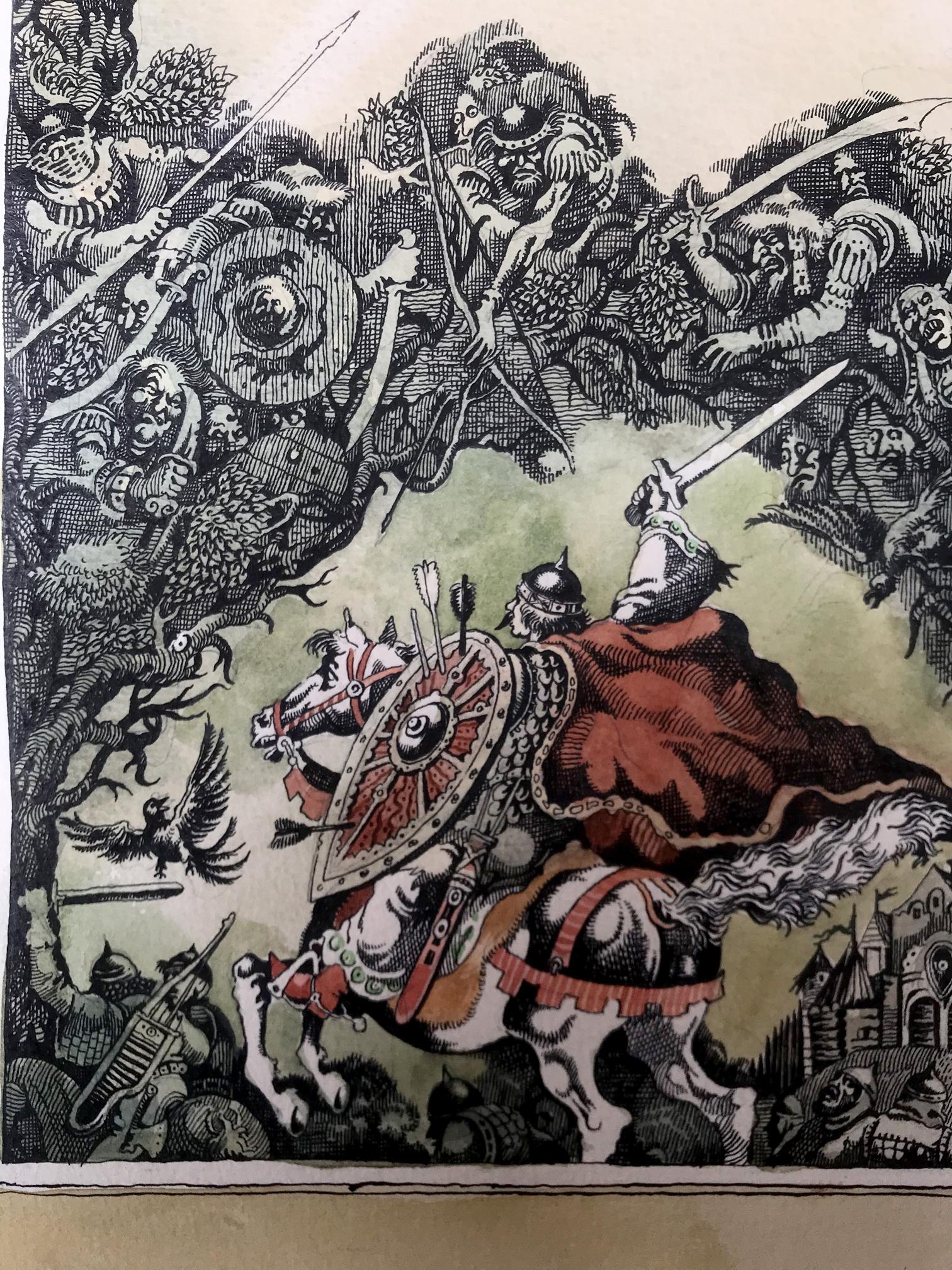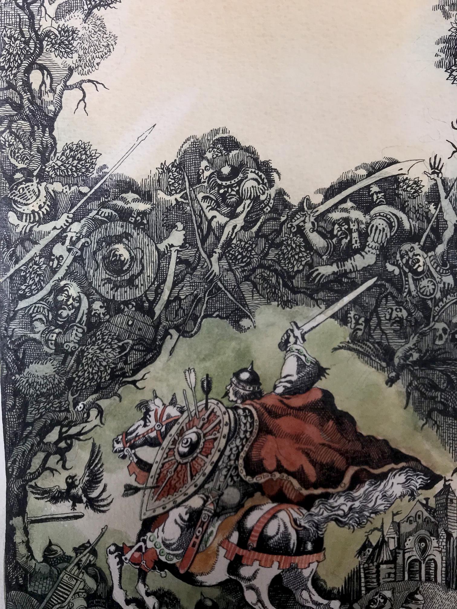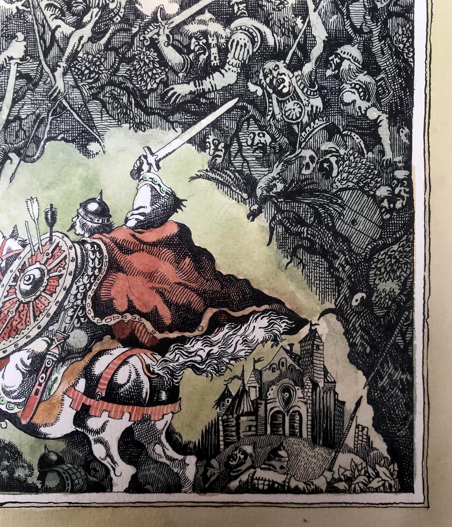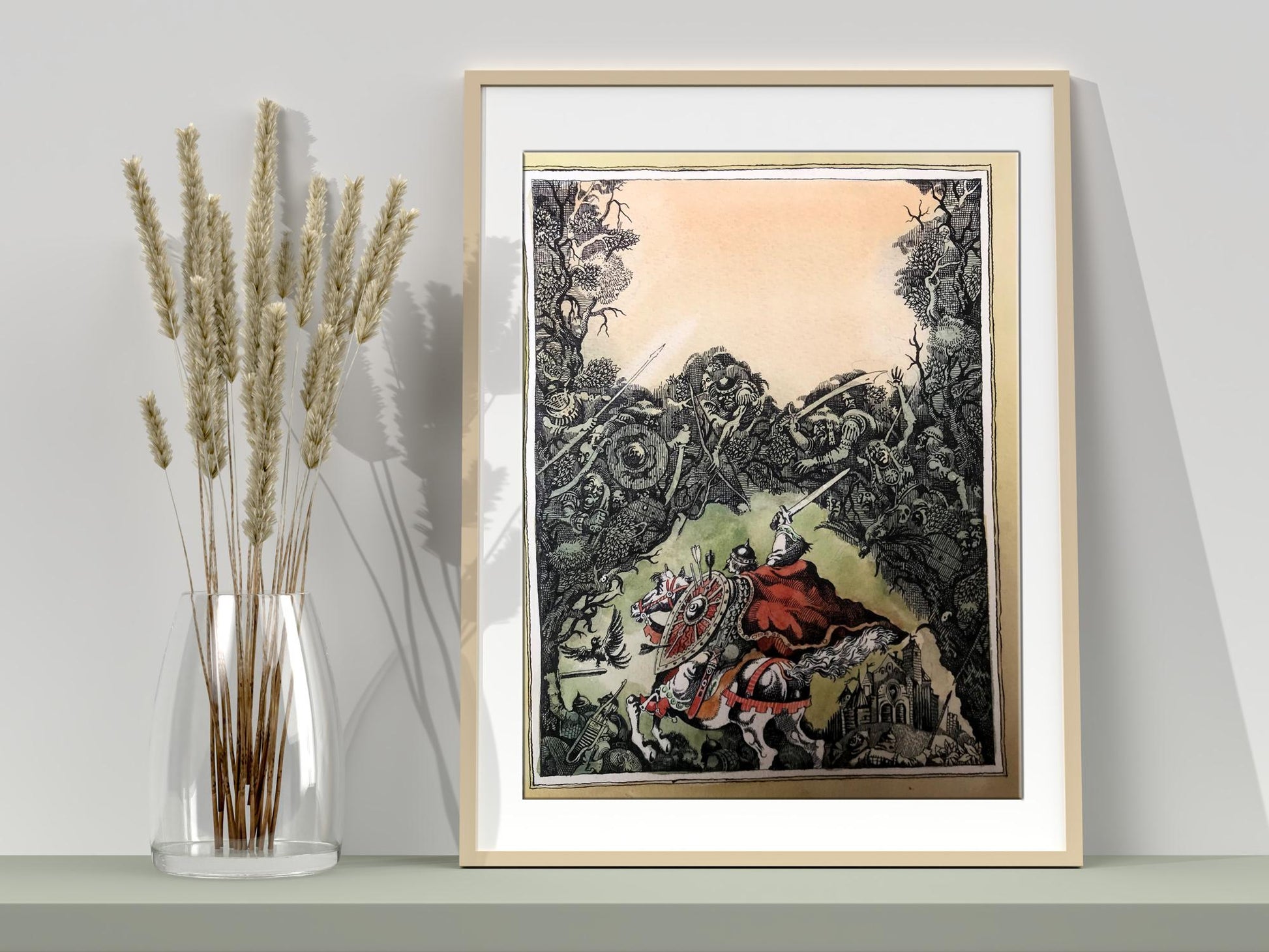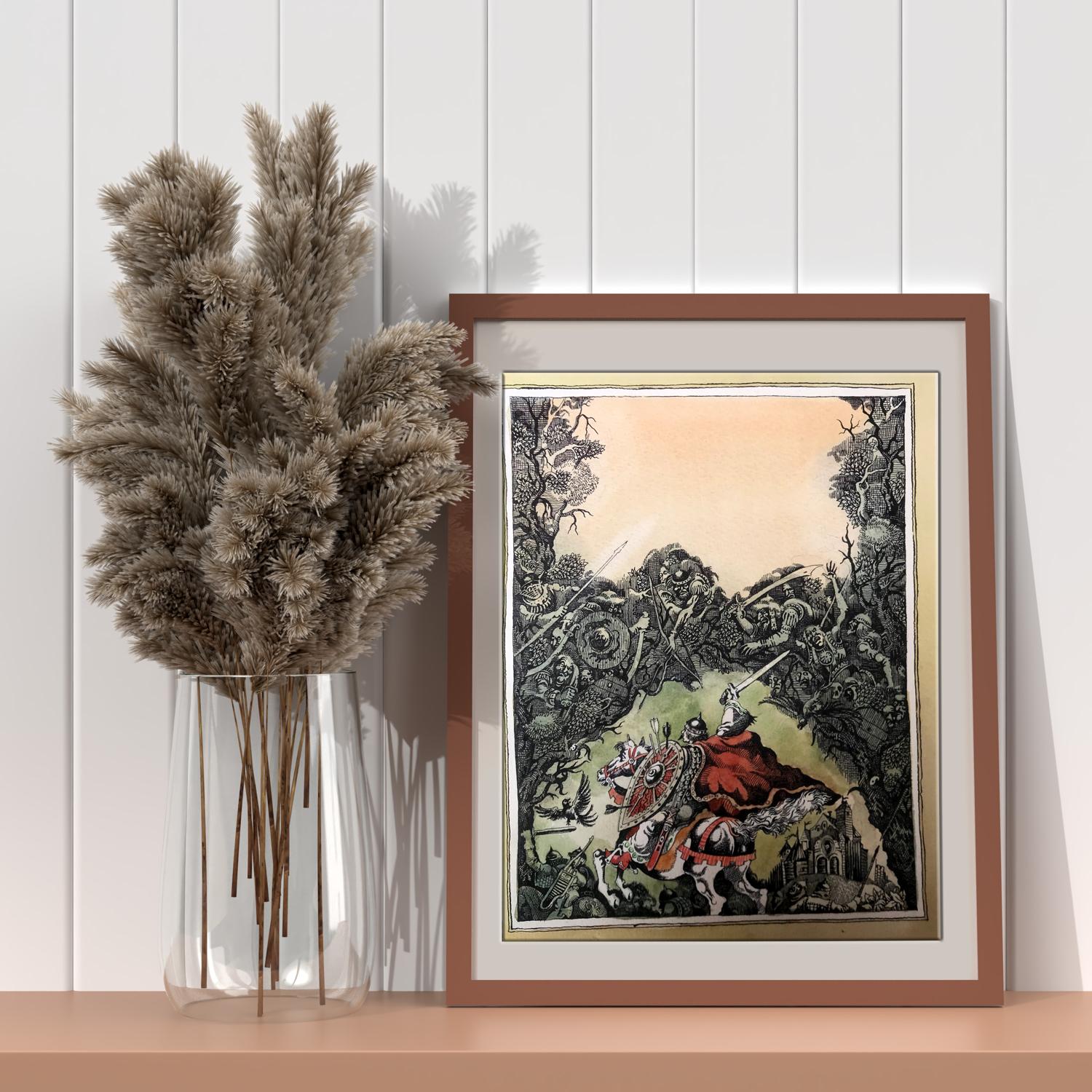 "Fighting the Shadow" is a mesmerizing watercolor painting that captures the essence of a courageous soldier amidst the echoes of a battle. The portrait takes center stage, presenting a commanding figure mounted on a majestic white horse. The soldier, with a resolute gaze and determined expression, wields a shield in one hand and a gleaming sword in the other, embodying strength and unwavering resolve. The artist skillfully employs a vibrant watercolor technique, blending delicate hues and translucent layers to create an ethereal atmosphere. The colors range from soft pastels to intense splashes of deep blues, fiery oranges, and muted greens, mirroring the dynamic emotions and tumultuous energy of the battlefield. Surrounding the central figure, the echoes of the battle come to life on the canvas. Fading in and out of focus, these spectral scenes capture fleeting glimpses of chaos and conflict. The artist adeptly renders the scattered fragments of war, utilizing loose brushstrokes and gentle washes to suggest smoke, swirling dust, and shattered landscapes. Hints of armor, weaponry, and distant soldiers allude to the fierce engagement that occurred. The composition is carefully balanced, with the soldier and his steed positioned in the foreground, commanding attention and serving as a focal point amidst the chaos. The artist's attention to detail is evident in the intricate rendering of the soldier's armor, meticulously capturing the glint of light on metal and the texture of the fabrics. As viewers engage with "Fighting the Shadow," they are drawn into a narrative of bravery and resilience. The painting evokes a sense of both the immediate intensity of the battle and the enduring spirit of the soldier. It invites contemplation on the complexities of conflict, the sacrifices made, and the shadows that soldiers confront and conquer in the pursuit of justice and peace.