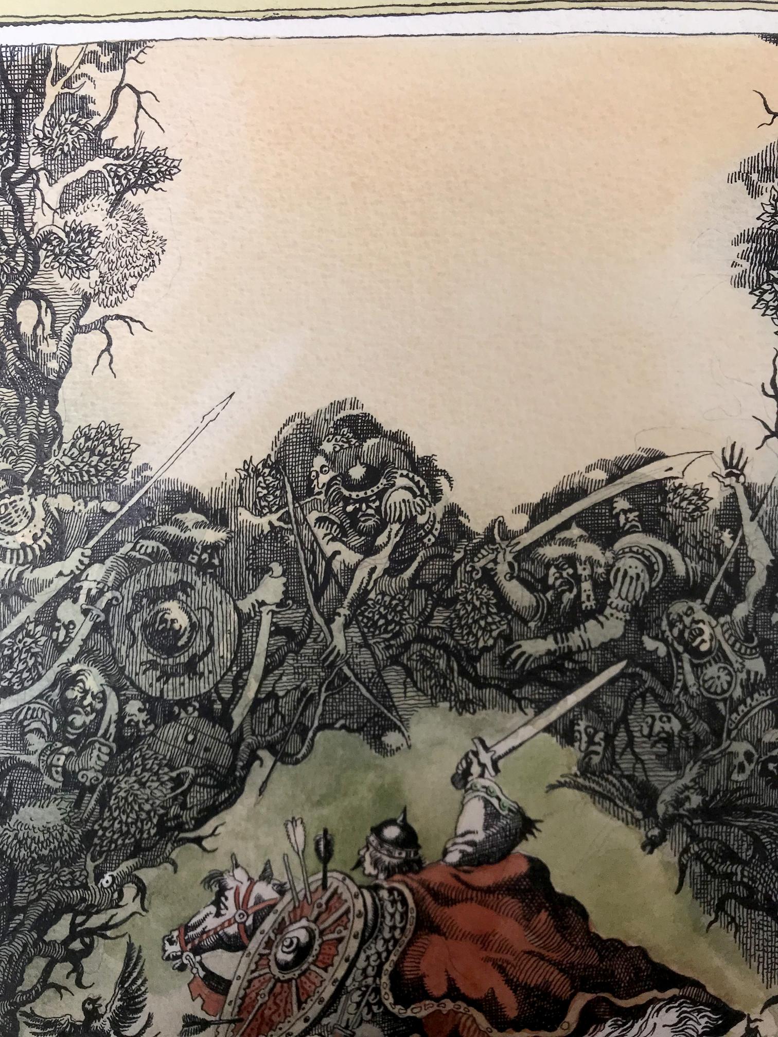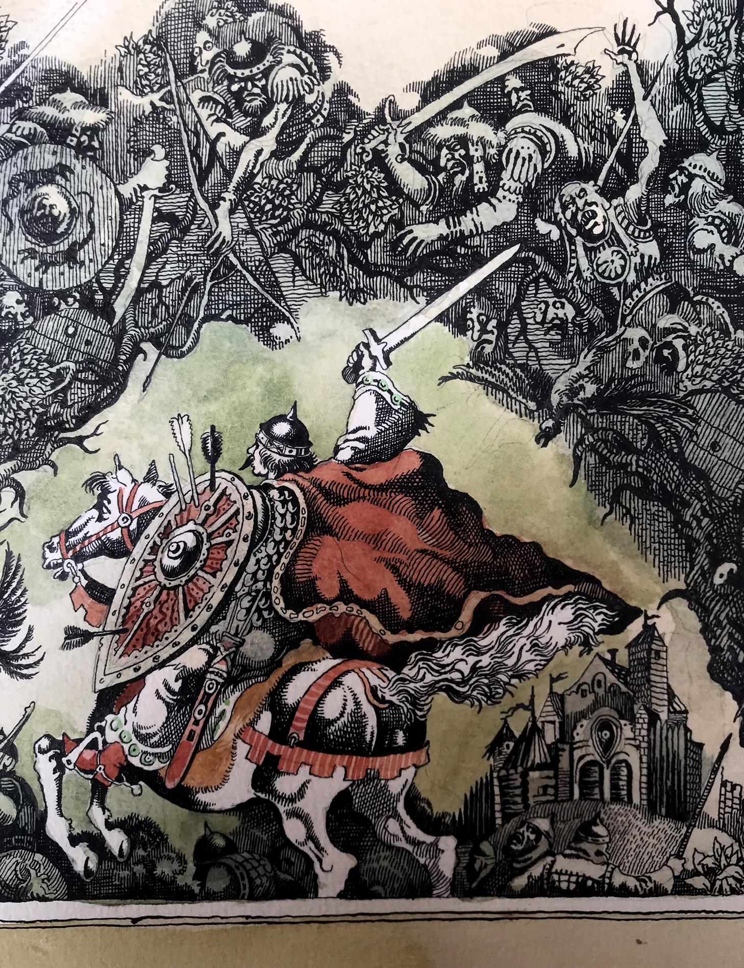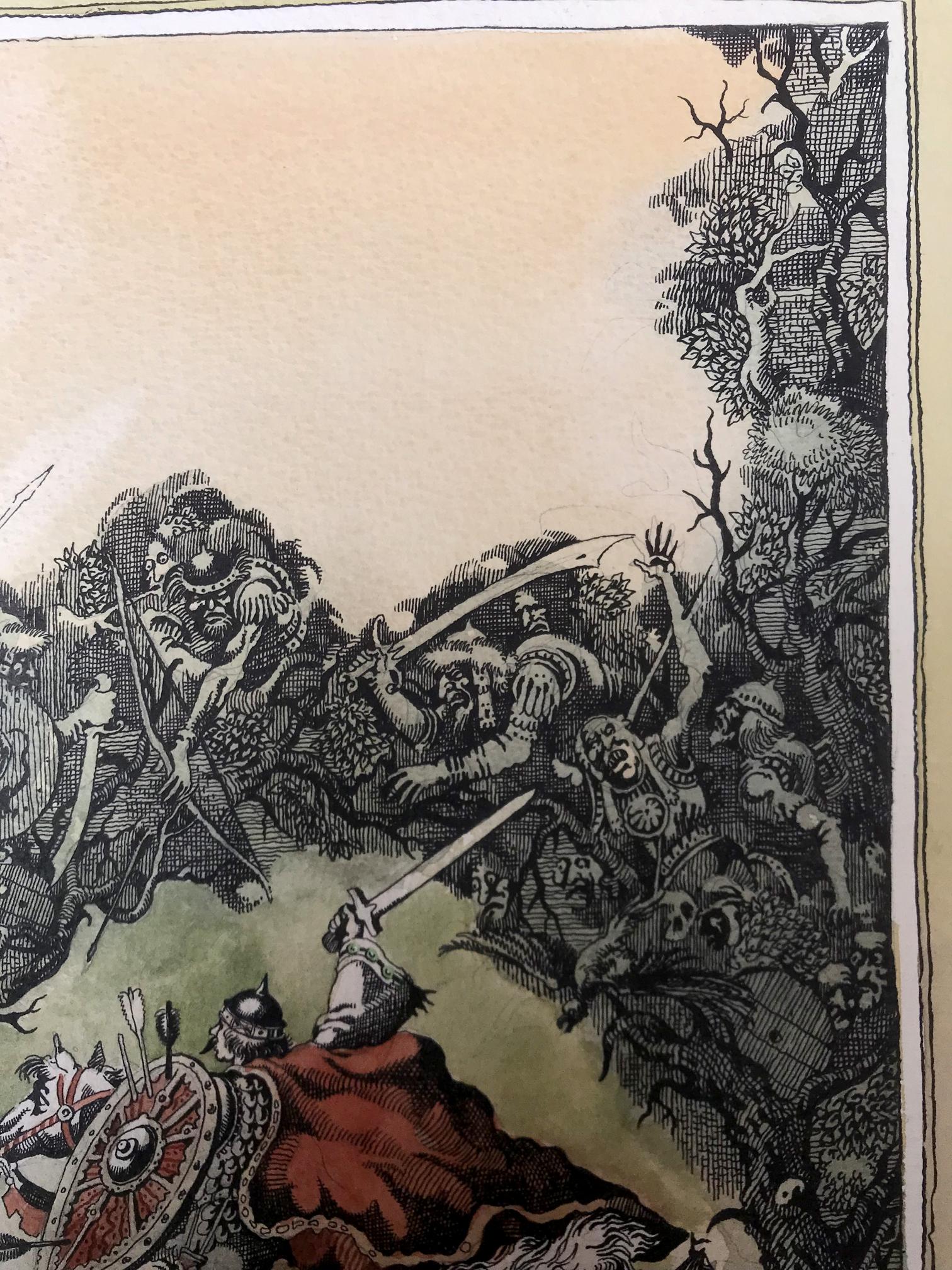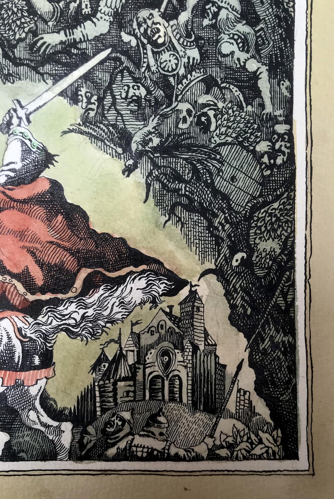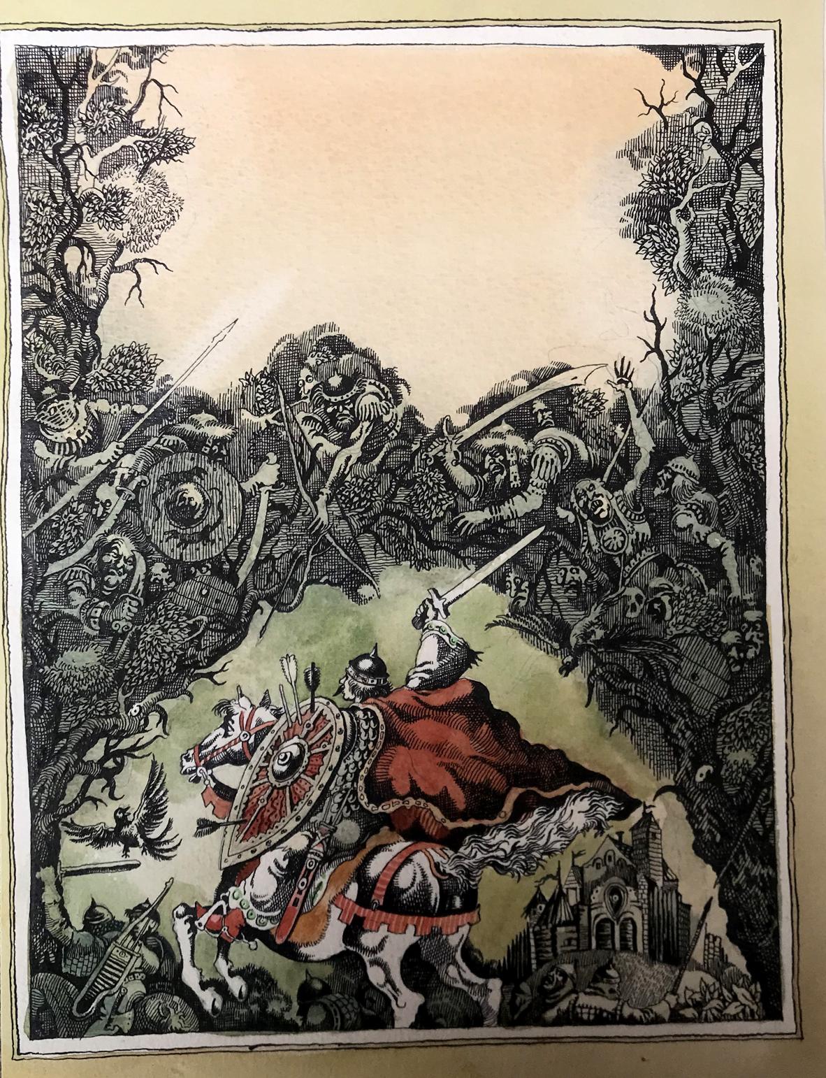 "Fighting the Shadow" is a mesmerizing watercolor painting that captures the essence of a courageous soldier amidst the echoes of a battle. The portrait takes center stage, presenting a commanding figure mounted on a majestic white horse. The soldier, with a resolute gaze and determined expression, wields a shield in one hand and a gleaming sword in the other, embodying strength and unwavering resolve. The artist skillfully employs a vibrant watercolor technique, blending delicate hues and translucent layers to create an ethereal atmosphere. The colors range from soft pastels to intense splashes of deep blues, fiery oranges, and muted greens, mirroring the dynamic emotions and tumultuous energy of the battlefield. Surrounding the central figure, the echoes of the battle come to life on the canvas. Fading in and out of focus, these spectral scenes capture fleeting glimpses of chaos and conflict. The artist adeptly renders the scattered fragments of war, utilizing loose brushstrokes and gentle washes to suggest smoke, swirling dust, and shattered landscapes. Hints of armor, weaponry, and distant soldiers allude to the fierce engagement that occurred. The composition is carefully balanced, with the soldier and his steed positioned in the foreground, commanding attention and serving as a focal point amidst the chaos. The artist's attention to detail is evident in the intricate rendering of the soldier's armor, meticulously capturing the glint of light on metal and the texture of the fabrics. As viewers engage with "Fighting the Shadow," they are drawn into a narrative of bravery and resilience. The painting evokes a sense of both the immediate intensity of the battle and the enduring spirit of the soldier. It invites contemplation on the complexities of conflict, the sacrifices made, and the shadows that soldiers confront and conquer in the pursuit of justice and peace.