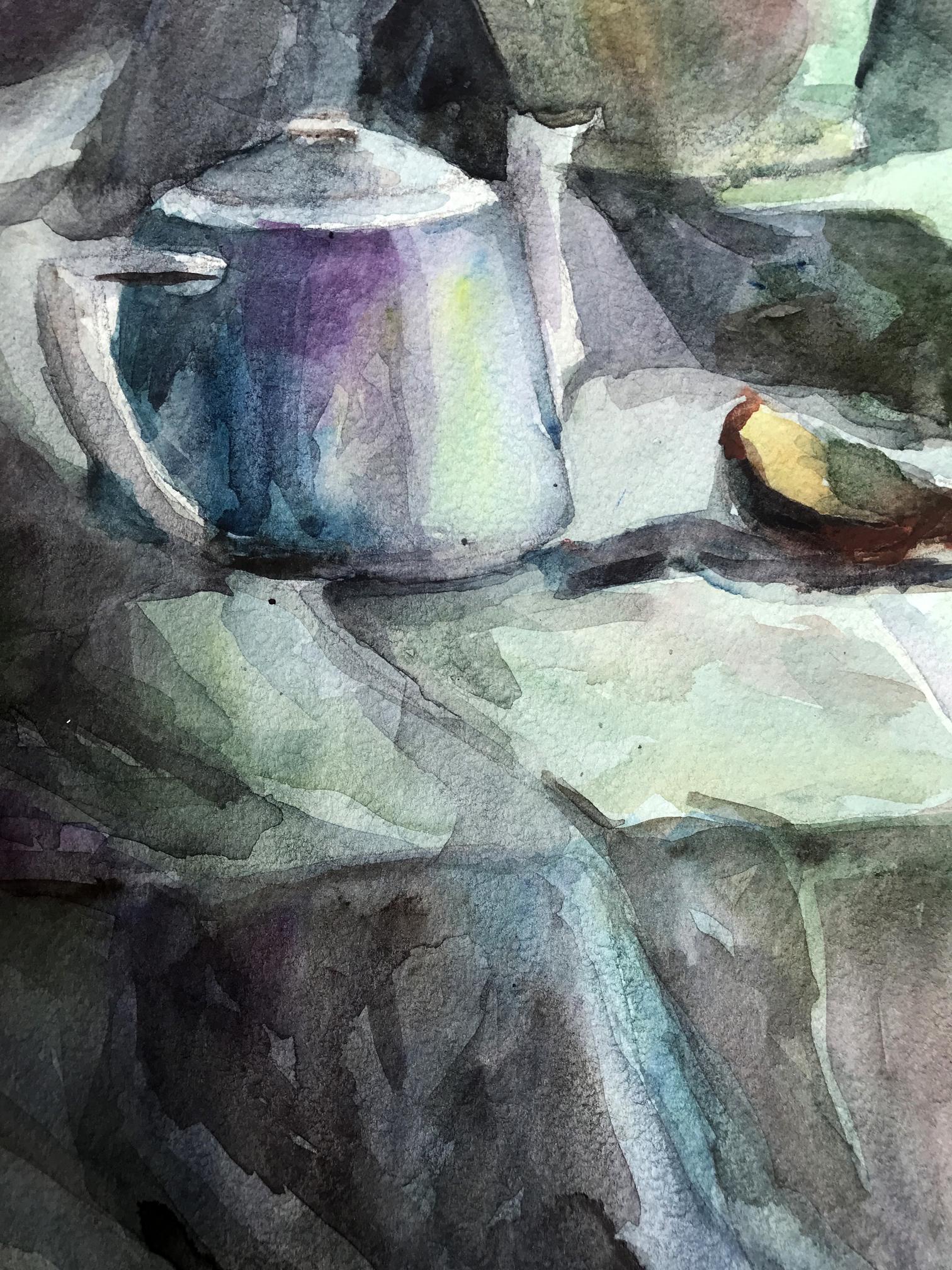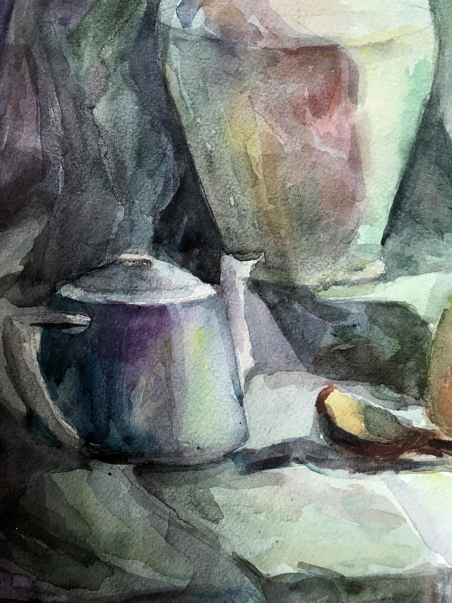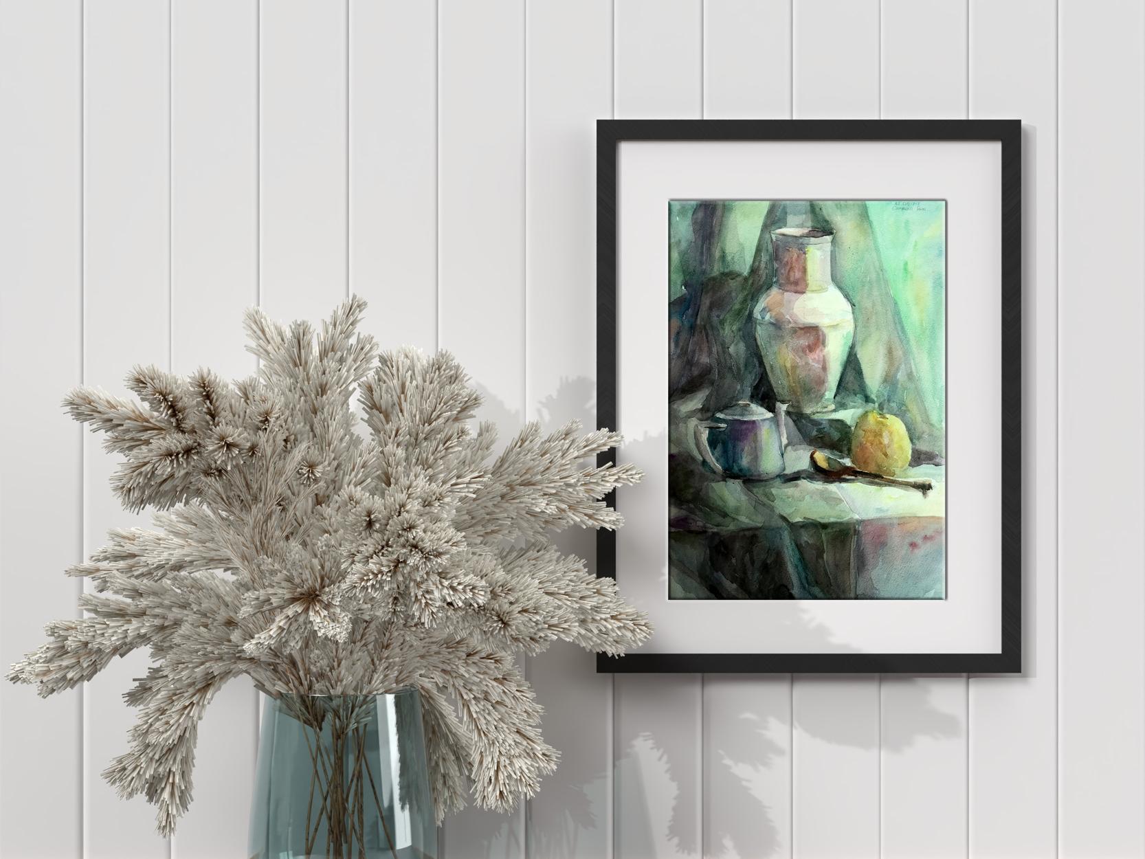 The watercolor painting depicts a serene still life scene with a charming gray teapot and a crisp green apple positioned in the foreground. The teapot appears weathered, with a rustic and worn appearance. The apple, with its bright green hue, stands out against the muted tones of the teapot. The artist has skillfully captured the subtle play of light and shadow on the surface of the teapot, with delicate brushstrokes that create a soft texture. Adjacent to the teapot, is a white jug with a swampy green hue. The jug appears to be made of ceramic, and it has a simple, yet elegant design. The artist has given the jug a slightly blurred appearance, which enhances the sense of depth and realism in the painting. The color of the jug complements the muted tones of the background, which is also swampy in color. The background is a soft blend of green and gray tones, with a subtle texture that adds depth to the painting. The artist has used the background to create a sense of space and distance, which gives the painting a three-dimensional feel. Overall, the painting is a beautiful composition of muted colors, delicate brushstrokes, and subtle textures. The artist has skillfully captured the stillness of the scene, and the result is a painting that evokes a sense of peace and tranquility.