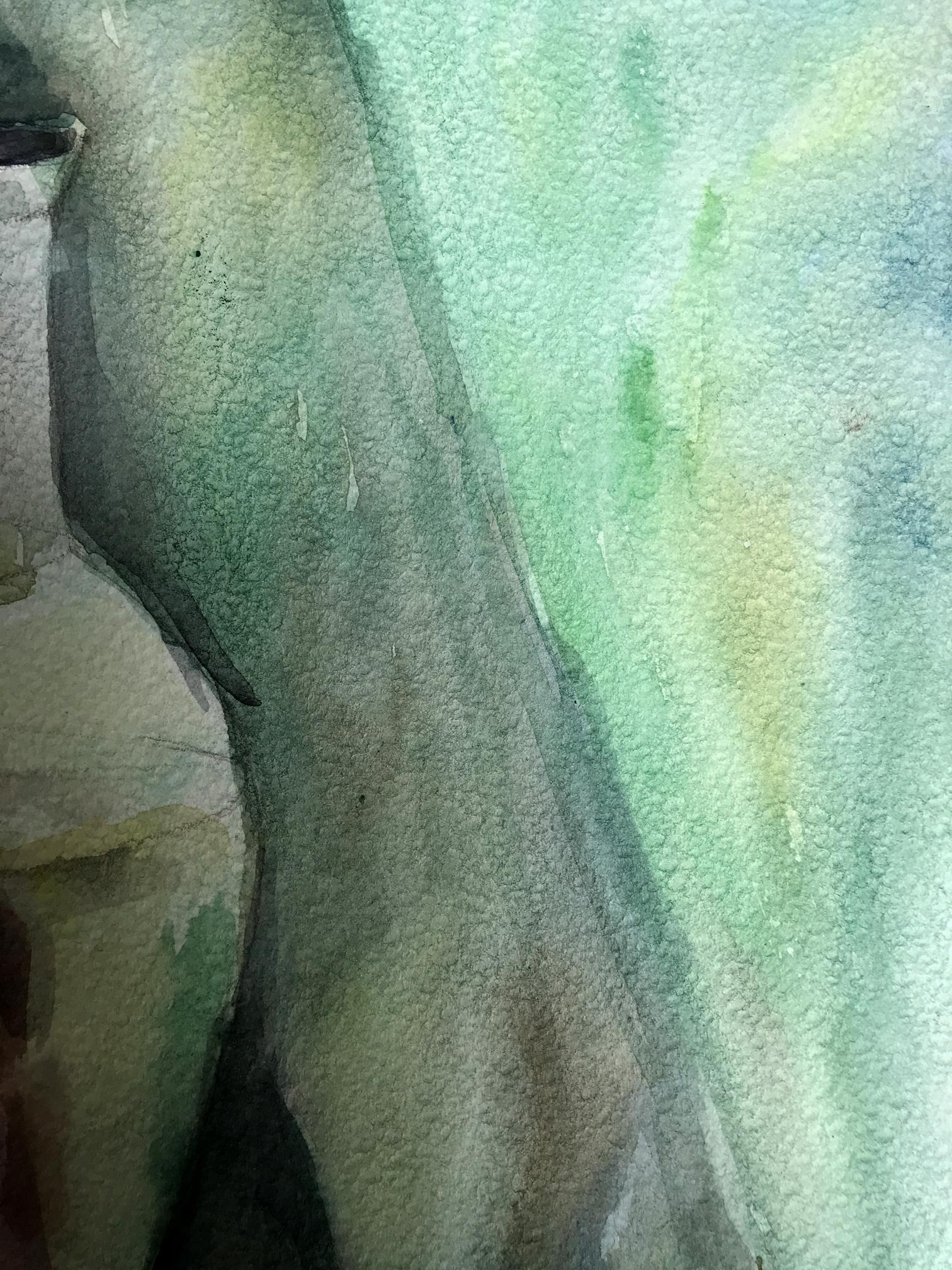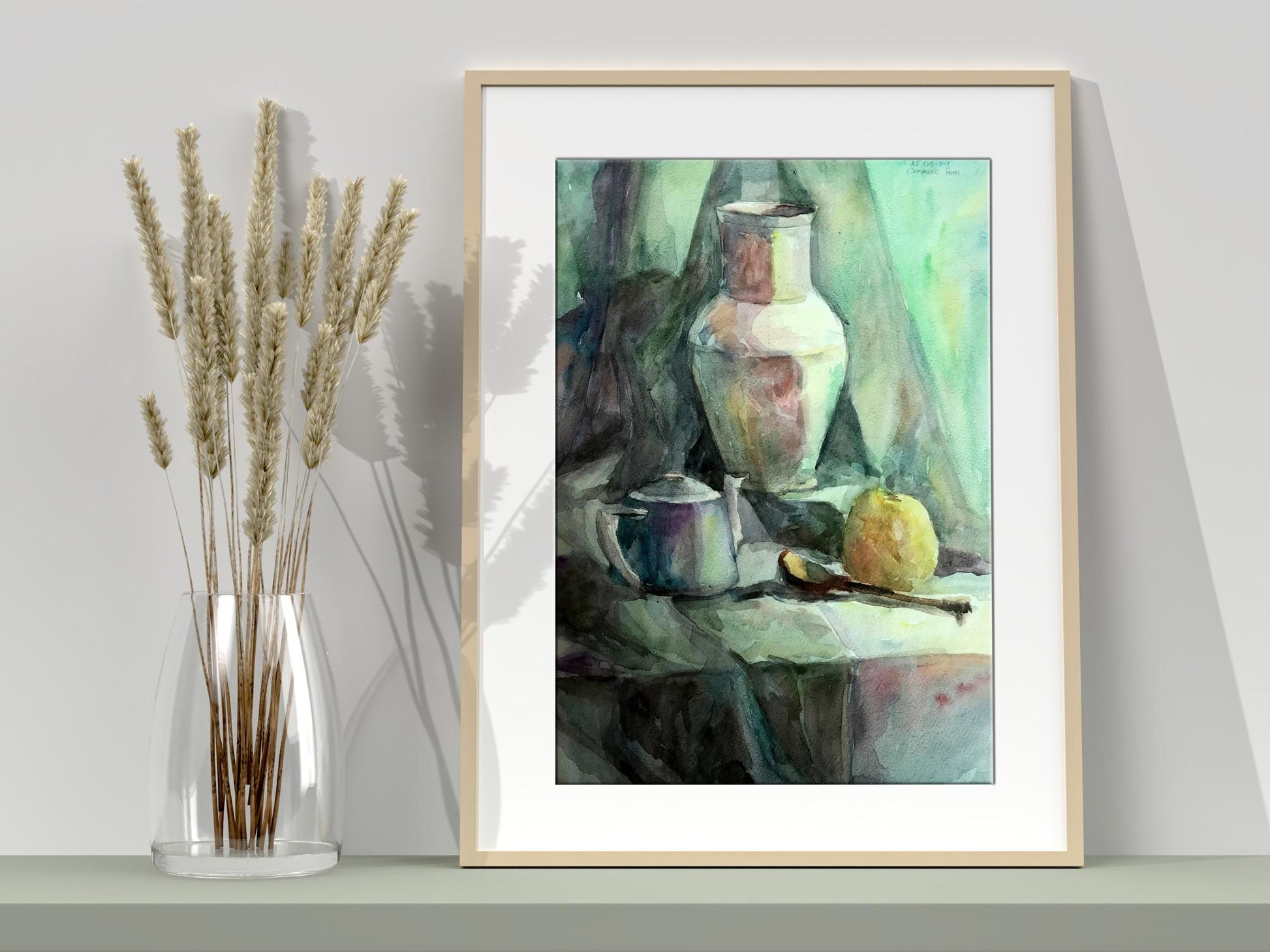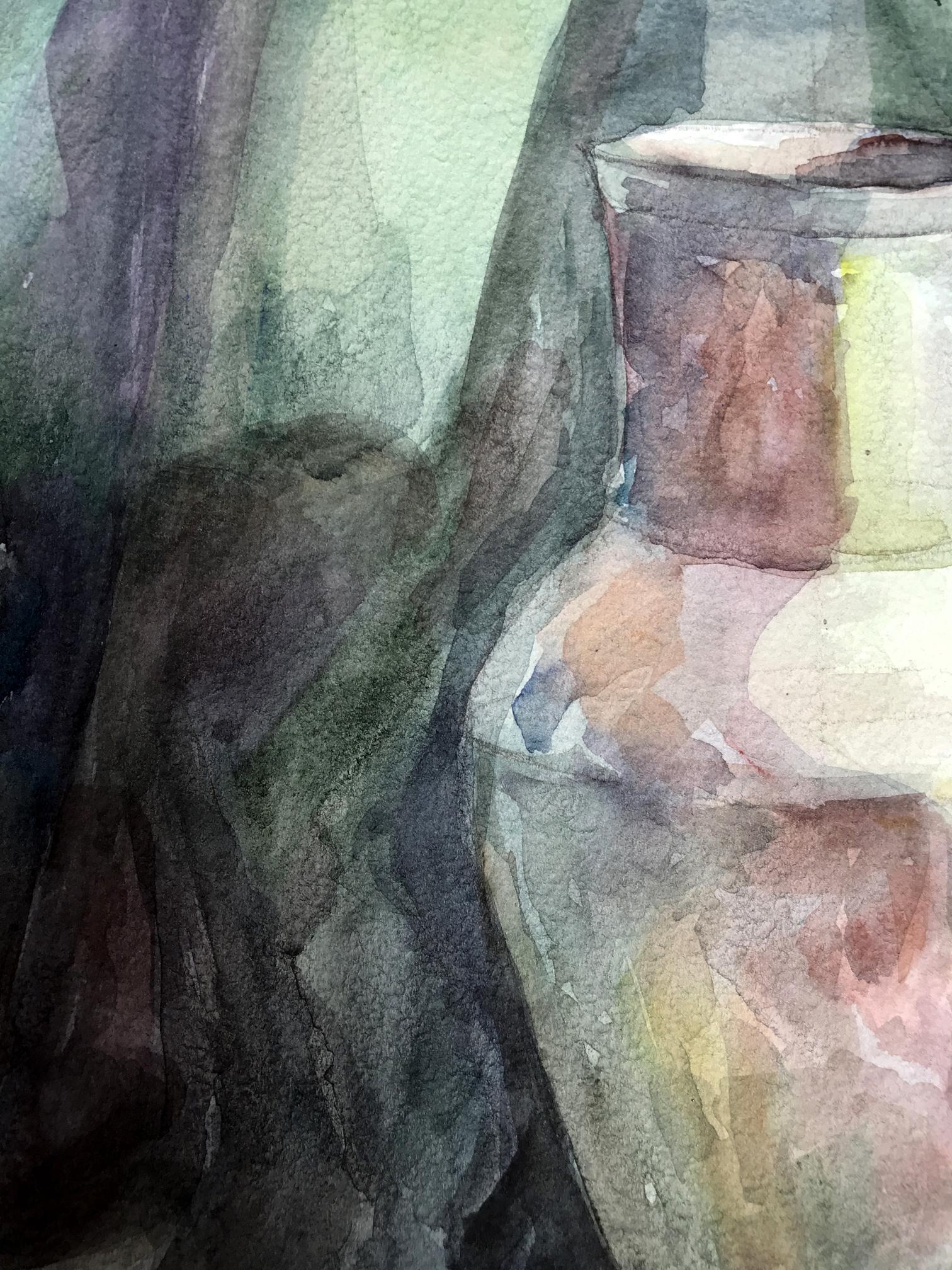 The watercolor painting depicts a serene still life scene with a charming gray teapot and a crisp green apple positioned in the foreground. The teapot appears weathered, with a rustic and worn appearance. The apple, with its bright green hue, stands out against the muted tones of the teapot. The artist has skillfully captured the subtle play of light and shadow on the surface of the teapot, with delicate brushstrokes that create a soft texture. Adjacent to the teapot, is a white jug with a swampy green hue. The jug appears to be made of ceramic, and it has a simple, yet elegant design. The artist has given the jug a slightly blurred appearance, which enhances the sense of depth and realism in the painting. The color of the jug complements the muted tones of the background, which is also swampy in color. The background is a soft blend of green and gray tones, with a subtle texture that adds depth to the painting. The artist has used the background to create a sense of space and distance, which gives the painting a three-dimensional feel. Overall, the painting is a beautiful composition of muted colors, delicate brushstrokes, and subtle textures. The artist has skillfully captured the stillness of the scene, and the result is a painting that evokes a sense of peace and tranquility.