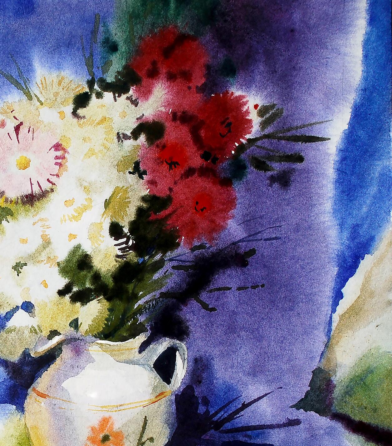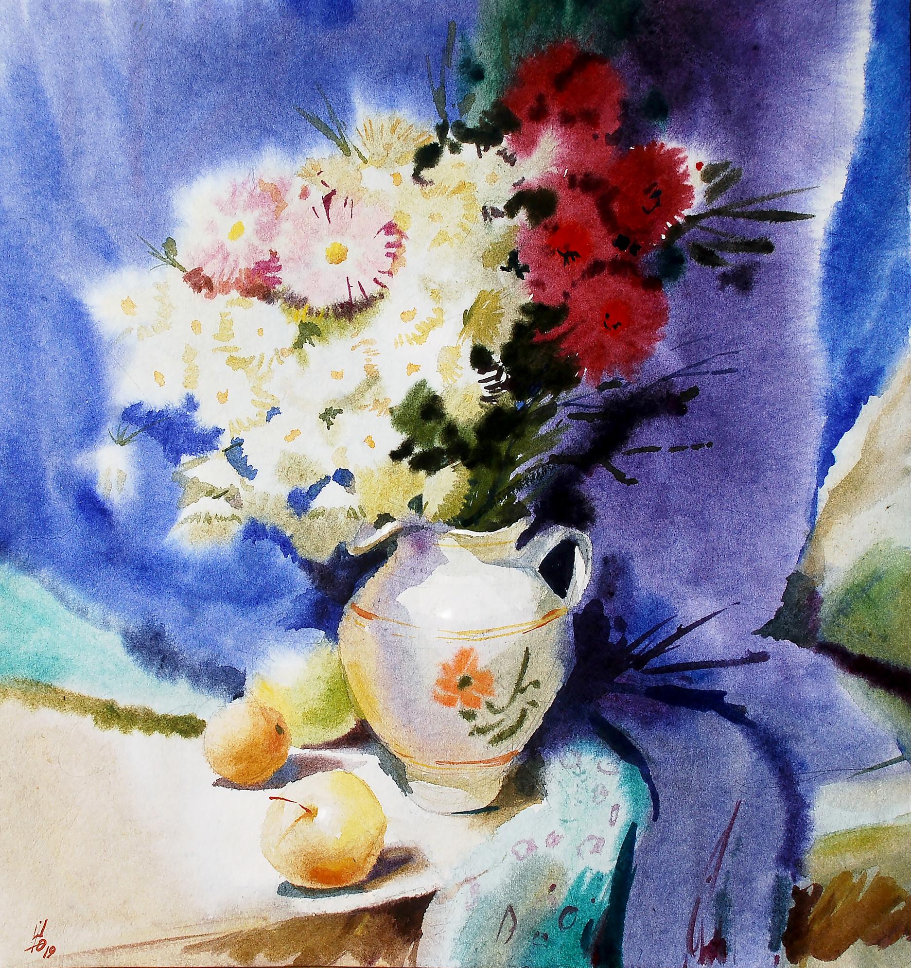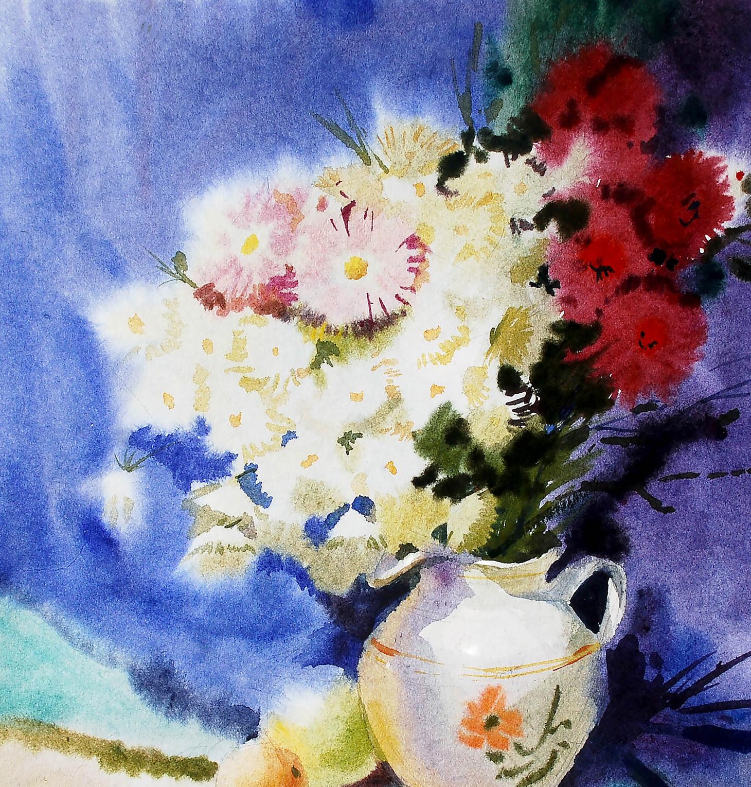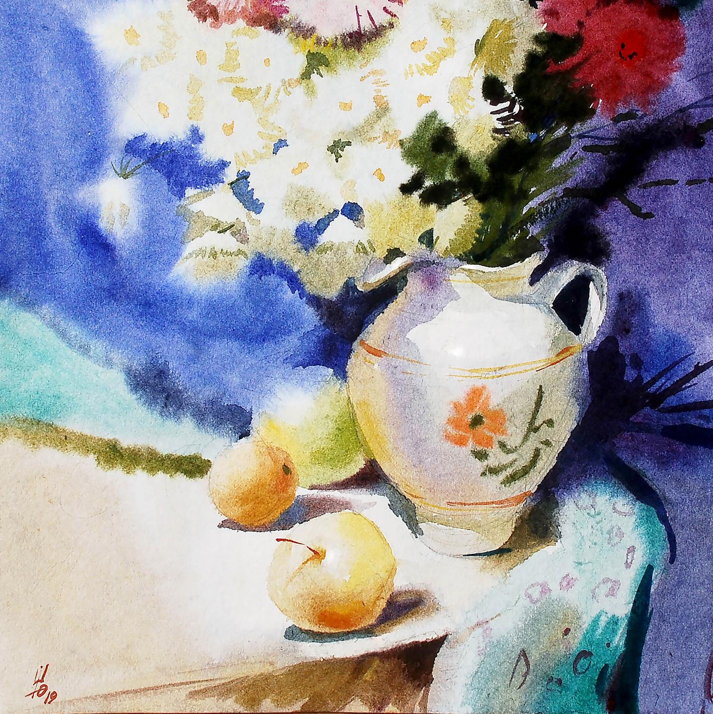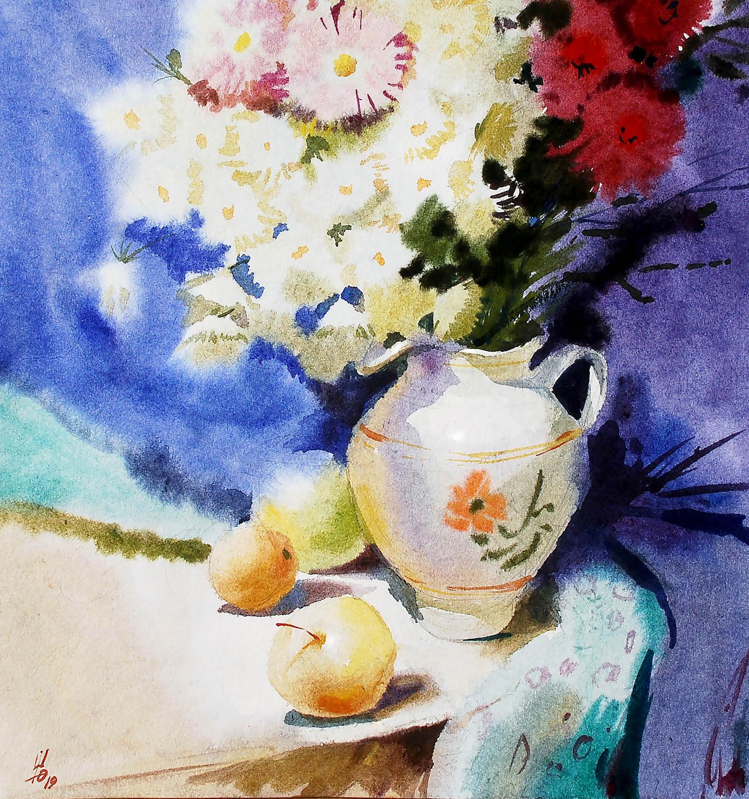 Watercolor painting Chamomiles and apples Egor Shvachunov