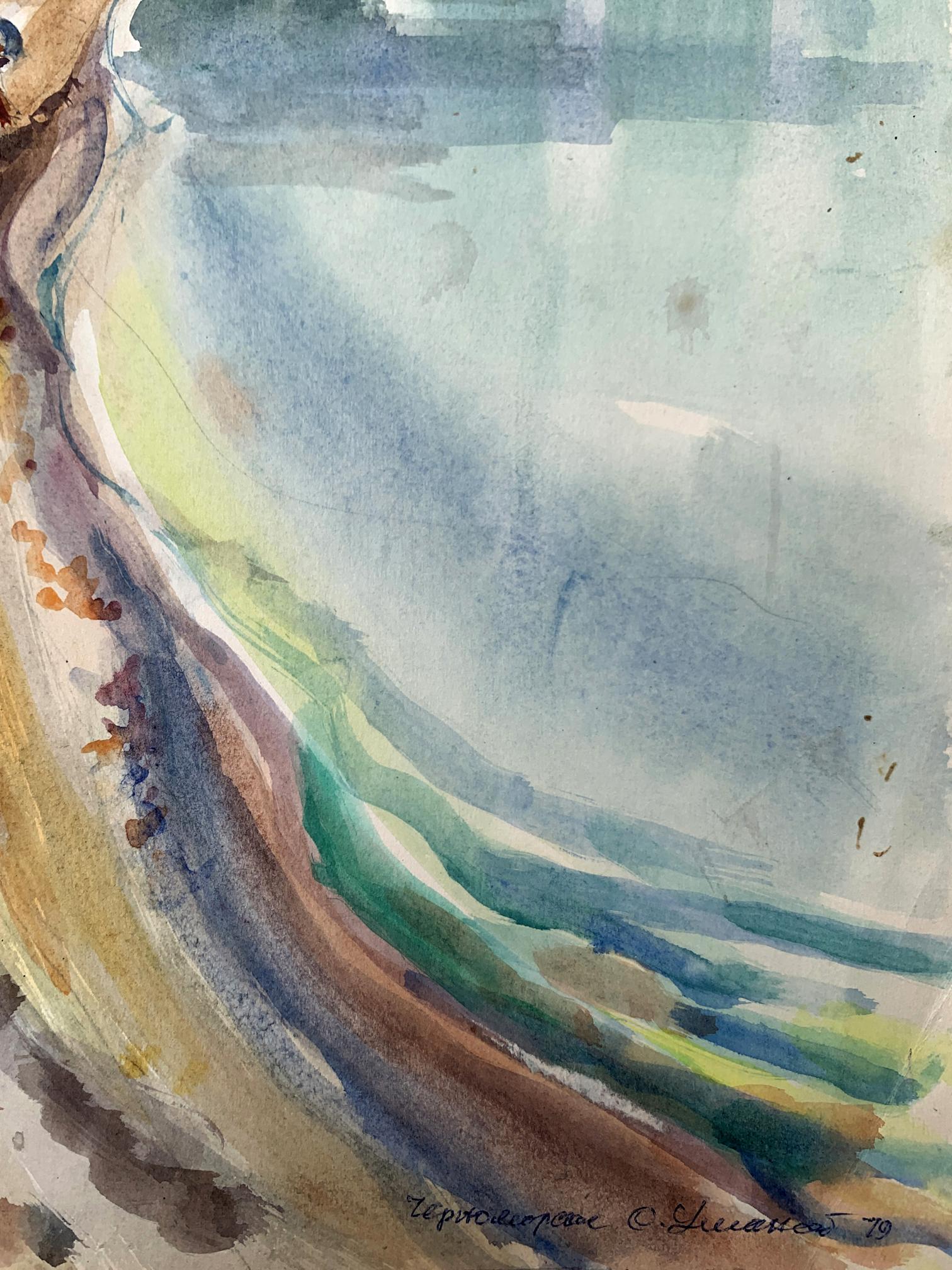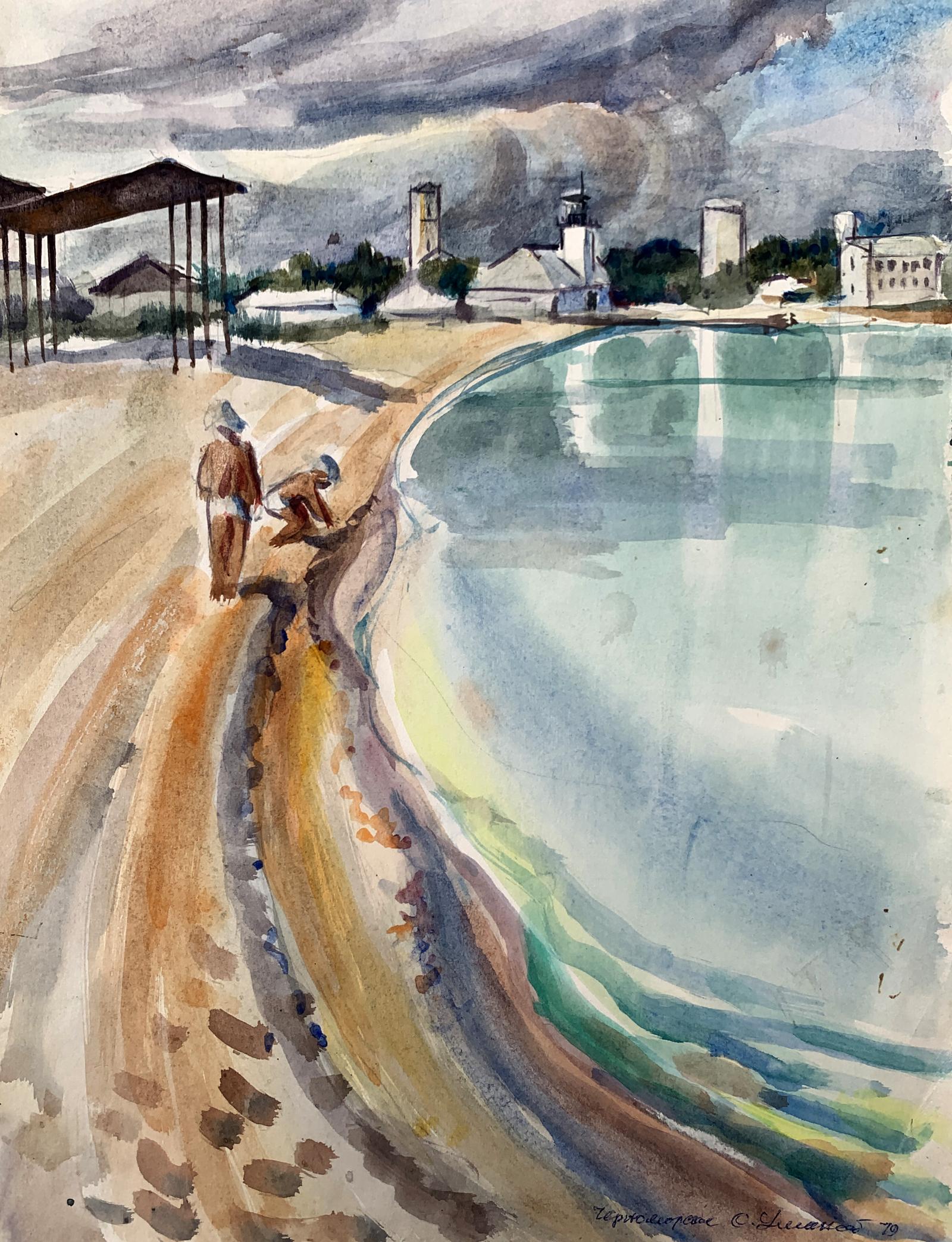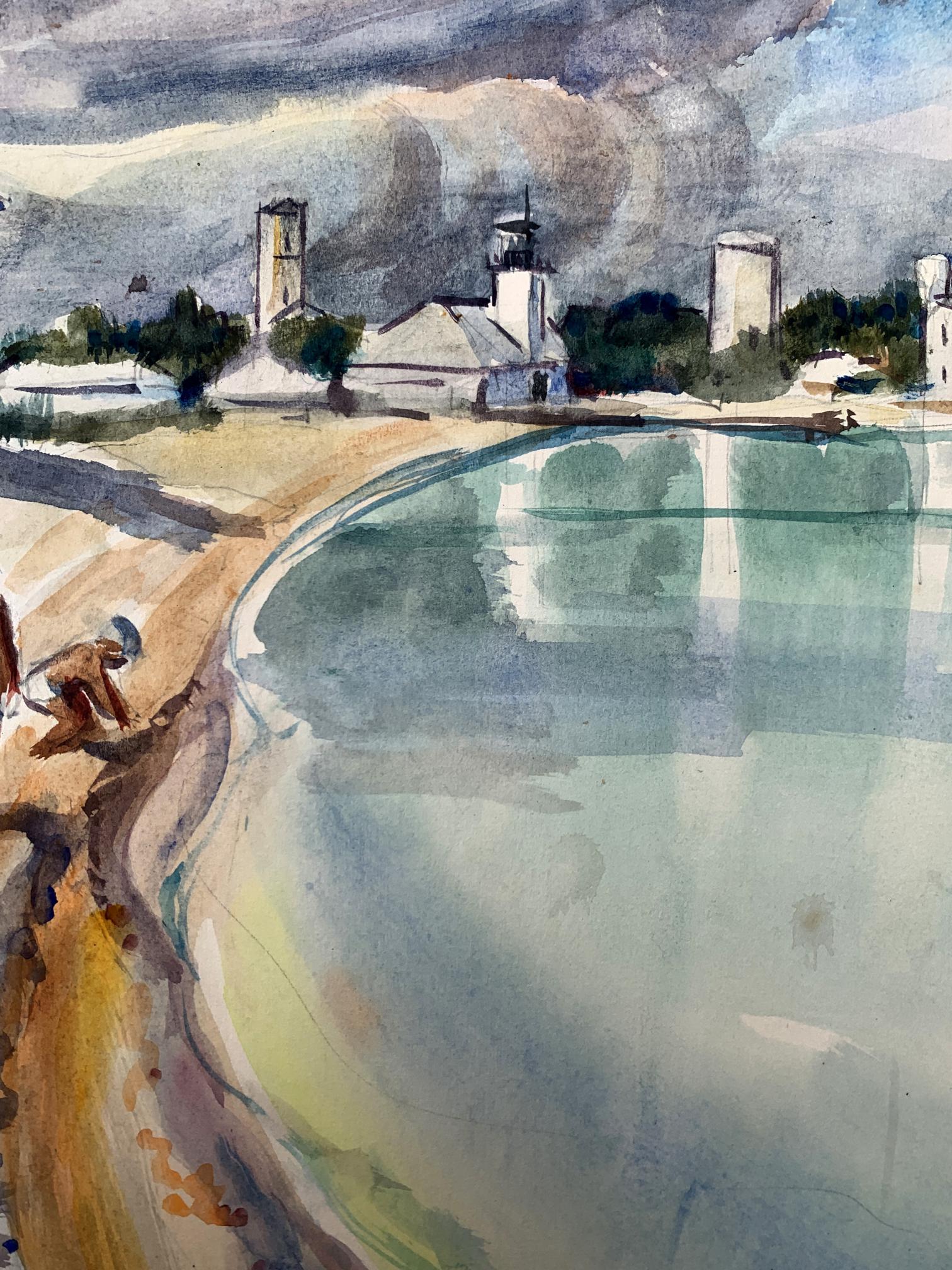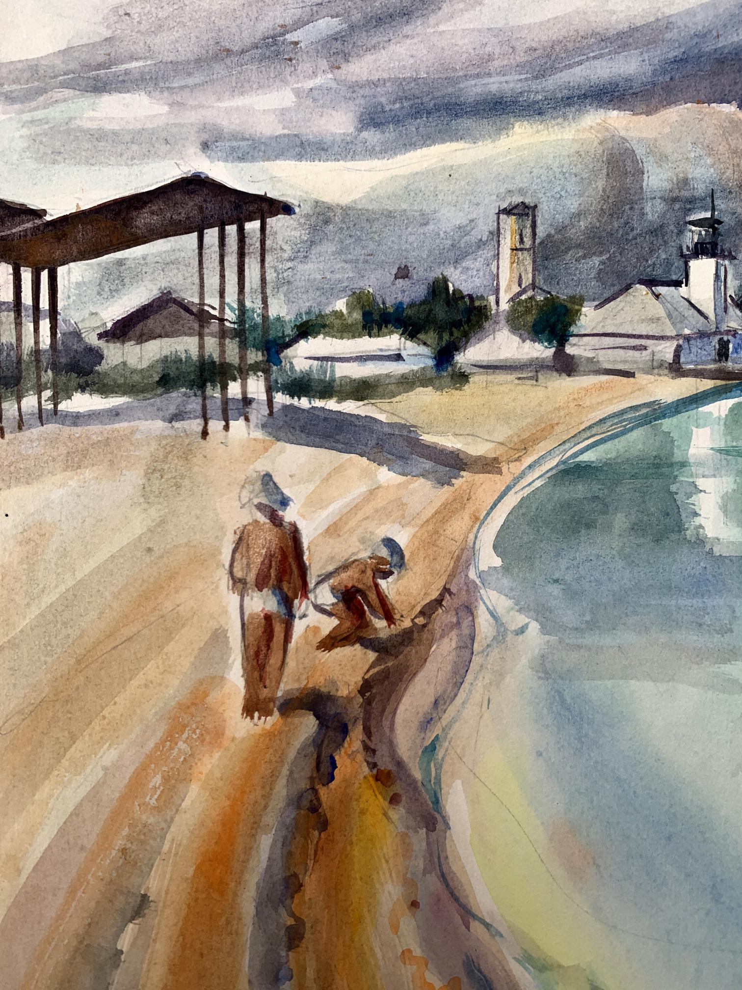 The watercolor painting titled "City Lake" portrays a tranquil yet vibrant urban lakeside scene. The artist masterfully combines soft, fluid brushstrokes and subtle color gradients to create an atmosphere that feels both serene and full of quiet activity.In the foreground, the sandy shoreline curves gracefully around the edge of the lake, drawing the viewer's eye into the composition. Two figures, possibly a parent and child, are engaged in an intimate activity by the water’s edge, perhaps collecting shells or observing nature. Their poses are relaxed, and their interaction conveys a sense of connection and simplicity. The warm earth tones of the sand, punctuated by scattered pebbles, contrast beautifully with the cool blues and greens of the lake water.The lake itself reflects the soft light of the overcast sky above, with its surface shimmering in delicate hues of turquoise and aqua. The transparency of the water is skillfully depicted, inviting the viewer to imagine its coolness and depth. The rippling reflections give the painting a dynamic quality, suggesting a gentle breeze moving across the water’s surface.In the background, the urban environment comes into view, with its buildings and structures rising beyond the trees. The skyline is marked by towers and industrial silhouettes, blending harmoniously with the natural elements of the scene. The architecture is rendered in muted tones, allowing it to recede slightly into the distance without overpowering the composition. The inclusion of these urban elements reminds the viewer of the coexistence of nature and city life.The sky above is dramatic, with sweeping gray clouds hinting at the possibility of rain. The interplay of light and shadow creates a moody atmosphere, adding depth and a sense of fleeting time to the scene. The covered structures on the left side of the composition, possibly part of a pier or pavilion, further emphasize the blending of human activity with the natural environment.Through "City Lake," the artist captures a moment of quiet reflection amidst the hustle and bustle of city life. The painting speaks to the importance of finding peace and connection in urban settings, highlighting the lake as a sanctuary for its inhabitants. It invites the viewer to pause and appreciate the simple beauty of nature, even in the heart of a city. The work is a poignant reminder of how water and open spaces serve as vital elements of urban life, offering a space for relaxation, play, and contemplation.