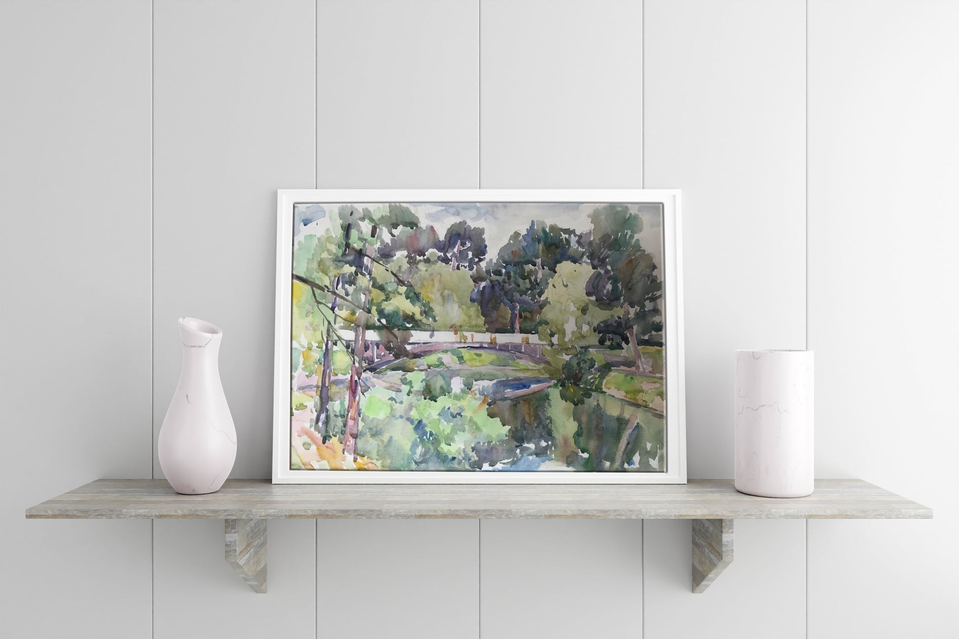 Looking for a beautiful and unique painting to brighten up your home or office? Look no further than this stunning piece entitled "City Park with a Bridge". Depicting a sunny city park with a tranquil pond and a bridge crossing it, this painting is sure to bring a touch of summertime beauty to any space.