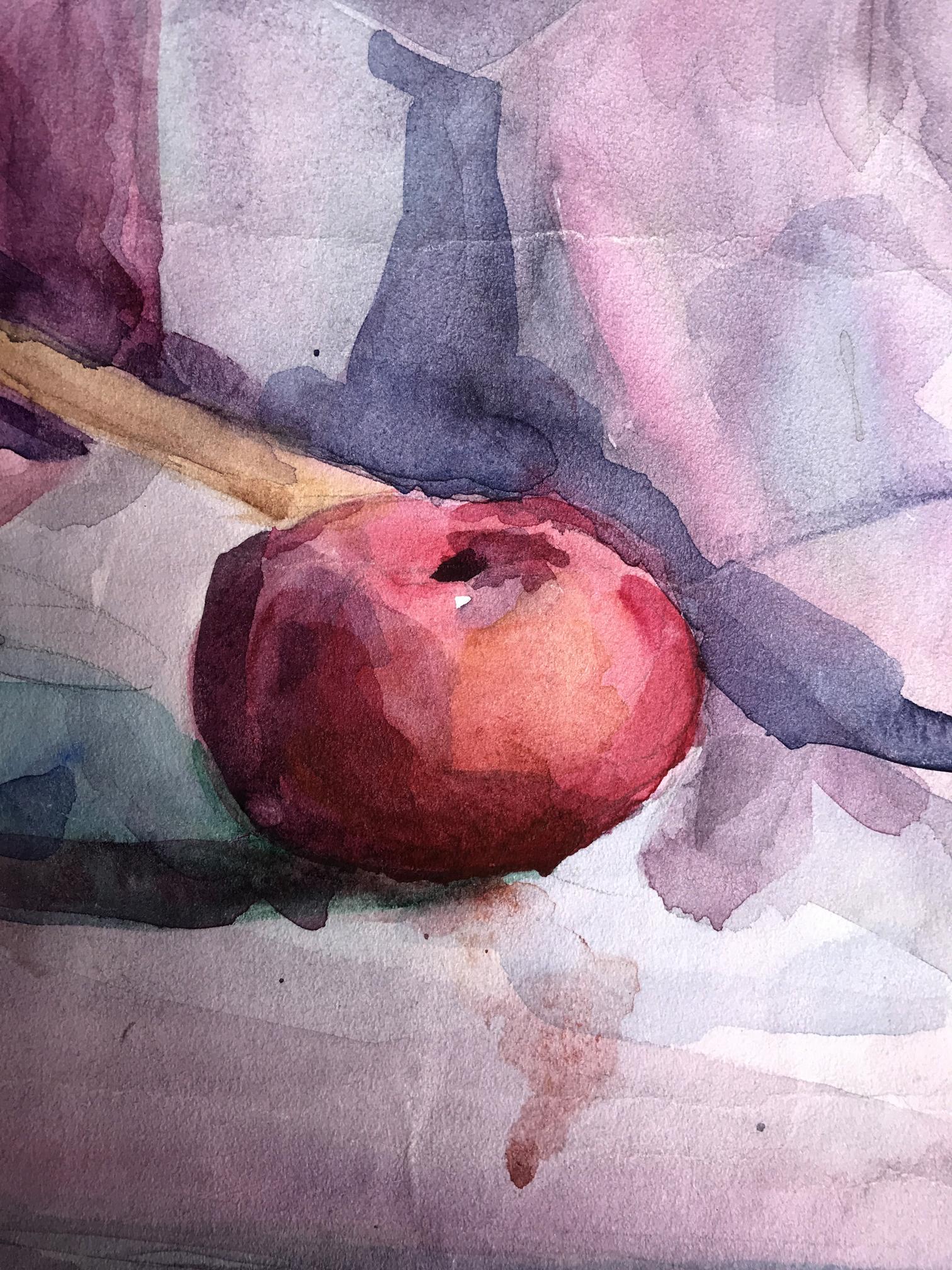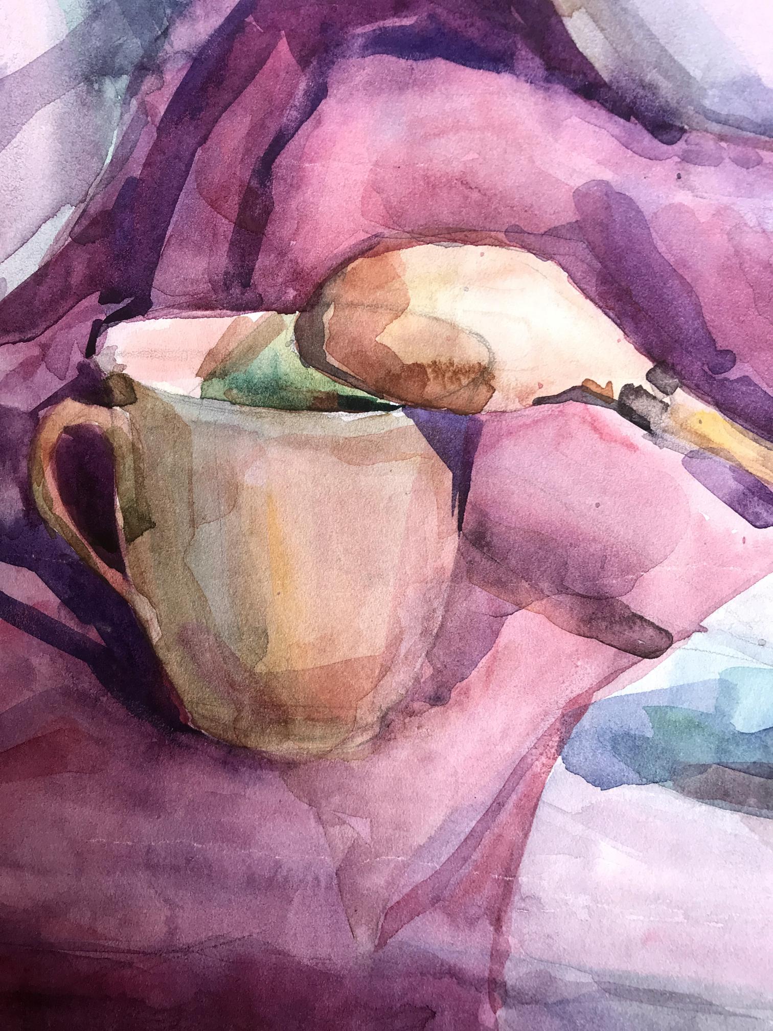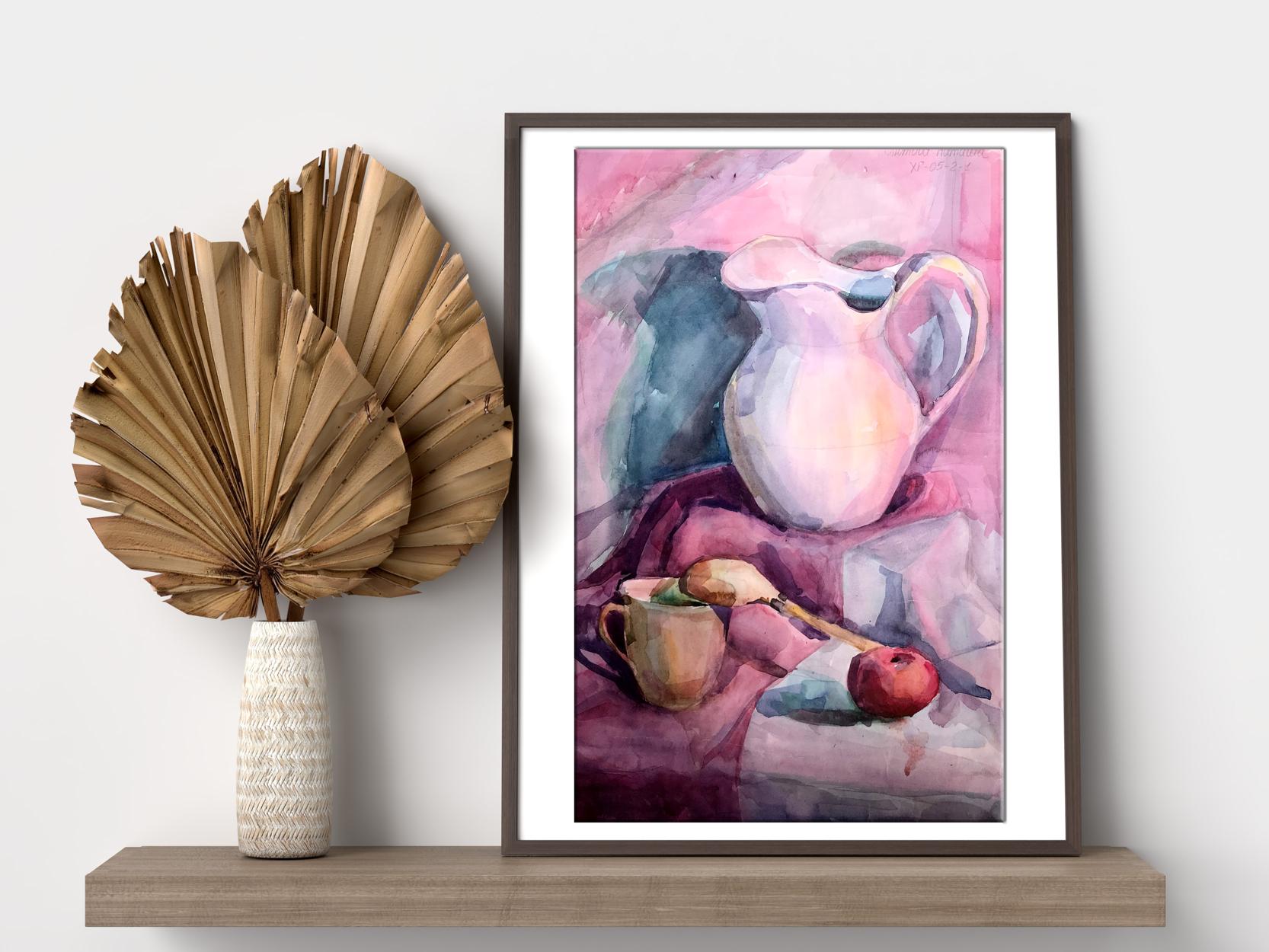 The watercolor painting is a beautiful still life, capturing a peaceful moment in time. The foreground features a brown cup, which has been painted in intricate detail, with soft brushstrokes and delicate shading. The cup appears to be made of earthenware, with a rustic feel to it. It is placed in such a way that it dominates the foreground, drawing the viewer's eye towards it. On the right-hand side of the painting, there is a bright red apple, which adds a pop of color to the scene. The apple has been painted with great care, with each brushstroke expertly capturing the texture and shine of the fruit. In the background of the painting, there is a white and pink jug. The jug has been painted in a simple, understated style, with its colors blending softly into the background. The background of the painting is predominantly pink, with a few lighter areas adding depth and interest to the scene. Overall, the painting is a wonderful example of the watercolor medium, with its soft, blended colors and delicate brushstrokes. The still life has been composed in such a way as to create a peaceful and serene atmosphere, with each element perfectly balanced and placed. The painting is a beautiful celebration of the simple pleasures of life, reminding us to take a moment to appreciate the small things that make life so wonderful.