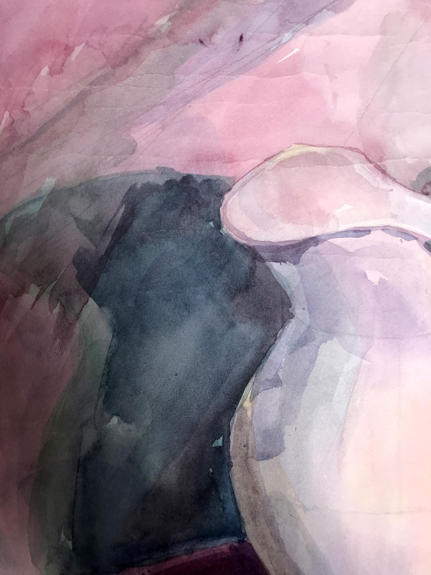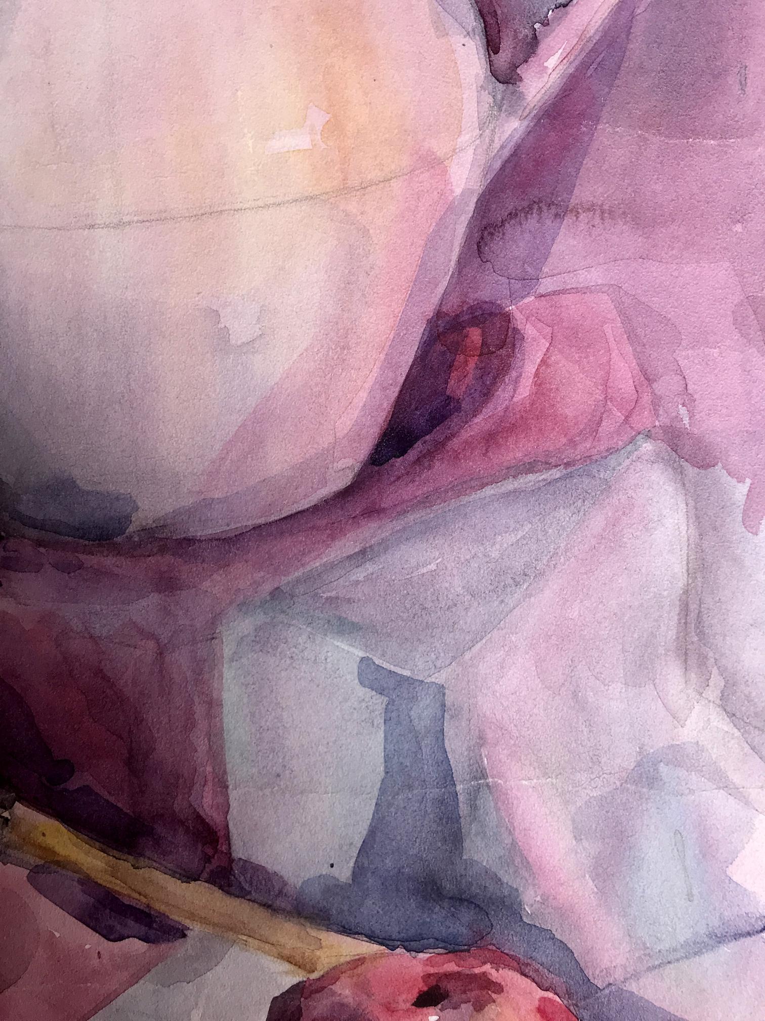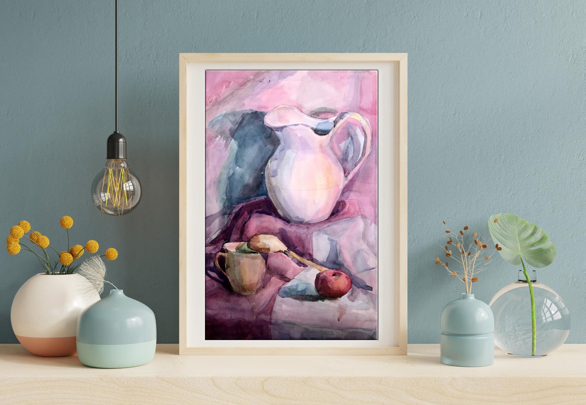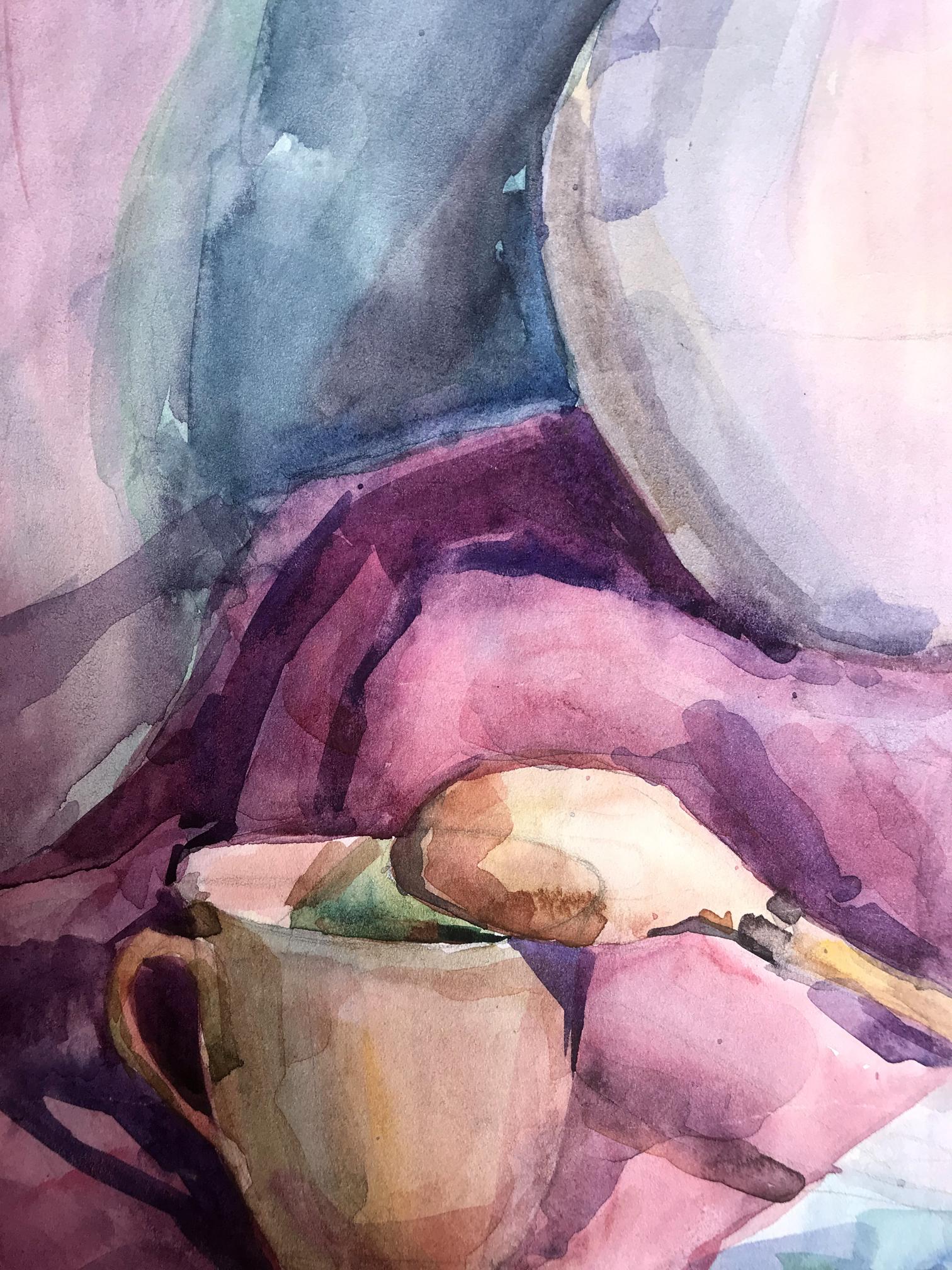 The watercolor painting is a beautiful still life, capturing a peaceful moment in time. The foreground features a brown cup, which has been painted in intricate detail, with soft brushstrokes and delicate shading. The cup appears to be made of earthenware, with a rustic feel to it. It is placed in such a way that it dominates the foreground, drawing the viewer's eye towards it. On the right-hand side of the painting, there is a bright red apple, which adds a pop of color to the scene. The apple has been painted with great care, with each brushstroke expertly capturing the texture and shine of the fruit. In the background of the painting, there is a white and pink jug. The jug has been painted in a simple, understated style, with its colors blending softly into the background. The background of the painting is predominantly pink, with a few lighter areas adding depth and interest to the scene. Overall, the painting is a wonderful example of the watercolor medium, with its soft, blended colors and delicate brushstrokes. The still life has been composed in such a way as to create a peaceful and serene atmosphere, with each element perfectly balanced and placed. The painting is a beautiful celebration of the simple pleasures of life, reminding us to take a moment to appreciate the small things that make life so wonderful.