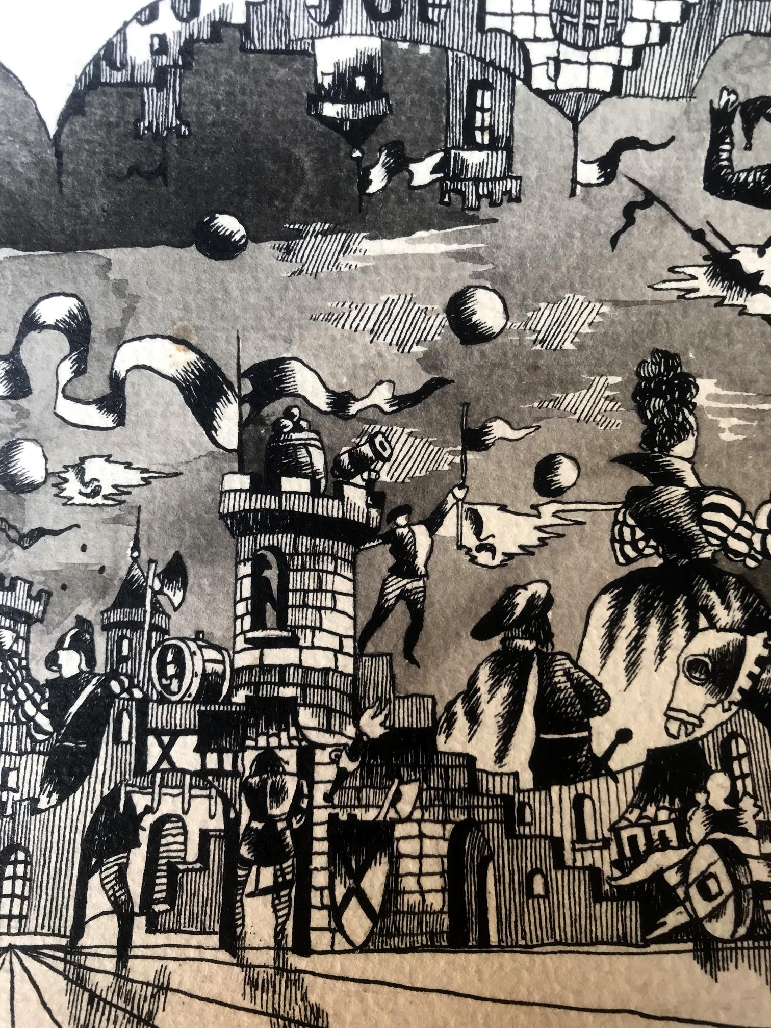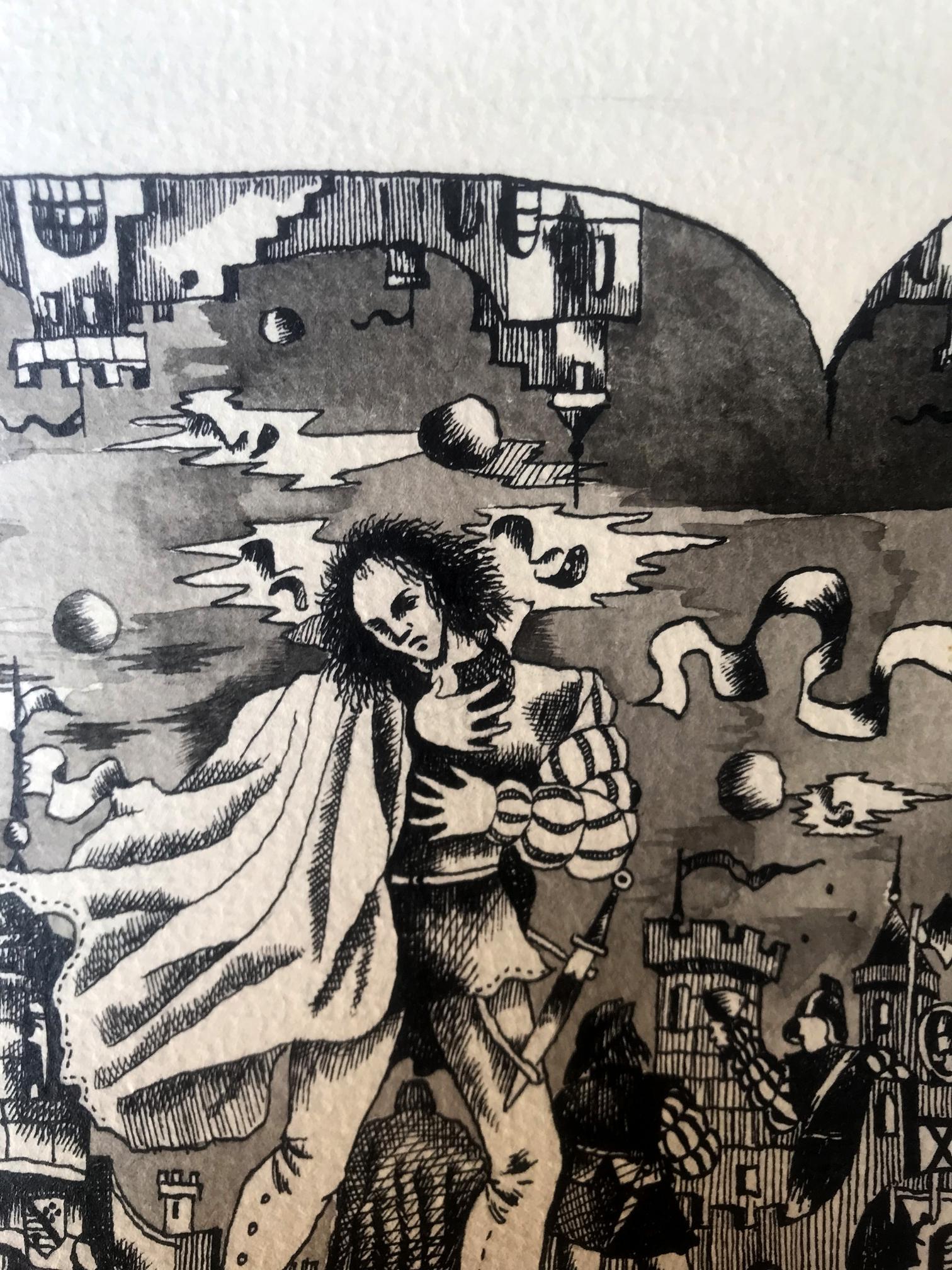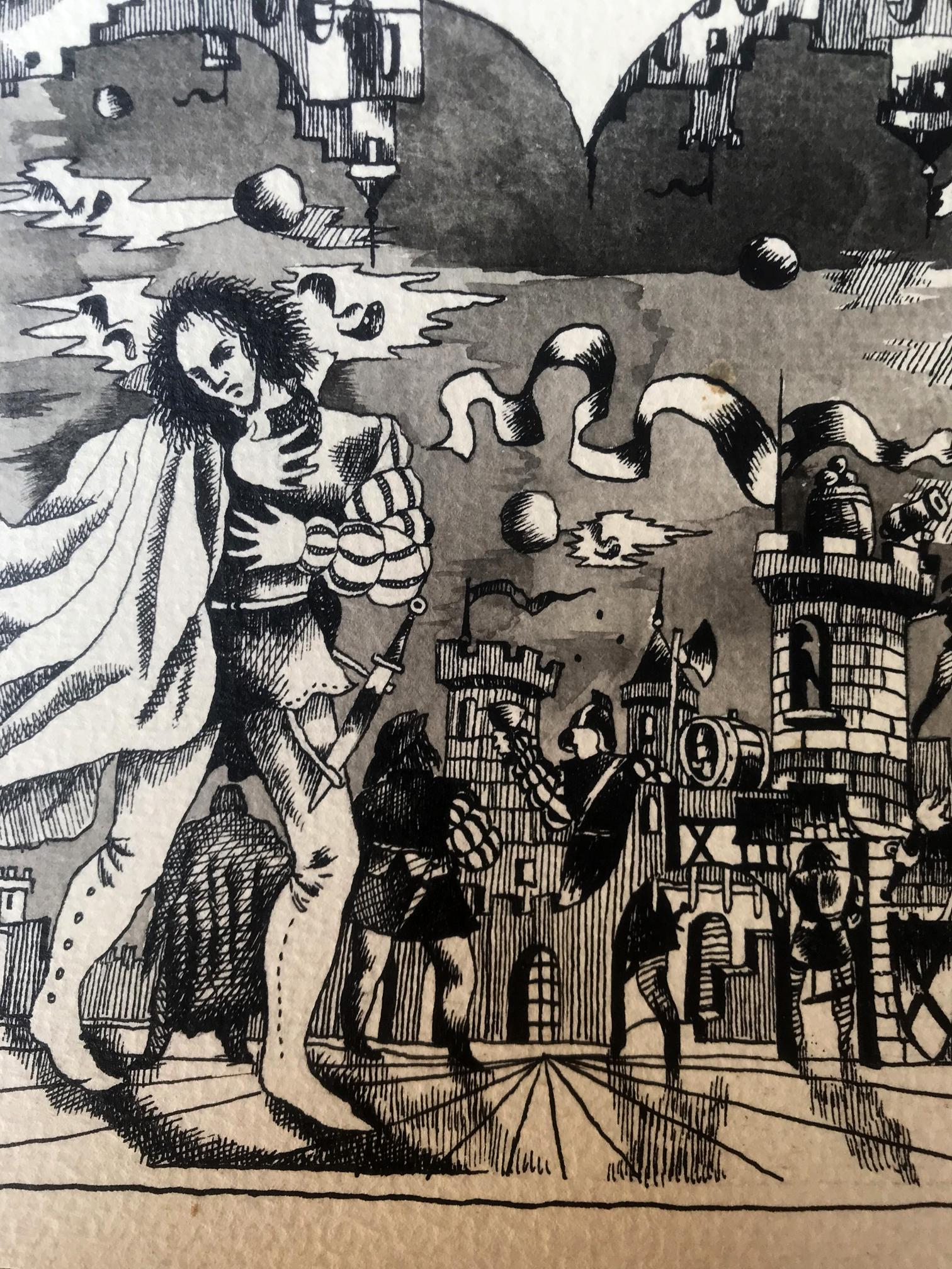 "Fair in the Castle" is a captivating oil painting that captures the essence of a lively fair set against the backdrop of a majestic castle. Created in the impressionistic style, the artist skillfully employs a palette dominated by black and white tones, creating a distinct and intriguing atmosphere. The focal point of the painting lies in the foreground, where the castle stands proudly amidst the festivities. The artist's brushstrokes beautifully depict the architectural details of the castle, showcasing its imposing structure and intricate features. The artist's use of black and white hues adds a sense of mystery and grandeur to the castle, lending it an ethereal quality that draws the viewer's attention. As the eye moves beyond the castle, a bustling fair comes into view. The artist's impressionistic technique comes alive in this part of the painting, as vivid and energetic brushstrokes capture the lively atmosphere of the event. Stalls, tents, and vibrant characters dot the landscape, each rendered with a unique and dynamic flair. The artist's mastery of impressionism is evident in the swift and bold brushwork that evokes a sense of movement and spontaneity, as if capturing a fleeting moment in time. Though predominantly rendered in black and white, the artist employs subtle hints of color to add depth and intrigue to the painting. Perhaps a touch of red on a vendor's cart or a delicate hint of green in the surrounding foliage, these accents punctuate the composition, creating a harmonious balance between the monochromatic palette and the carefully placed splashes of color. "Fair in the Castle" is a mesmerizing portrayal of a vibrant fair set against the backdrop of a majestic castle. Through the artist's impressionistic technique and masterful use of black and white hues, the painting exudes a sense of enchantment, inviting viewers to immerse themselves in the lively atmosphere of the fair and marvel at the timeless beauty of the castle.