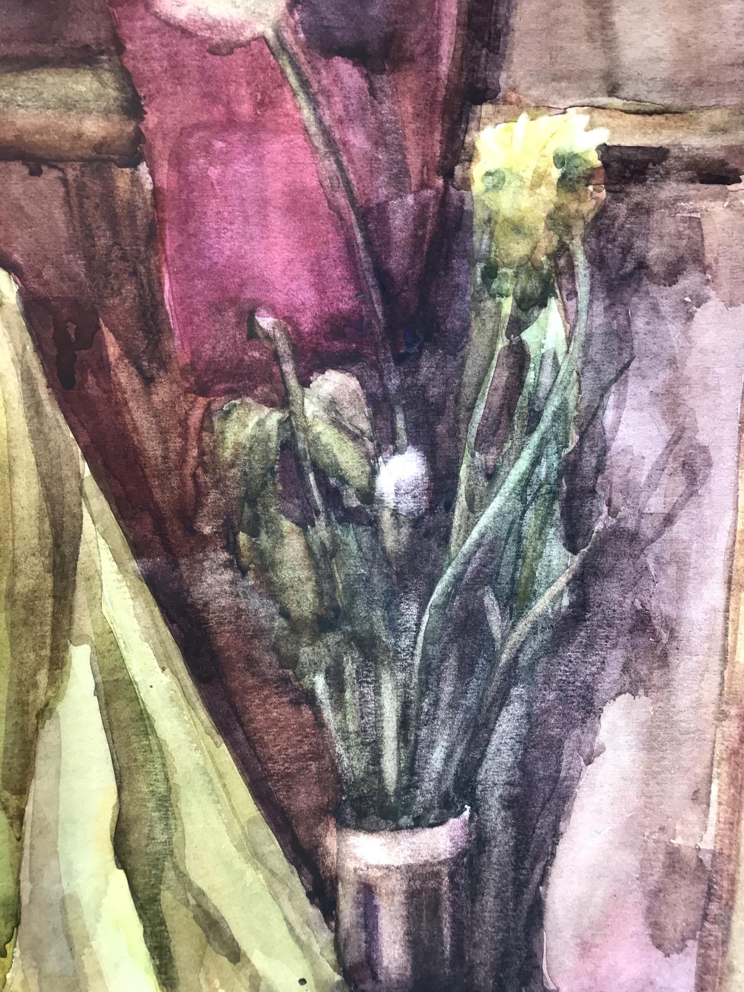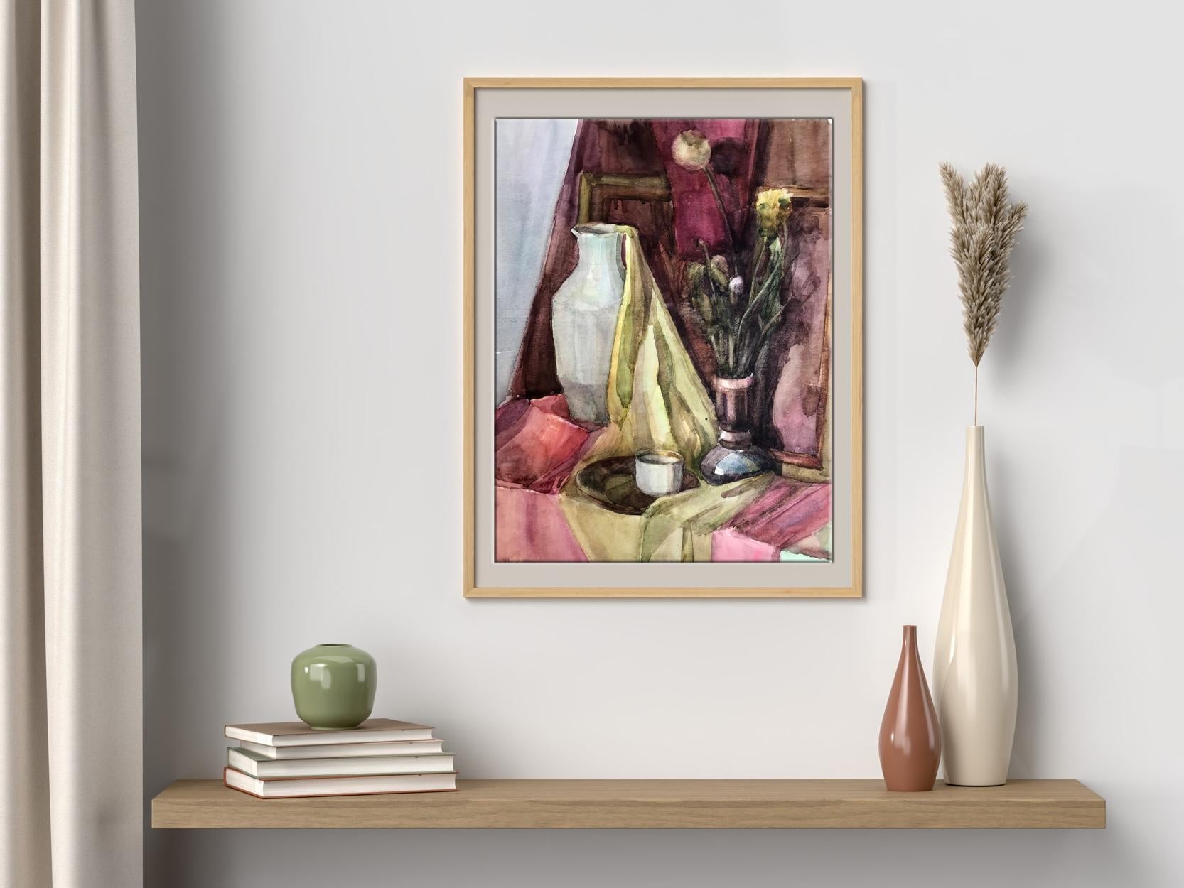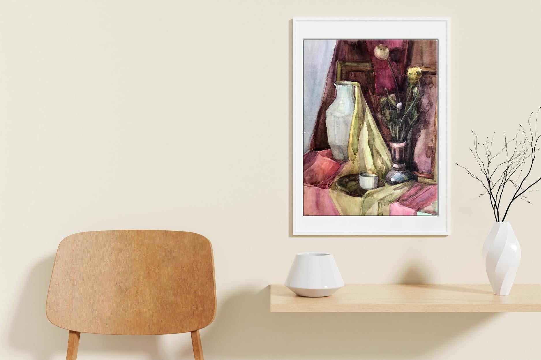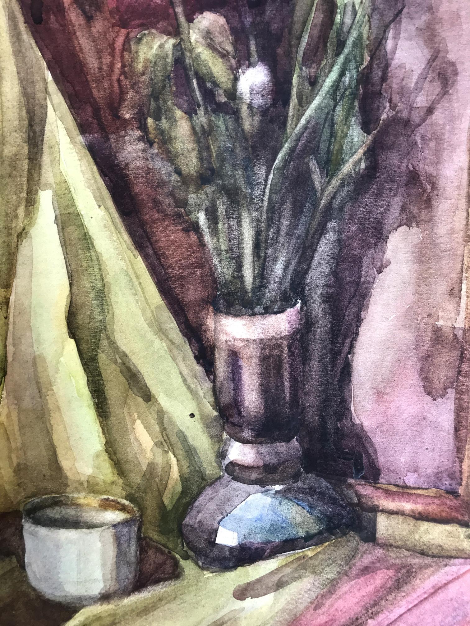 The watercolor painting depicts a beautiful still life scene that is both tranquil and captivating. The focal point of the painting is a vase filled with vibrant yellow flowers, which sits prominently on a table in the foreground. The petals of the flowers are skillfully rendered in a mix of light and dark tones, creating depth and dimensionality. To the left of the vase is a gray jug that adds a subtle contrast to the bright yellow of the flowers. The jug is depicted with simple but effective brushstrokes, creating the impression of a three-dimensional object. On the table, just in front of the jug, is a brown plate that further complements the colors of the flowers. A gray cup rests on the plate, with its handle extending gracefully to the side. The background of the painting is a soft and muted shade of purple, which complements the other colors in the composition and adds a sense of depth and atmosphere to the piece. The use of watercolor gives the painting a dreamy and ethereal quality, with subtle blending and shading that creates a sense of movement and fluidity. Overall, the painting is a masterful representation of a classic still life scene, with careful attention paid to the details of each individual object, and a skillful use of color and composition to create a sense of harmony and balance.