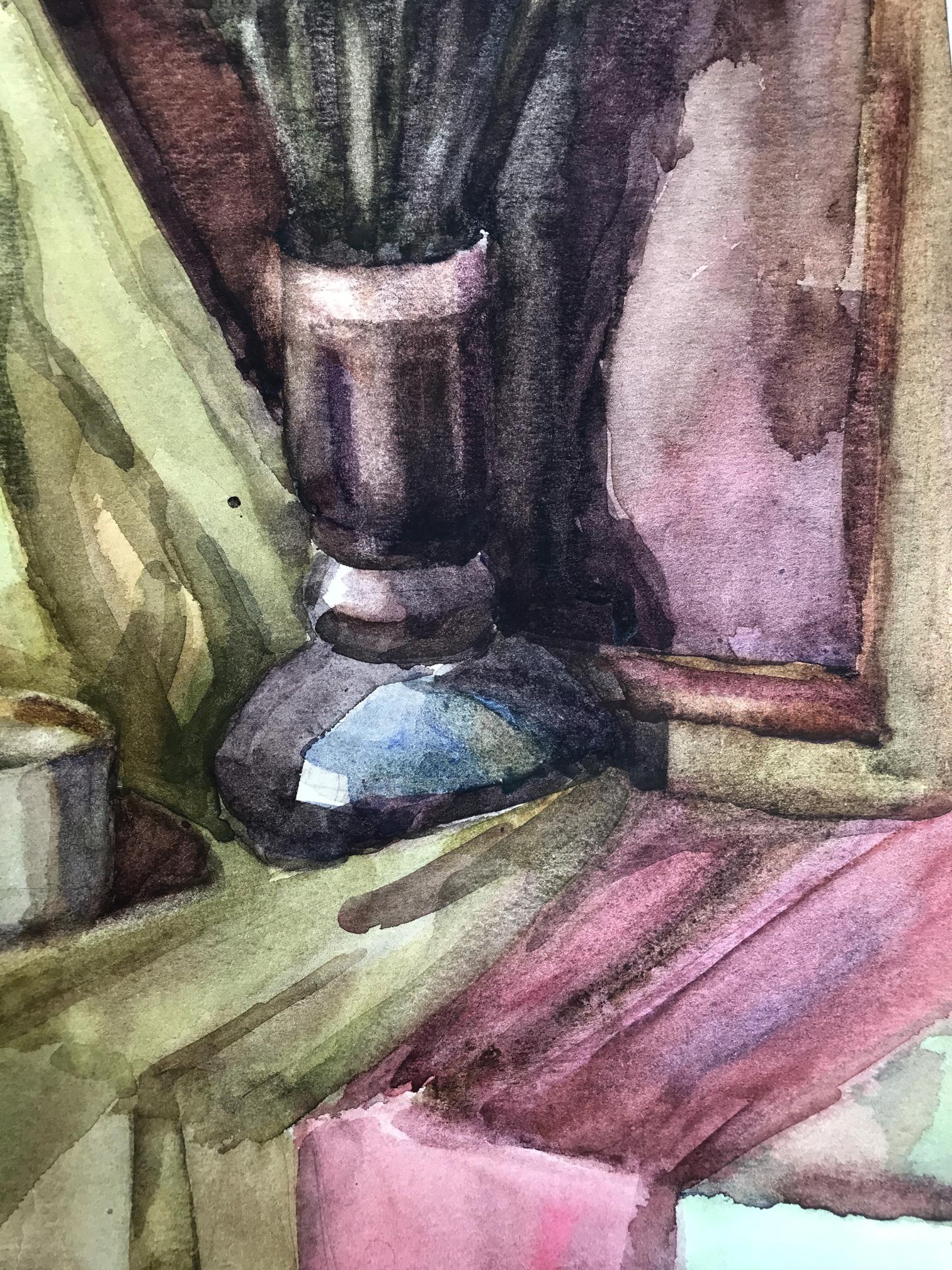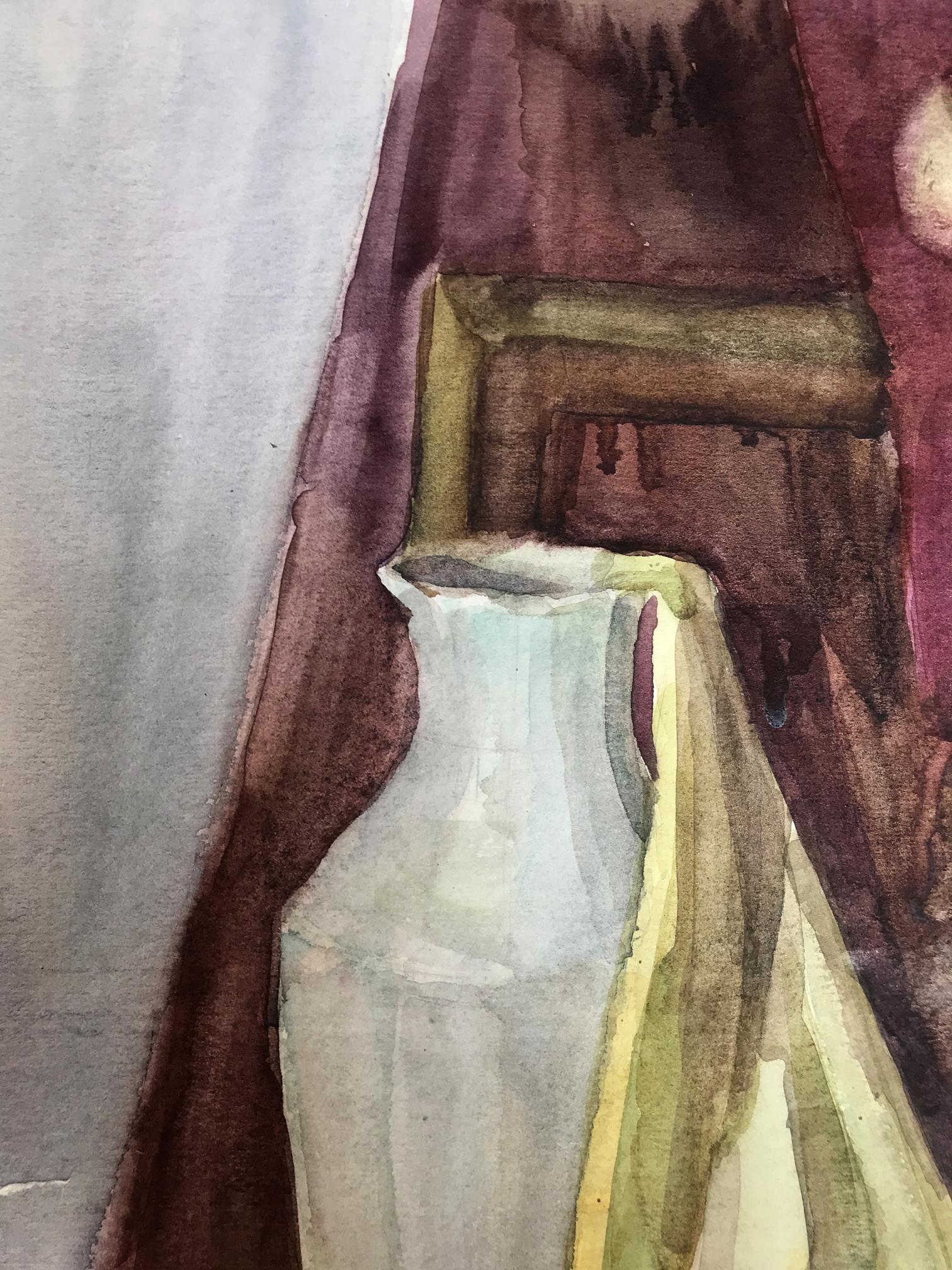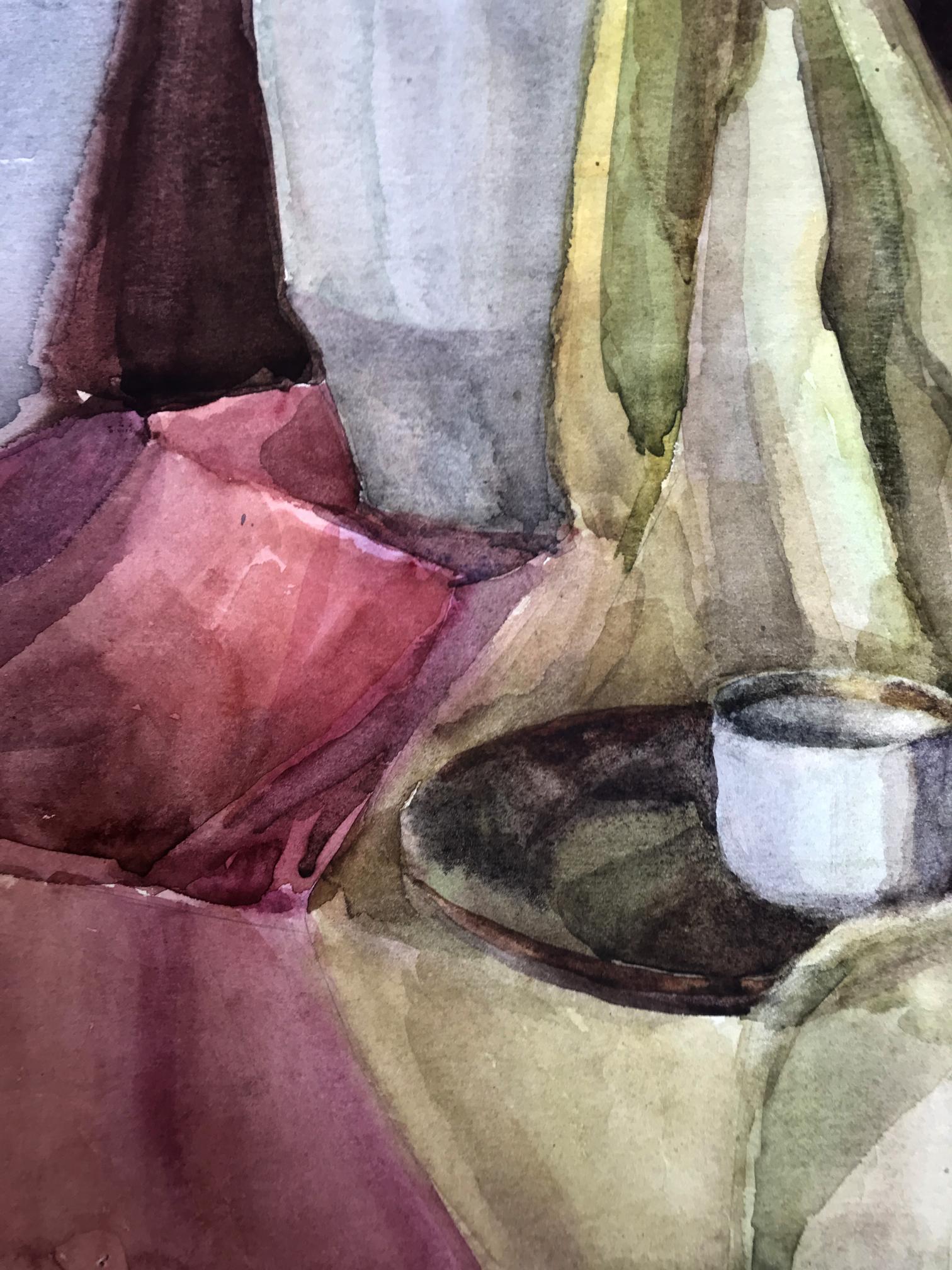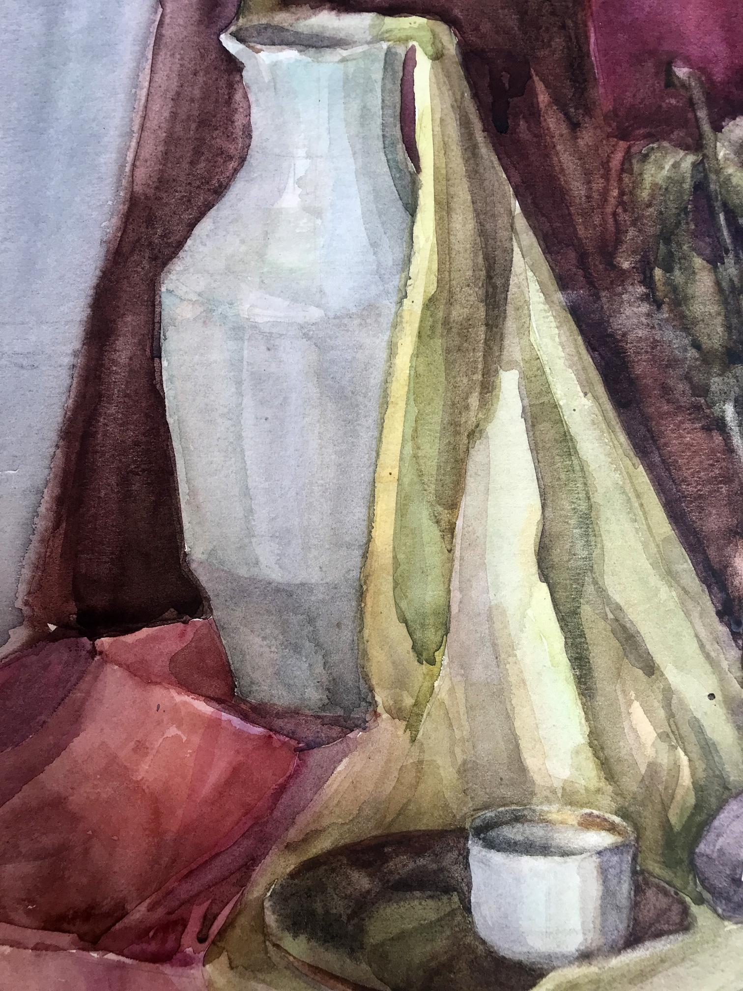 The watercolor painting depicts a beautiful still life scene that is both tranquil and captivating. The focal point of the painting is a vase filled with vibrant yellow flowers, which sits prominently on a table in the foreground. The petals of the flowers are skillfully rendered in a mix of light and dark tones, creating depth and dimensionality. To the left of the vase is a gray jug that adds a subtle contrast to the bright yellow of the flowers. The jug is depicted with simple but effective brushstrokes, creating the impression of a three-dimensional object. On the table, just in front of the jug, is a brown plate that further complements the colors of the flowers. A gray cup rests on the plate, with its handle extending gracefully to the side. The background of the painting is a soft and muted shade of purple, which complements the other colors in the composition and adds a sense of depth and atmosphere to the piece. The use of watercolor gives the painting a dreamy and ethereal quality, with subtle blending and shading that creates a sense of movement and fluidity. Overall, the painting is a masterful representation of a classic still life scene, with careful attention paid to the details of each individual object, and a skillful use of color and composition to create a sense of harmony and balance.