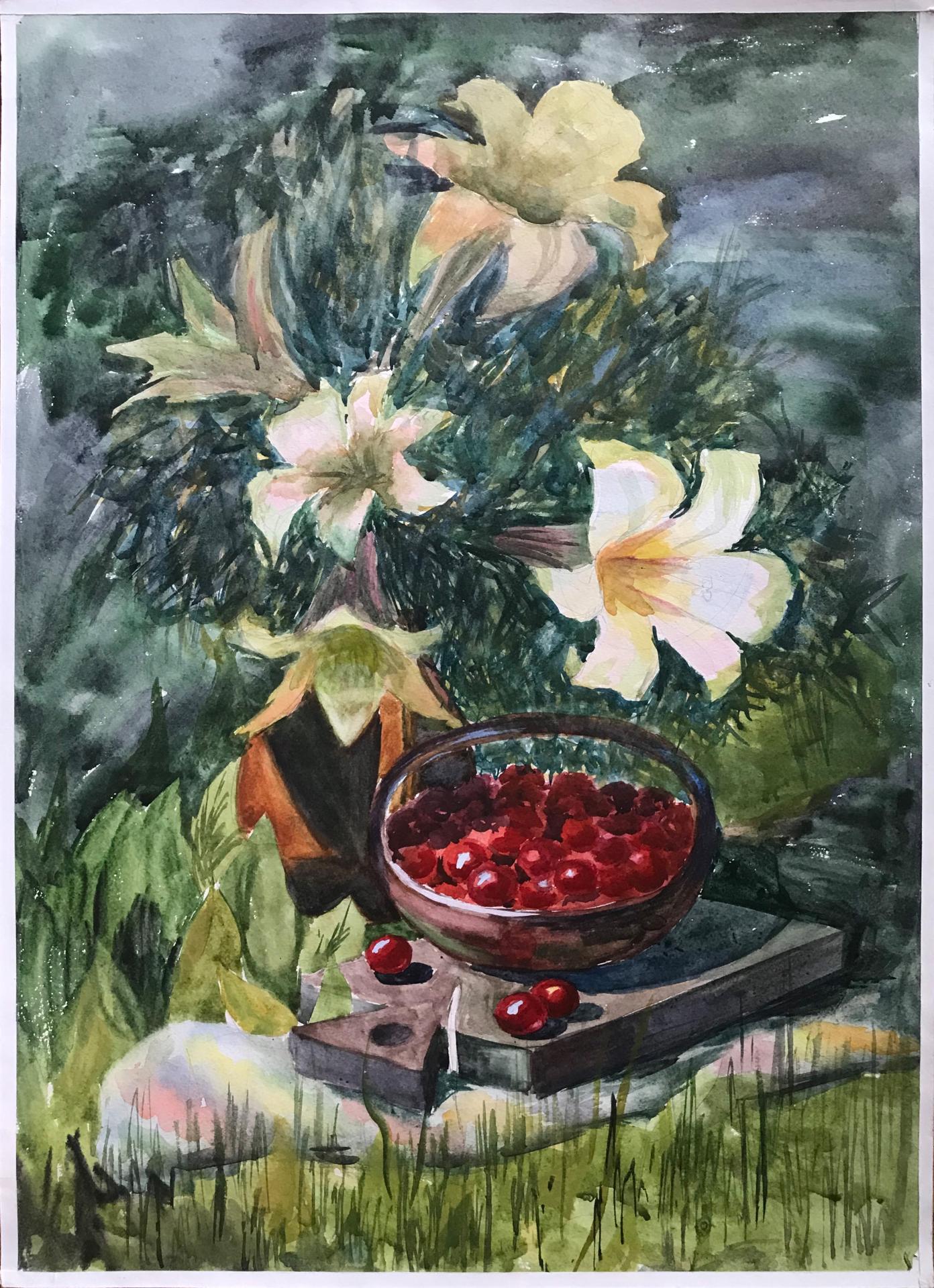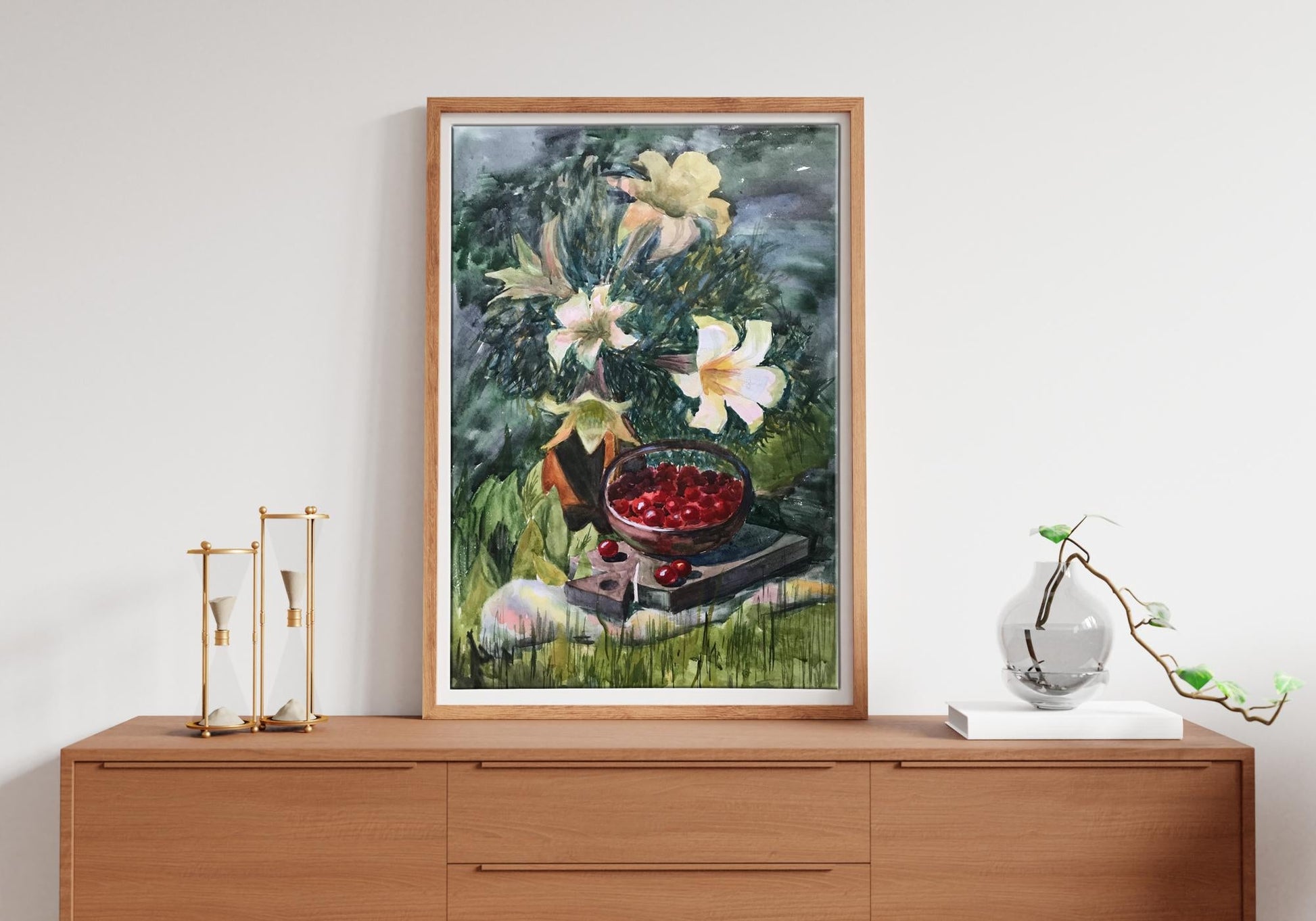 Looking for a stunning painting that will brighten up any room? "Flowers and fruits" is a beautiful still life that features a lush bouquet of lilies and berries in a basket. The vibrant colors and natural beauty of the scene are sure to catch the eye, making this painting a perfect addition to your home or office decor. With its professional quality and classic subject matter, "Flowers and fruits" is sure to impress anyone who sees it.