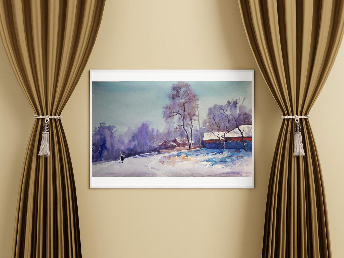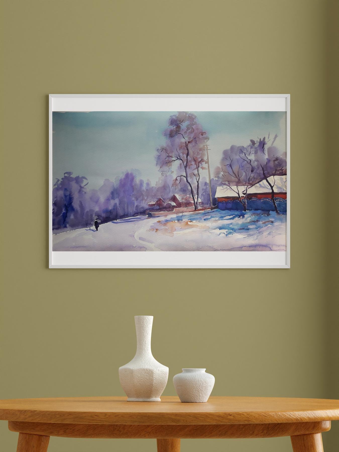 Dive into the serene beauty of winter with "Frosty Day," an exquisite watercolor painting by the acclaimed artist, Serdyuk Boris Petrovich. This piece, a notable addition to our Collection of Winter Landscapes and Collection of Village Landscapes, captures the essence of a tranquil winter scene. A wide road stretches through the composition, bordered on one side by quality village estates and on the other by a dense, tall forest. The entire scene is enveloped in a thick layer of fluffy snow, evoking the silent, mesmerizing atmosphere of a frosty winter day. The soft watercolor technique enhances the painting's ethereal quality, making it a perfect choice for anyone seeking to add a touch of winter's magic to their space.