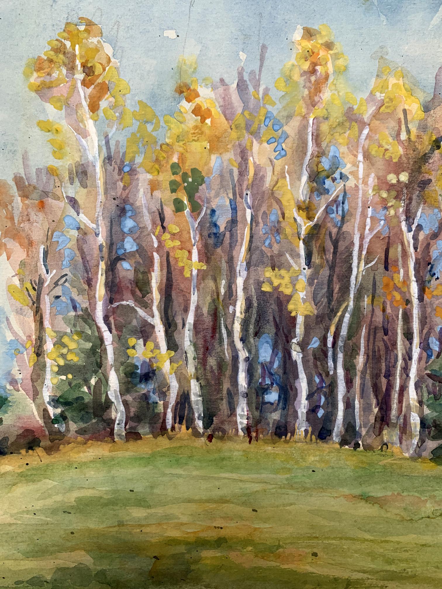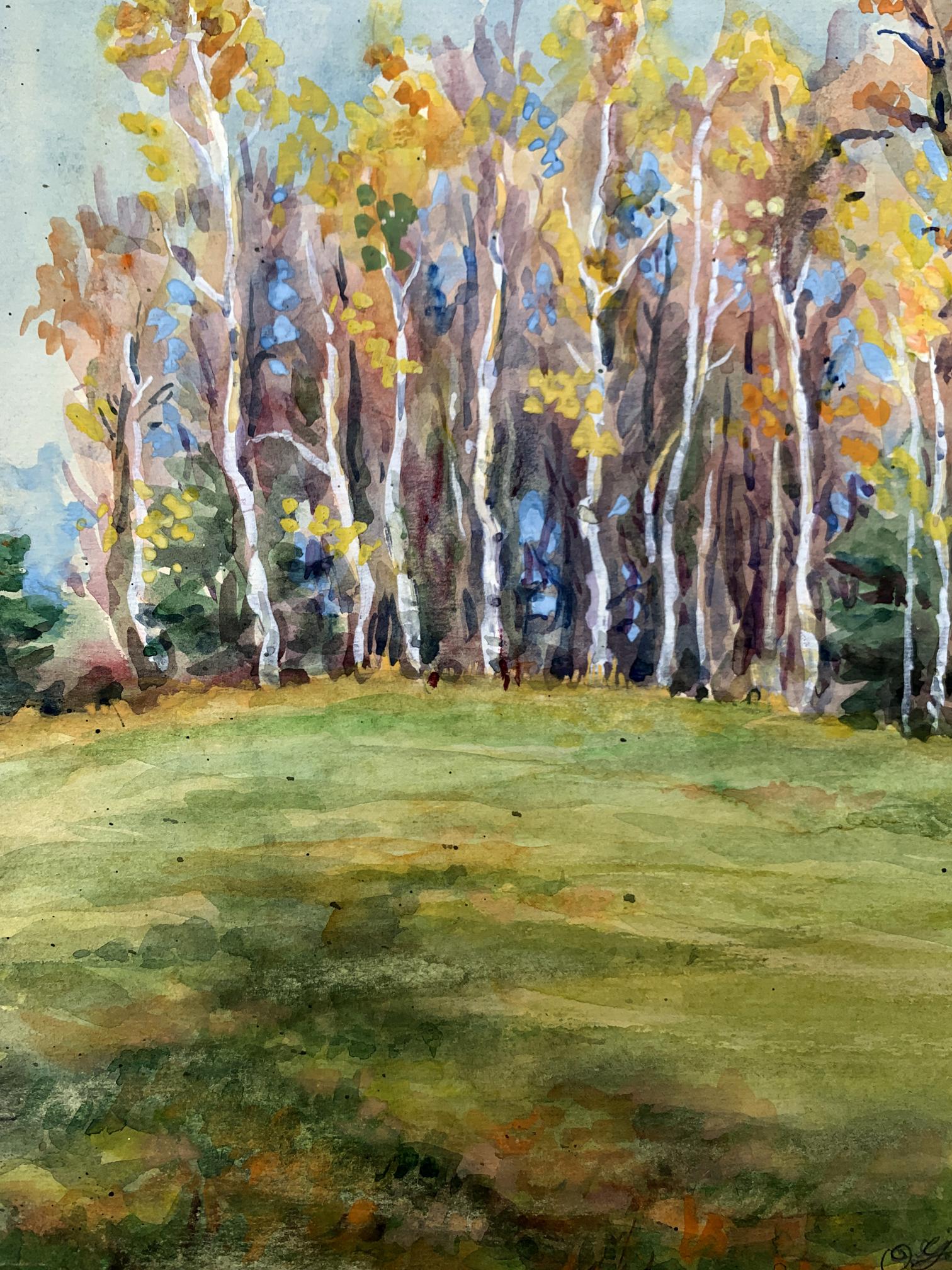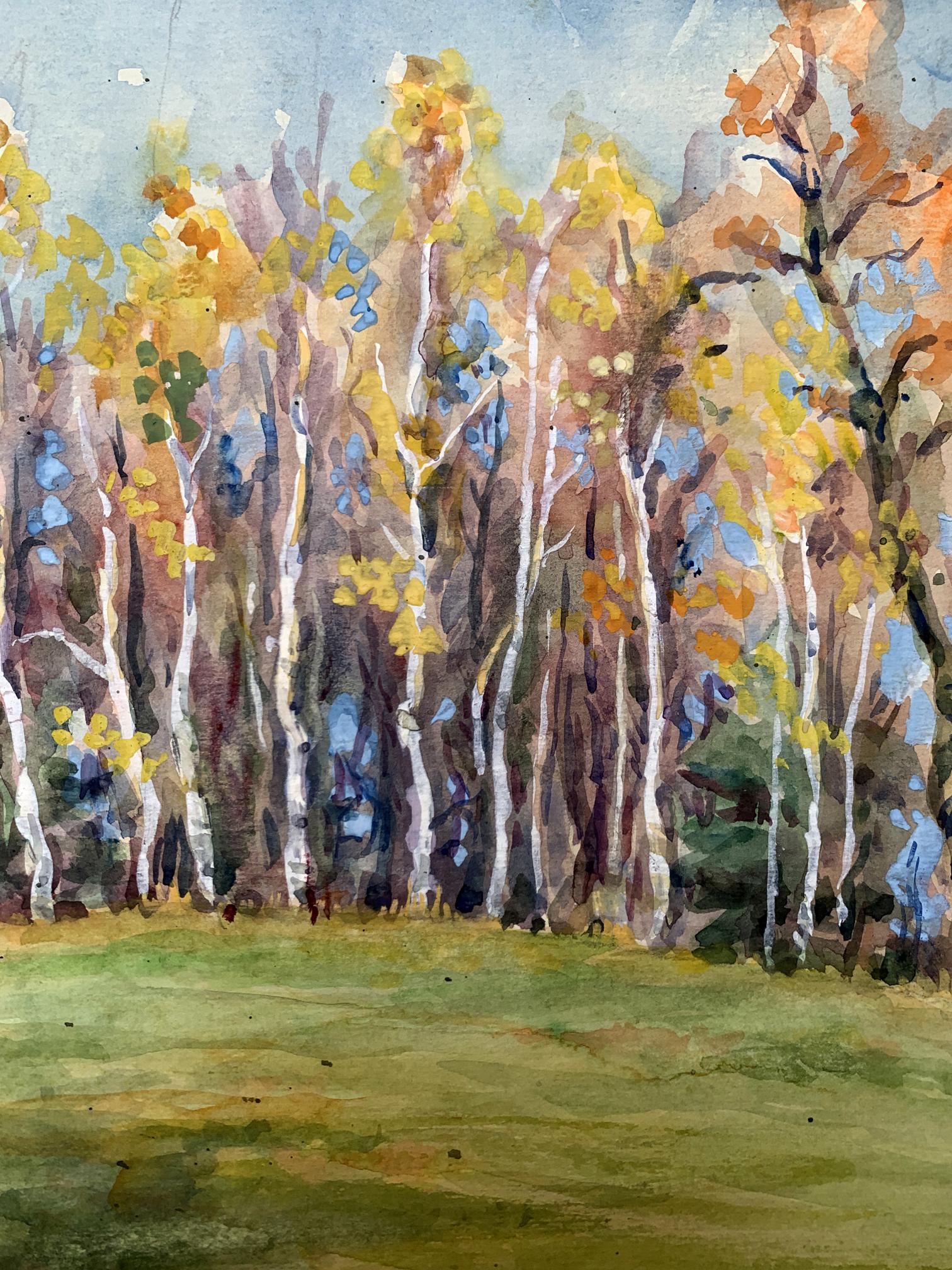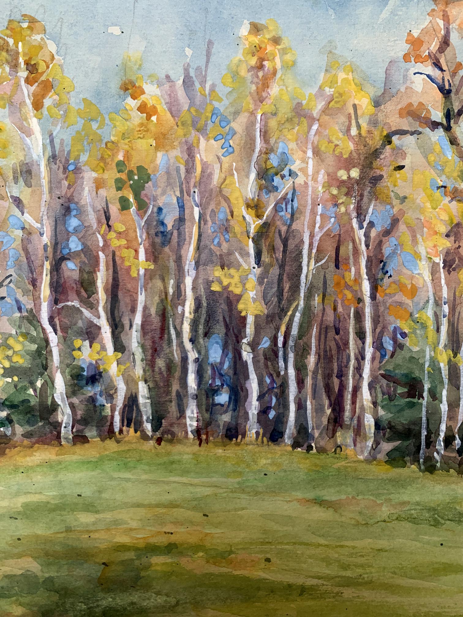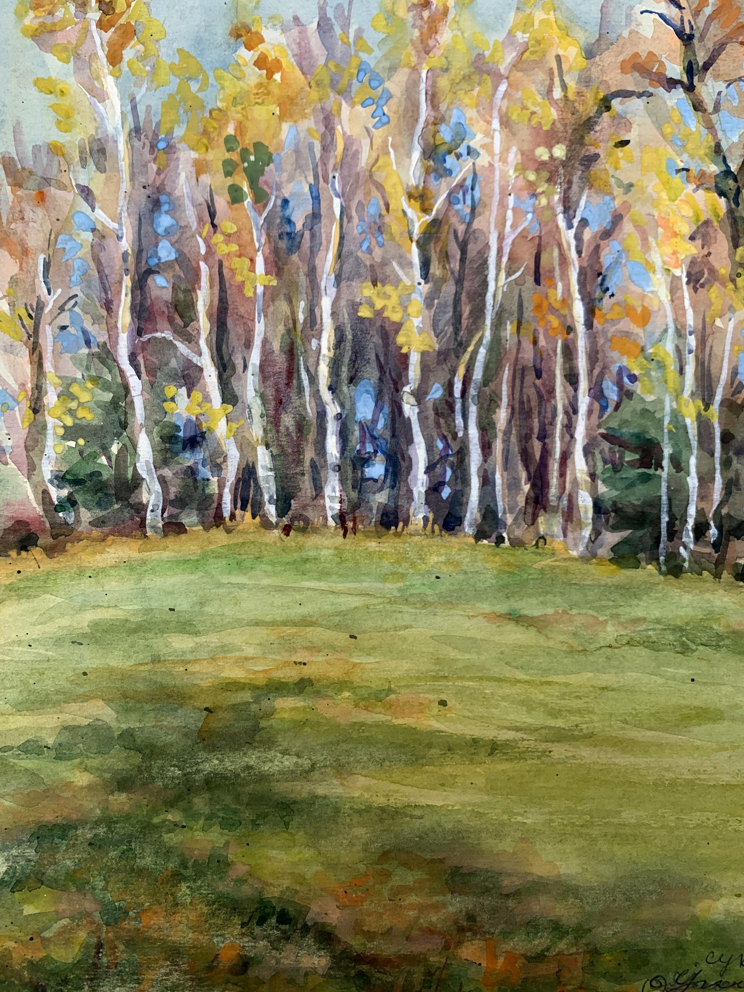 The watercolor painting titled "Golden Leaves" captures the tranquil beauty of a birch grove in autumn, emphasizing the richness of nature’s seasonal transformation. The composition centers around a cluster of tall, slender birch trees standing proudly in the sunlight. Their striking white trunks, accented by delicate shadows and splashes of golden and amber leaves, create a vivid contrast against the soft blue sky above and the green meadow below.The artist's use of warm, vibrant tones for the leaves — a blend of yellows, oranges, and hints of brown — showcases the fleeting glory of fall foliage. The trees appear to sway gently, as if moved by a soft breeze, giving the scene a sense of life and dynamism. The interplay of light and shadow on the leaves suggests that the grove is bathed in sunlight, creating a luminous, almost ethereal quality.The foreground features a wide expanse of grass painted in varied shades of green, from muted olive to bright lime, with subtle strokes suggesting the texture of a meadow. This open space provides a calm, grounding balance to the verticality of the trees, drawing the viewer’s gaze upwards to appreciate the beauty of the canopy.The background fades softly into blue and purple hues, hinting at the depth of the forest beyond the birches. This layered effect adds dimension and perspective to the painting, enhancing its immersive quality. The sky, painted in soft washes of pale blue, transitions seamlessly into the golden tones of the treetops, creating a harmonious blend of cool and warm colors.Through "Golden Leaves," the artist aims to celebrate the beauty of autumn as a time of change and reflection. The birch grove, with its golden foliage, becomes a symbol of resilience and grace, standing tall amid the inevitable cycles of nature. The painting invites viewers to pause, take in the moment, and find peace in the simple yet profound beauty of the natural world.