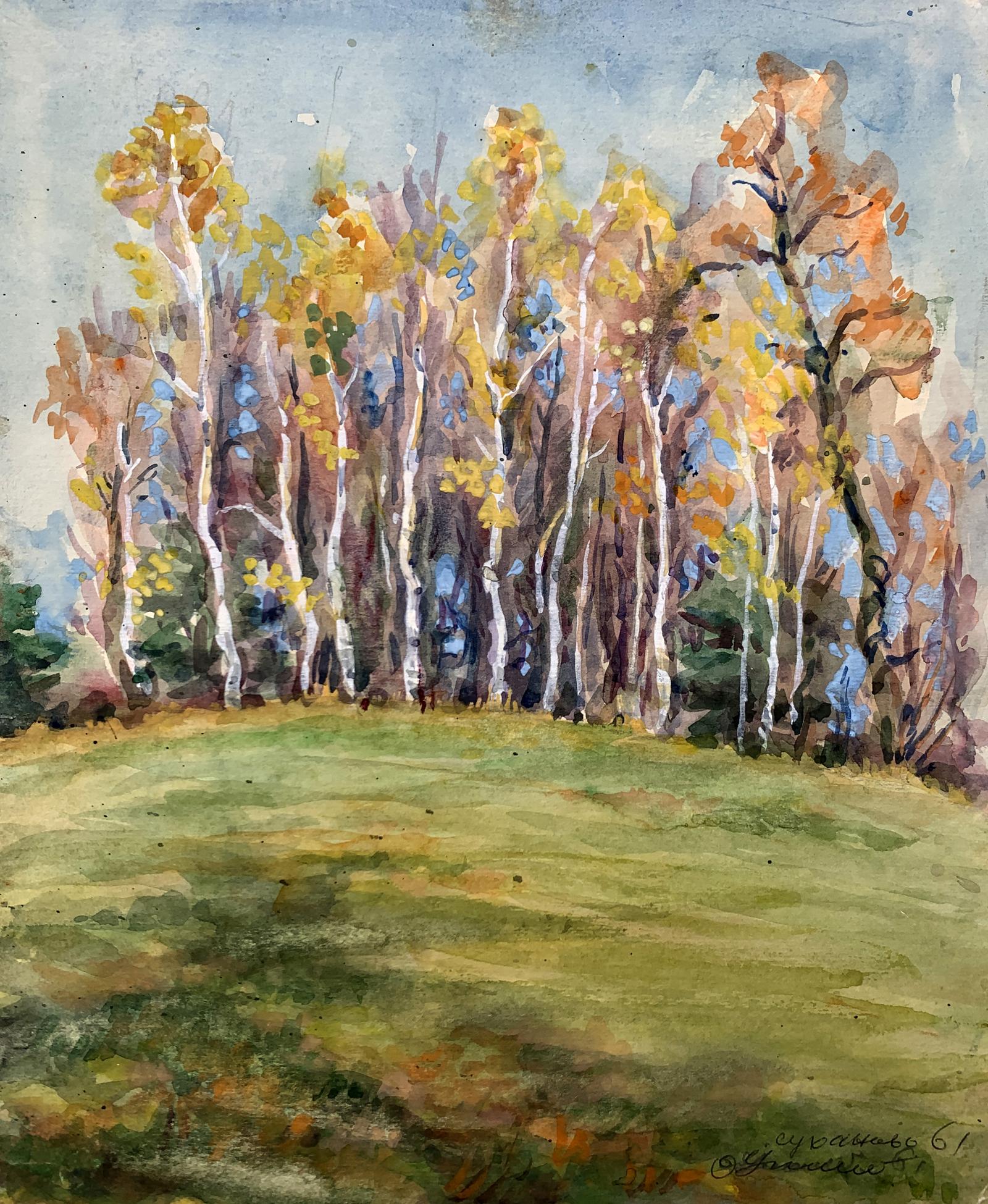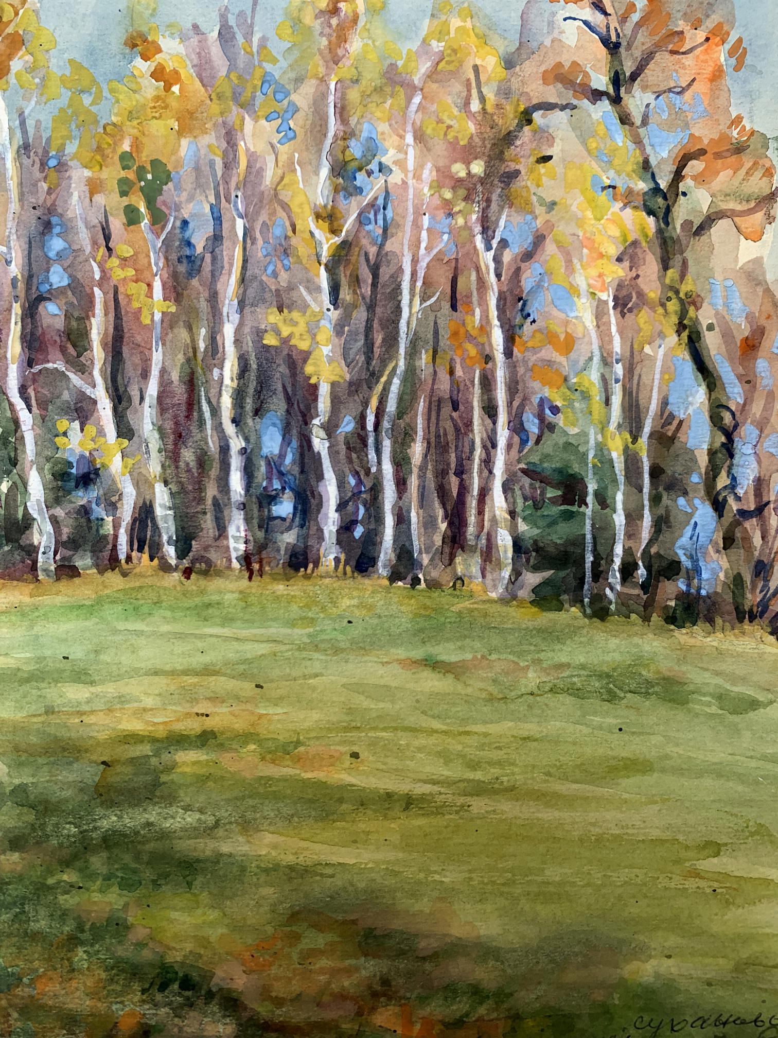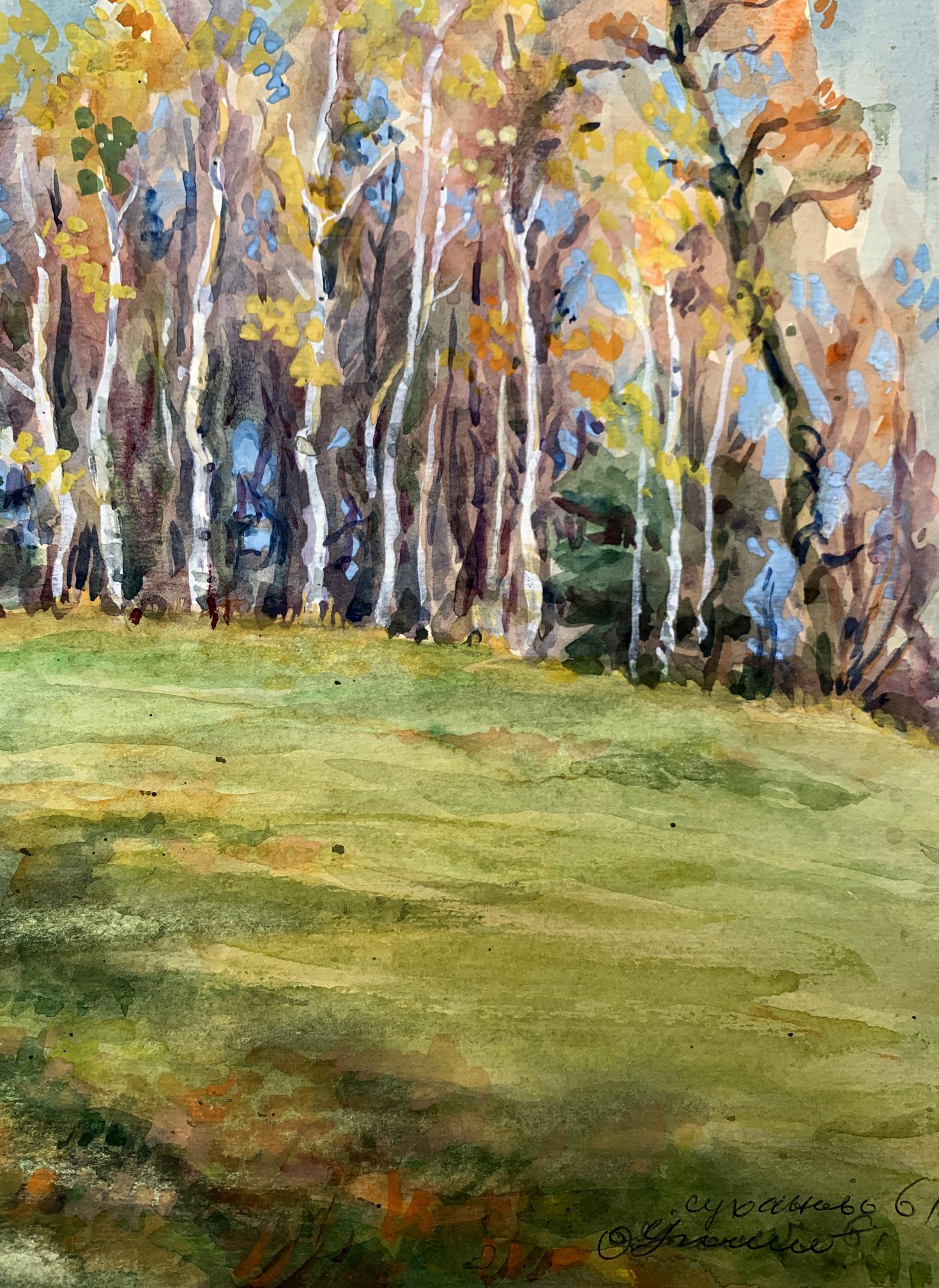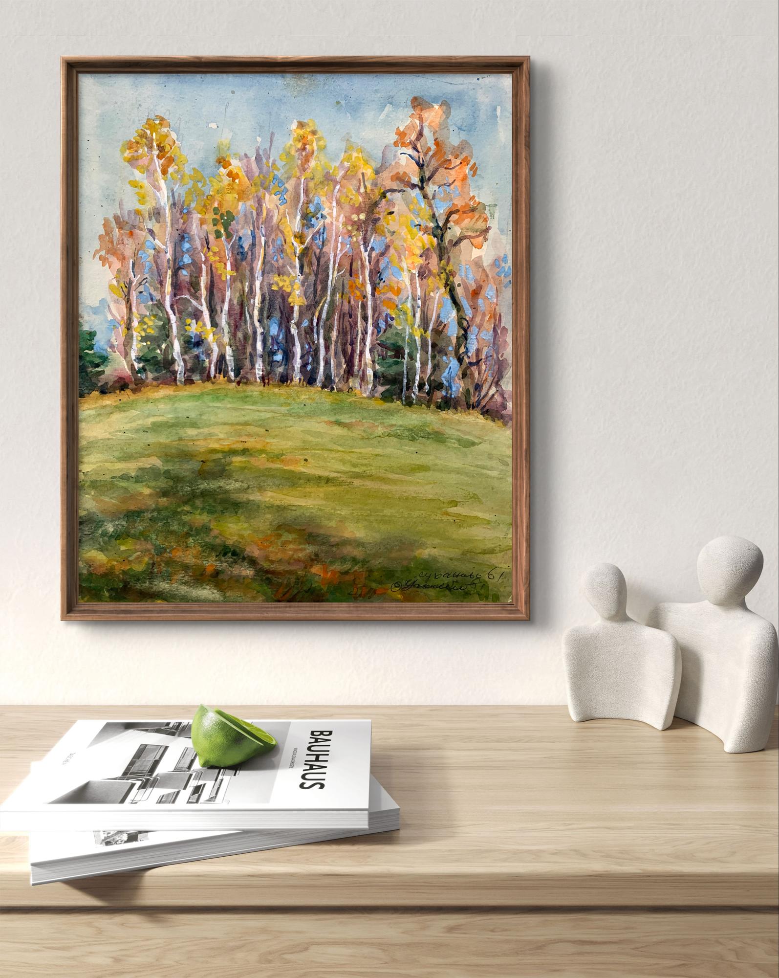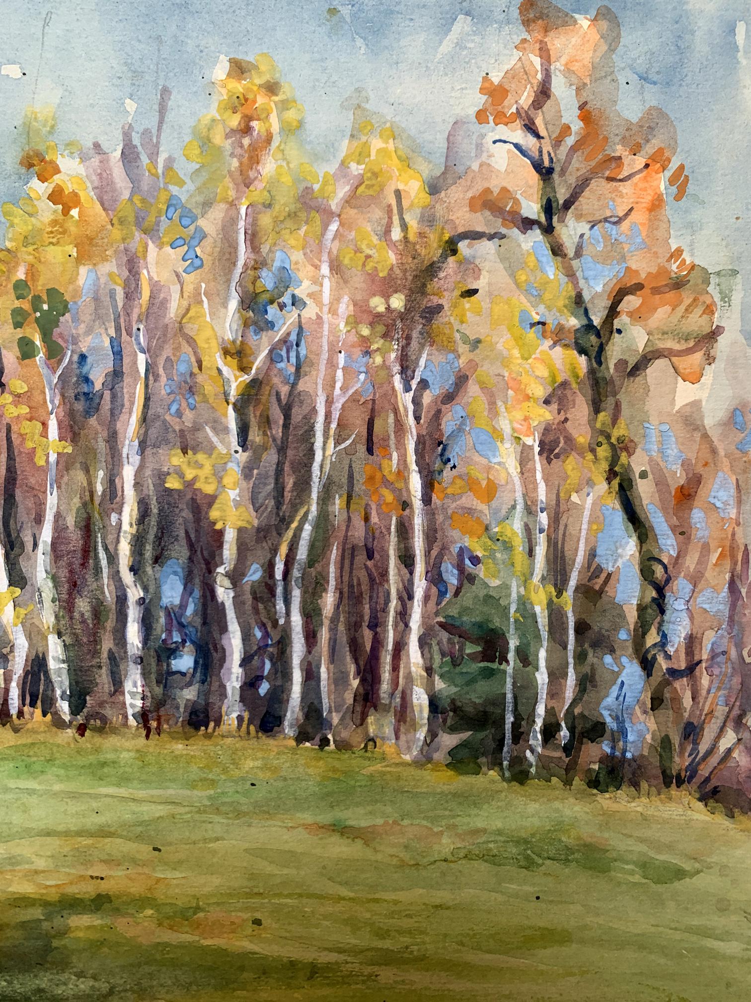The watercolor painting titled "Golden Leaves" captures the tranquil beauty of a birch grove in autumn, emphasizing the richness of nature’s seasonal transformation. The composition centers around a cluster of tall, slender birch trees standing proudly in the sunlight. Their striking white trunks, accented by delicate shadows and splashes of golden and amber leaves, create a vivid contrast against the soft blue sky above and the green meadow below.The artist's use of warm, vibrant tones for the leaves — a blend of yellows, oranges, and hints of brown — showcases the fleeting glory of fall foliage. The trees appear to sway gently, as if moved by a soft breeze, giving the scene a sense of life and dynamism. The interplay of light and shadow on the leaves suggests that the grove is bathed in sunlight, creating a luminous, almost ethereal quality.The foreground features a wide expanse of grass painted in varied shades of green, from muted olive to bright lime, with subtle strokes suggesting the texture of a meadow. This open space provides a calm, grounding balance to the verticality of the trees, drawing the viewer’s gaze upwards to appreciate the beauty of the canopy.The background fades softly into blue and purple hues, hinting at the depth of the forest beyond the birches. This layered effect adds dimension and perspective to the painting, enhancing its immersive quality. The sky, painted in soft washes of pale blue, transitions seamlessly into the golden tones of the treetops, creating a harmonious blend of cool and warm colors.Through "Golden Leaves," the artist aims to celebrate the beauty of autumn as a time of change and reflection. The birch grove, with its golden foliage, becomes a symbol of resilience and grace, standing tall amid the inevitable cycles of nature. The painting invites viewers to pause, take in the moment, and find peace in the simple yet profound beauty of the natural world.
