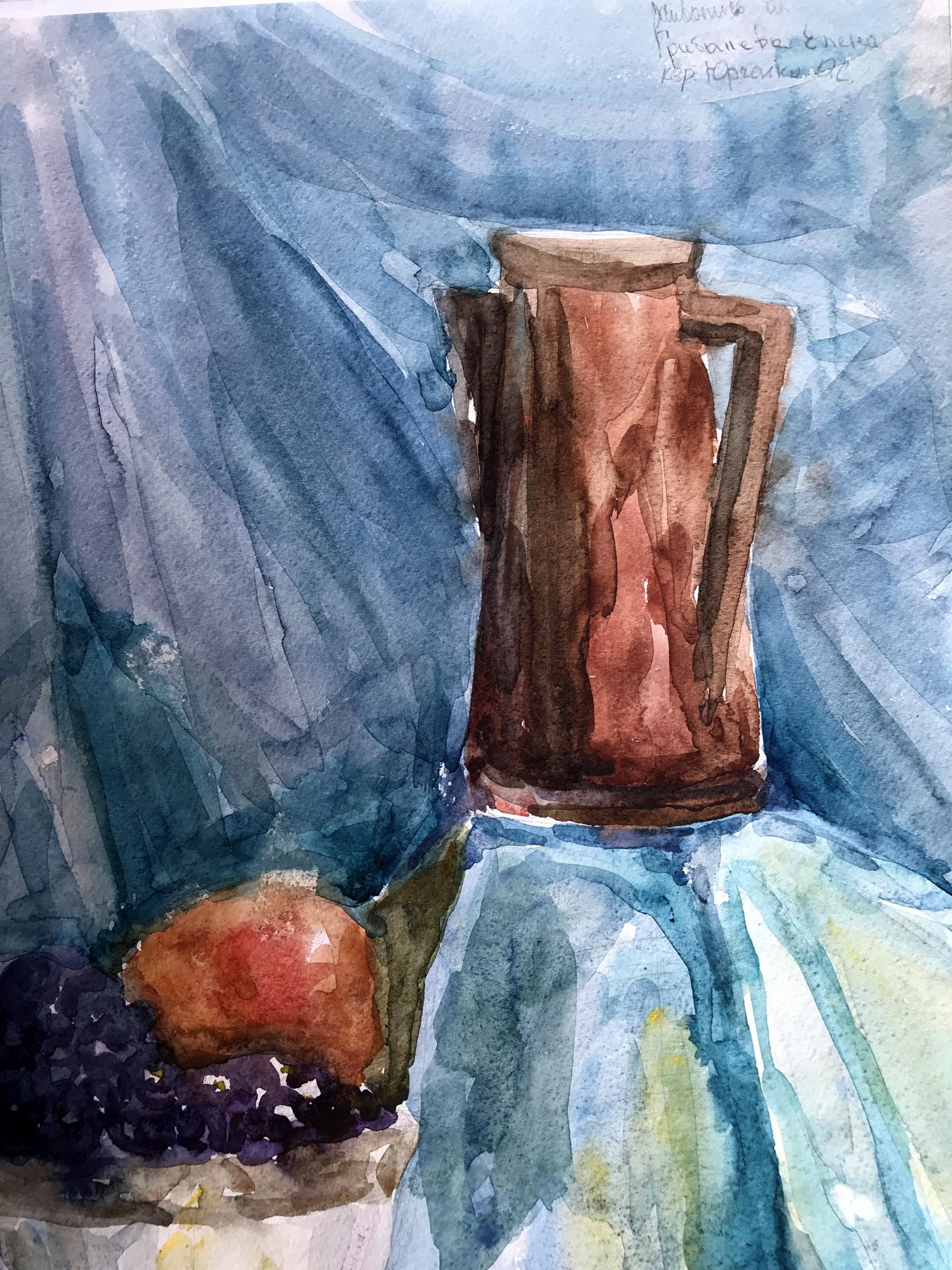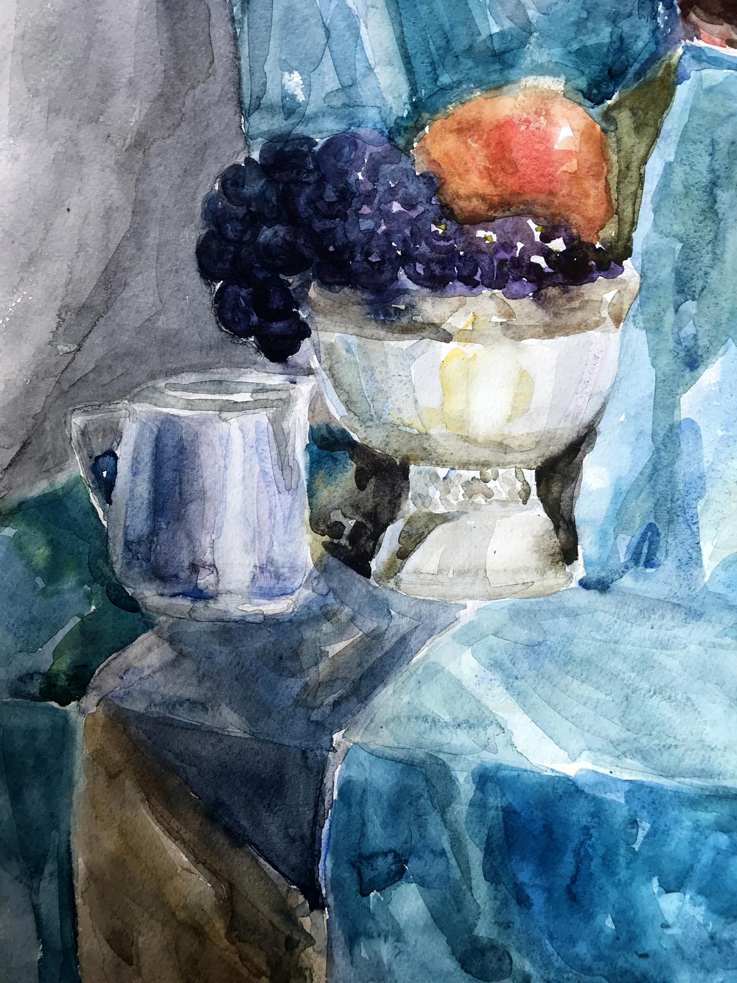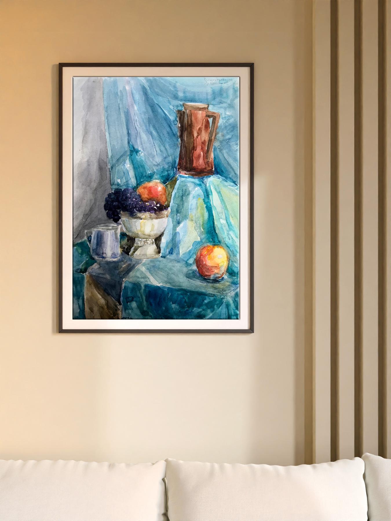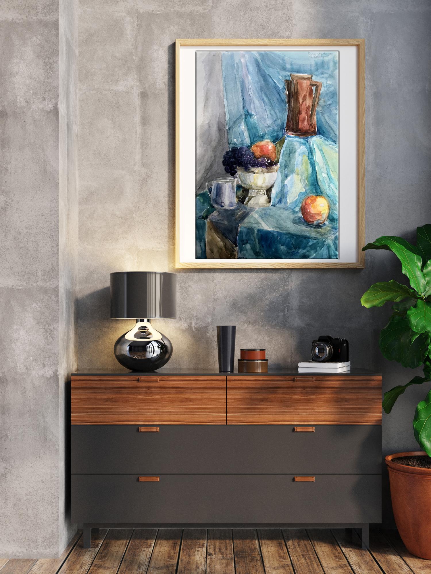 The watercolor painting depicts a simple yet charming still life scene, with a focus on a rustic jug filled with an assortment of ripe grapes and crisp apples. The jug sits prominently on a table, its earthy tones and rough texture creating a sense of warmth and authenticity. The grapes and apples spill out of the jug, their plump and juicy forms inviting the viewer to reach out and grab a handful. The grapes are a deep purple color, with highlights of brighter hues adding depth and interest to their surface. The apples are red, their shiny skins reflecting the light and bringing a sense of freshness and vitality to the painting. The background is a cool, calming blue, creating a sense of contrast to the warm tones of the jug and fruit. The blue is delicately painted, with subtle variations in tone adding depth and interest to the otherwise simple background. Overall, the painting in watercolor captures the beauty and simplicity of a classic still life scene, showcasing the natural beauty and appeal of everyday objects.