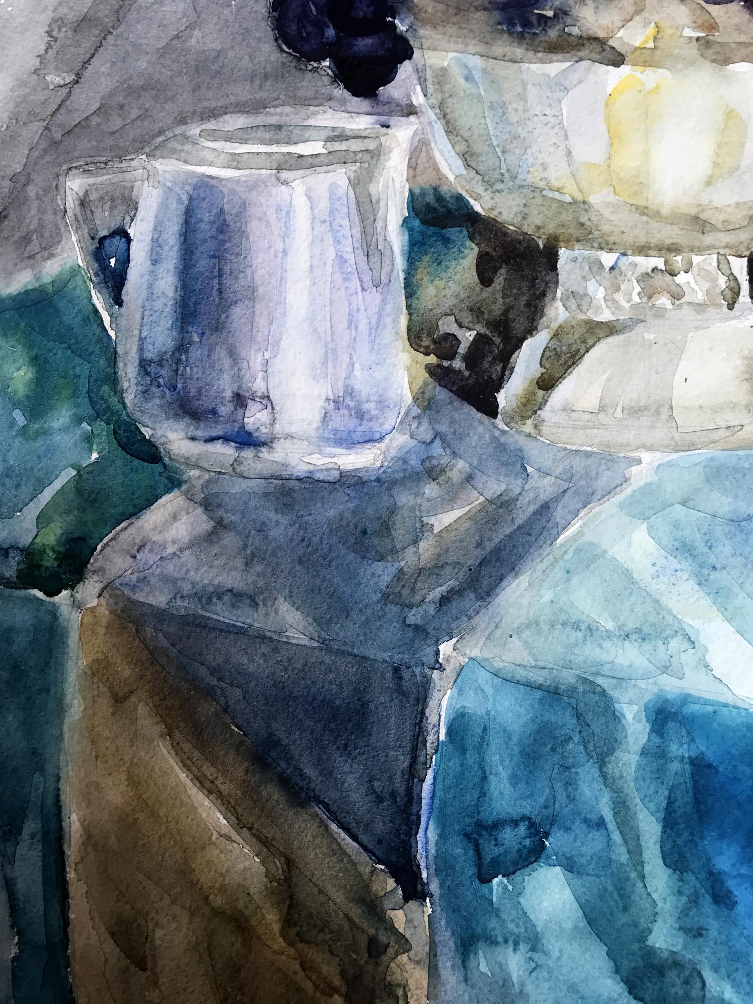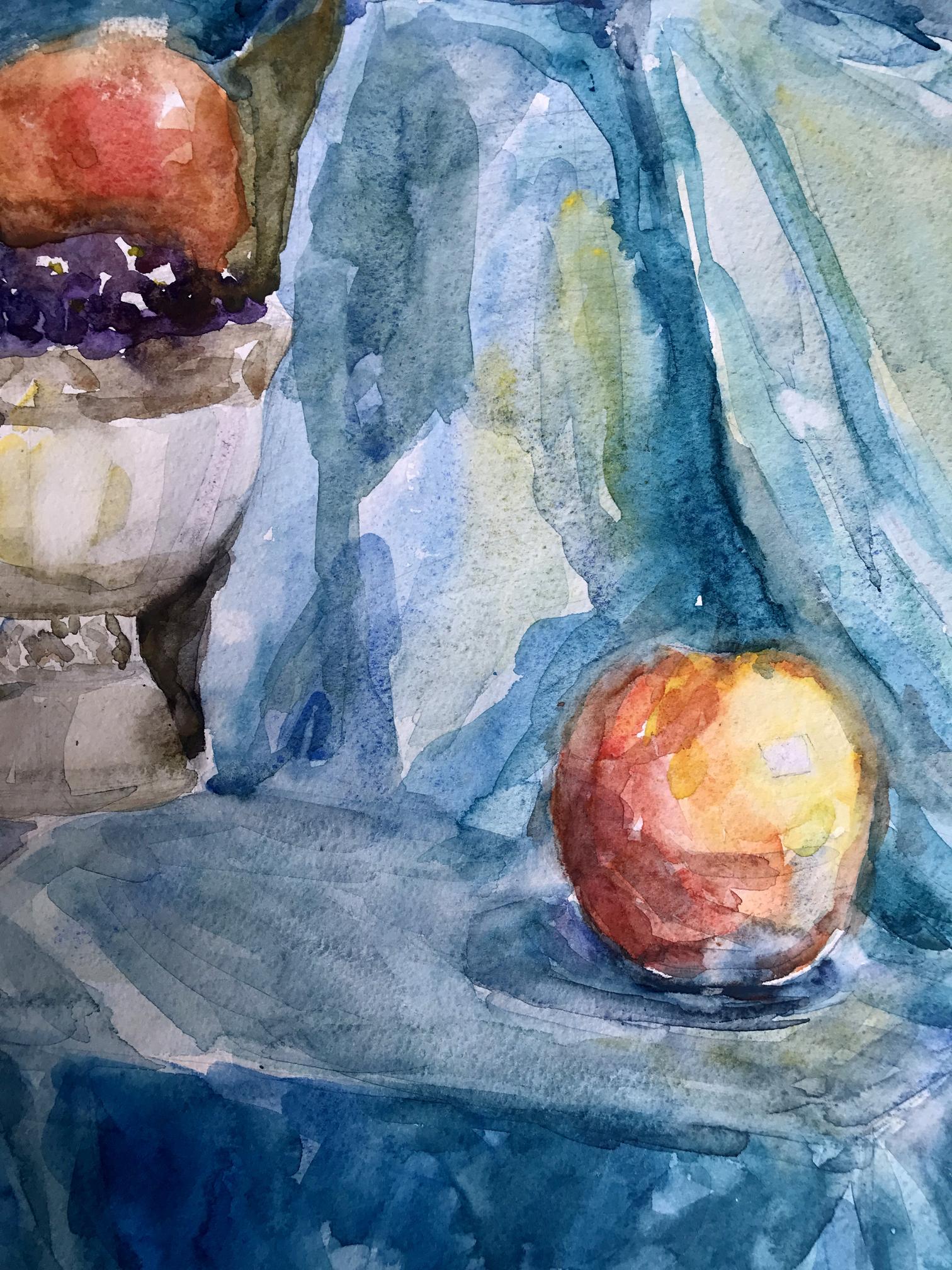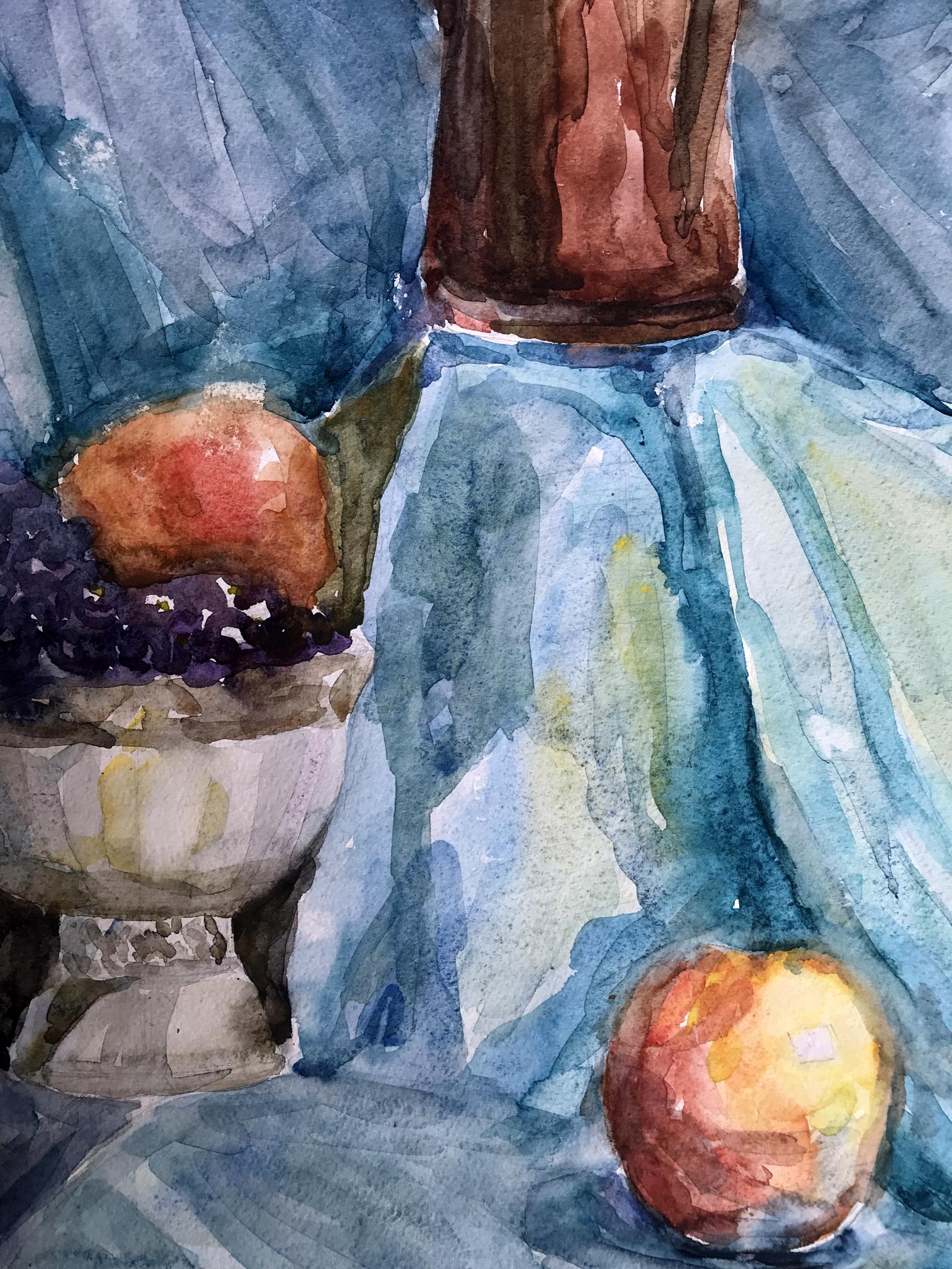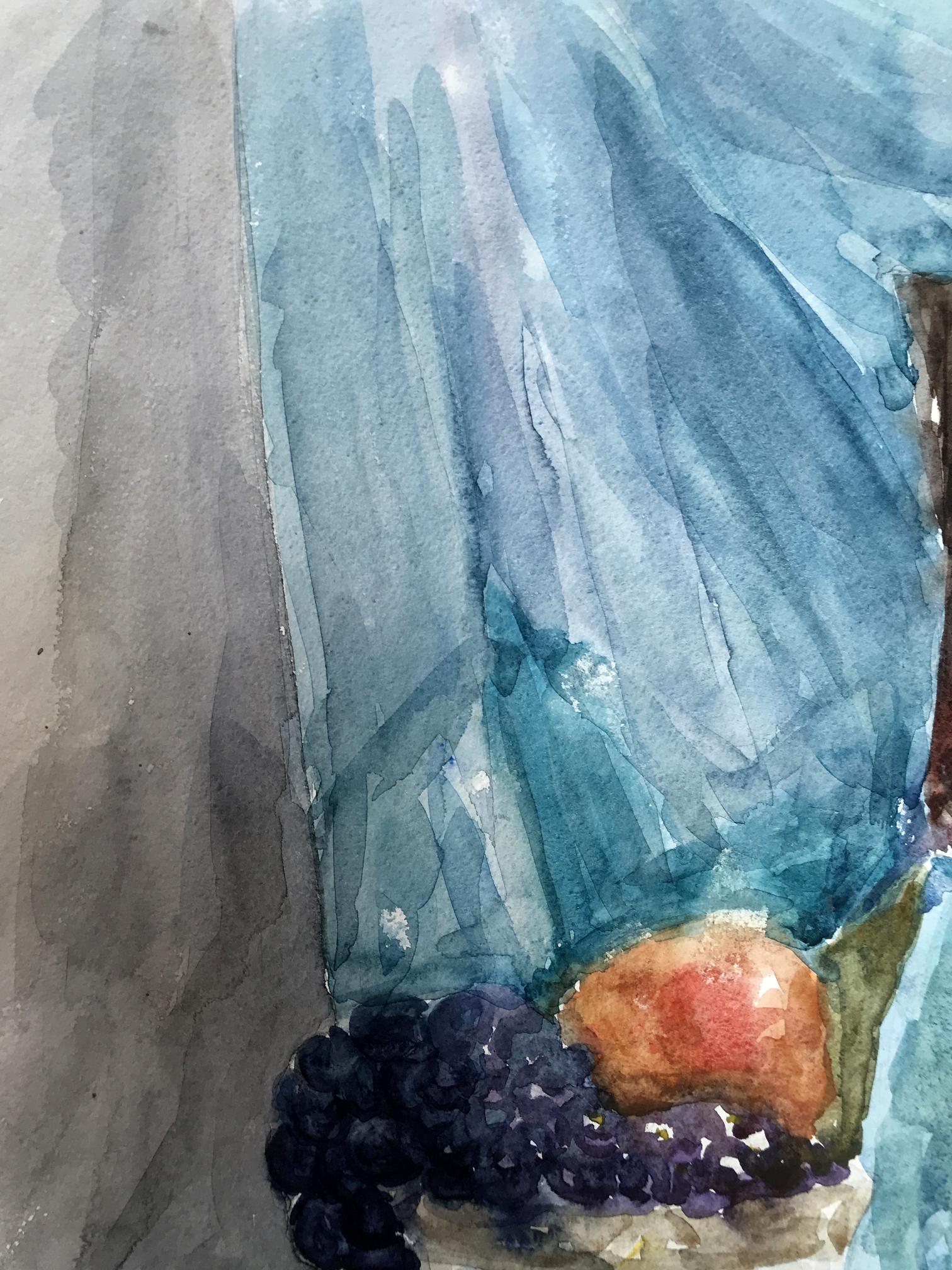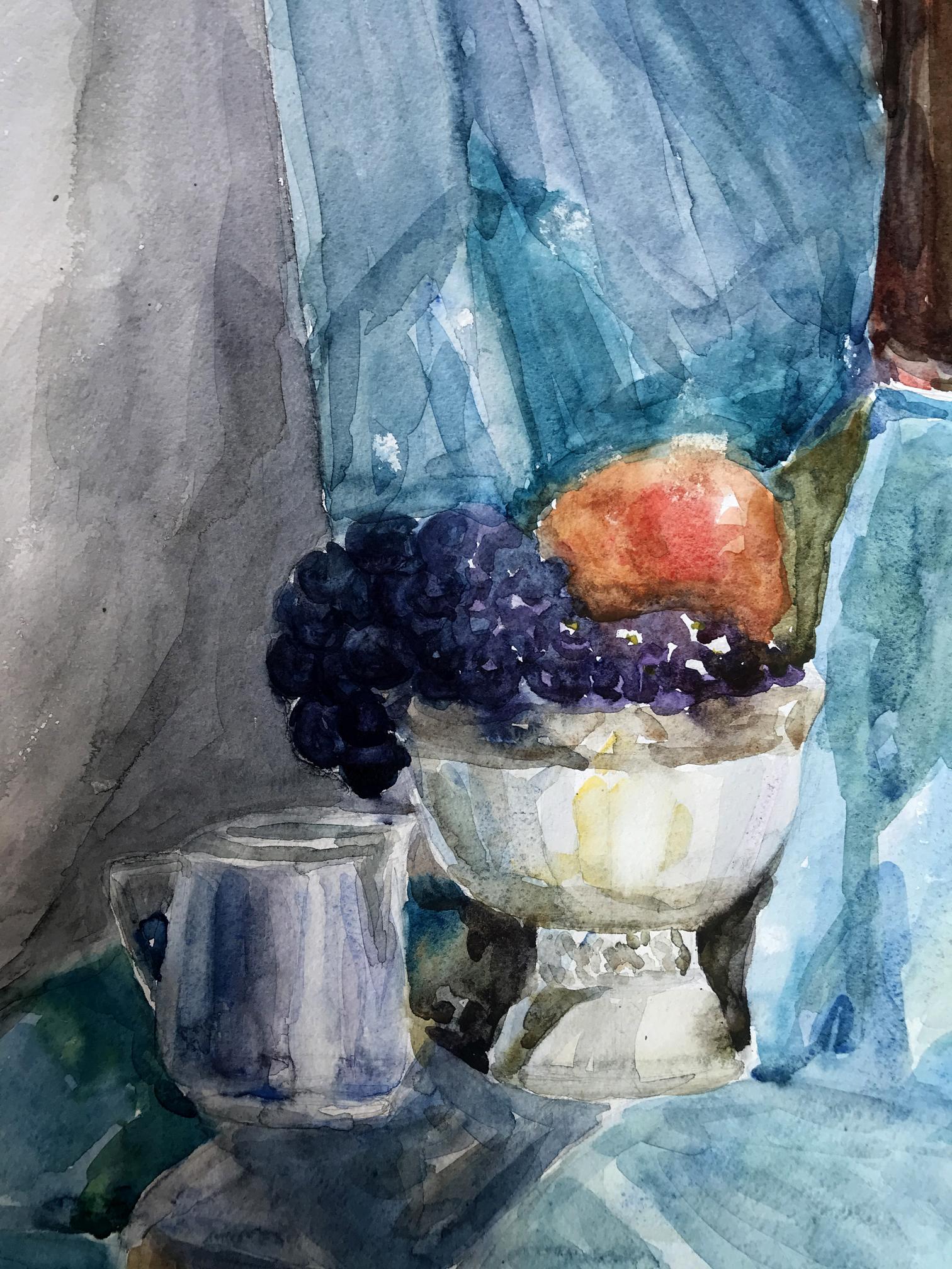 The watercolor painting depicts a simple yet charming still life scene, with a focus on a rustic jug filled with an assortment of ripe grapes and crisp apples. The jug sits prominently on a table, its earthy tones and rough texture creating a sense of warmth and authenticity. The grapes and apples spill out of the jug, their plump and juicy forms inviting the viewer to reach out and grab a handful. The grapes are a deep purple color, with highlights of brighter hues adding depth and interest to their surface. The apples are red, their shiny skins reflecting the light and bringing a sense of freshness and vitality to the painting. The background is a cool, calming blue, creating a sense of contrast to the warm tones of the jug and fruit. The blue is delicately painted, with subtle variations in tone adding depth and interest to the otherwise simple background. Overall, the painting in watercolor captures the beauty and simplicity of a classic still life scene, showcasing the natural beauty and appeal of everyday objects.