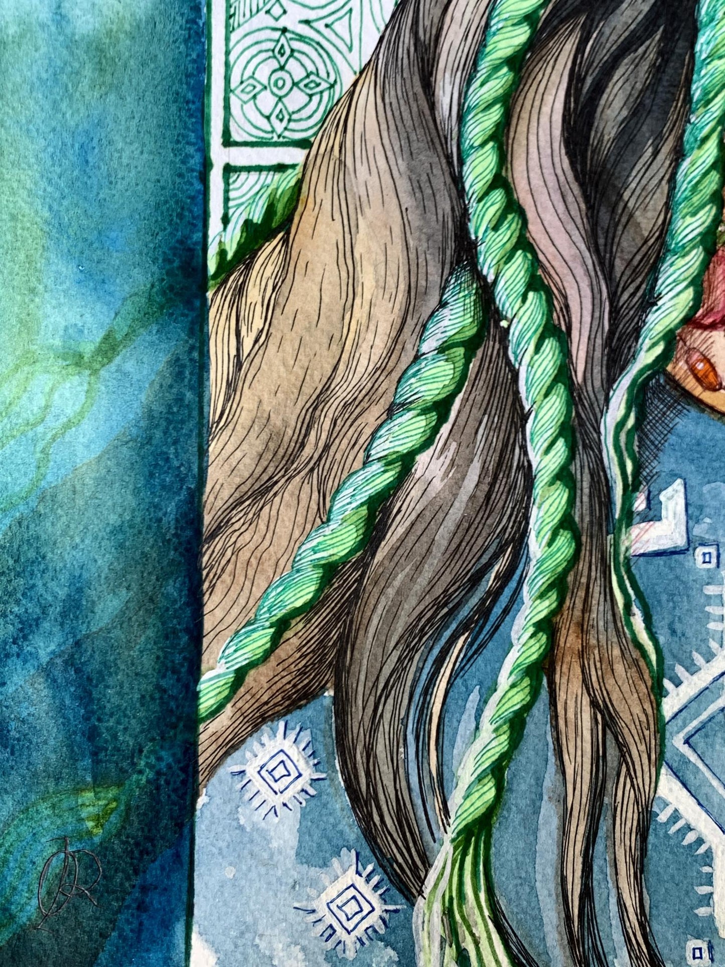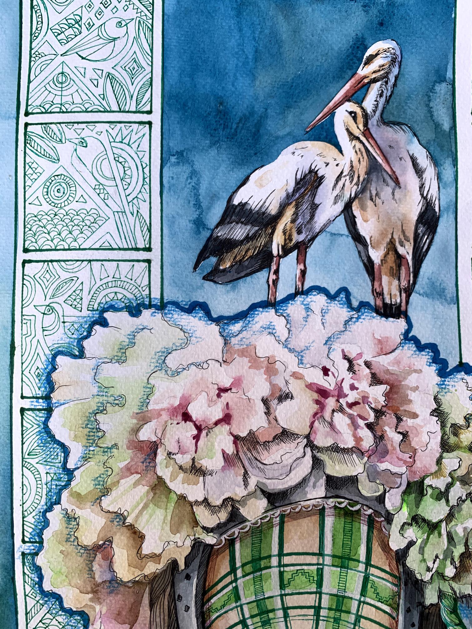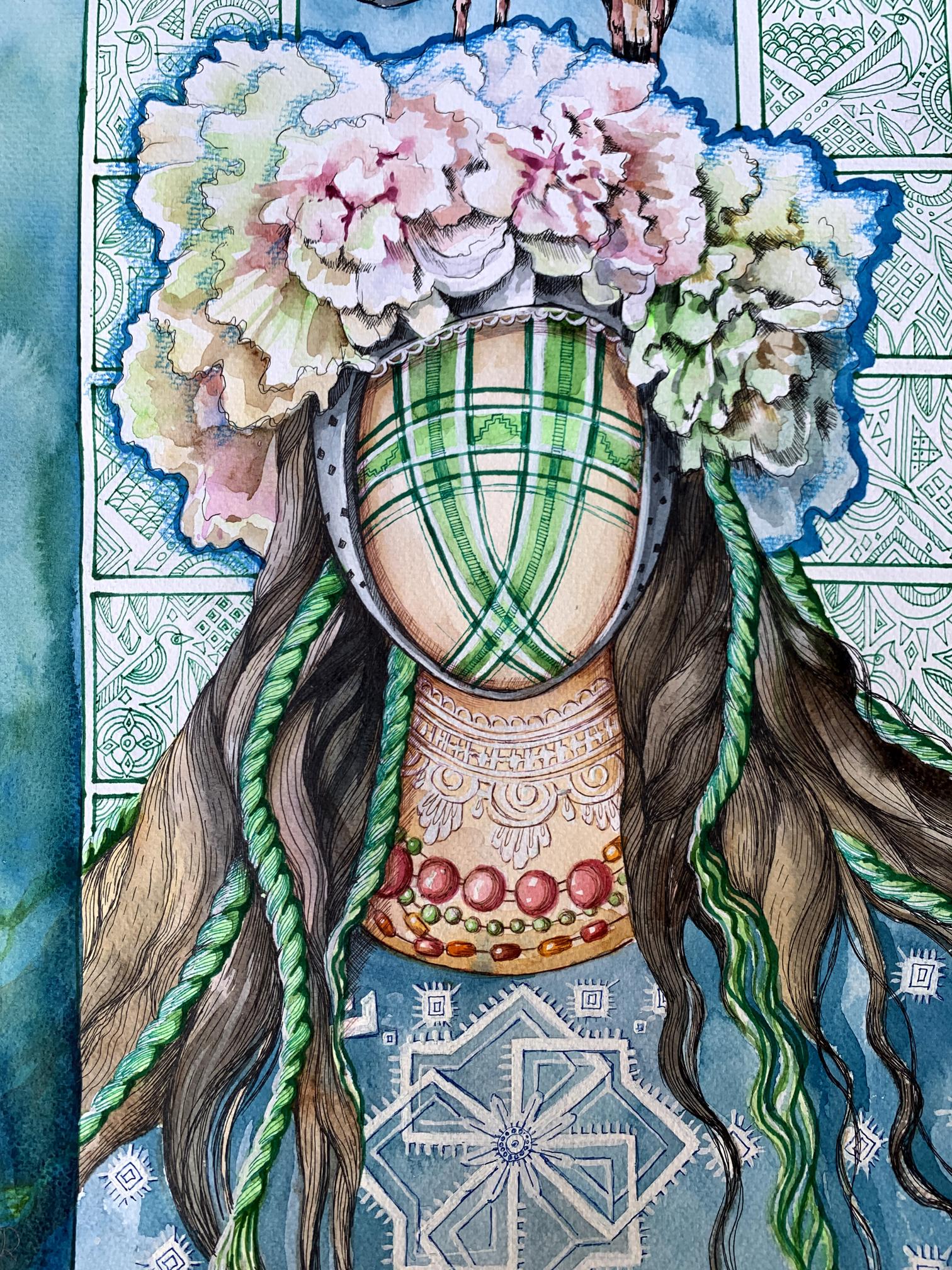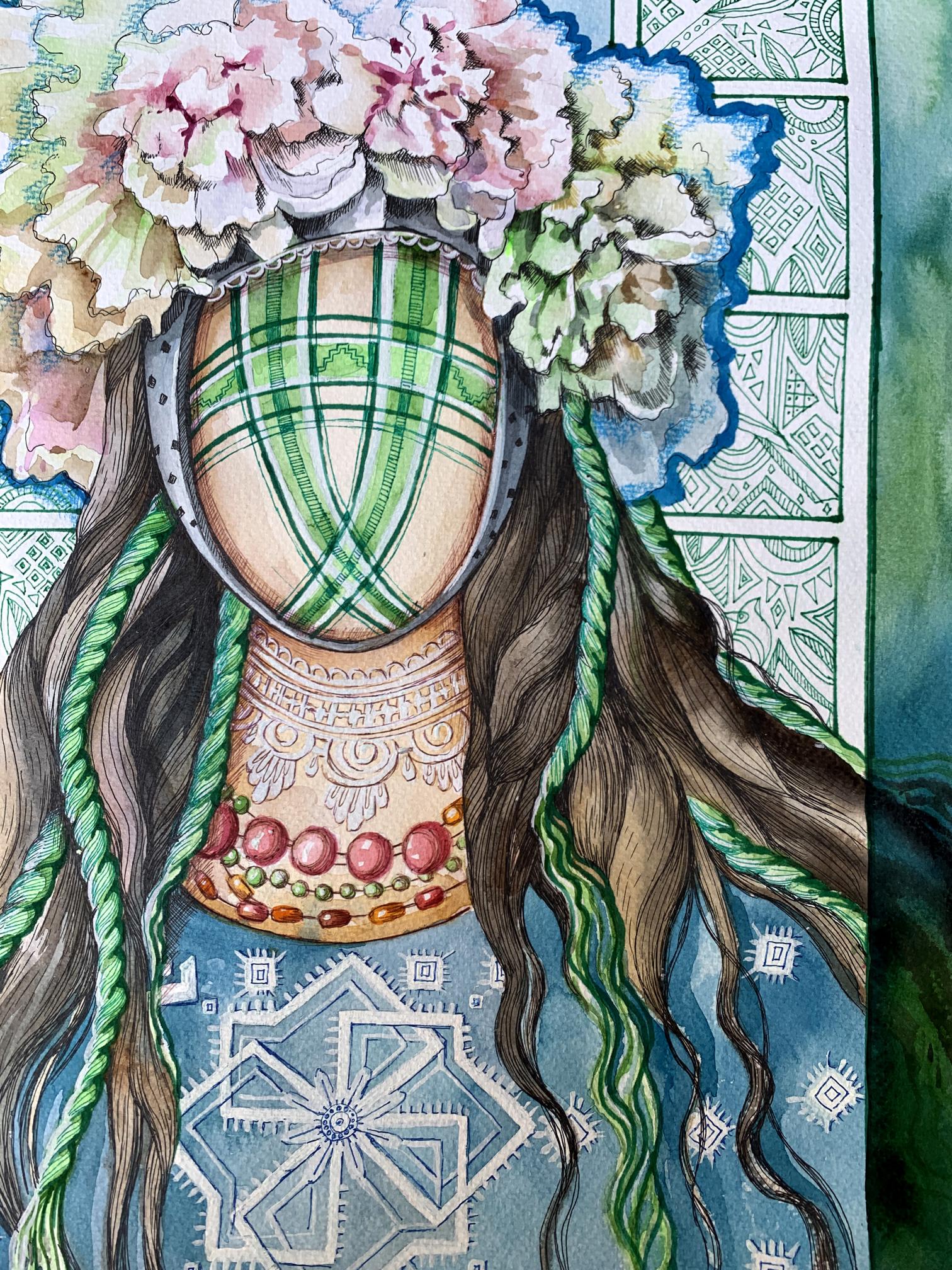 The watercolor and pastel painting titled "Guardian of the Renaissance" presents a stunning composition rich in symbolism, tradition, and cultural heritage. The central figure in the artwork is a faceless female guardian, adorned in a traditional headdress decorated with lush flowers and intricate patterns. Her presence evokes a sense of mystery and timeless wisdom, representing the protector of cultural identity, history, and the renewal of national traditions. The artwork’s vibrant colors and detailed motifs draw the viewer into a world of folklore and spiritual connection with the past.The guardian’s headdress is one of the most striking elements in the painting. It is made of large, blooming flowers in soft shades of pink, white, and green, symbolizing beauty, life, and the continuity of tradition. The delicate petals suggest the fragility of cultural heritage, which requires care and protection. The headdress is an essential part of traditional Ukrainian attire, often worn during important ceremonies, symbolizing purity, femininity, and a deep connection to nature.The guardian’s face is covered with a patterned mask, reinforcing the idea that she represents not an individual, but the collective spirit of a people and their cultural renaissance. The mask’s green and white grid pattern resembles ancient embroidery designs, further emphasizing the preservation of traditional crafts and symbols. The long braids, adorned with green ribbons, cascade down the figure’s shoulders, symbolizing strength, continuity, and the passing of cultural values from one generation to the next.In the upper part of the composition, two storks stand proudly, adding another layer of symbolism. Storks are often associated with family, home, and prosperity in Ukrainian culture. Their presence in the painting signifies the guardian’s role in protecting these values and ensuring the survival and flourishing of cultural traditions. The storks also symbolize rebirth and renewal, aligning with the painting’s theme of cultural renaissance.The background features ornate geometric patterns reminiscent of traditional Ukrainian embroidery, painted in shades of green and white. These patterns frame the guardian and add depth to the composition, connecting the past with the present. The use of these motifs reinforces the idea that cultural heritage is a tapestry woven from countless generations’ contributions, each adding their unique patterns and stories.The color palette of the painting is both calming and vibrant, with shades of blue, green, and pink creating a harmonious balance. The soft blues in the background suggest a connection to the natural world, evoking the sky and water, which are deeply rooted in Ukrainian folklore. The green tones symbolize growth, renewal, and hope, reflecting the theme of cultural revival and the protection of national identity.Through "Guardian of the Renaissance," the artist conveys a powerful message about the importance of preserving cultural heritage and traditions in the face of modern challenges. The guardian serves as a symbol of resilience and strength, reminding viewers of the need to protect and cherish their cultural roots. The painting invites contemplation on the value of history, tradition, and the ongoing renaissance of cultural identity.Ultimately, "Guardian of the Renaissance" is a celebration of cultural preservation and the enduring spirit of a nation. The artwork inspires viewers to reconnect with their heritage, appreciate the beauty of traditional crafts, and recognize the guardians of cultural knowledge in their communities. The painting leaves a lasting impression of hope, resilience, and the timeless significance of cultural renewal.