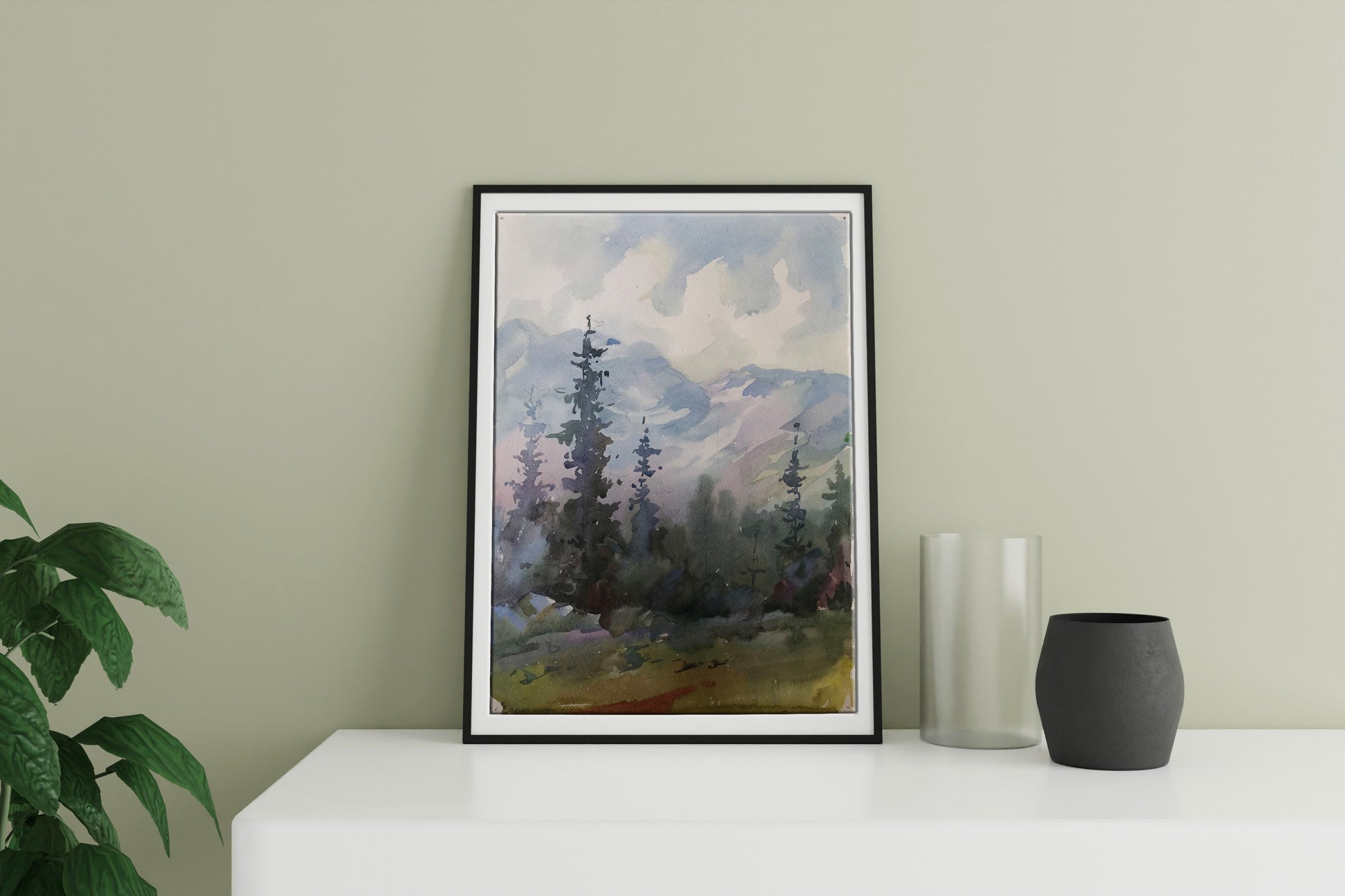 This stunning painting, "Holidays in the mountains", captures the tranquility and beauty of a forest scene. The gentle slope and clearing in the foreground lead to tall fir trees, with the mountains beyond. The colors are peaceful and serene, making this an ideal choice for anyone looking to create a relaxing ambiance in their home.