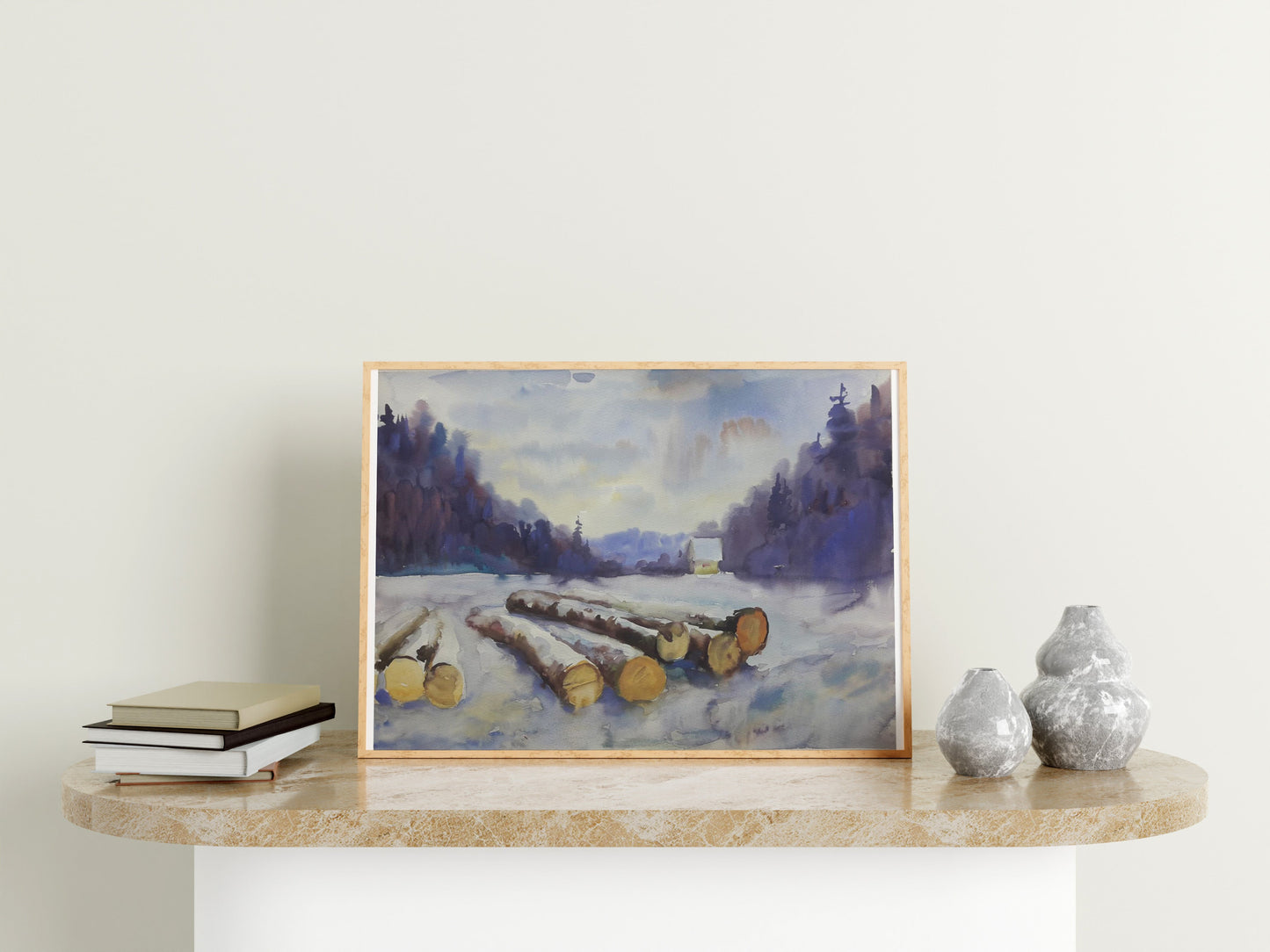 Invite the quiet and reflective beauty of "Logs" into your space, and let it serve as a daily reminder of the serene and enduring spirit of nature's winter garb. This painting is more than just an image; it's a portal to a peaceful, snow-covered world, waiting to be explored and cherished.