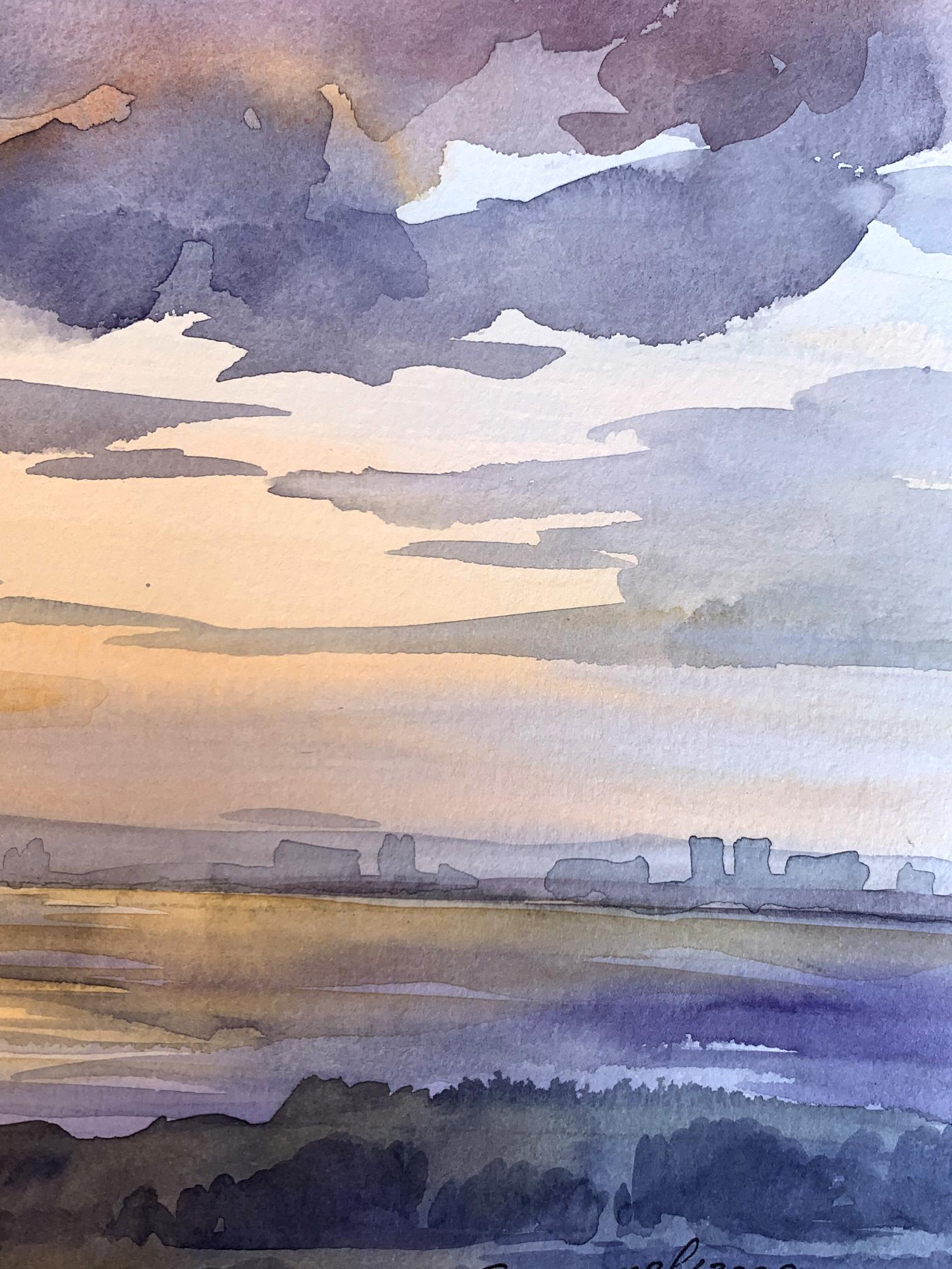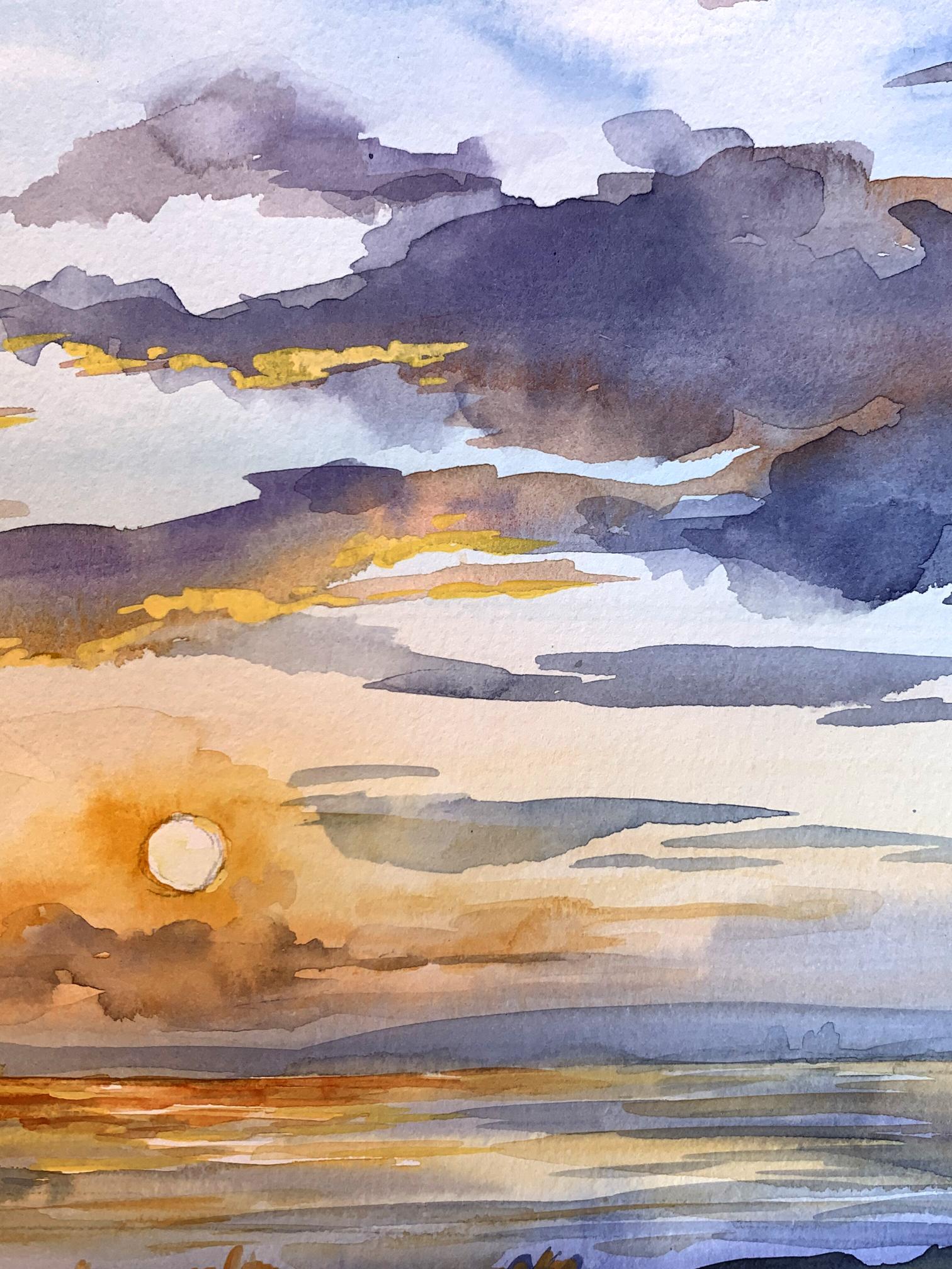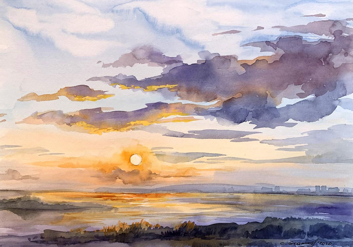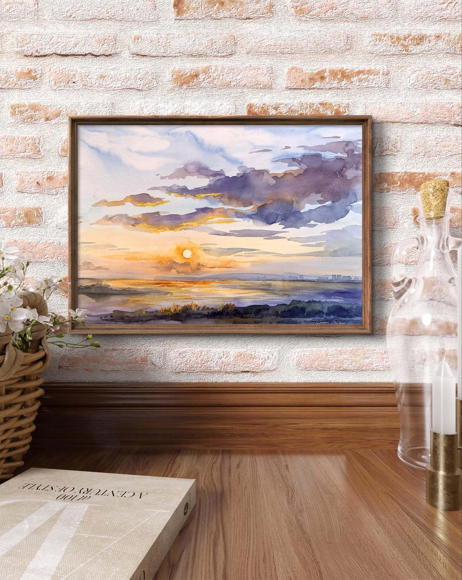 "Magic Sea" is a captivating watercolor painting that beautifully captures the enchanting atmosphere of a seaside sunset. The artist employs a delicate balance of color, light, and texture to create a serene and magical scene that invites viewers to experience the tranquil beauty of the sea. The sky dominates the upper portion of the painting, filled with soft pastels and vibrant hues. The artist uses a blend of purples, blues, and oranges to depict the transition from day to night. The clouds are painted with varying intensities, creating depth and movement in the sky. The setting sun is the focal point of the painting, rendered in a warm, glowing orange. The sun is partially obscured by wisps of clouds, giving it a mystical appearance. The surrounding sky is bathed in golden light, highlighting the ethereal quality of the scene. The sea reflects the colors of the sky, with gentle waves and ripples capturing the shimmering light. The artist uses a combination of wet-on-wet and dry brush techniques to create the illusion of water's fluidity and transparency. The foreground features darker, more muted tones, providing contrast and grounding the composition. In the distance, the horizon line is faintly visible, with subtle indications of land or distant structures. This element adds depth to the painting and enhances the sense of vastness and tranquility. The composition is balanced, with the sun positioned slightly off-center to the right, creating a harmonious flow. The clouds and reflections in the water guide the viewer's eye through the painting, ensuring a cohesive visual experience. The perspective is wide and expansive, allowing the viewer to take in the full breadth of the sunset and sea. This viewpoint emphasizes the grandeur and serenity of the natural scene. The glowing sun is a central element, symbolizing the end of the day and the promise of a peaceful night. Its warm light contrasts beautifully with the cooler tones of the sky and sea. The clouds add texture and dynamism to the sky, their varied shapes and colors enhancing the painting's ethereal quality. The reflections in the water are skillfully rendered, capturing the interplay of light and color on the sea's surface. This element adds a layer of realism and beauty to the scene. The overall mood of "Magic Sea" is one of tranquility and enchantment. The gentle transition of colors, the serene reflections, and the warm glow of the sunset create a soothing and magical atmosphere. The painting invites viewers to pause and appreciate the fleeting beauty of a seaside sunset. "Magic Sea" can be interpreted as a celebration of nature's beauty and the peaceful moments that come with the close of day. The painting captures a moment of stillness and wonder, offering a visual escape into a serene and magical world. Overall, "Magic Sea" is a masterfully executed watercolor painting that captures the serene and magical essence of a seaside sunset. The artist's use of color, light, and composition creates a captivating scene that invites viewers to experience the tranquil beauty of the natural world.