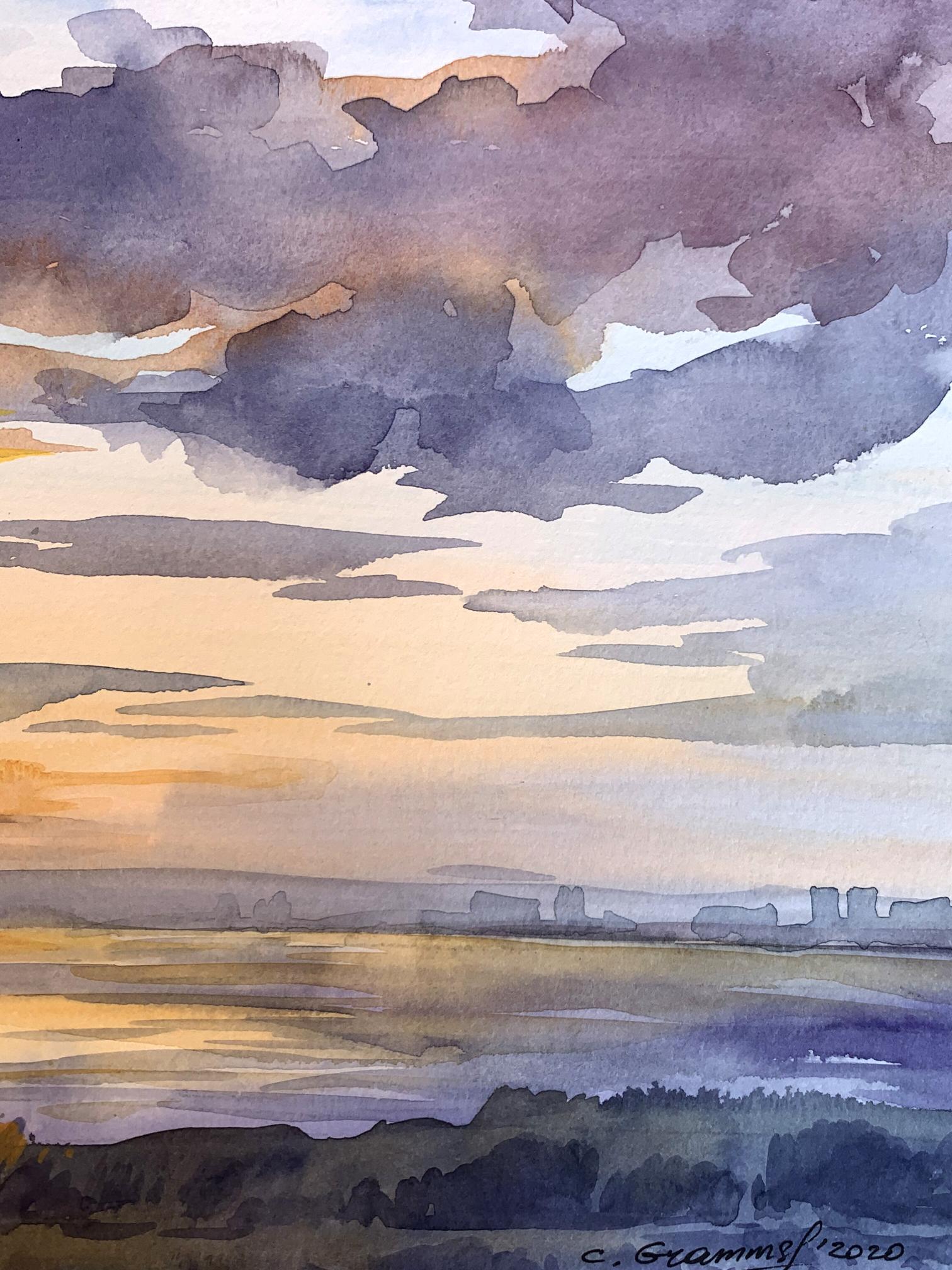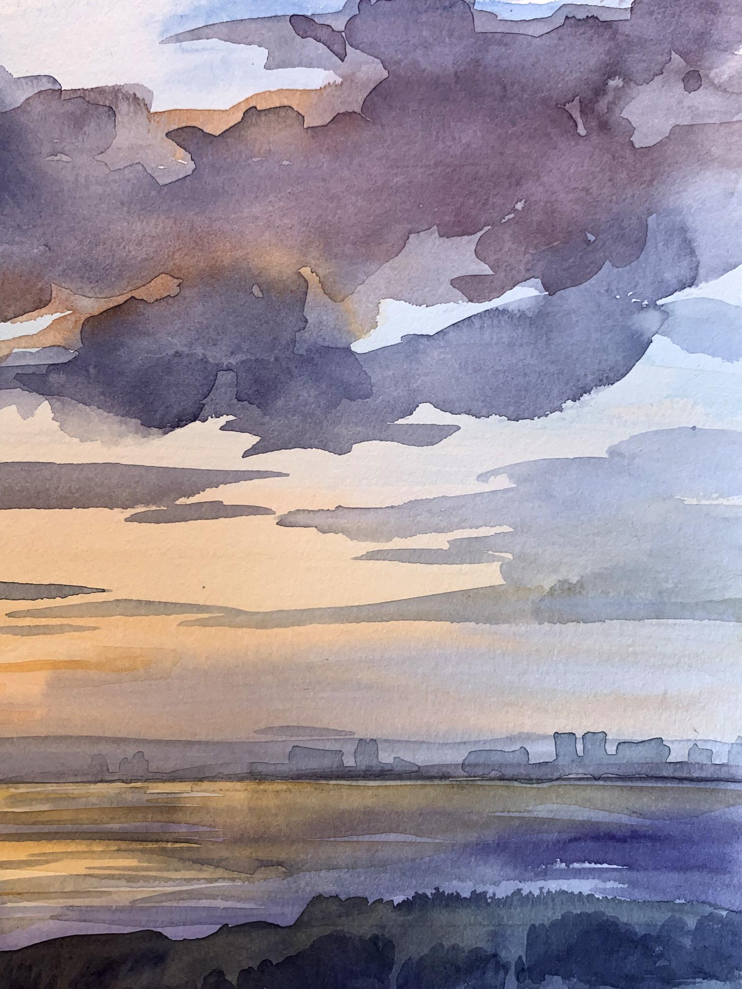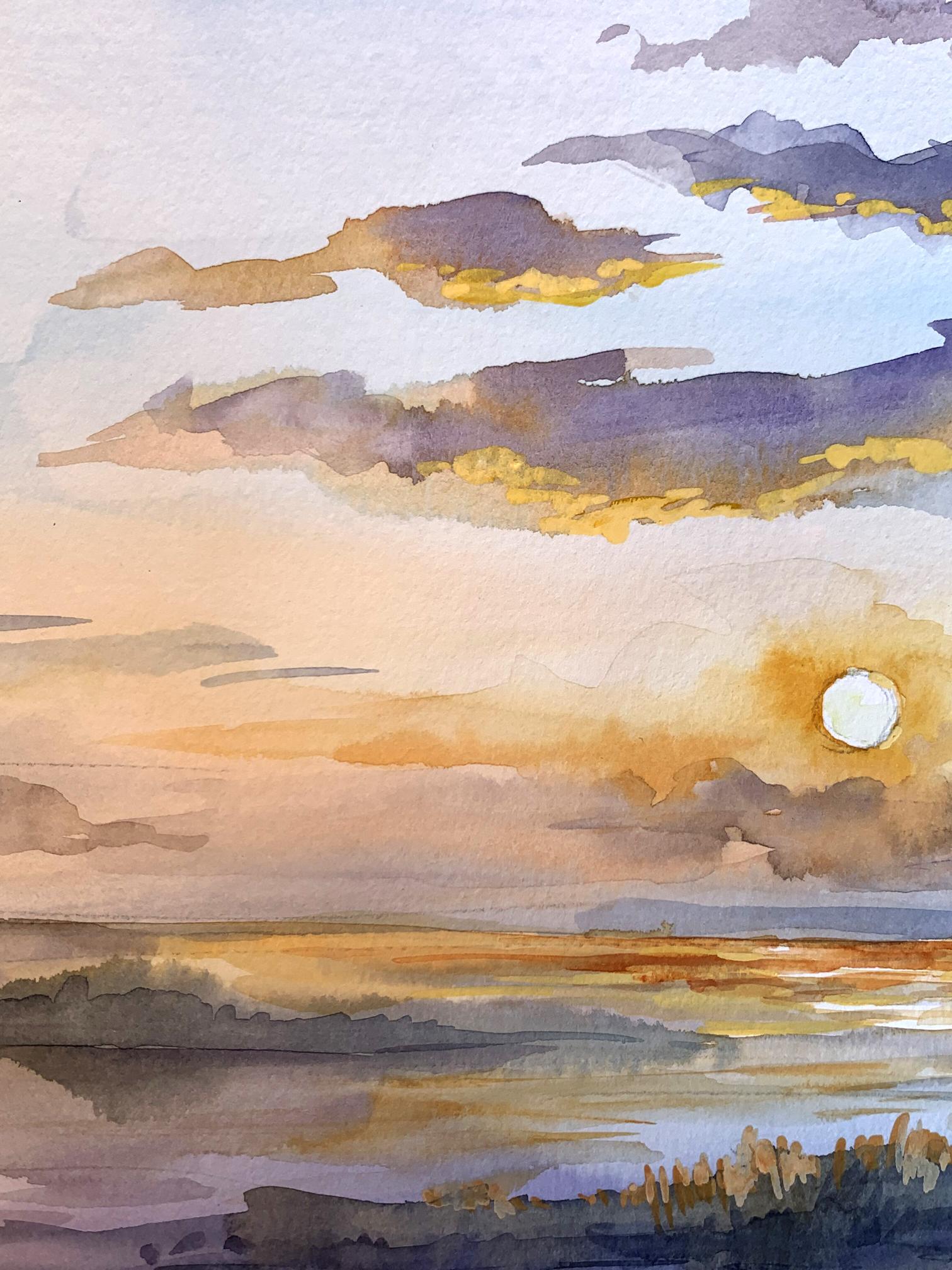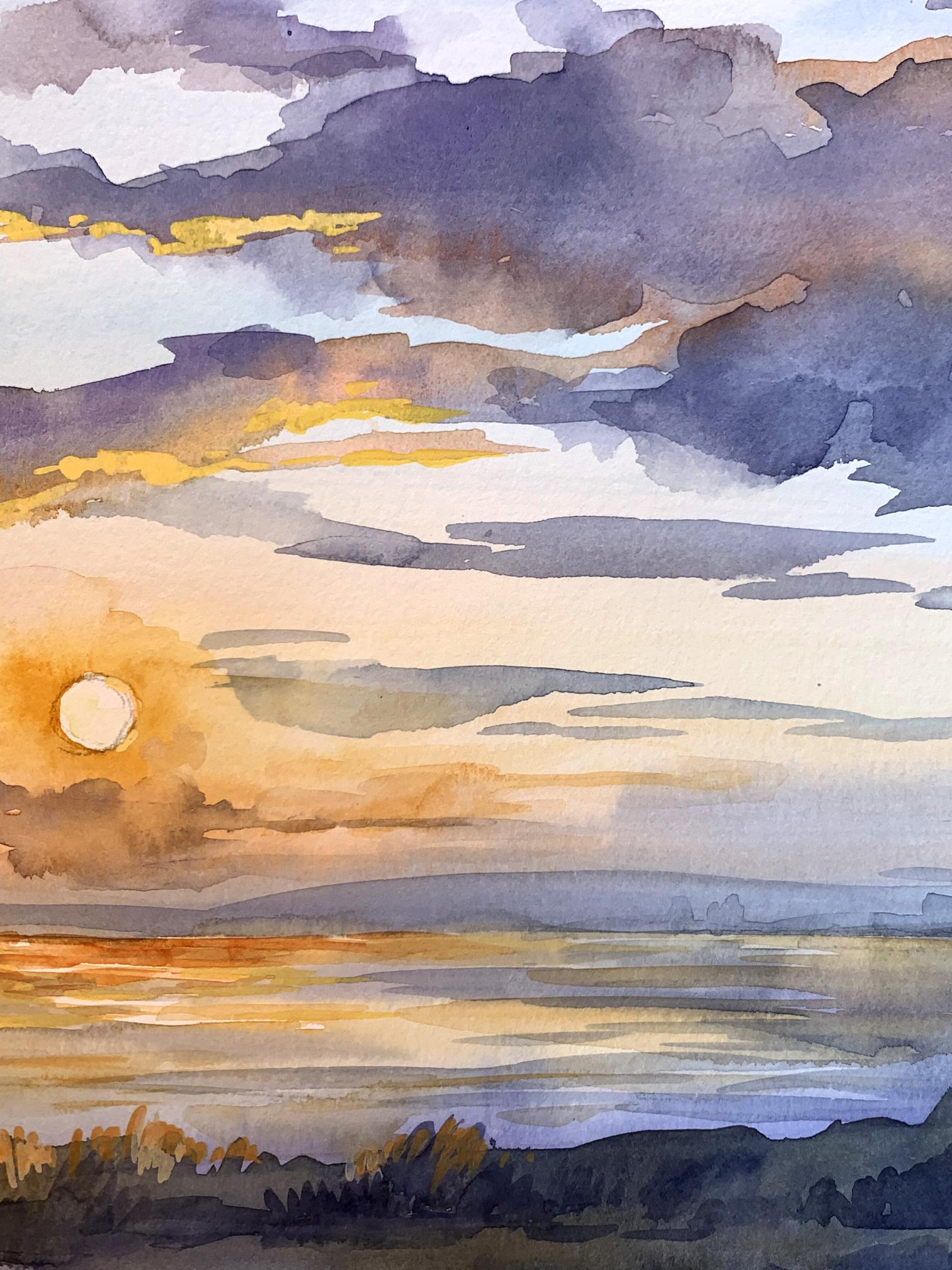 "Magic Sea" is a captivating watercolor painting that beautifully captures the enchanting atmosphere of a seaside sunset. The artist employs a delicate balance of color, light, and texture to create a serene and magical scene that invites viewers to experience the tranquil beauty of the sea. The sky dominates the upper portion of the painting, filled with soft pastels and vibrant hues. The artist uses a blend of purples, blues, and oranges to depict the transition from day to night. The clouds are painted with varying intensities, creating depth and movement in the sky. The setting sun is the focal point of the painting, rendered in a warm, glowing orange. The sun is partially obscured by wisps of clouds, giving it a mystical appearance. The surrounding sky is bathed in golden light, highlighting the ethereal quality of the scene. The sea reflects the colors of the sky, with gentle waves and ripples capturing the shimmering light. The artist uses a combination of wet-on-wet and dry brush techniques to create the illusion of water's fluidity and transparency. The foreground features darker, more muted tones, providing contrast and grounding the composition. In the distance, the horizon line is faintly visible, with subtle indications of land or distant structures. This element adds depth to the painting and enhances the sense of vastness and tranquility. The composition is balanced, with the sun positioned slightly off-center to the right, creating a harmonious flow. The clouds and reflections in the water guide the viewer's eye through the painting, ensuring a cohesive visual experience. The perspective is wide and expansive, allowing the viewer to take in the full breadth of the sunset and sea. This viewpoint emphasizes the grandeur and serenity of the natural scene. The glowing sun is a central element, symbolizing the end of the day and the promise of a peaceful night. Its warm light contrasts beautifully with the cooler tones of the sky and sea. The clouds add texture and dynamism to the sky, their varied shapes and colors enhancing the painting's ethereal quality. The reflections in the water are skillfully rendered, capturing the interplay of light and color on the sea's surface. This element adds a layer of realism and beauty to the scene. The overall mood of "Magic Sea" is one of tranquility and enchantment. The gentle transition of colors, the serene reflections, and the warm glow of the sunset create a soothing and magical atmosphere. The painting invites viewers to pause and appreciate the fleeting beauty of a seaside sunset. "Magic Sea" can be interpreted as a celebration of nature's beauty and the peaceful moments that come with the close of day. The painting captures a moment of stillness and wonder, offering a visual escape into a serene and magical world. Overall, "Magic Sea" is a masterfully executed watercolor painting that captures the serene and magical essence of a seaside sunset. The artist's use of color, light, and composition creates a captivating scene that invites viewers to experience the tranquil beauty of the natural world.