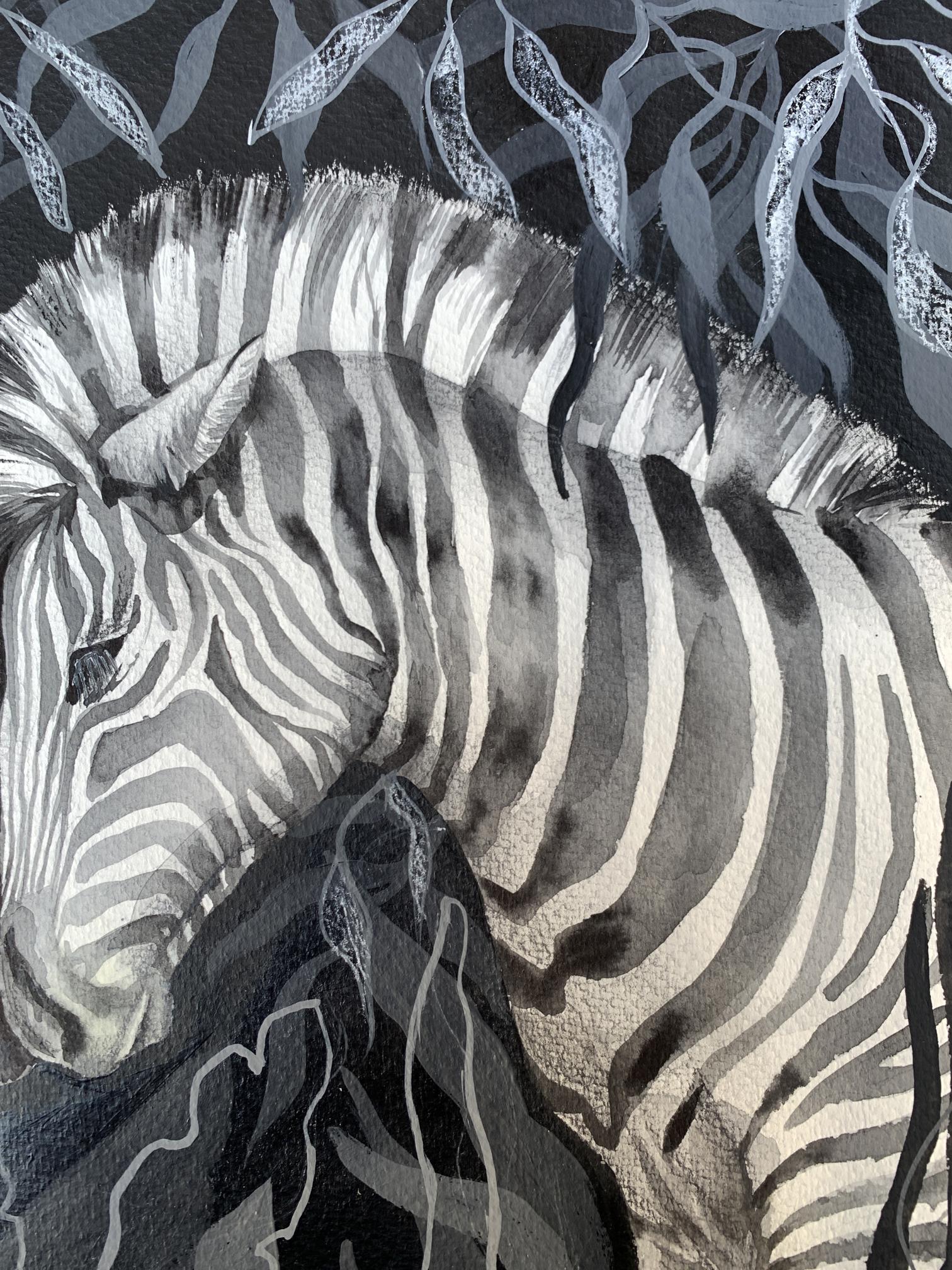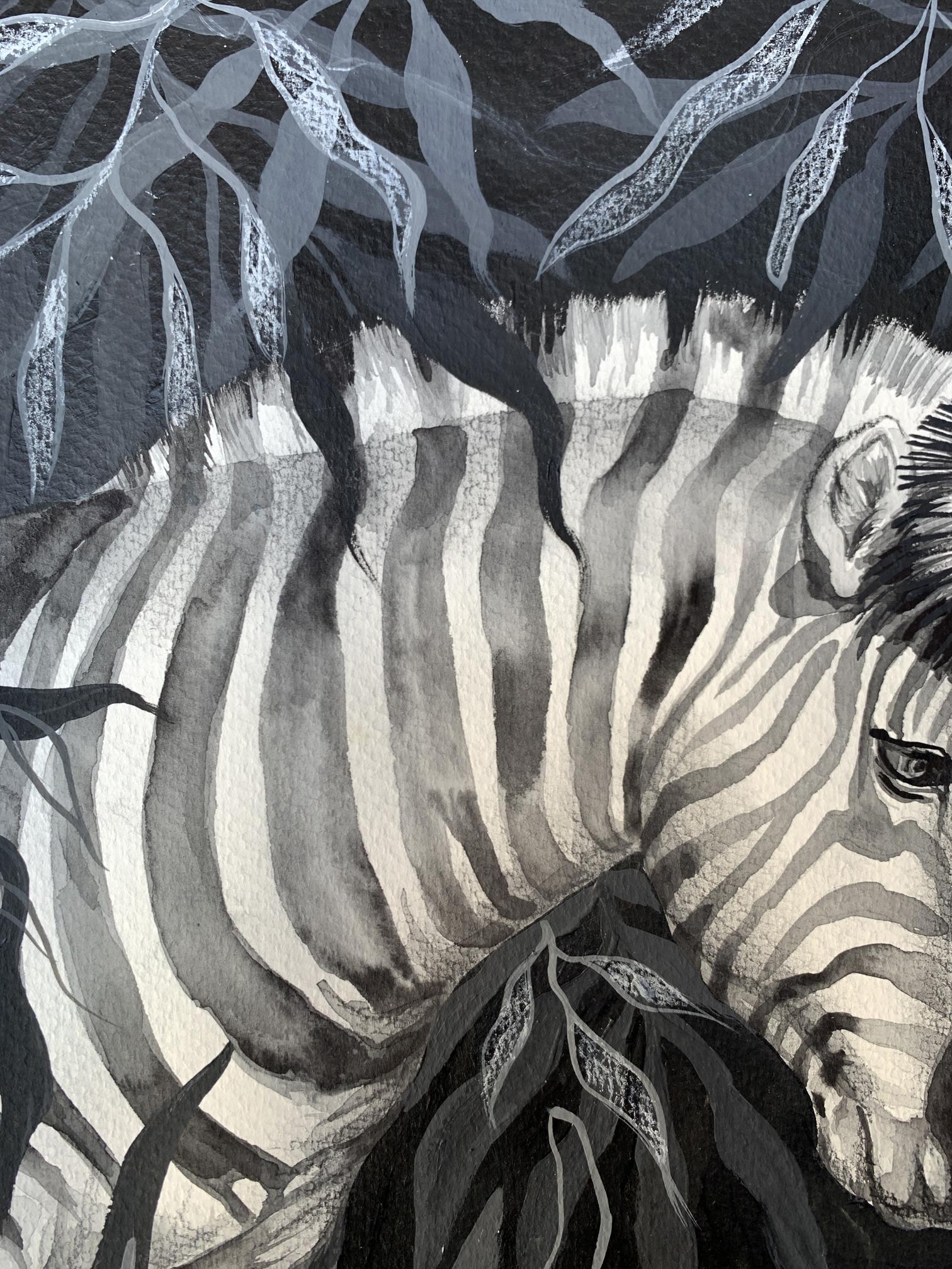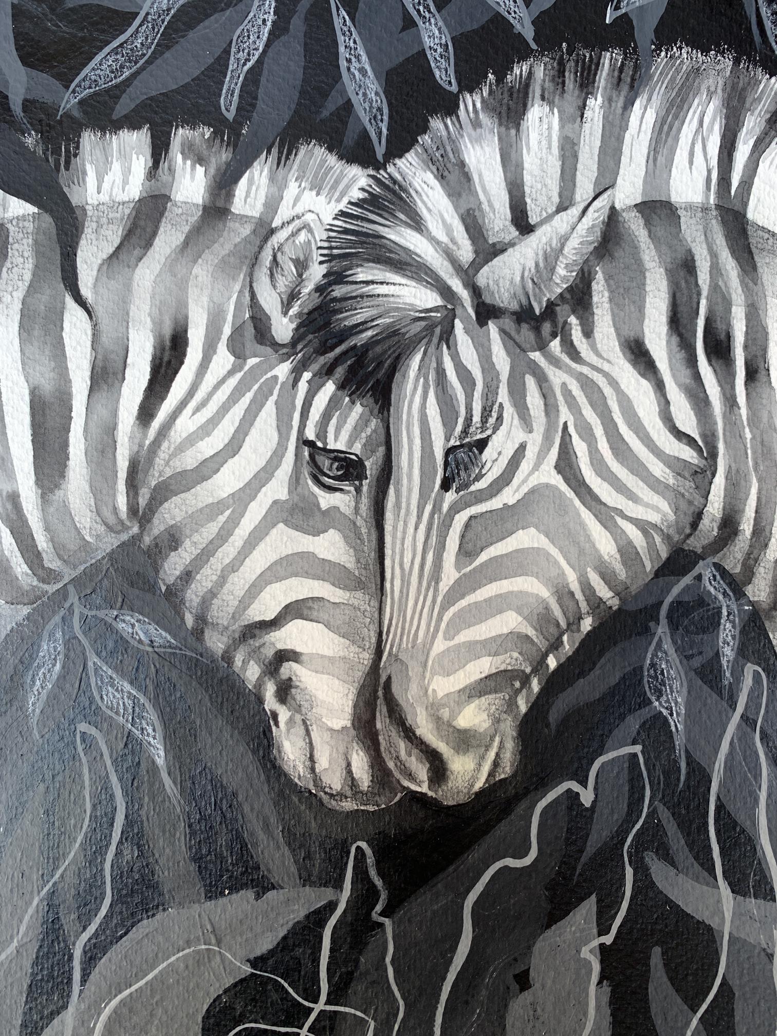 The painting "Meeting of Two Zebras" is a striking composition rendered in watercolor, acrylic, and pencil on paper. The artwork captures an intimate moment between two zebras, their heads gently leaning against one another, symbolizing connection, trust, and harmony. The monochromatic palette of black, white, and varying shades of gray brings a timeless elegance to the piece, while the detailed textures and patterns evoke both realism and abstraction.At the center of the painting are the two zebras, whose striped coats intertwine, creating a mesmerizing visual rhythm. The stripes serve as more than just a defining feature of their appearance; they symbolize individuality within unity. The way their patterns merge highlights the balance between their distinct identities and the bond they share. The expressions on the zebras' faces convey a sense of calmness and understanding, as though they are silently communicating in the stillness of their natural surroundings.The background is filled with intricate foliage, rendered in shades of gray and black, which frames the zebras and adds depth to the composition. The leaves, with their delicate outlines and subtle textures, create a sense of enclosure, as if the zebras are hidden in a private sanctuary. This detail adds a layer of mystery to the scene, suggesting a moment of quiet connection away from the outside world.The interplay of light and shadow is masterfully executed, with the zebras illuminated against the darker backdrop. This contrast not only emphasizes their presence but also imbues the piece with an almost ethereal quality. The gentle blending of the watercolor and the sharp lines of the pencil work create a dynamic interplay of softness and precision, reflecting the duality of the zebras' relationship—strength and tenderness, individuality and unity.Through "Meeting of Two Zebras," the artist explores themes of connection, coexistence, and the beauty of nature's design. The zebras become a metaphor for human relationships, reminding viewers of the importance of finding harmony and understanding in a chaotic world. By using a limited color palette, the artist emphasizes the essence of the moment, stripping away distractions and focusing on the bond between the two animals.This painting invites viewers to reflect on the nature of relationships and the power of unspoken connections. The simplicity of the composition, combined with its intricate details, creates a profound and meditative experience, celebrating the beauty of unity and the strength found in togetherness.