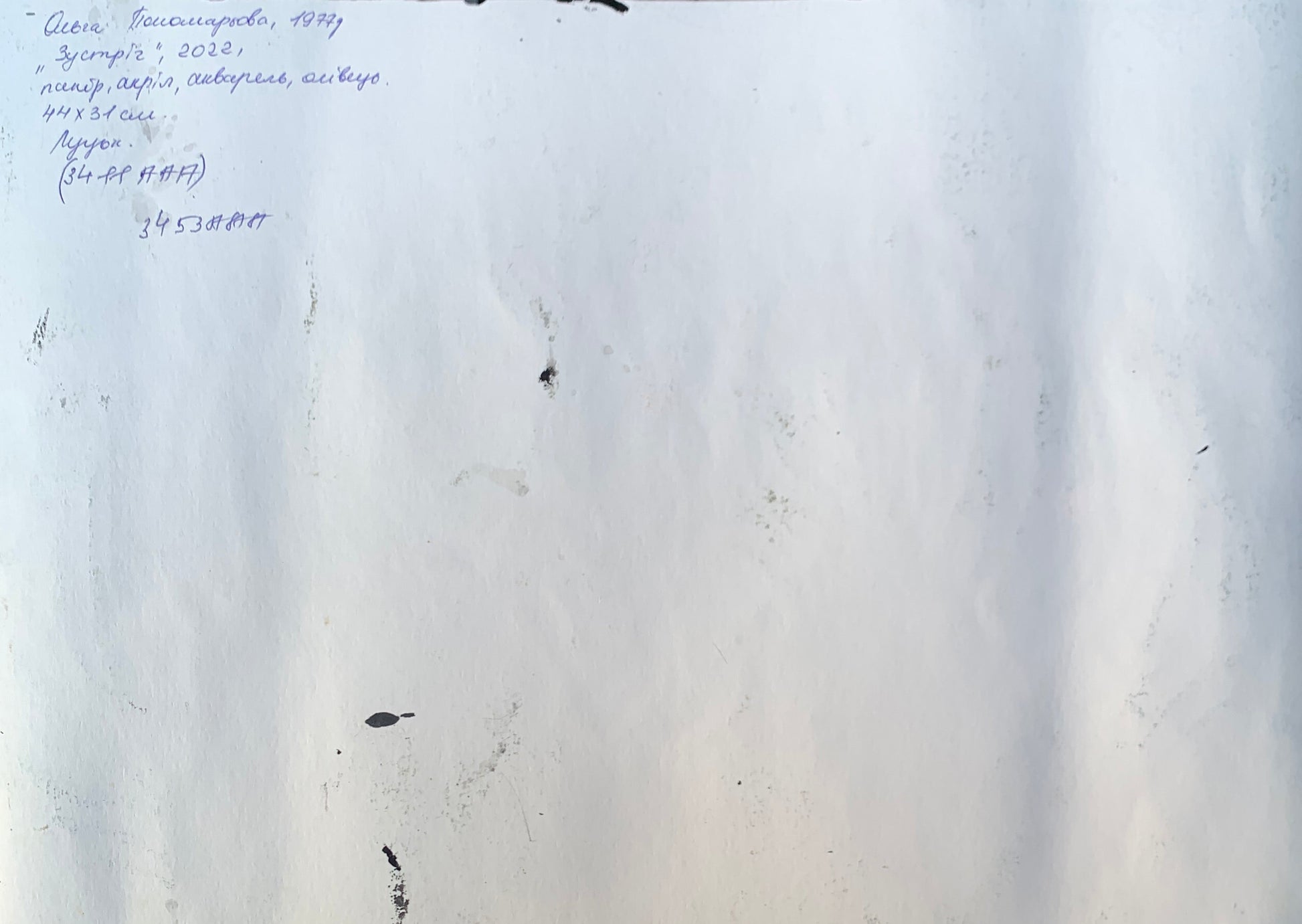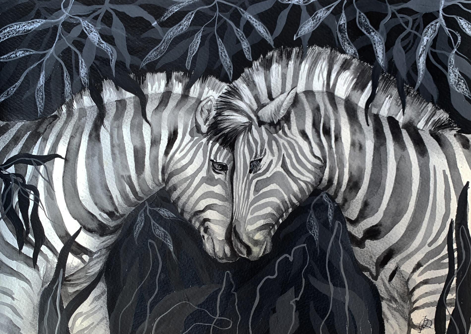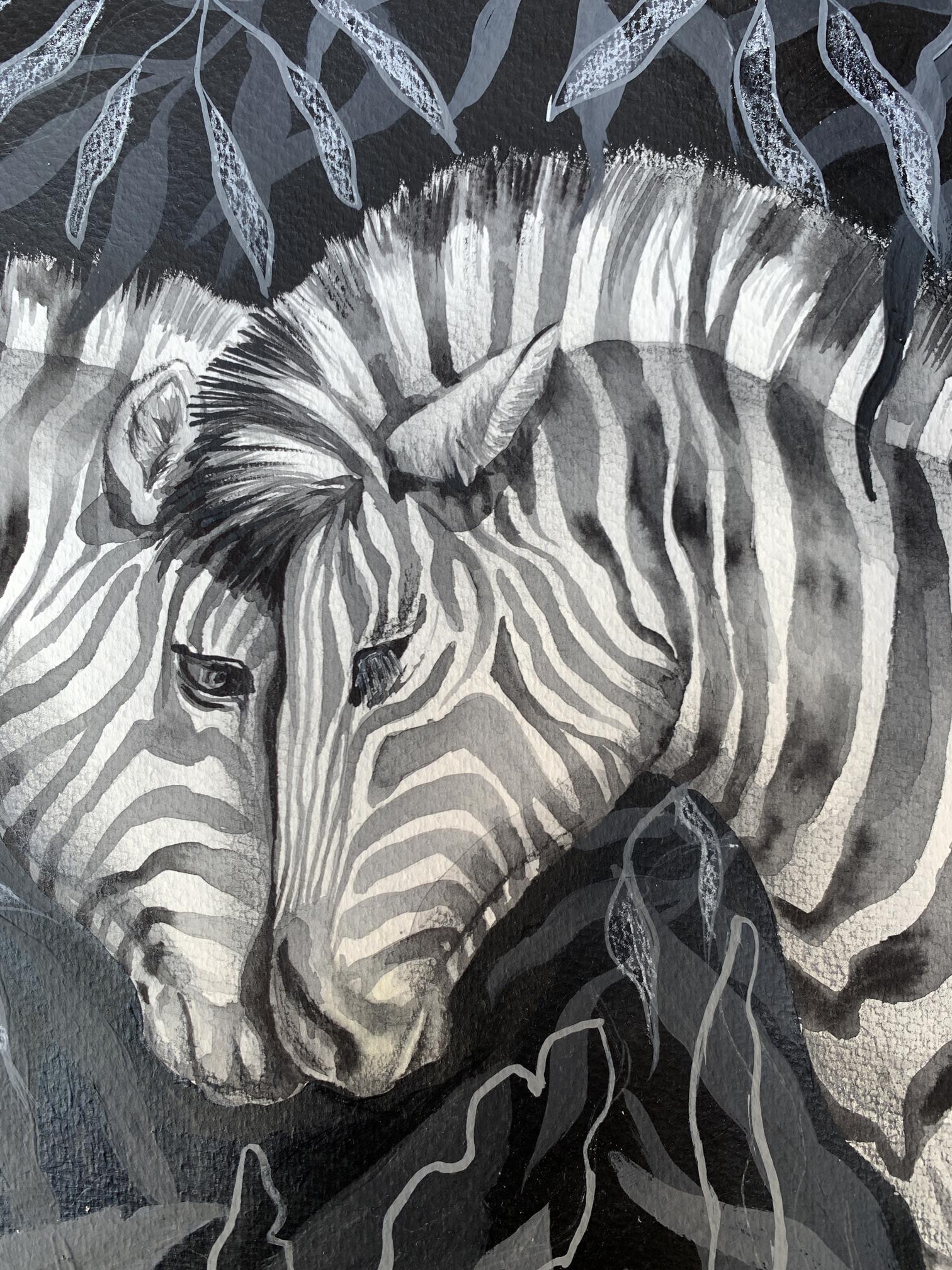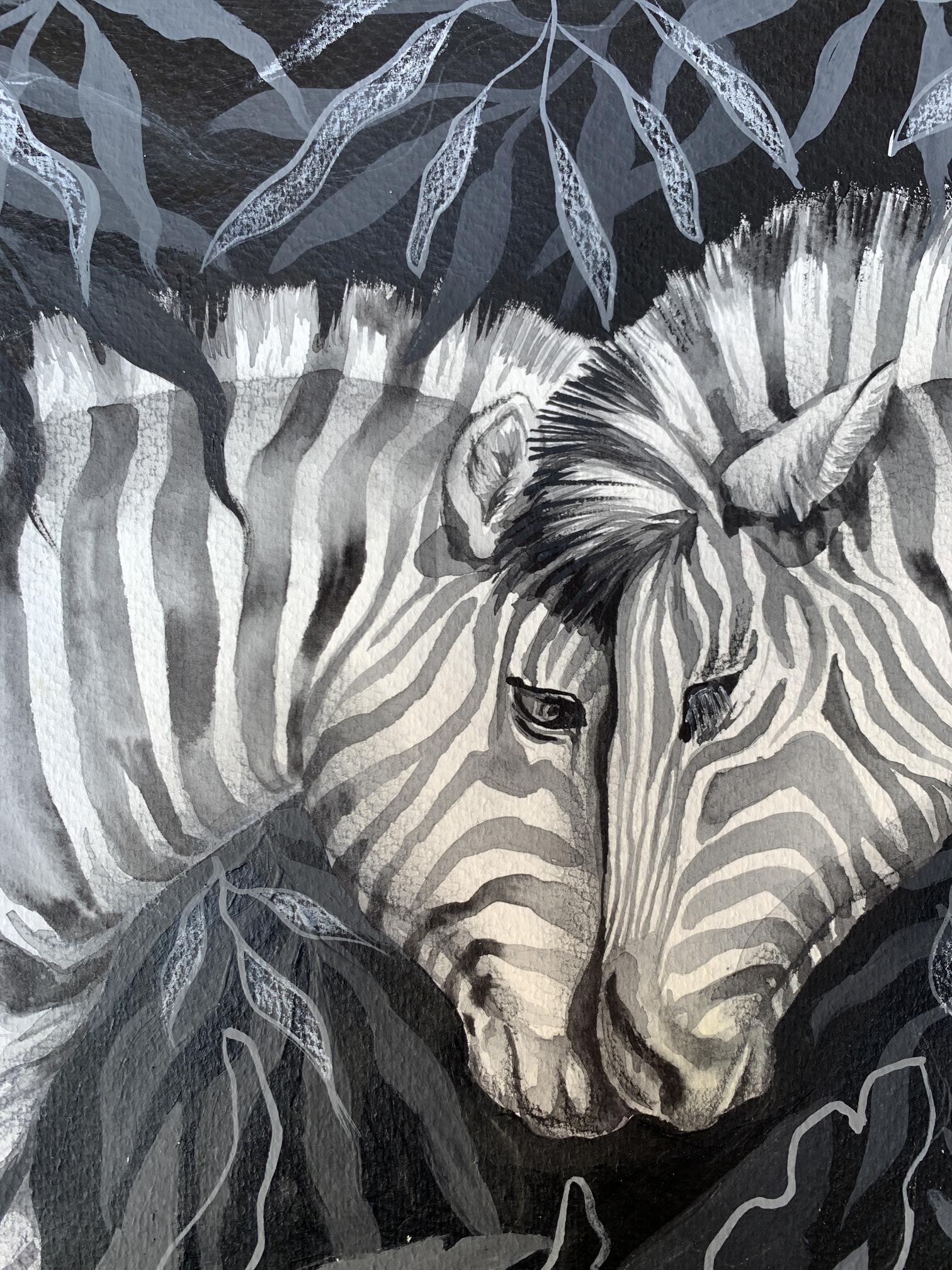 The painting "Meeting of Two Zebras" is a striking composition rendered in watercolor, acrylic, and pencil on paper. The artwork captures an intimate moment between two zebras, their heads gently leaning against one another, symbolizing connection, trust, and harmony. The monochromatic palette of black, white, and varying shades of gray brings a timeless elegance to the piece, while the detailed textures and patterns evoke both realism and abstraction.At the center of the painting are the two zebras, whose striped coats intertwine, creating a mesmerizing visual rhythm. The stripes serve as more than just a defining feature of their appearance; they symbolize individuality within unity. The way their patterns merge highlights the balance between their distinct identities and the bond they share. The expressions on the zebras' faces convey a sense of calmness and understanding, as though they are silently communicating in the stillness of their natural surroundings.The background is filled with intricate foliage, rendered in shades of gray and black, which frames the zebras and adds depth to the composition. The leaves, with their delicate outlines and subtle textures, create a sense of enclosure, as if the zebras are hidden in a private sanctuary. This detail adds a layer of mystery to the scene, suggesting a moment of quiet connection away from the outside world.The interplay of light and shadow is masterfully executed, with the zebras illuminated against the darker backdrop. This contrast not only emphasizes their presence but also imbues the piece with an almost ethereal quality. The gentle blending of the watercolor and the sharp lines of the pencil work create a dynamic interplay of softness and precision, reflecting the duality of the zebras' relationship—strength and tenderness, individuality and unity.Through "Meeting of Two Zebras," the artist explores themes of connection, coexistence, and the beauty of nature's design. The zebras become a metaphor for human relationships, reminding viewers of the importance of finding harmony and understanding in a chaotic world. By using a limited color palette, the artist emphasizes the essence of the moment, stripping away distractions and focusing on the bond between the two animals.This painting invites viewers to reflect on the nature of relationships and the power of unspoken connections. The simplicity of the composition, combined with its intricate details, creates a profound and meditative experience, celebrating the beauty of unity and the strength found in togetherness.
