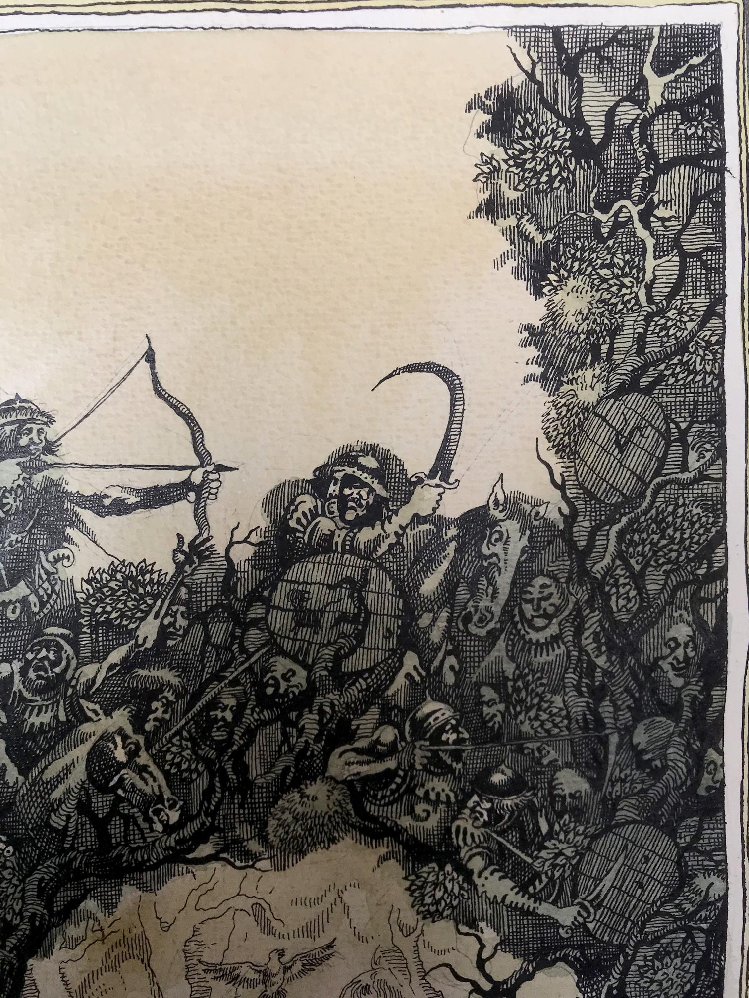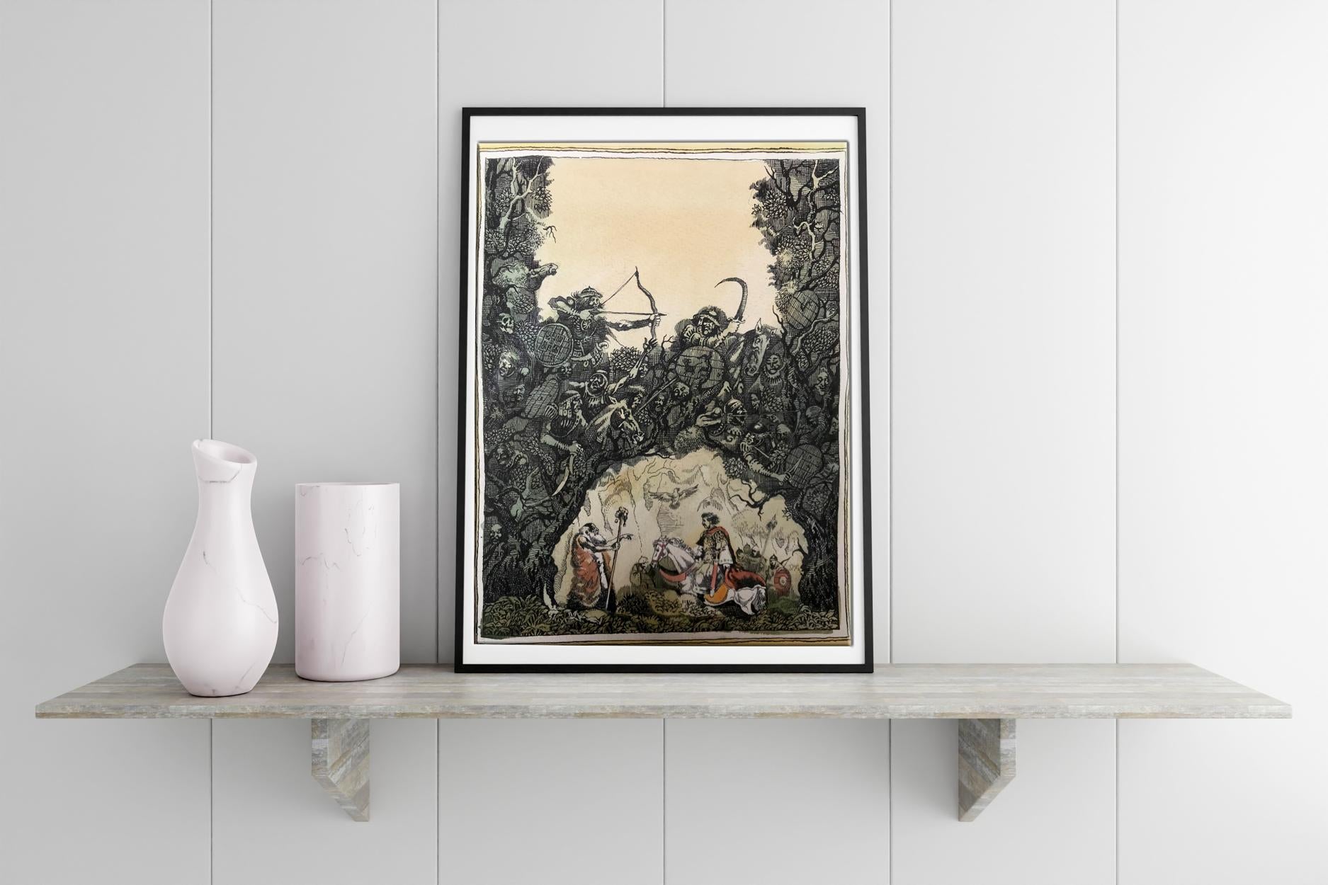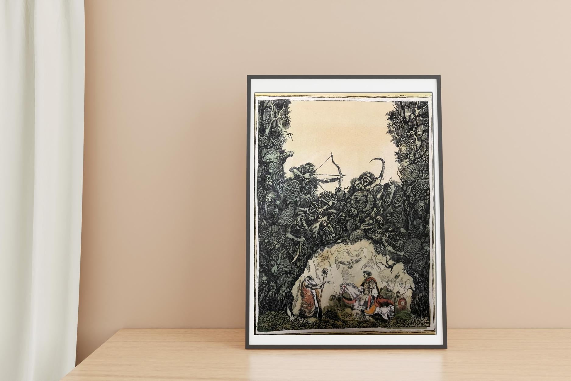 "Encountering the Prophet" is a mesmerizing watercolor painting that captures a pivotal moment of profound significance. At the heart of the composition stands a majestic king atop a white horse, exuding an aura of authority and determination. His regal presence dominates the canvas, a symbol of power and leadership. The central figure, adorned in resplendent armor, is depicted in mid-conversation with a revered prophet. The prophet, garbed in flowing robes and emanating an otherworldly wisdom, stands before the king with a serene expression. His gaze seems to penetrate beyond the surface, as if peering into the depths of the king's soul. Their encounter is a meeting of two distinct worlds, bridging the temporal and the divine. The surrounding scene carries the weight of history. Echoes and shadows of a past battle envelop the protagonists, offering a glimpse into the king's arduous journey to seek guidance and enlightenment. Faint remnants of war-torn landscapes and crumbling fortifications can be discerned, subtly alluding to the sacrifices and struggles endured by both the king and his army. The watercolor technique employed by the artist creates an ethereal and dreamlike ambiance. Delicate washes of translucent color blend harmoniously, evoking a sense of fluidity and movement. Soft brushstrokes imbue the painting with a subtle textural quality, allowing the viewer's gaze to glide effortlessly across the composition. The palette chosen for this artwork reflects the juxtaposition of power and spirituality. Earthy tones dominate the battlefield echoes, hinting at the rawness and grittiness of conflict. Contrasting against this somber backdrop, the king and the prophet are bathed in luminous hues, symbolizing their enlightened presence amidst darkness. "Encountering the Prophet" encapsulates a profound moment of convergence between mortal ambition and spiritual guidance. Through the masterful use of watercolor, the artist breathes life into this evocative portrait, inviting the viewer to contemplate the timeless themes of power, faith, and the transformative nature of encounters that shape the course of history.