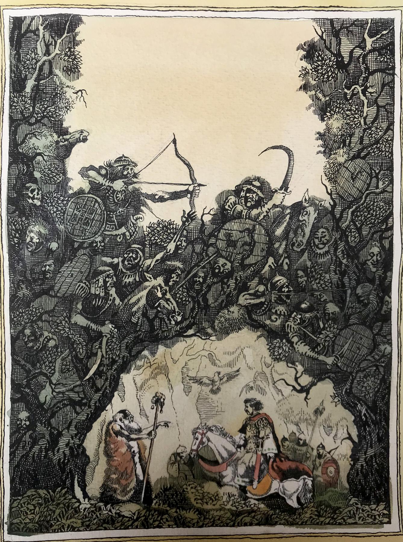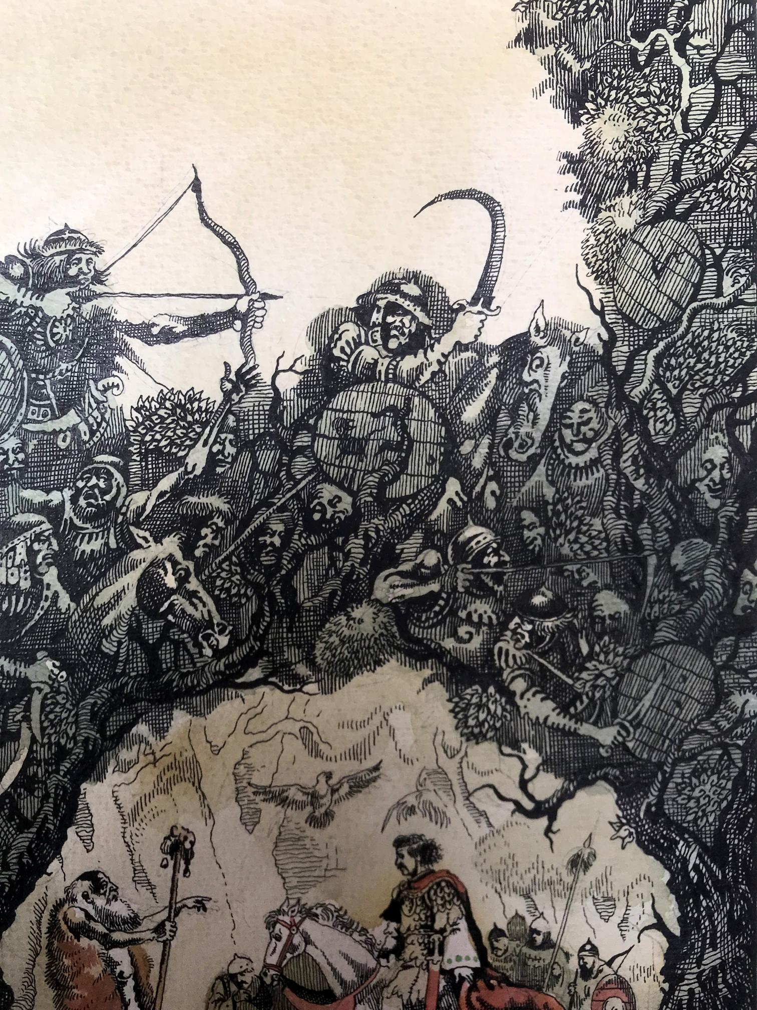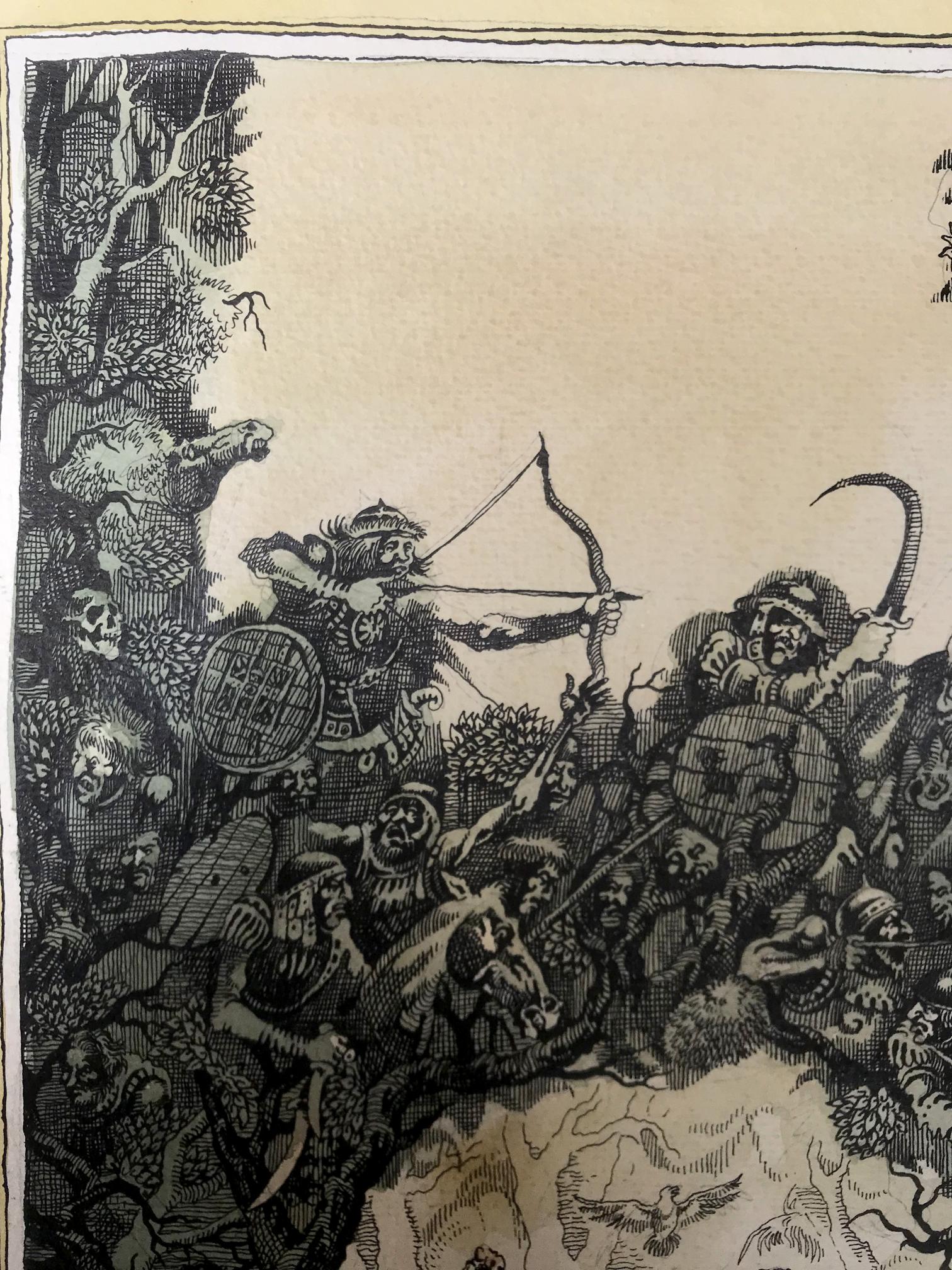 "Encountering the Prophet" is a mesmerizing watercolor painting that captures a pivotal moment of profound significance. At the heart of the composition stands a majestic king atop a white horse, exuding an aura of authority and determination. His regal presence dominates the canvas, a symbol of power and leadership. The central figure, adorned in resplendent armor, is depicted in mid-conversation with a revered prophet. The prophet, garbed in flowing robes and emanating an otherworldly wisdom, stands before the king with a serene expression. His gaze seems to penetrate beyond the surface, as if peering into the depths of the king's soul. Their encounter is a meeting of two distinct worlds, bridging the temporal and the divine. The surrounding scene carries the weight of history. Echoes and shadows of a past battle envelop the protagonists, offering a glimpse into the king's arduous journey to seek guidance and enlightenment. Faint remnants of war-torn landscapes and crumbling fortifications can be discerned, subtly alluding to the sacrifices and struggles endured by both the king and his army. The watercolor technique employed by the artist creates an ethereal and dreamlike ambiance. Delicate washes of translucent color blend harmoniously, evoking a sense of fluidity and movement. Soft brushstrokes imbue the painting with a subtle textural quality, allowing the viewer's gaze to glide effortlessly across the composition. The palette chosen for this artwork reflects the juxtaposition of power and spirituality. Earthy tones dominate the battlefield echoes, hinting at the rawness and grittiness of conflict. Contrasting against this somber backdrop, the king and the prophet are bathed in luminous hues, symbolizing their enlightened presence amidst darkness. "Encountering the Prophet" encapsulates a profound moment of convergence between mortal ambition and spiritual guidance. Through the masterful use of watercolor, the artist breathes life into this evocative portrait, inviting the viewer to contemplate the timeless themes of power, faith, and the transformative nature of encounters that shape the course of history.
