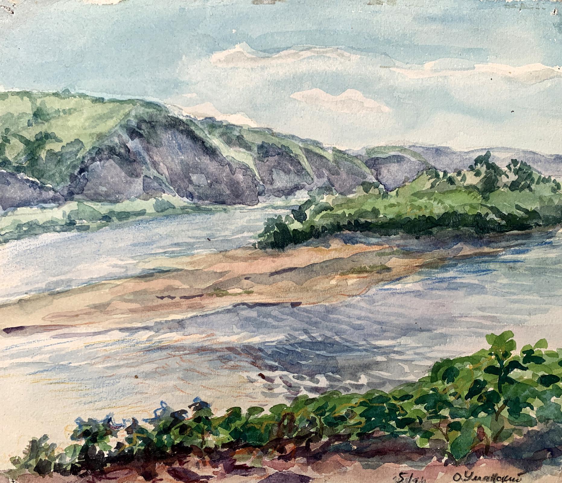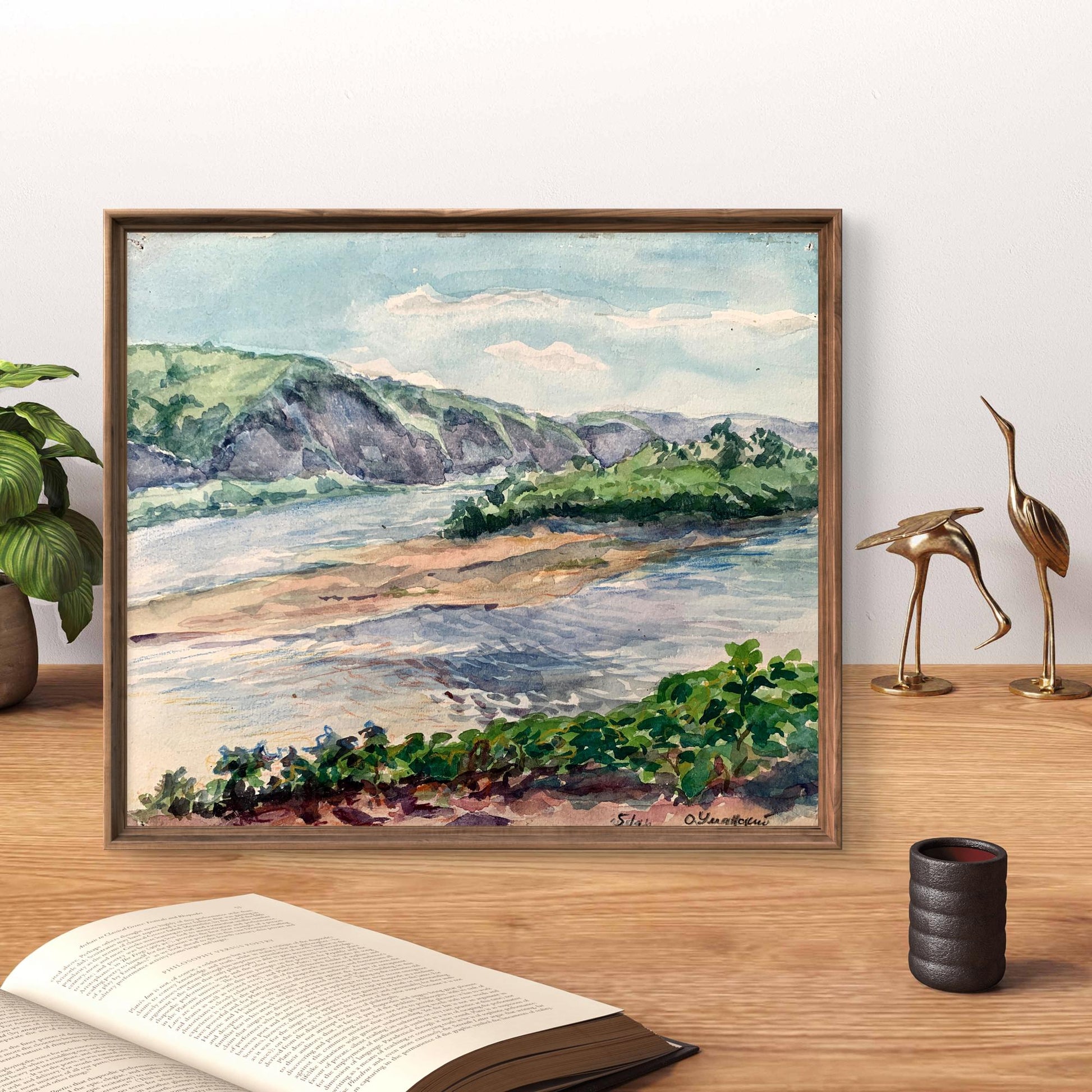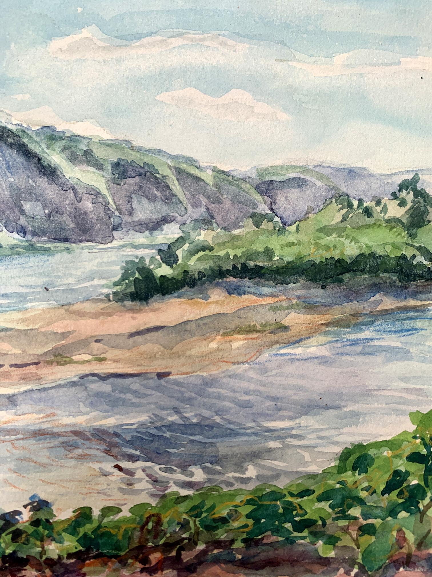 The watercolor painting titled "Mountain Stream" beautifully depicts the serene and dynamic harmony of nature. Through delicate brushwork and a vibrant palette, the artist captures a picturesque view of a stream meandering through a mountainous landscape, surrounded by lush greenery.The foreground is adorned with vibrant shrubs and leafy vegetation, their bright greens contrasting vividly with the shimmering blues and earthy tones of the water and terrain. This detail draws the viewer closer to the scene, inviting them to experience the freshness of the natural setting. The stream itself is portrayed with fluid, flowing strokes that reflect the gentle ripples and movement of the water. Soft shades of blue and white mimic the glistening sunlight on the water's surface, creating an impression of life and motion.The middle ground shifts the focus to sandy banks and small islands, partially submerged by the stream. These natural formations hint at the changing course of the water over time, suggesting the dynamic relationship between the land and the flowing current. Beyond these islands, the landscape opens up to reveal rolling hills and towering cliffs, painted in varying shades of green and muted gray. The artist uses careful layering to depict the texture of the mountains, emphasizing their grandeur and stability.In the background, a bright, cloud-dotted sky stretches over the horizon. The soft blue sky and fluffy white clouds provide a sense of tranquility and space, balancing the composition and highlighting the beauty of this unspoiled environment.Through "Mountain Stream," the artist conveys a message of connection to nature’s rhythms. The painting emphasizes the coexistence of strength and delicacy in the natural world—the robust cliffs standing tall while the gentle stream carves its path through the landscape. The artist likely intended to evoke a sense of peace and wonder, encouraging viewers to appreciate the ever-changing beauty of the natural world and the serenity it brings. This artwork serves as a reminder of nature's enduring presence and its capacity to inspire awe and reflection.