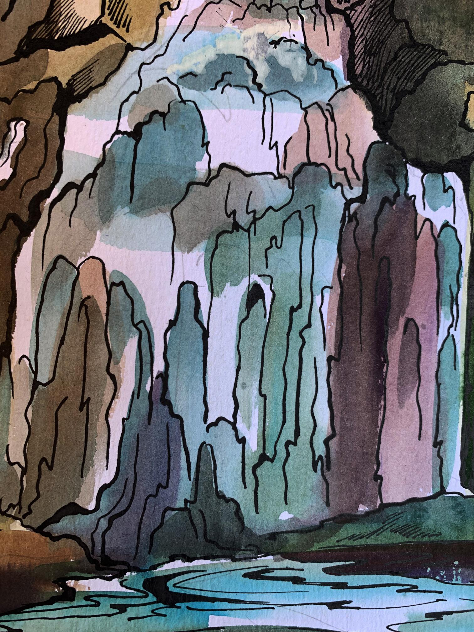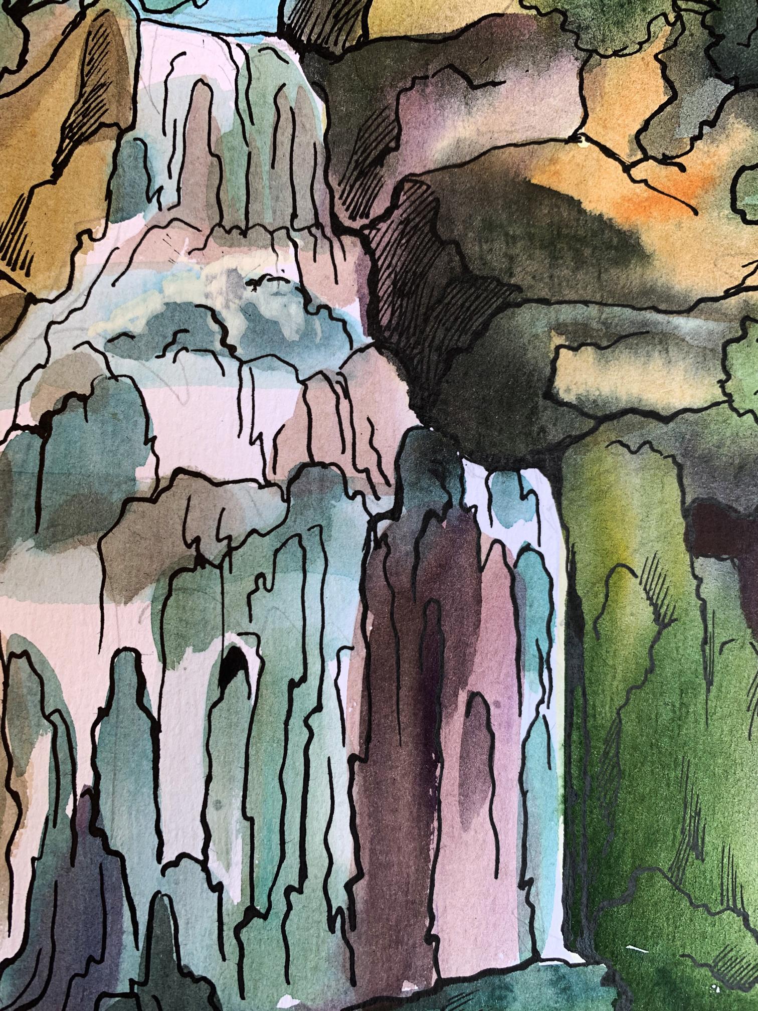 "Mountain Waterfall" is an exquisite watercolor painting that captures the dynamic and serene beauty of a waterfall cascading down a rugged mountainside. The artist employs a combination of detailed line work and fluid washes to create a scene that is both vibrant and tranquil. The waterfall is the focal point of the painting, depicted with flowing white and light blue hues. The artist uses soft washes and gentle gradients to convey the movement and translucence of the falling water. The subtle blending of colors highlights the water's interaction with light. The surrounding rocks and cliffs are painted with earthy tones of browns, greens, and grays. The artist uses a mix of wet-on-wet and dry brush techniques to create texture and depth, giving the rocks a rugged and realistic appearance. The greenery around the waterfall is lush and varied, with different shades of green indicating the diversity of plant life. The use of overlapping washes and fine line work adds dimension and detail to the foliage, creating a rich and immersive backdrop. The sky, peeking through the foliage at the top, is painted with a bright blue wash, adding a contrast to the earthy tones of the rocks and the white of the waterfall. This use of color enhances the overall luminosity of the scene. The composition is vertically oriented, emphasizing the height and majesty of the waterfall. The eye is naturally drawn from the top of the waterfall, following the flow of water down to the pool below. The painting balances the dynamic movement of the water with the stillness of the rocks and vegetation. The interplay between these elements creates a harmonious and visually pleasing composition. The foreground features the calm pool at the base of the waterfall, painted with reflective blues and greens. The background is dense with trees and foliage, painted with darker shades to give a sense of depth and enclosure. The central element of the painting, the cascading water, is depicted with a sense of movement and fluidity. The artist captures the essence of water in motion, from the gentle flow at the top to the more turbulent splashes at the base. The rugged terrain of the rocks and cliffs provides a strong contrast to the soft, flowing water. The detailed line work and varied textures add to the realism and complexity of the scene. The surrounding vegetation adds life and color to the painting, framing the waterfall and enhancing the natural beauty of the scene. The artist’s attention to detail in the foliage creates a rich and immersive environment. The overall mood of "Mountain Waterfall" is one of tranquility and natural splendor. The soothing colors, fluid brushstrokes, and balanced composition evoke a sense of peace and admiration for the natural world. The painting invites the viewer to experience the serene beauty of the waterfall and its surroundings. "Mountain Waterfall" can be interpreted as a celebration of nature’s beauty and power. The vibrant colors, dynamic water, and rugged landscape reflect the artist’s appreciation for the natural environment and its awe-inspiring features. Overall, "Mountain Waterfall" is a beautifully rendered watercolor painting that captures the majestic and tranquil essence of a mountain waterfall. The harmonious colors, detailed textures, and dynamic composition create a sense of peace and admiration for the natural world, inviting the viewer to immerse themselves in the serene beauty of this picturesque scene.