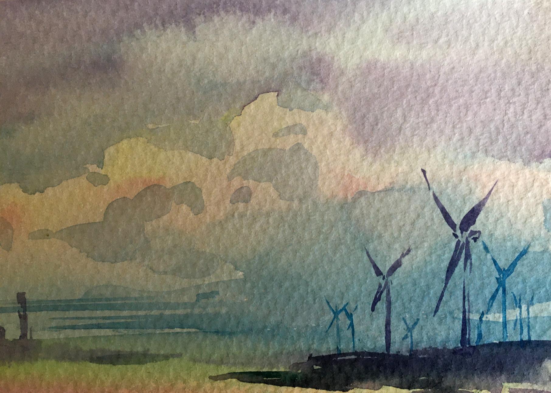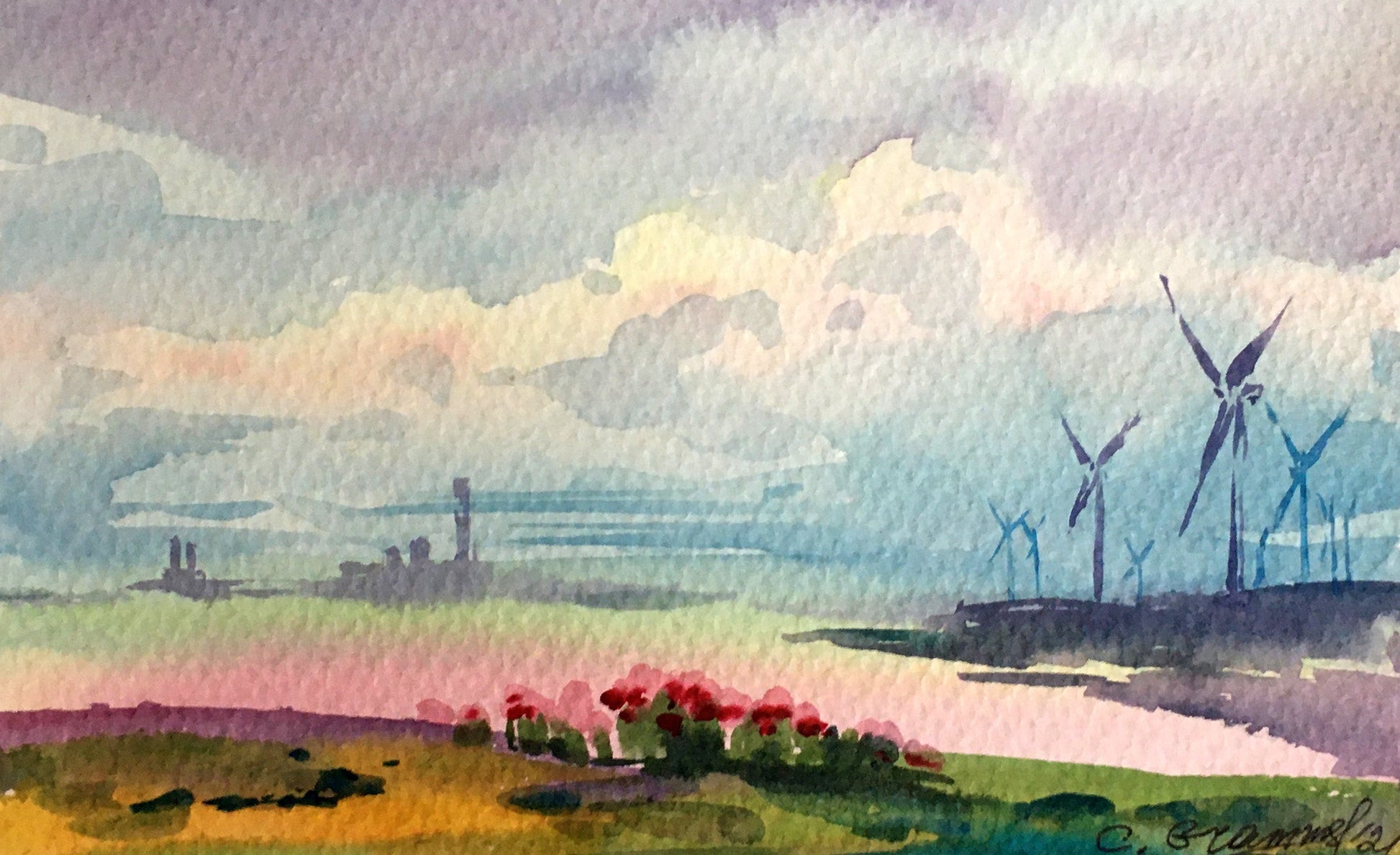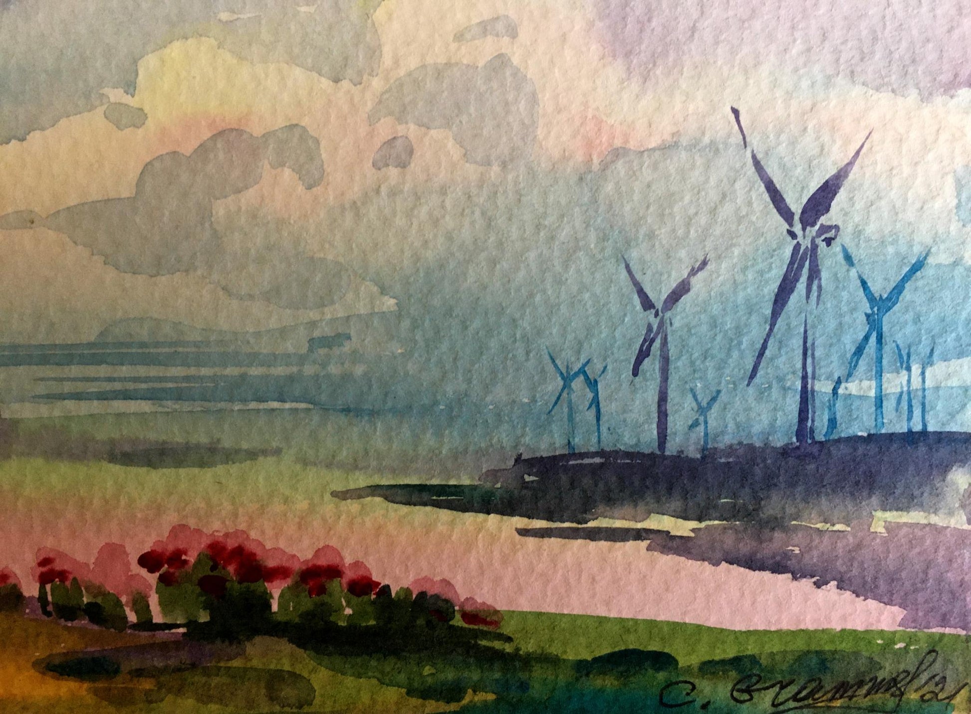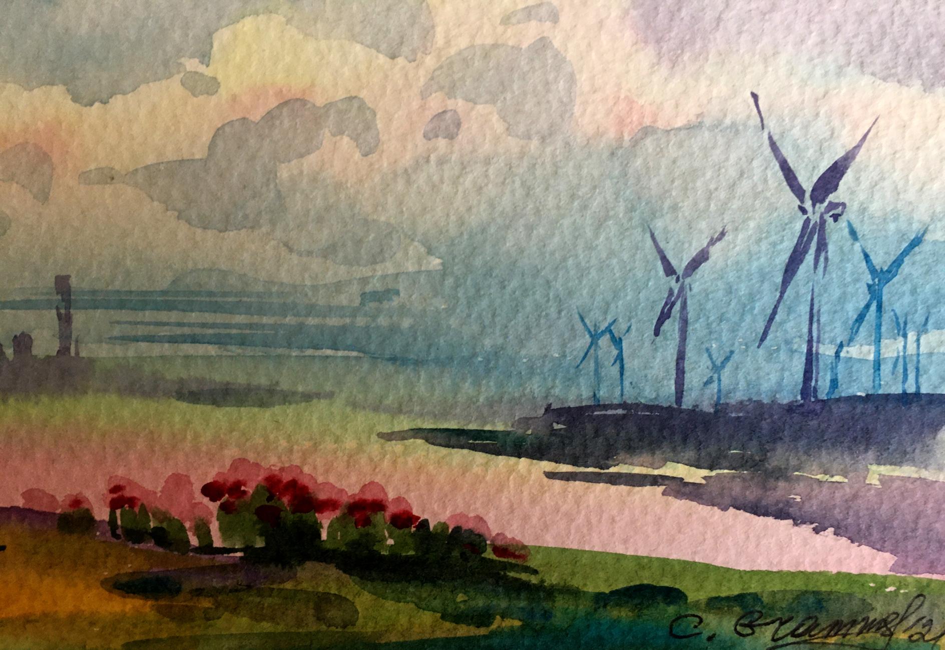 This watercolor painting captures the tranquility of a lazy summer day. In the foreground, a calm river meanders through lush green banks, inviting the viewer to dip their toes into its cool waters. The soft brushstrokes of the watercolor convey the gentle ripples of the river, making it seem almost alive. In the background, on the right-hand side, several windmills dot the horizon. The artist has used a light touch to suggest their presence, allowing them to blend seamlessly into the hazy summer sky. The clouds overhead are a mix of gray and white, adding a sense of depth and atmosphere to the painting. Overall, this watercolor is a peaceful and serene scene, perfectly capturing the essence of a lazy summer day by the river. The artist has used a delicate touch and a careful choice of colors to create a painting that is both calming and evocative.