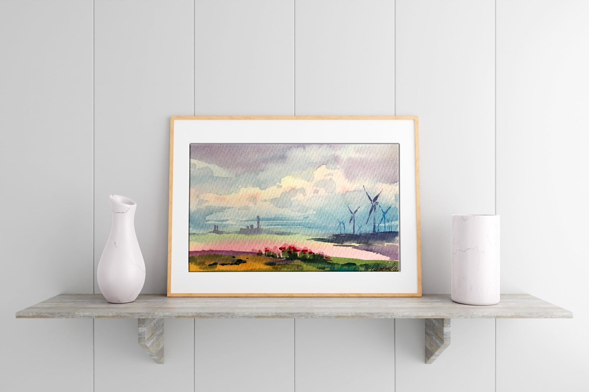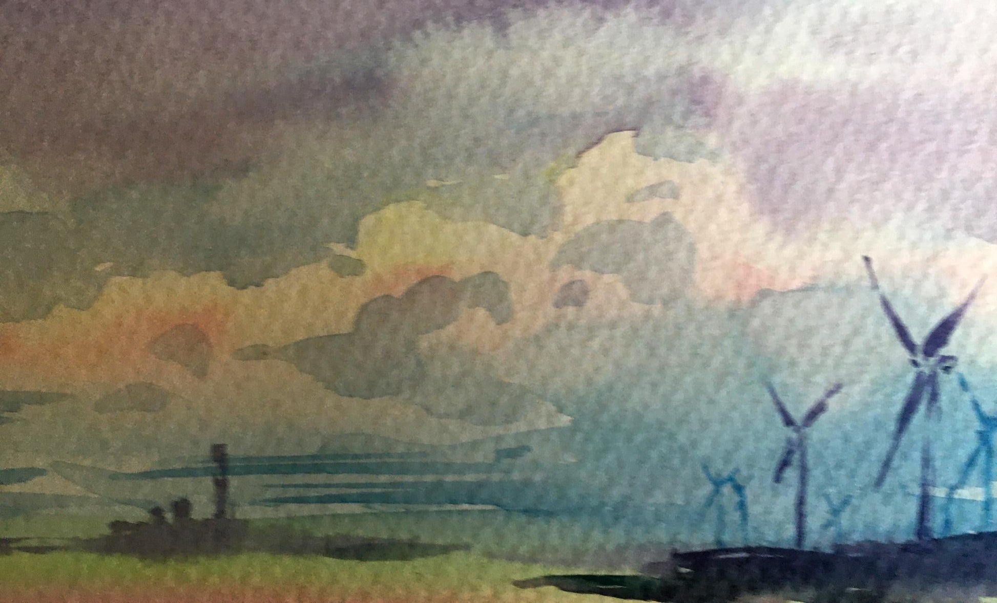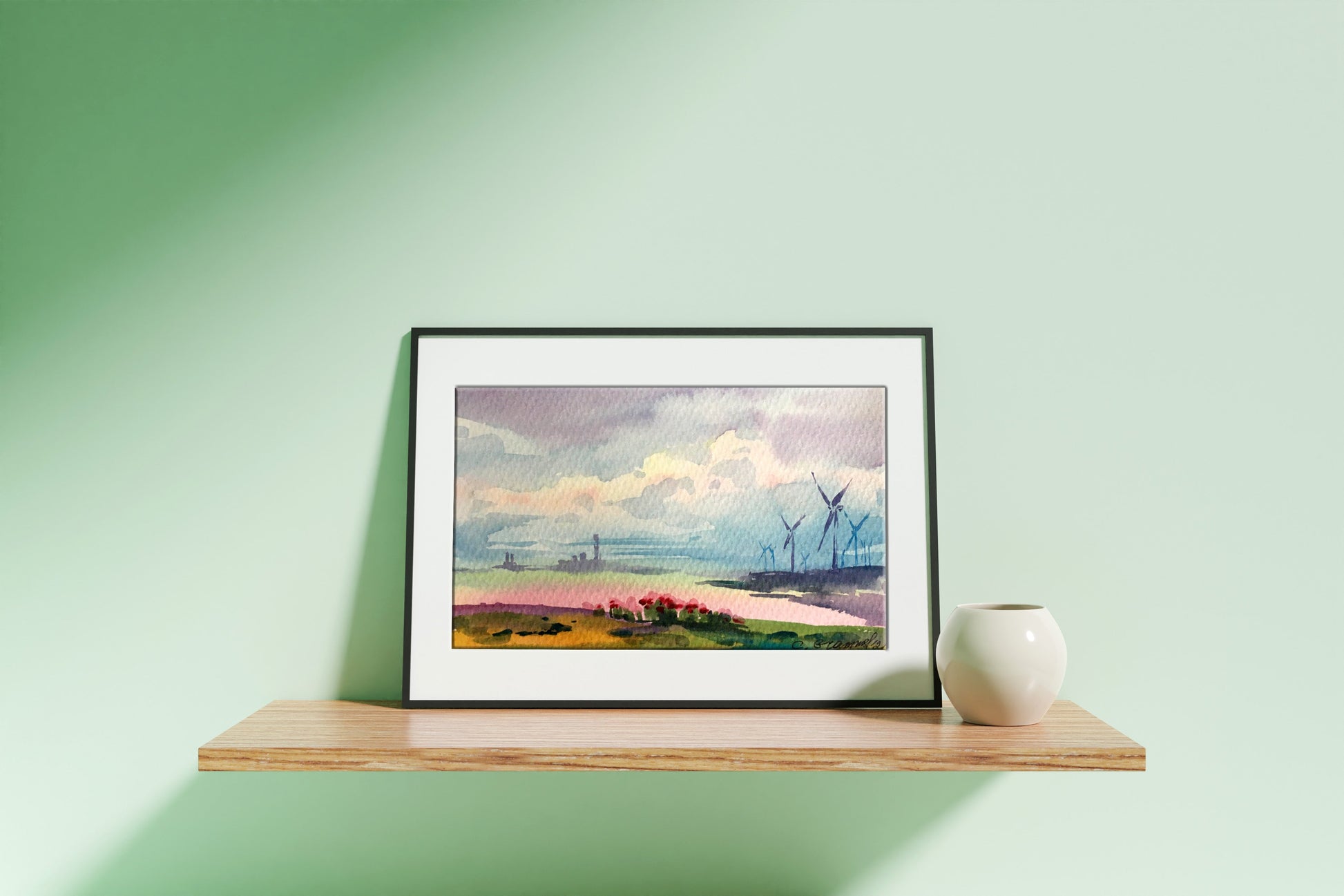 This watercolor painting captures the tranquility of a lazy summer day. In the foreground, a calm river meanders through lush green banks, inviting the viewer to dip their toes into its cool waters. The soft brushstrokes of the watercolor convey the gentle ripples of the river, making it seem almost alive. In the background, on the right-hand side, several windmills dot the horizon. The artist has used a light touch to suggest their presence, allowing them to blend seamlessly into the hazy summer sky. The clouds overhead are a mix of gray and white, adding a sense of depth and atmosphere to the painting. Overall, this watercolor is a peaceful and serene scene, perfectly capturing the essence of a lazy summer day by the river. The artist has used a delicate touch and a careful choice of colors to create a painting that is both calming and evocative.