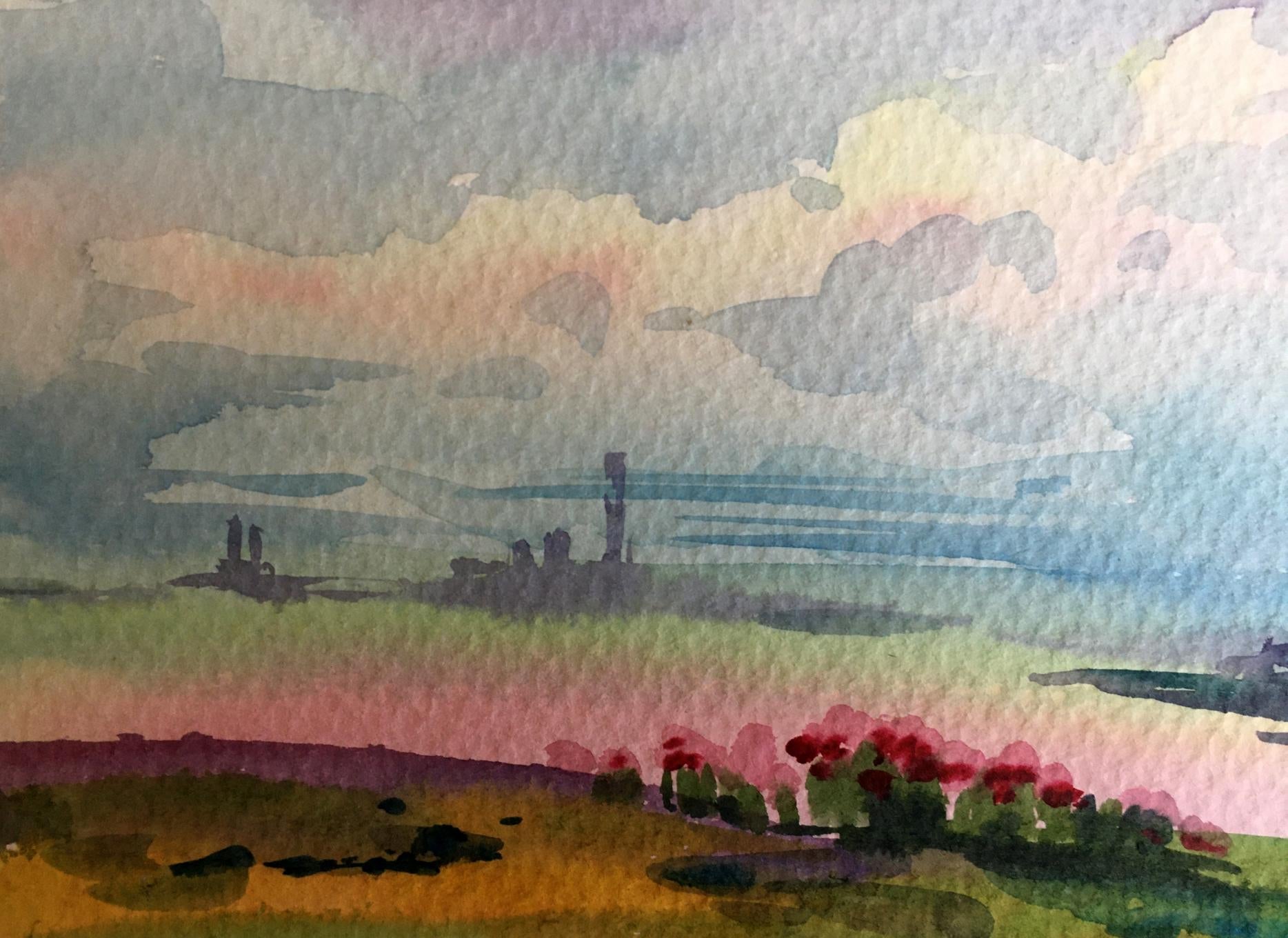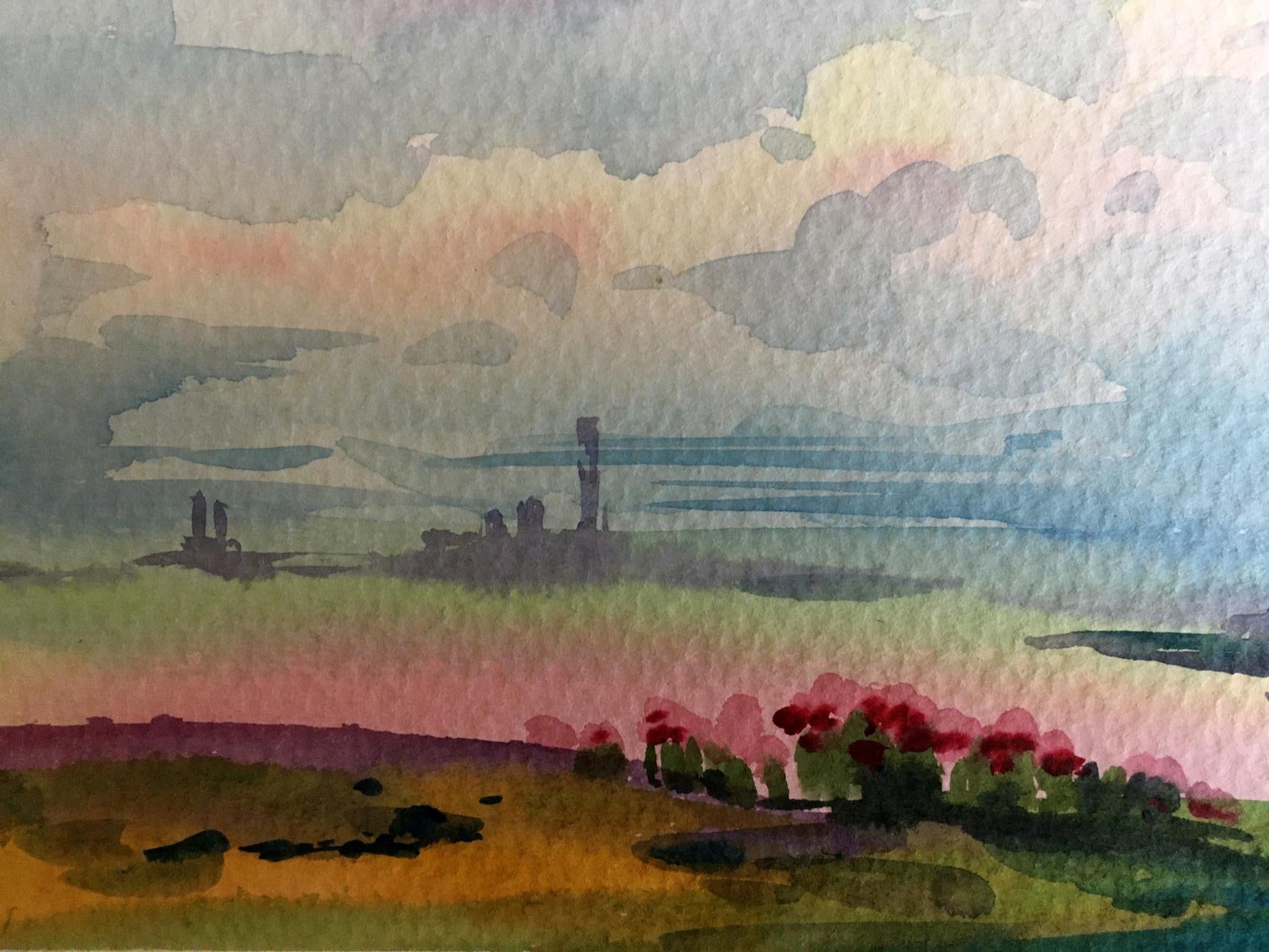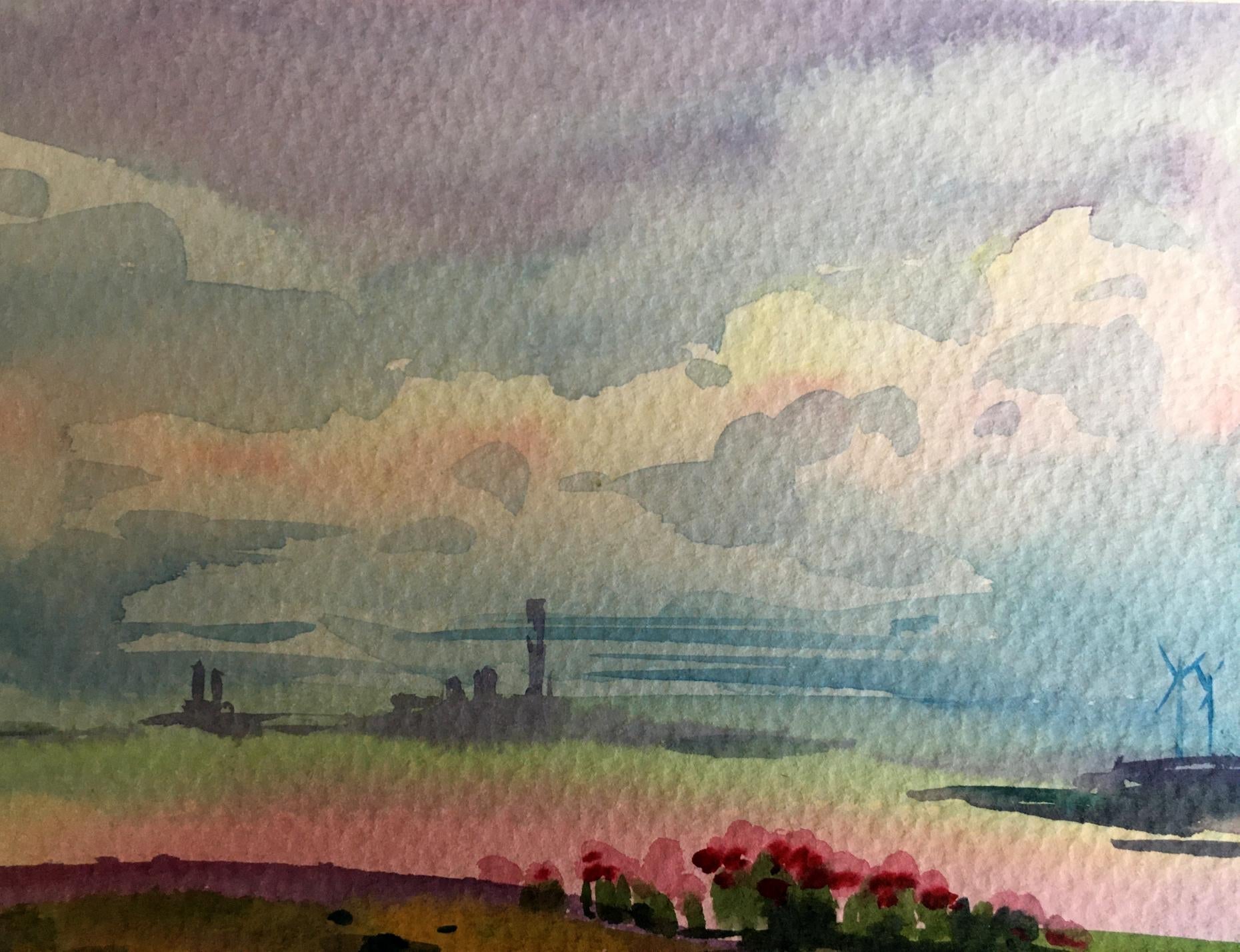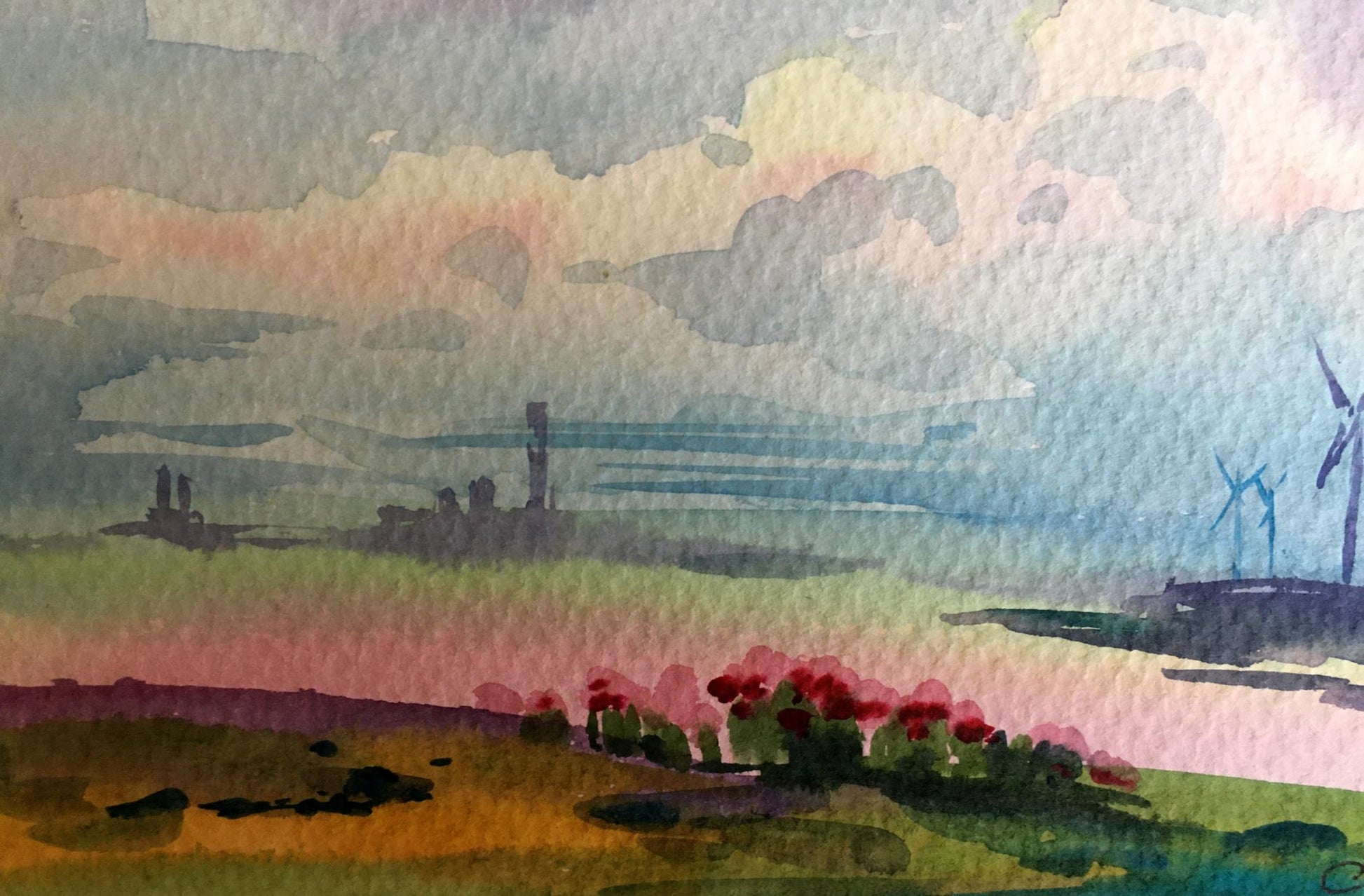 This watercolor painting captures the tranquility of a lazy summer day. In the foreground, a calm river meanders through lush green banks, inviting the viewer to dip their toes into its cool waters. The soft brushstrokes of the watercolor convey the gentle ripples of the river, making it seem almost alive. In the background, on the right-hand side, several windmills dot the horizon. The artist has used a light touch to suggest their presence, allowing them to blend seamlessly into the hazy summer sky. The clouds overhead are a mix of gray and white, adding a sense of depth and atmosphere to the painting. Overall, this watercolor is a peaceful and serene scene, perfectly capturing the essence of a lazy summer day by the river. The artist has used a delicate touch and a careful choice of colors to create a painting that is both calming and evocative.