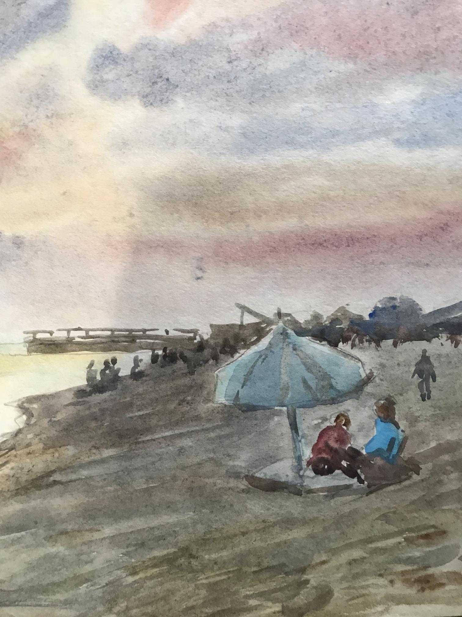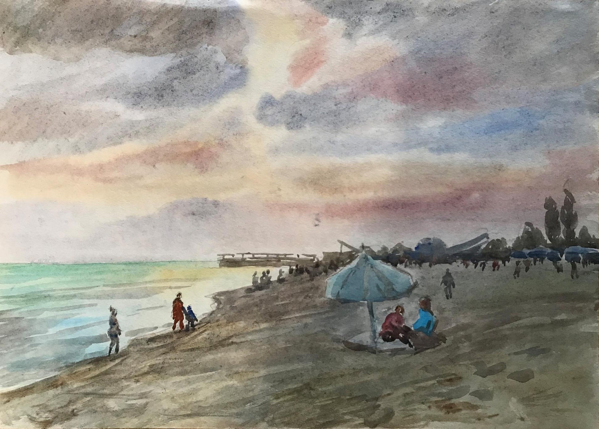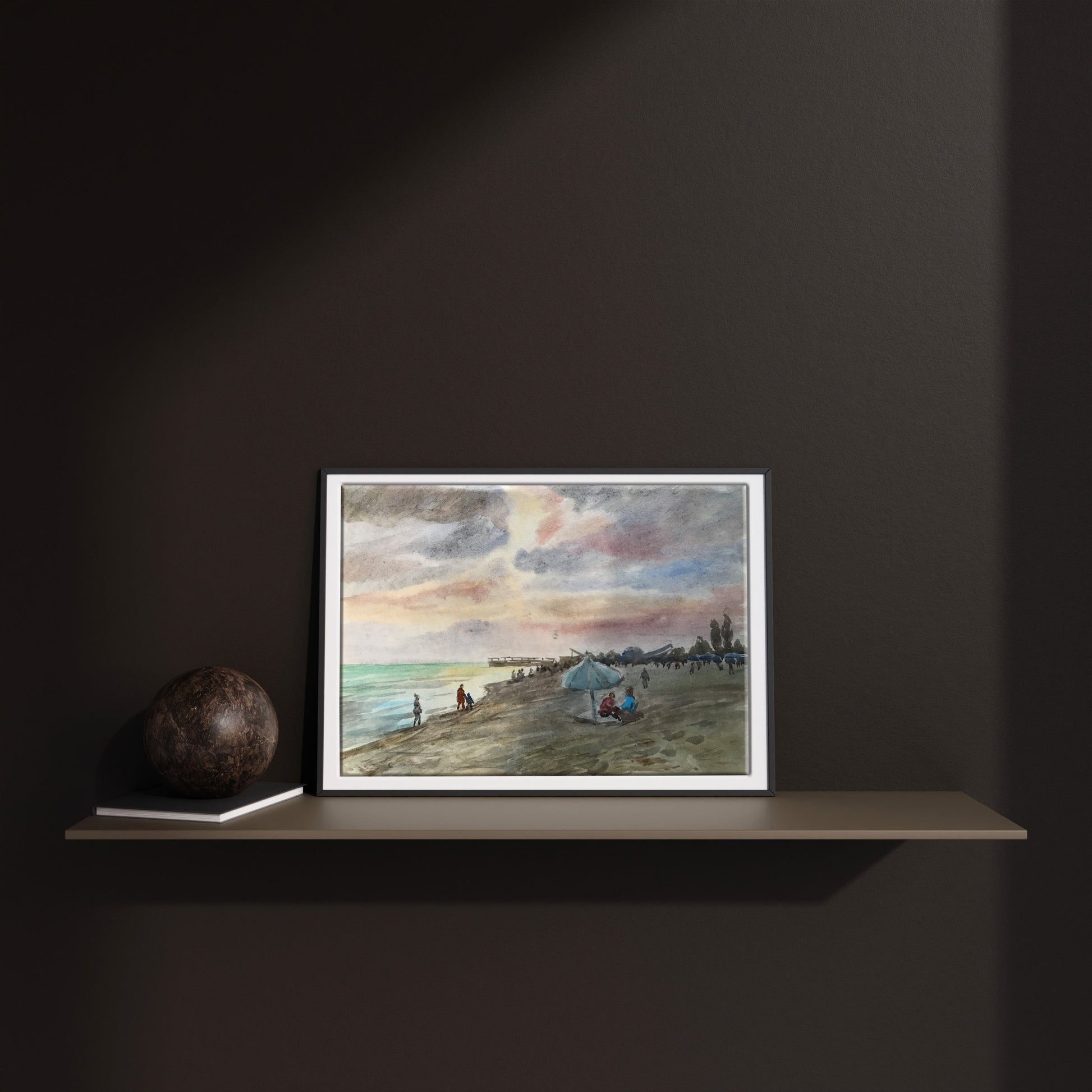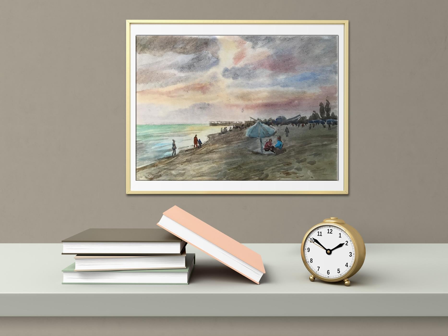 Introducing "On the sea", our latest painting that is sure to enchant anyone who beholds it. The stirring image of the seashore, with its wide beach and people enjoying the sunset, is sure to instill a sense of peace and wonder.