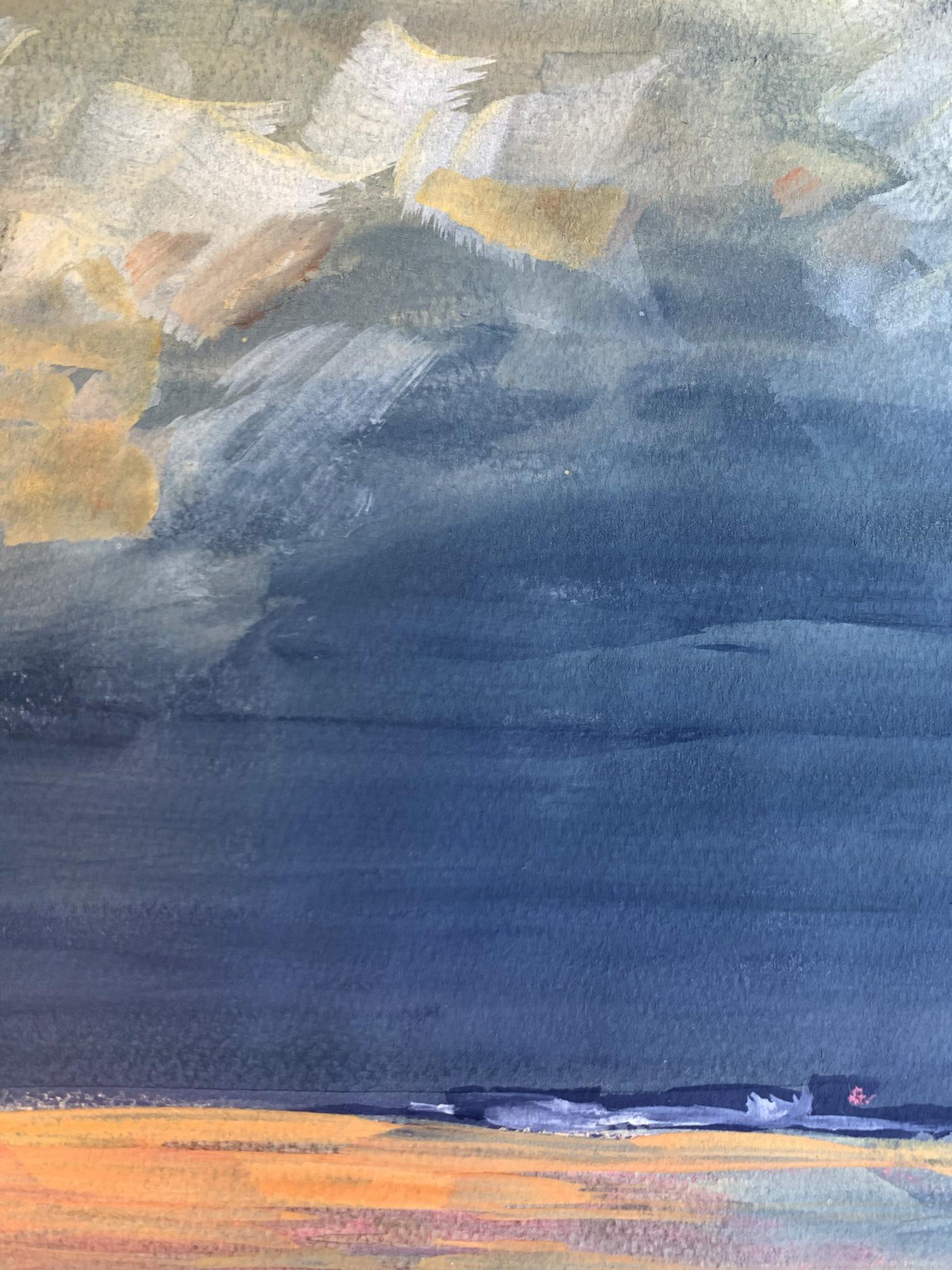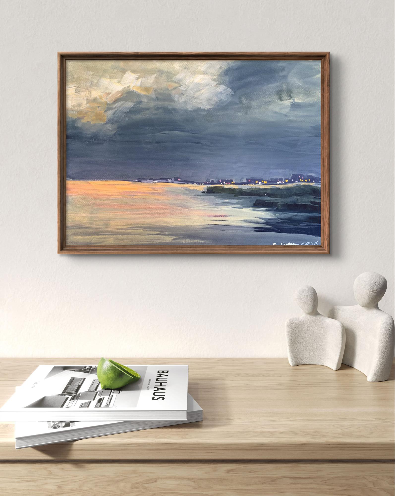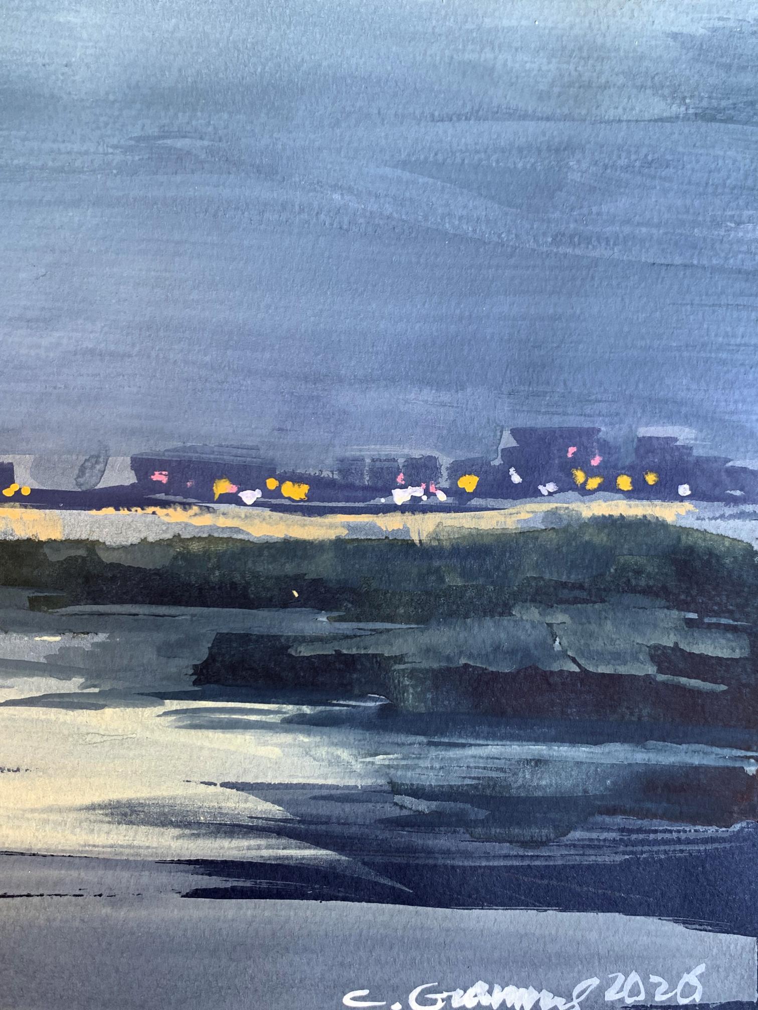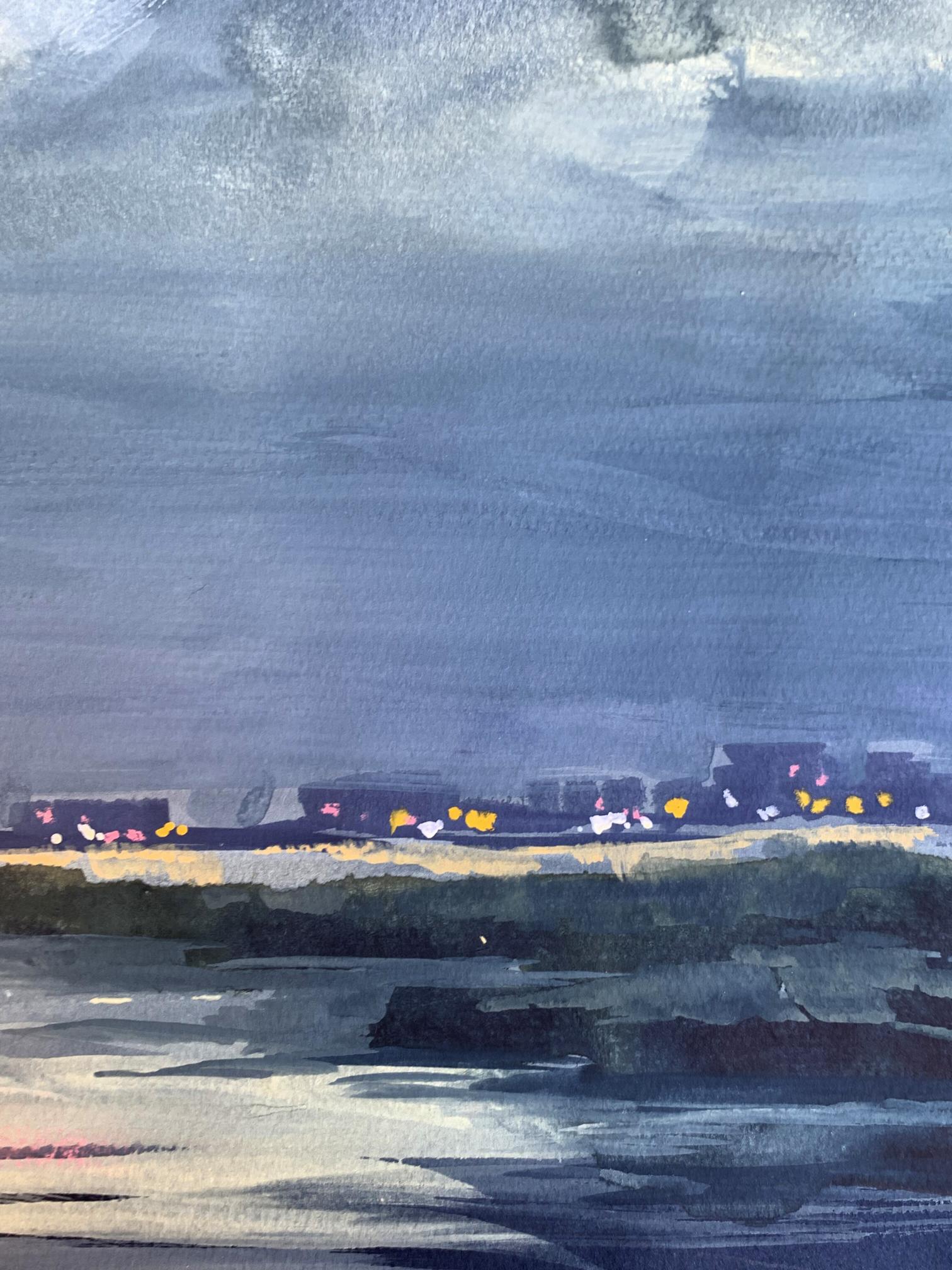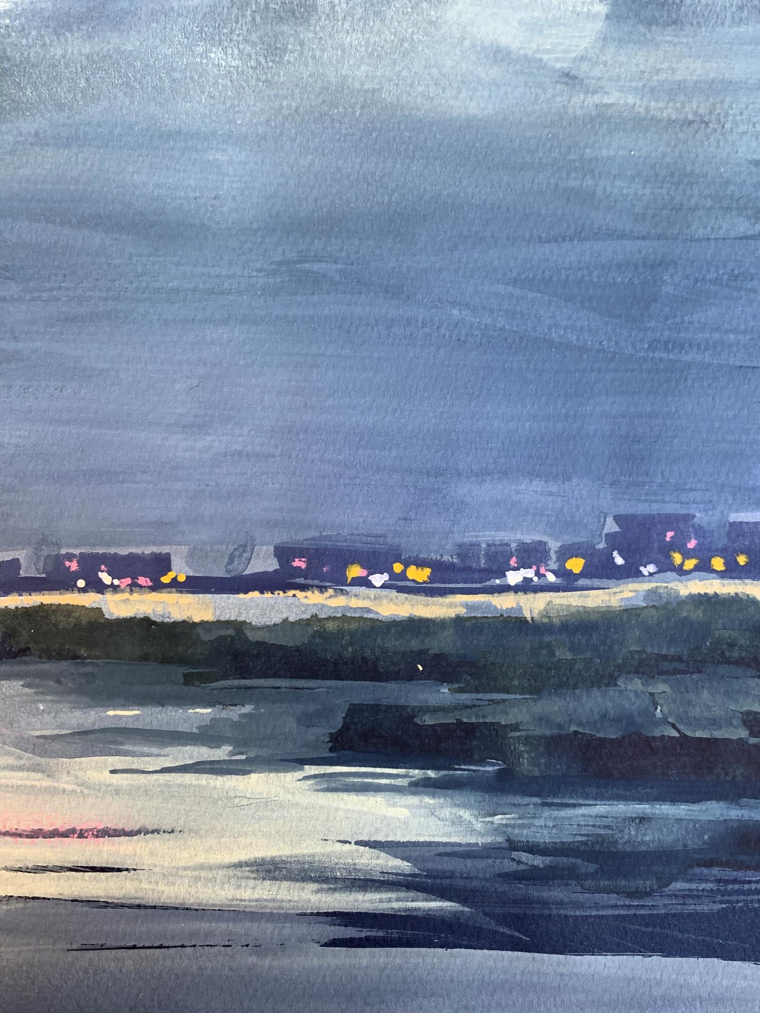 "On the Spit" is a compelling watercolor painting that captures the dramatic interplay of light and dark during a coastal evening. The artist masterfully uses contrasts in color and light to convey a sense of tension and beauty in the scene. The sky dominates the upper part of the painting, filled with heavy, dark clouds that suggest an impending storm. The use of deep blues and grays creates a moody atmosphere. Streaks of lighter colors like yellow and white are applied with broad, sweeping brushstrokes, adding texture and depth to the clouds. The water reflects the colors of the sky, with darker tones near the horizon transitioning to lighter hues closer to the shore. The artist uses a mix of wet-on-wet and dry brush techniques to capture the reflective quality of the water and the subtle movements of the waves. The spit of land in the foreground is bathed in warm, golden light, contrasting sharply with the darker water and sky. This area is painted with soft, blended strokes that create a smooth gradient from light to dark, emphasizing the setting sun’s impact on the landscape. The foreground features the illuminated spit of land, which acts as a focal point in the painting. The light here is warm and inviting, drawing the viewer's eye to this part of the composition. The middle ground transitions from the brightly lit spit to the darker water. The reflections on the water add a dynamic element, capturing the transient quality of the light as it changes. The background is defined by the dark, ominous sky and the faint, distant lights of a city or town along the horizon. These tiny points of light add depth to the painting and suggest a distant human presence. The dramatic contrast between the light on the spit and the dark sky and water creates a powerful visual impact. This contrast highlights the fleeting beauty of the light just before a storm. The reflections in the water are skillfully rendered, adding a sense of realism and enhancing the overall mood of the scene. The small dots of light in the distance provide a sense of scale and perspective, suggesting a human element in the otherwise natural landscape. The overall mood of "On the Spit" is one of dramatic tension and fleeting beauty. The dark, stormy sky contrasts with the warm light on the spit, creating a sense of anticipation and highlighting the transient nature of light in the landscape. "On the Spit" can be interpreted as a depiction of nature's ever-changing beauty and the dramatic moments that occur just before a storm. The painting invites viewers to pause and appreciate the fleeting moments of light and color in the natural world. Overall, "On the Spit" is a striking watercolor painting that uses color, light, and composition to capture a dramatic coastal scene. The artist’s technique and attention to detail create a visually stunning and emotionally resonant piece.
