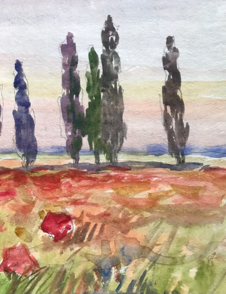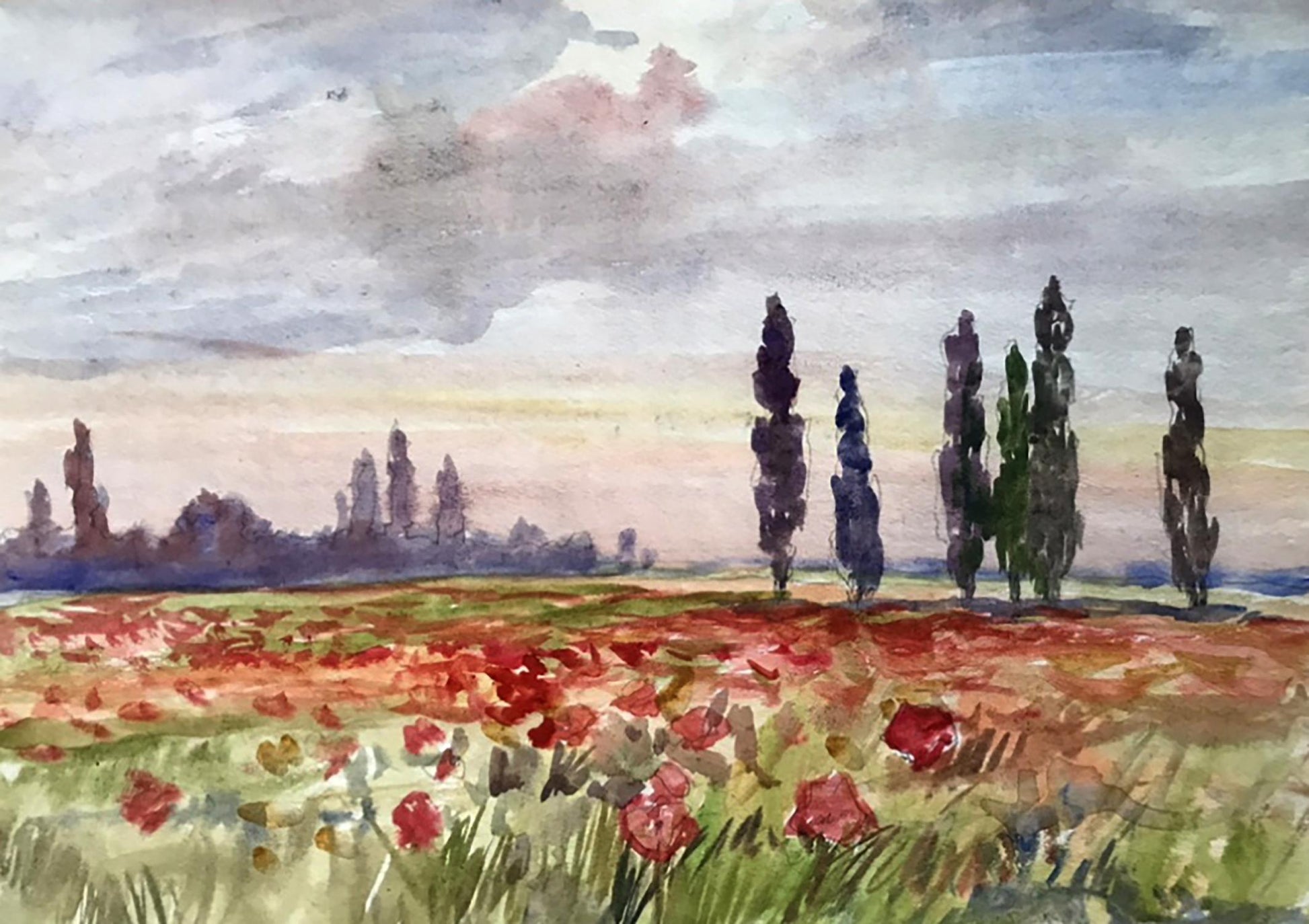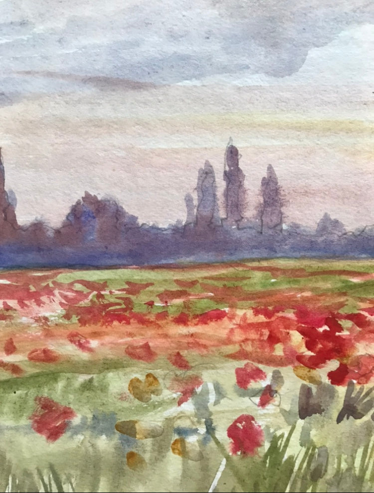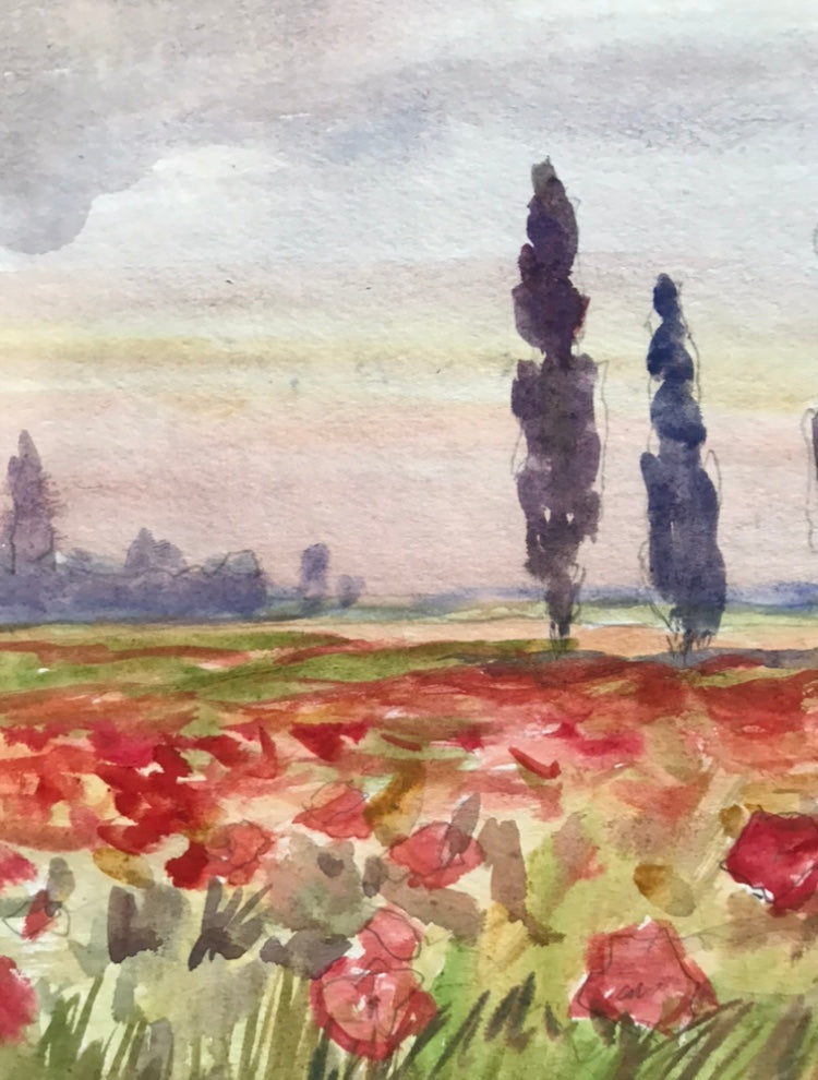 Watercolor painting Poppy field Unknown artist