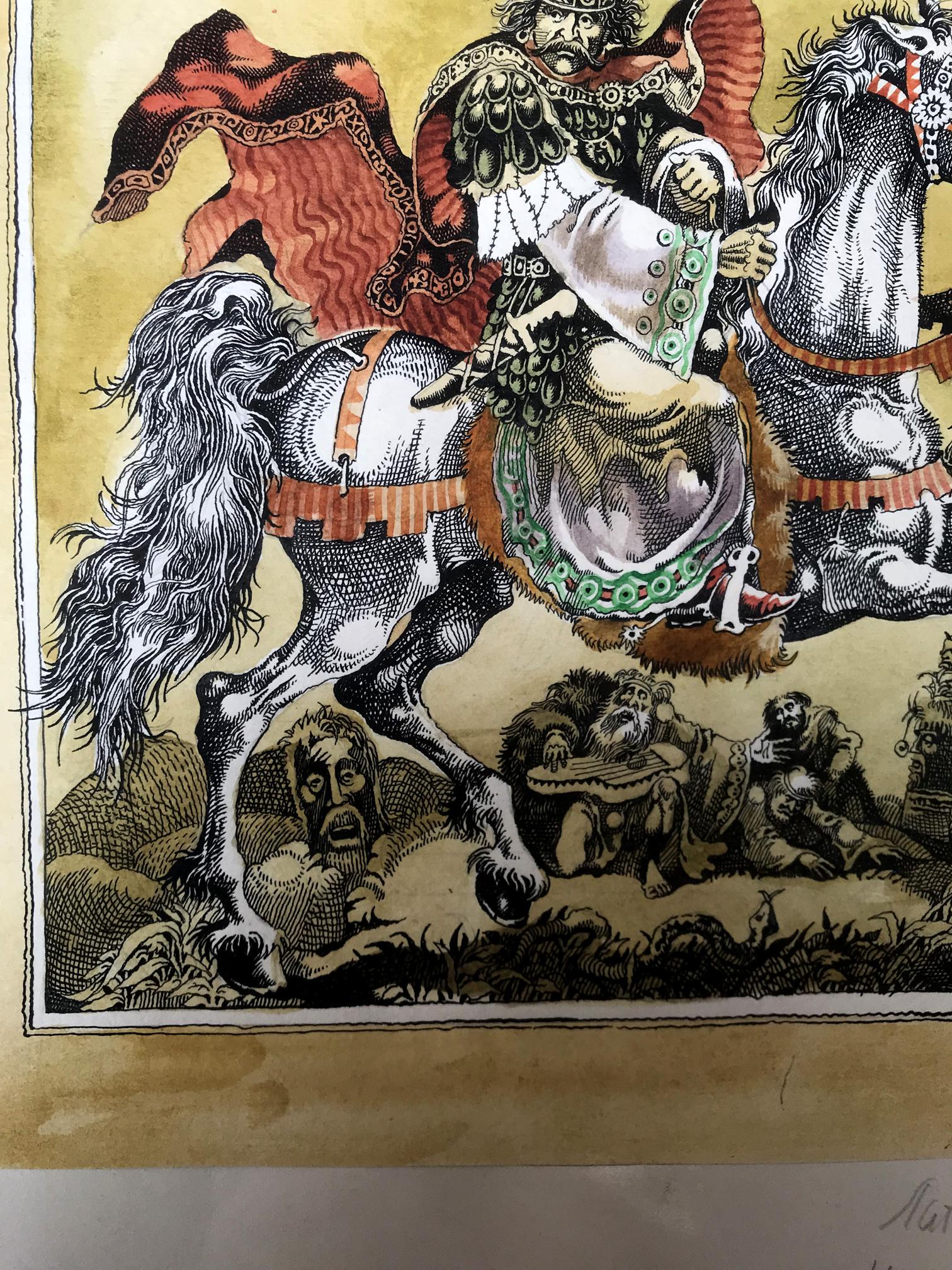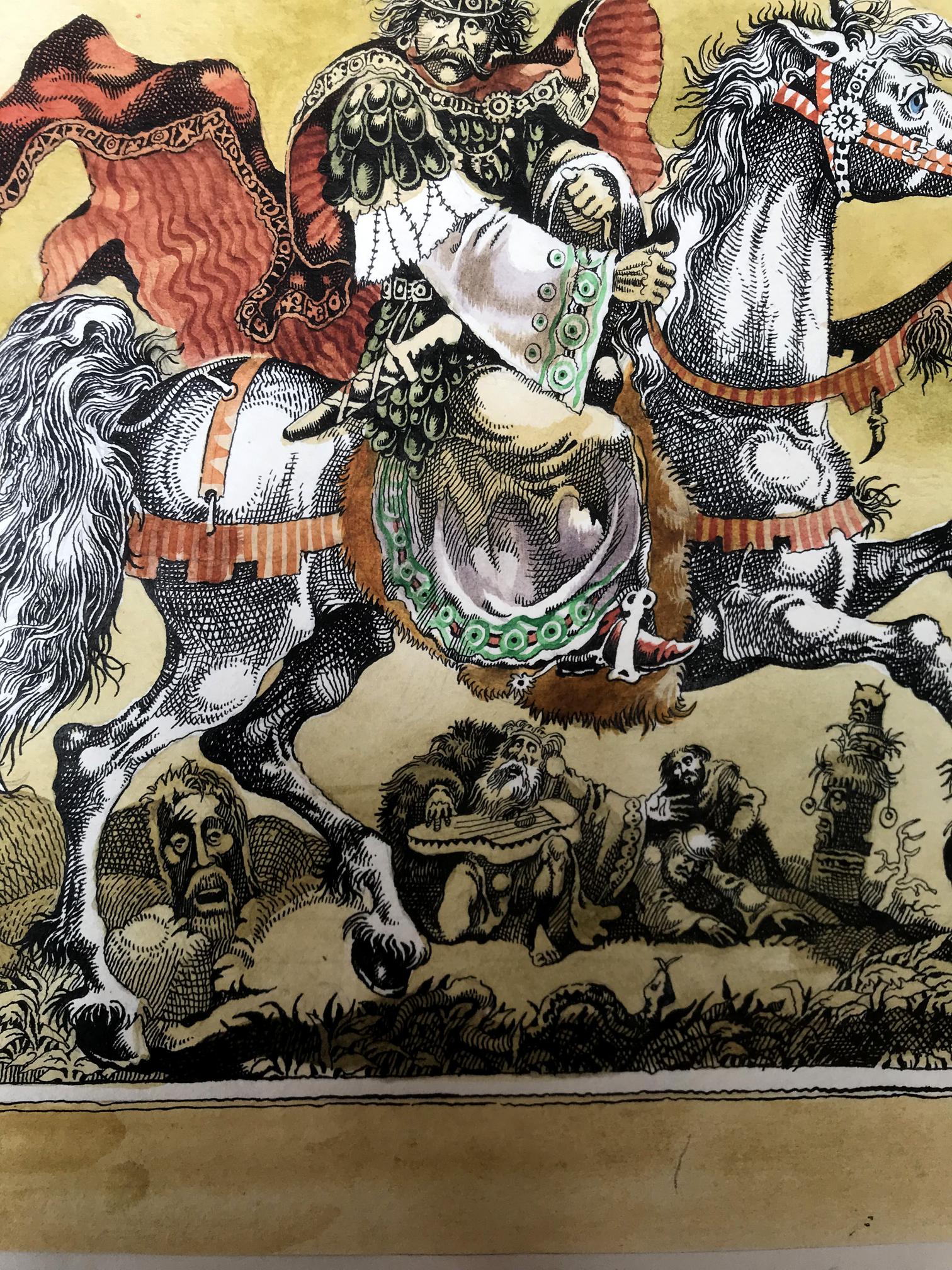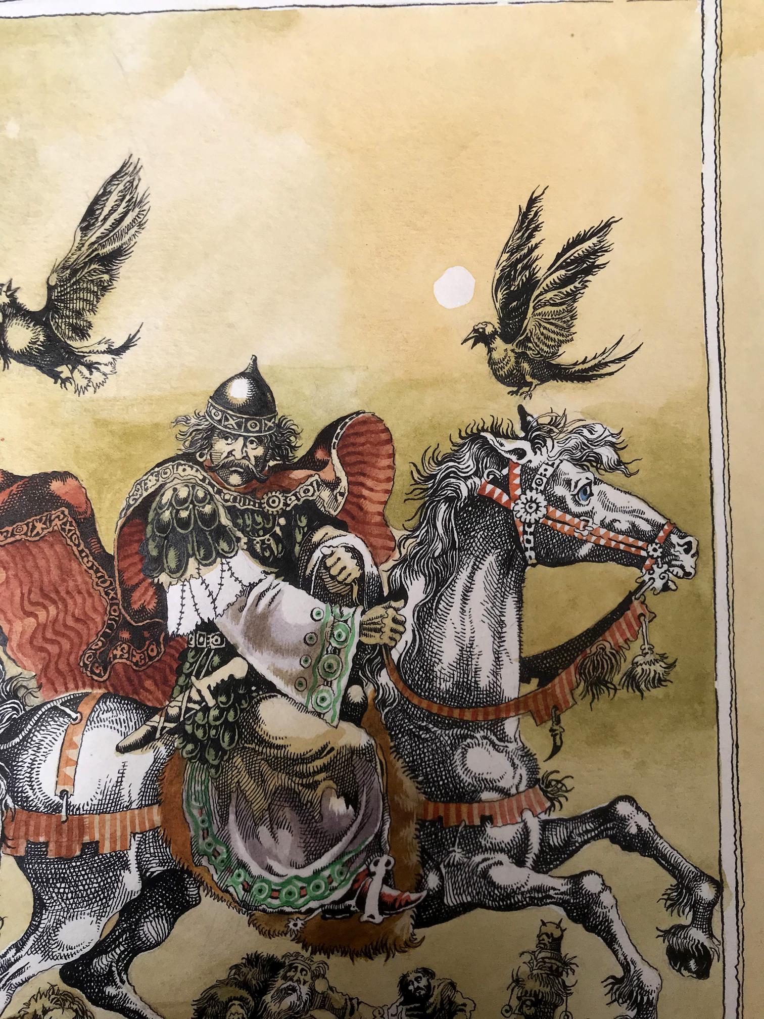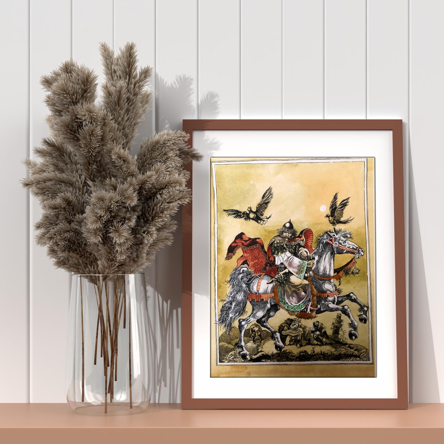 "Portrait of the King" is a captivating watercolor painting that commands attention with its exquisite portrayal of regality and grace. The artwork captures a momentous scene where a majestic king astride a magnificent white horse becomes the focal point of the composition. The king's commanding presence is accentuated by his vibrant attire, adorned in a resplendent ensemble of gold and white. His regal stature emanates authority and power, setting him apart as a figure of utmost importance. A red and black cloak billows dramatically in the wind, adding a touch of dynamism to the composition and symbolizing the king's unwavering strength and determination. A picturesque scene unfolds as delicate brushstrokes depict a flock of birds gracefully soaring through the sky. These birds, with their wings outstretched, symbolize the king's connection with nature and his ability to inspire freedom and harmony. Their presence adds a sense of liveliness and tranquility to the overall scene. The artist has rendered a captivating background consisting of a vibrant yellow hue that permeates the canvas. The yellow sky creates a warm and inviting atmosphere, subtly suggesting the radiant and optimistic nature of the king's reign. The background, while minimalistic, serves as a perfect backdrop to emphasize the king's majestic presence and make him the undeniable focus of the painting. Through skillful watercolor techniques, the artist has successfully captured the essence of the king's character and the aura surrounding him. The portrait exudes a sense of reverence and admiration, inviting viewers to contemplate the power and grace of this esteemed ruler. "Portrait of the King" is a masterpiece that transports its audience to a realm of nobility and magnificence, leaving an indelible impression in the hearts and minds of all who behold it.