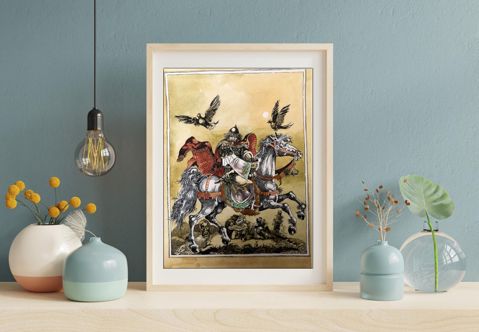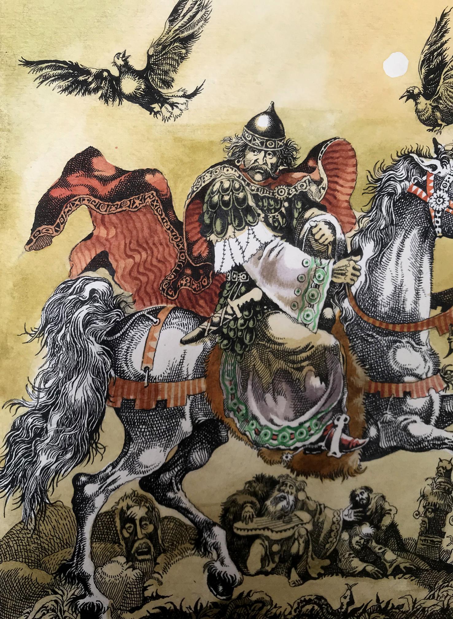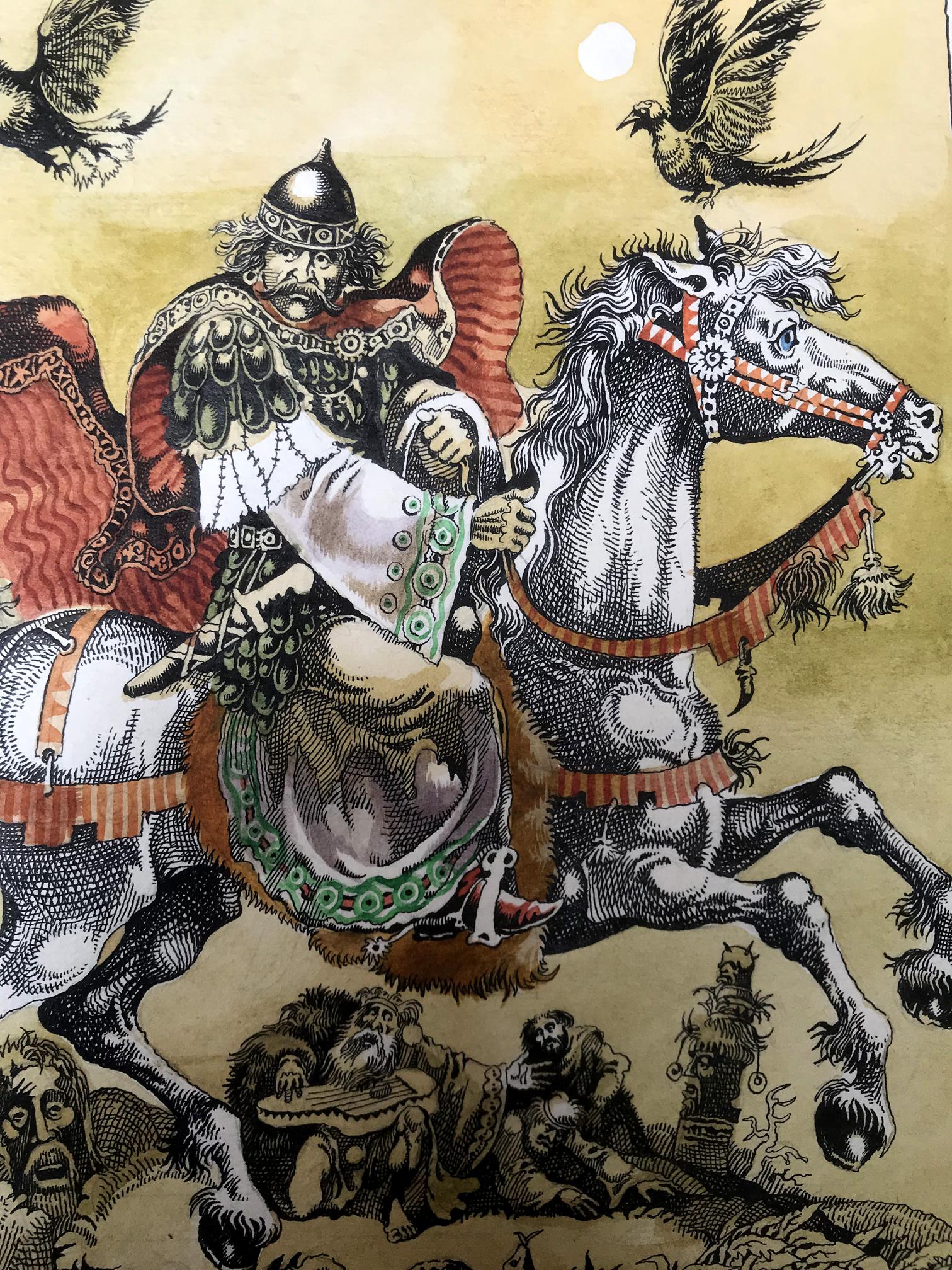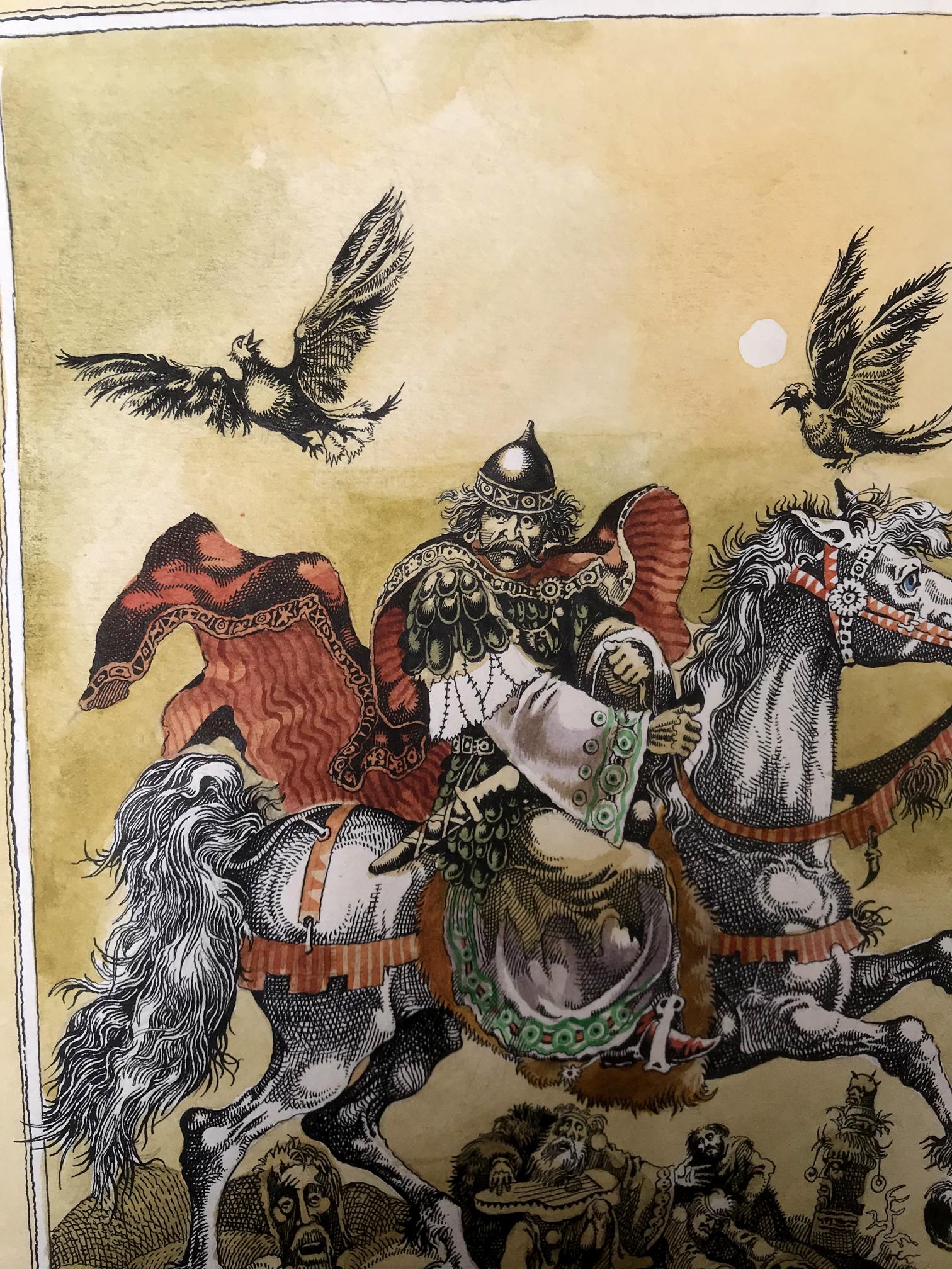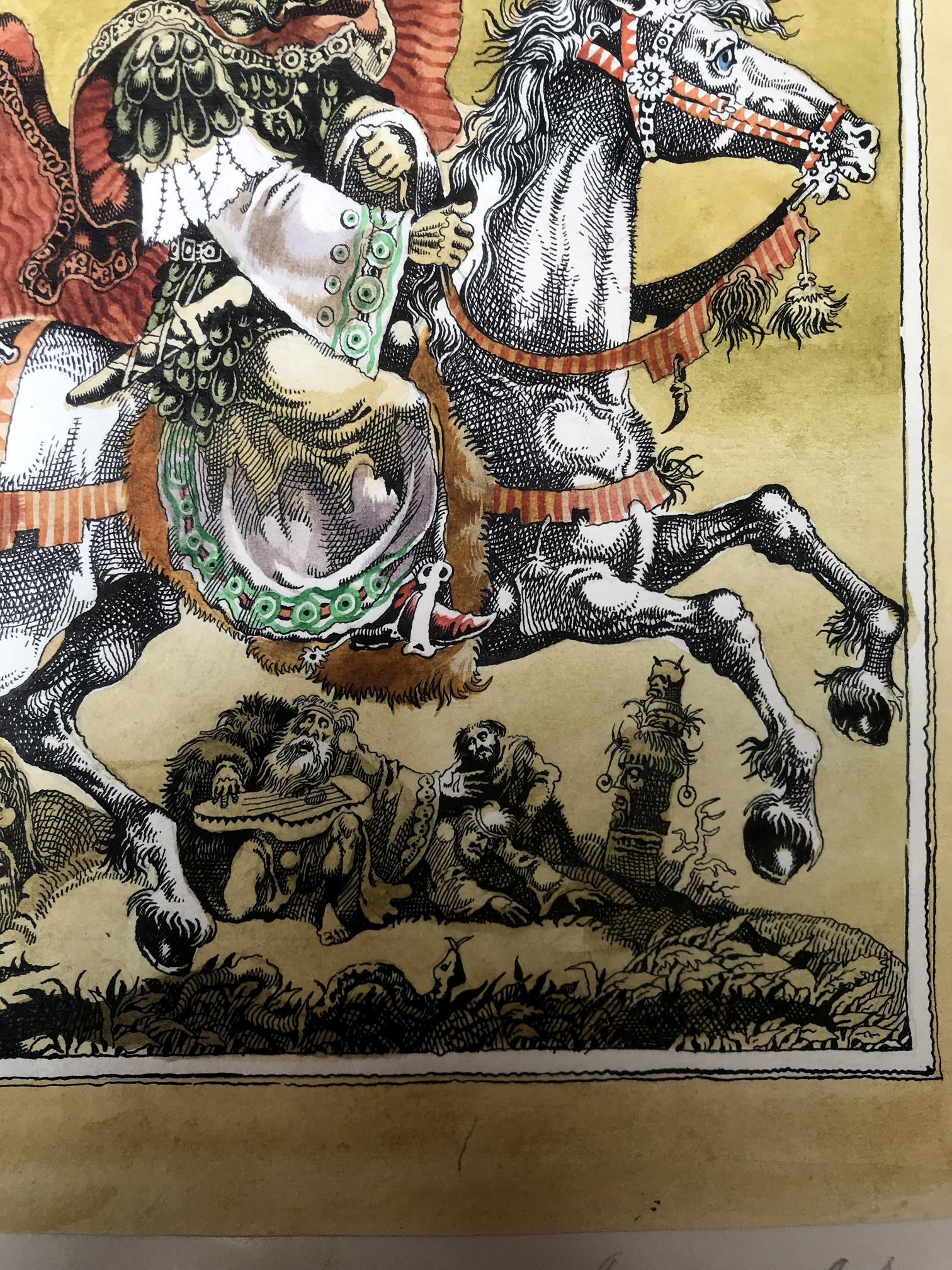 "Portrait of the King" is a captivating watercolor painting that commands attention with its exquisite portrayal of regality and grace. The artwork captures a momentous scene where a majestic king astride a magnificent white horse becomes the focal point of the composition. The king's commanding presence is accentuated by his vibrant attire, adorned in a resplendent ensemble of gold and white. His regal stature emanates authority and power, setting him apart as a figure of utmost importance. A red and black cloak billows dramatically in the wind, adding a touch of dynamism to the composition and symbolizing the king's unwavering strength and determination. A picturesque scene unfolds as delicate brushstrokes depict a flock of birds gracefully soaring through the sky. These birds, with their wings outstretched, symbolize the king's connection with nature and his ability to inspire freedom and harmony. Their presence adds a sense of liveliness and tranquility to the overall scene. The artist has rendered a captivating background consisting of a vibrant yellow hue that permeates the canvas. The yellow sky creates a warm and inviting atmosphere, subtly suggesting the radiant and optimistic nature of the king's reign. The background, while minimalistic, serves as a perfect backdrop to emphasize the king's majestic presence and make him the undeniable focus of the painting. Through skillful watercolor techniques, the artist has successfully captured the essence of the king's character and the aura surrounding him. The portrait exudes a sense of reverence and admiration, inviting viewers to contemplate the power and grace of this esteemed ruler. "Portrait of the King" is a masterpiece that transports its audience to a realm of nobility and magnificence, leaving an indelible impression in the hearts and minds of all who behold it.