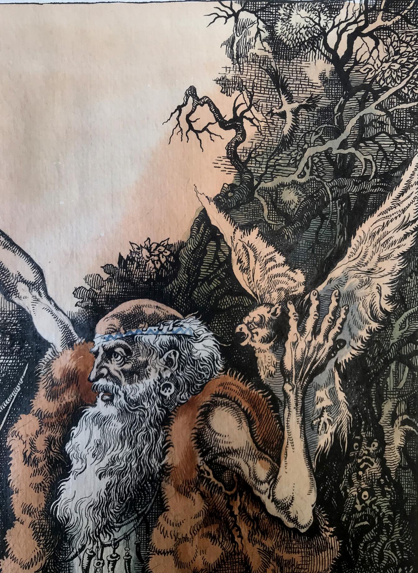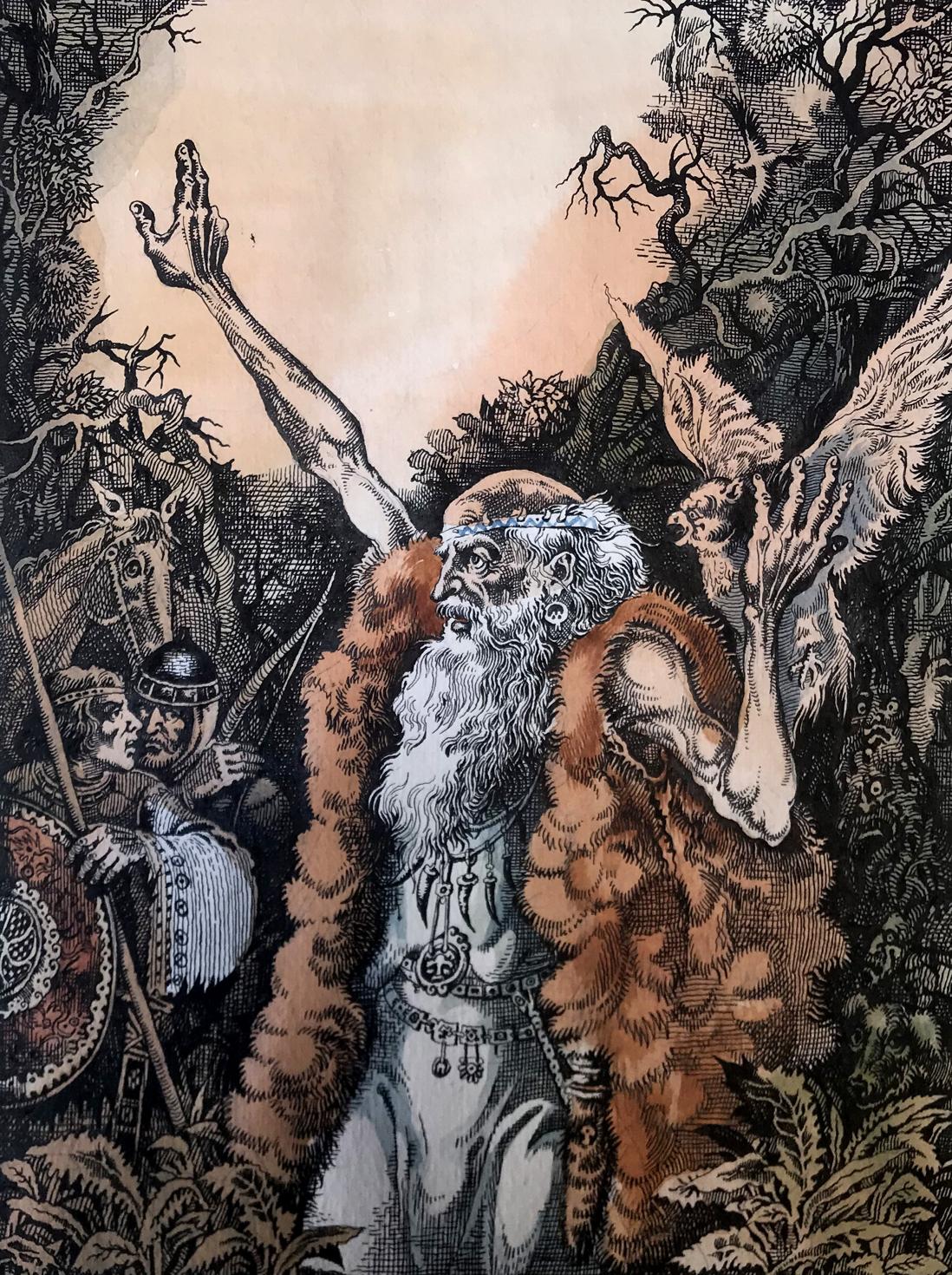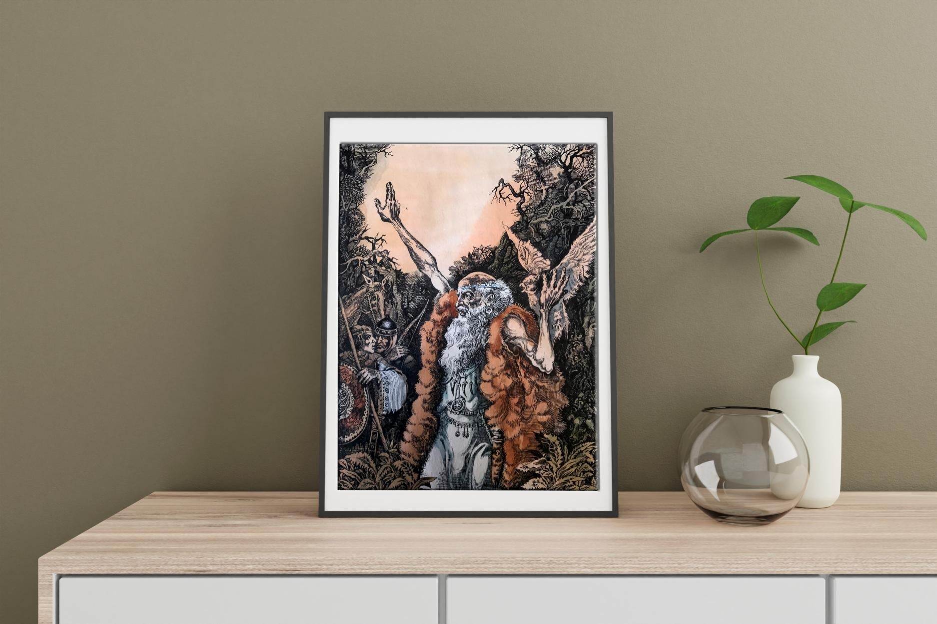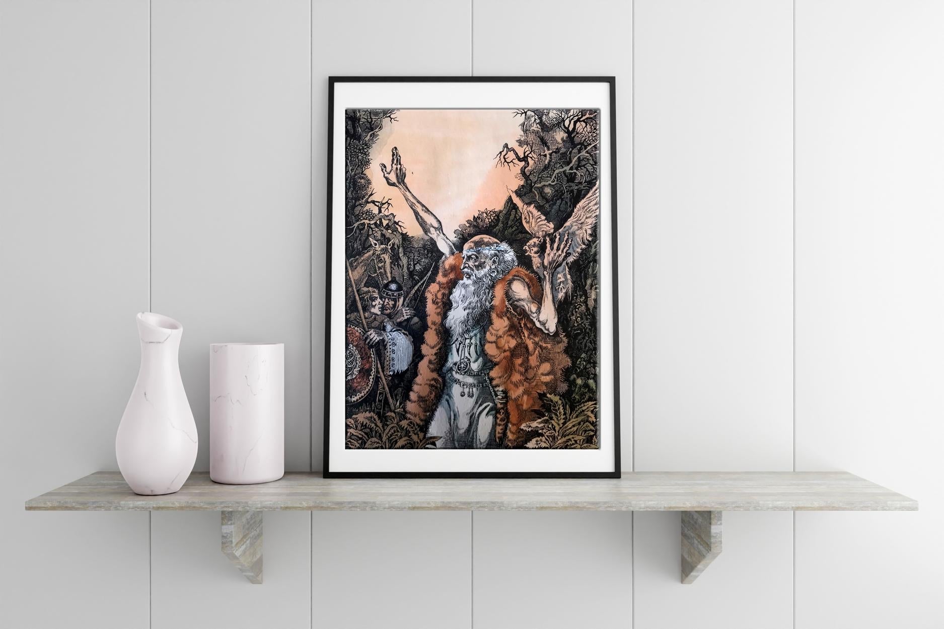"The Prophet" is a captivating portrait created with a blend of colored pencils and watercolors, evoking a sense of mysticism and reverence. The focal point of the painting is a prophet, gracefully positioned in the foreground, dressed in a flowing white robe that drapes down to his feet. Over his robe, he wears a woolen skin, adding an earthy texture and depth to his attire. The prophet's long and dignified beard cascades down his chest, displaying shades of gray, symbolizing wisdom and age. The prophet's head is bald, devoid of any hair, accentuating his otherworldly presence and suggesting a profound connection with the divine. With a gentle yet determined expression, his eyes seem to gaze into a realm beyond the physical world, as if he possesses an intimate understanding of the universe's secrets. In his left hand, the prophet delicately cradles a bird, a symbol of freedom and spirituality. The bird rests trustingly in his palm, representing the prophet's harmonious connection with nature and his ability to nurture and guide living beings. With his right hand, he raises the bird towards the sky, seemingly offering it to the heavens, emphasizing the prophet's transcendent power and his role as an intermediary between the mortal and the divine. The background of the painting reveals a lush forest, awash with vibrant colors and delicate brushstrokes. The trees stand tall and proud, enveloping the scene in a sense of enchantment and spiritual abundance. The forest symbolizes the vastness of the prophet's wisdom and the infinite possibilities that lie within his teachings. Overall, "The Prophet" is a striking portrait that captures the essence of spirituality and profound connection with the divine. Through the skillful combination of colored pencils and watercolors, the artist has brought forth a visually captivating representation of a prophet's enlightened presence and his ability to bridge the gap between humanity and the spiritual realm.