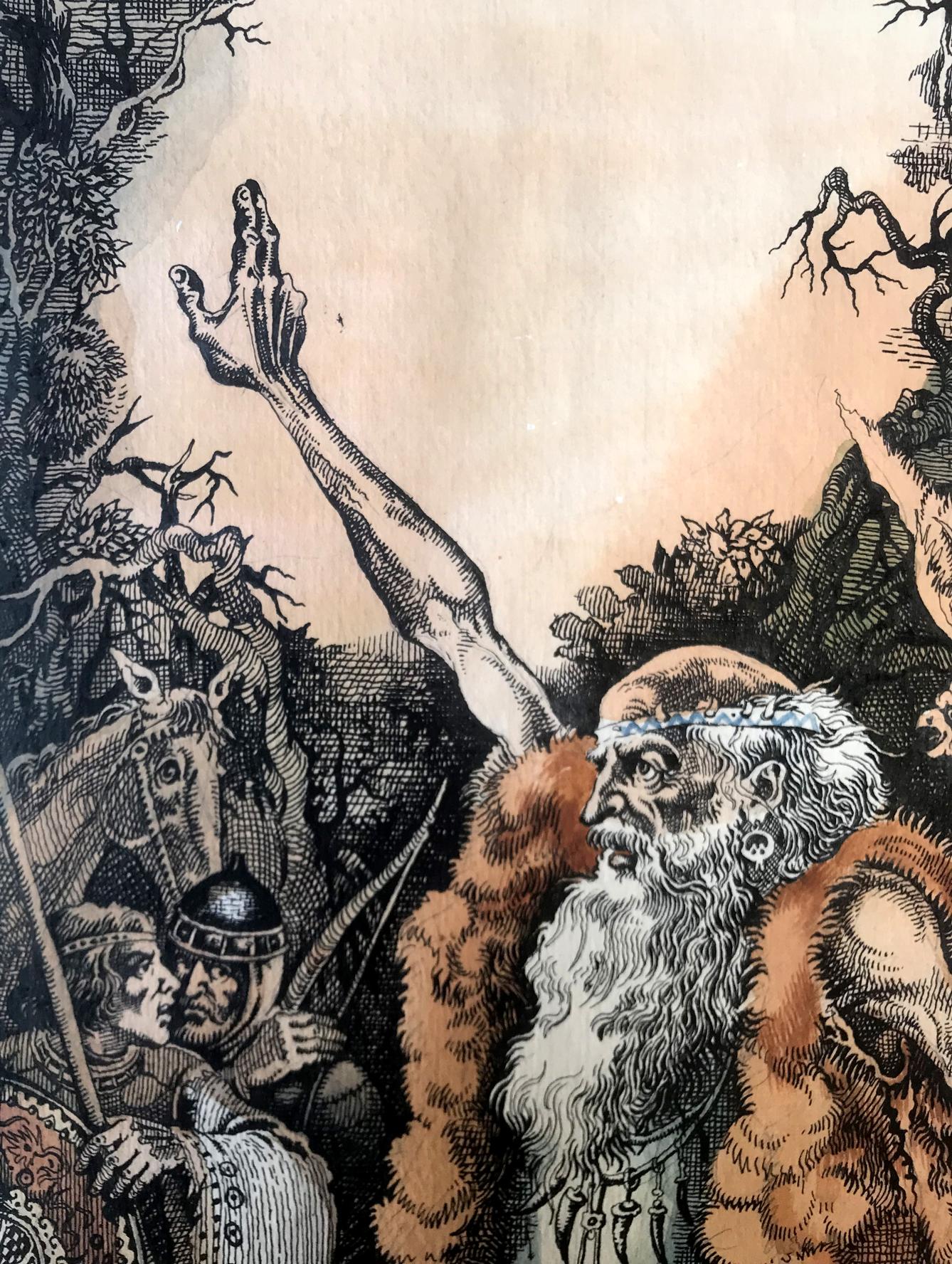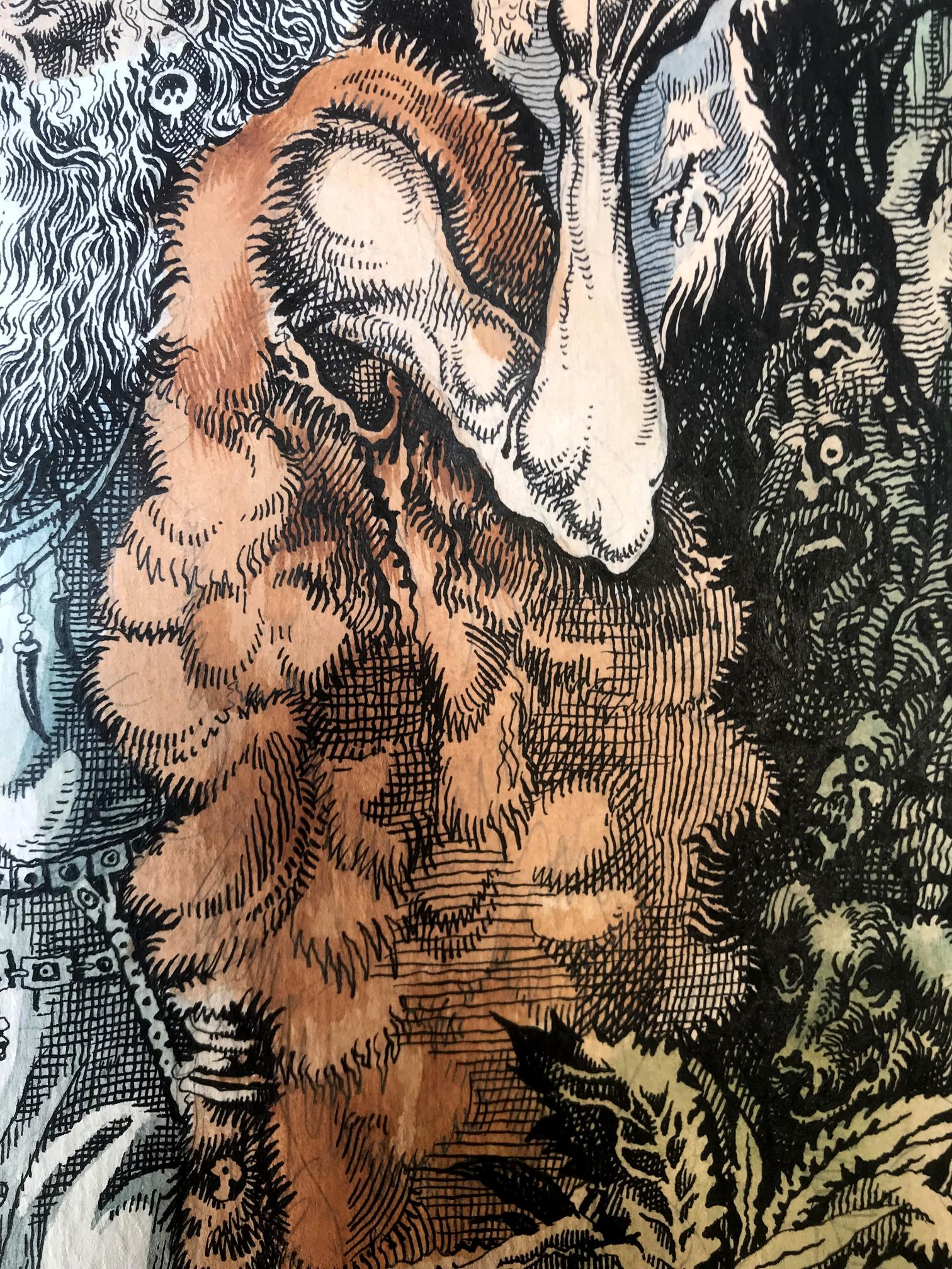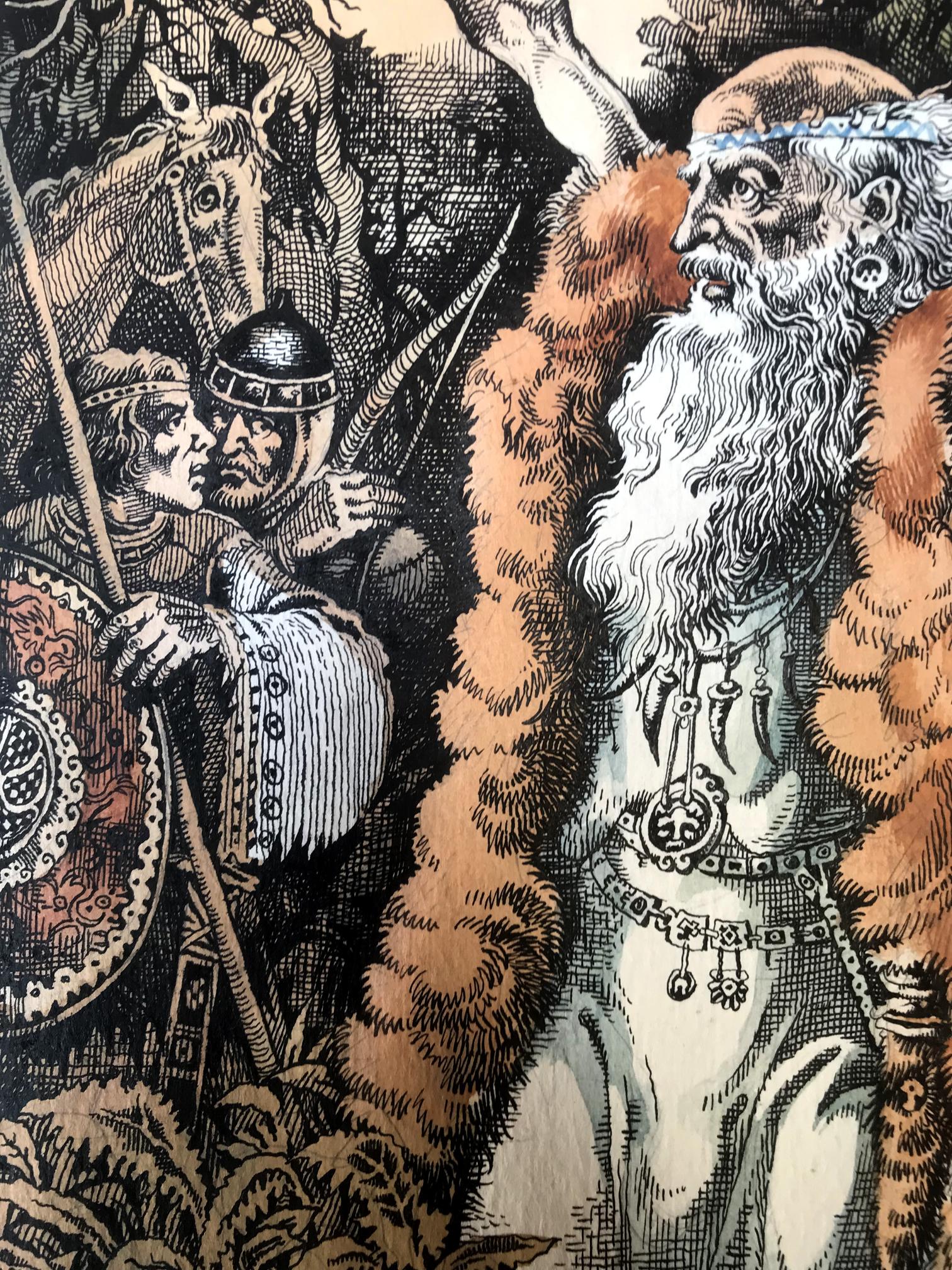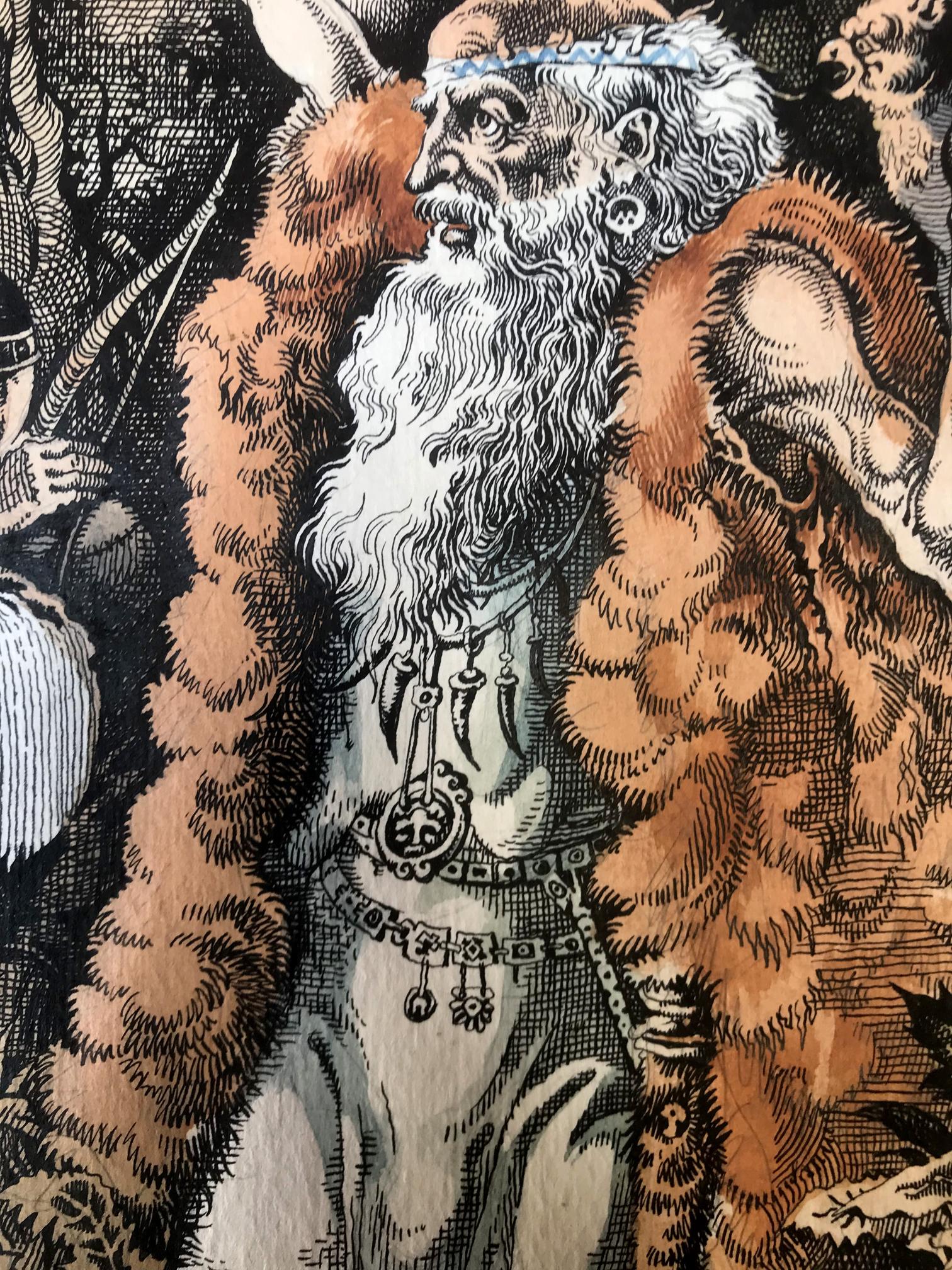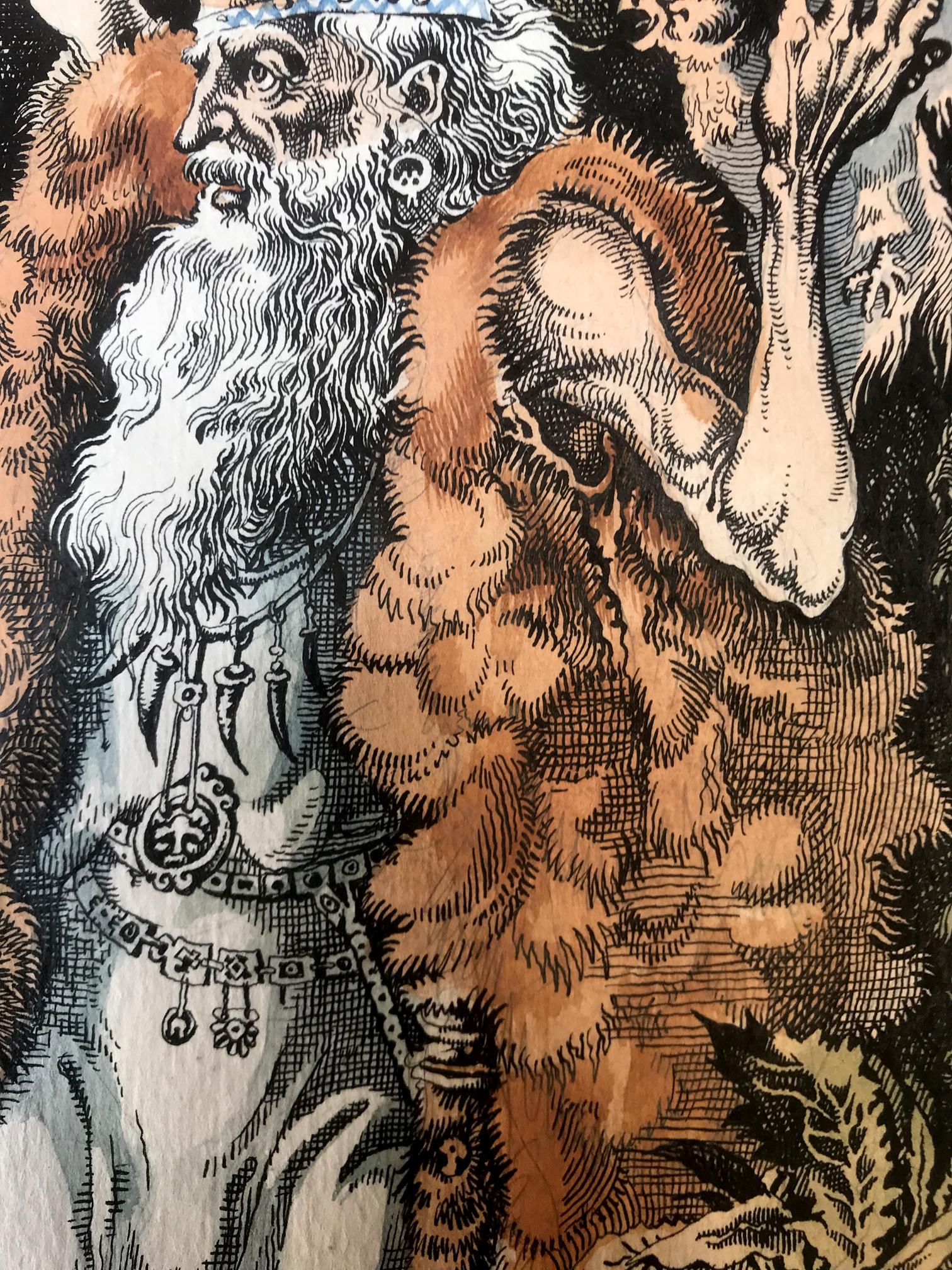 "The Prophet" is a captivating portrait created with a blend of colored pencils and watercolors, evoking a sense of mysticism and reverence. The focal point of the painting is a prophet, gracefully positioned in the foreground, dressed in a flowing white robe that drapes down to his feet. Over his robe, he wears a woolen skin, adding an earthy texture and depth to his attire. The prophet's long and dignified beard cascades down his chest, displaying shades of gray, symbolizing wisdom and age. The prophet's head is bald, devoid of any hair, accentuating his otherworldly presence and suggesting a profound connection with the divine. With a gentle yet determined expression, his eyes seem to gaze into a realm beyond the physical world, as if he possesses an intimate understanding of the universe's secrets. In his left hand, the prophet delicately cradles a bird, a symbol of freedom and spirituality. The bird rests trustingly in his palm, representing the prophet's harmonious connection with nature and his ability to nurture and guide living beings. With his right hand, he raises the bird towards the sky, seemingly offering it to the heavens, emphasizing the prophet's transcendent power and his role as an intermediary between the mortal and the divine. The background of the painting reveals a lush forest, awash with vibrant colors and delicate brushstrokes. The trees stand tall and proud, enveloping the scene in a sense of enchantment and spiritual abundance. The forest symbolizes the vastness of the prophet's wisdom and the infinite possibilities that lie within his teachings. Overall, "The Prophet" is a striking portrait that captures the essence of spirituality and profound connection with the divine. Through the skillful combination of colored pencils and watercolors, the artist has brought forth a visually captivating representation of a prophet's enlightened presence and his ability to bridge the gap between humanity and the spiritual realm.