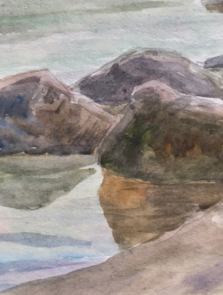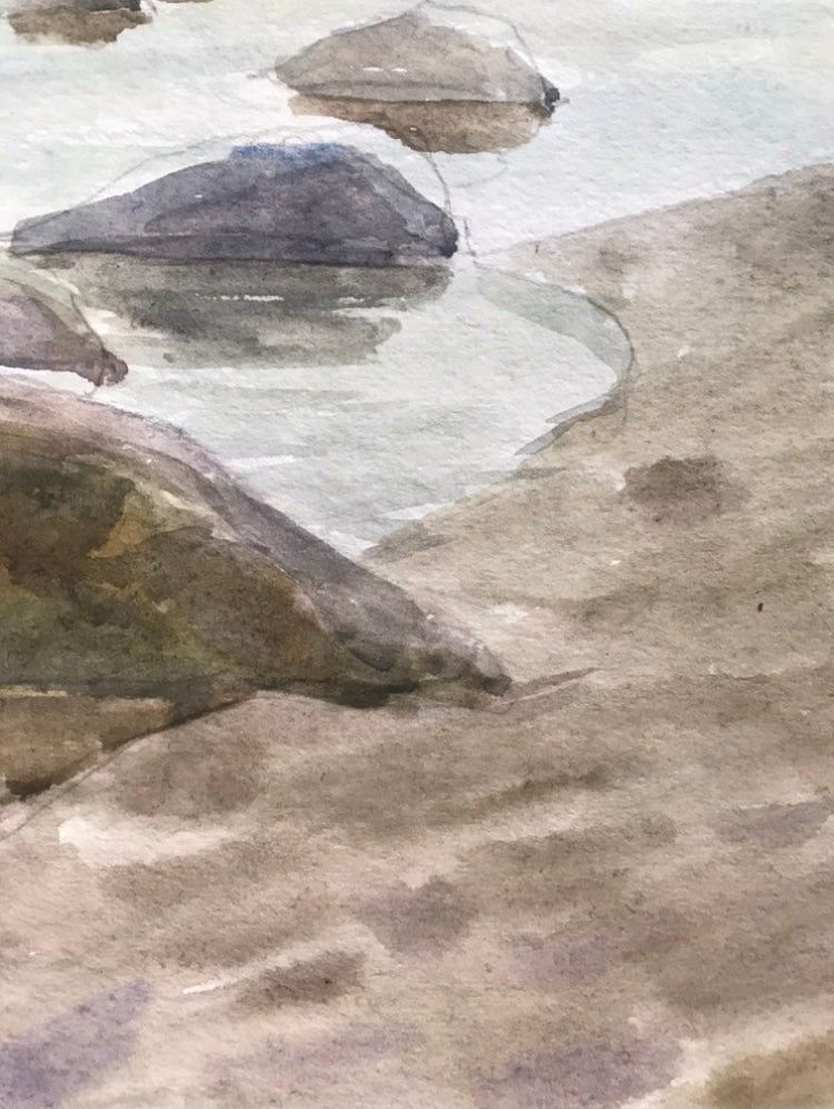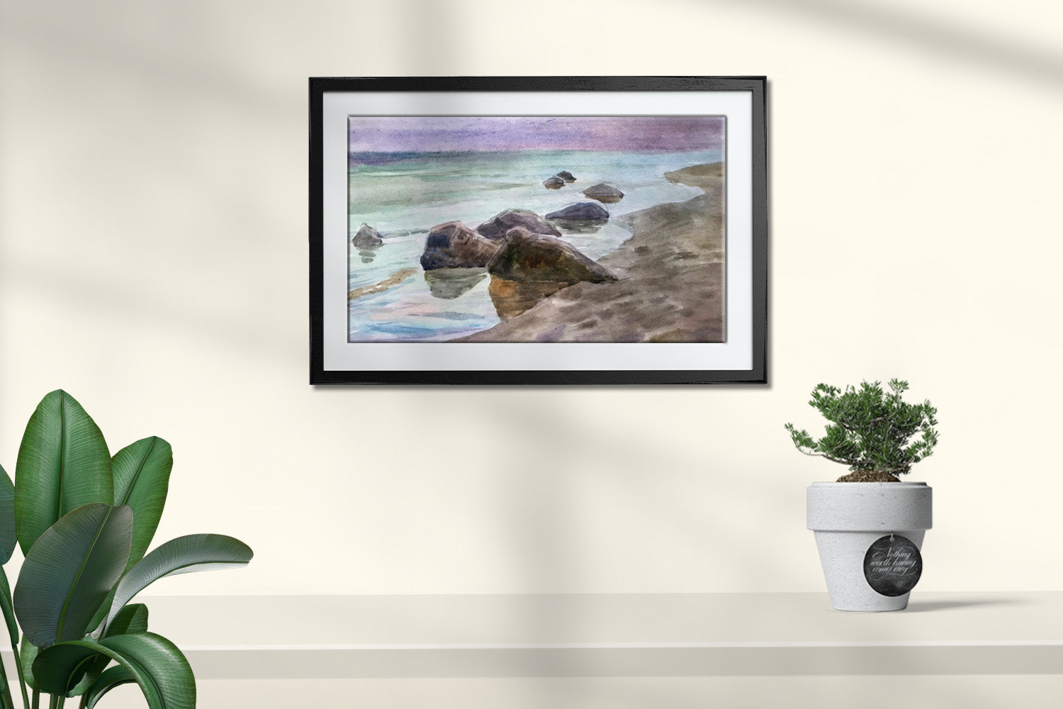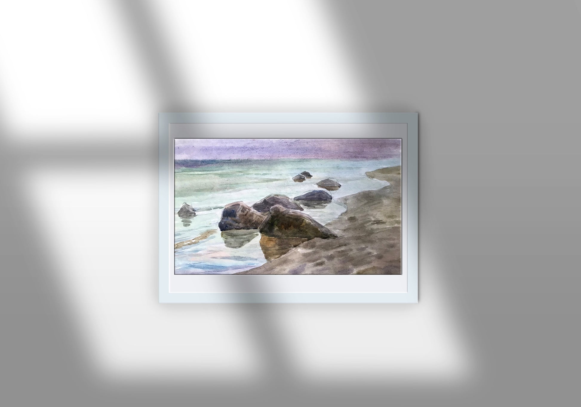 This beautiful painting captures the serenity of a sandy shoreline. The muted colors create a sense of calm, while the sun-dappled stones add a bit of texture and interest. The scene is brought to life with meticulous brushstrokes that give the painting a realistic look. It's the perfect way to bring a bit of the outdoors inside your home.