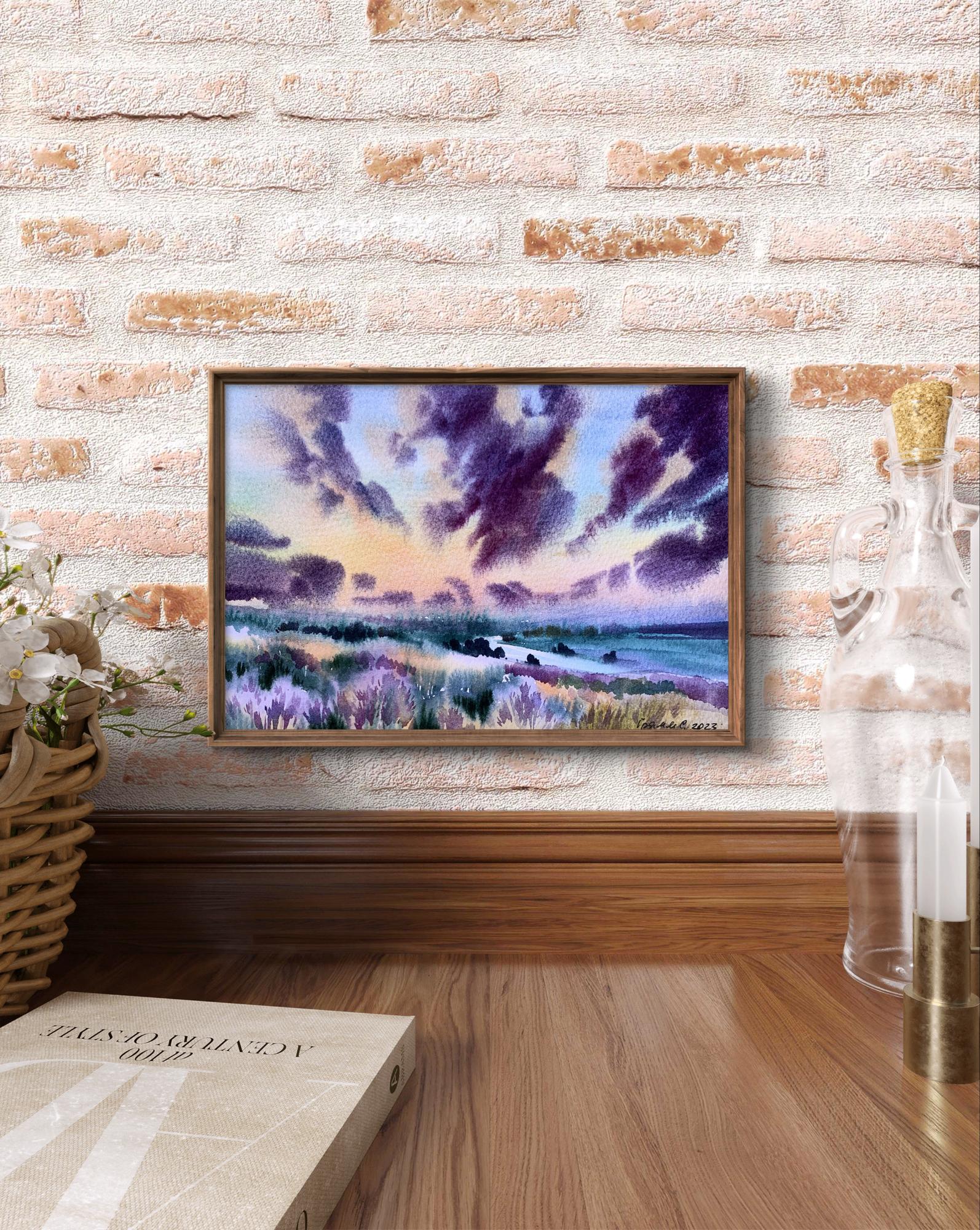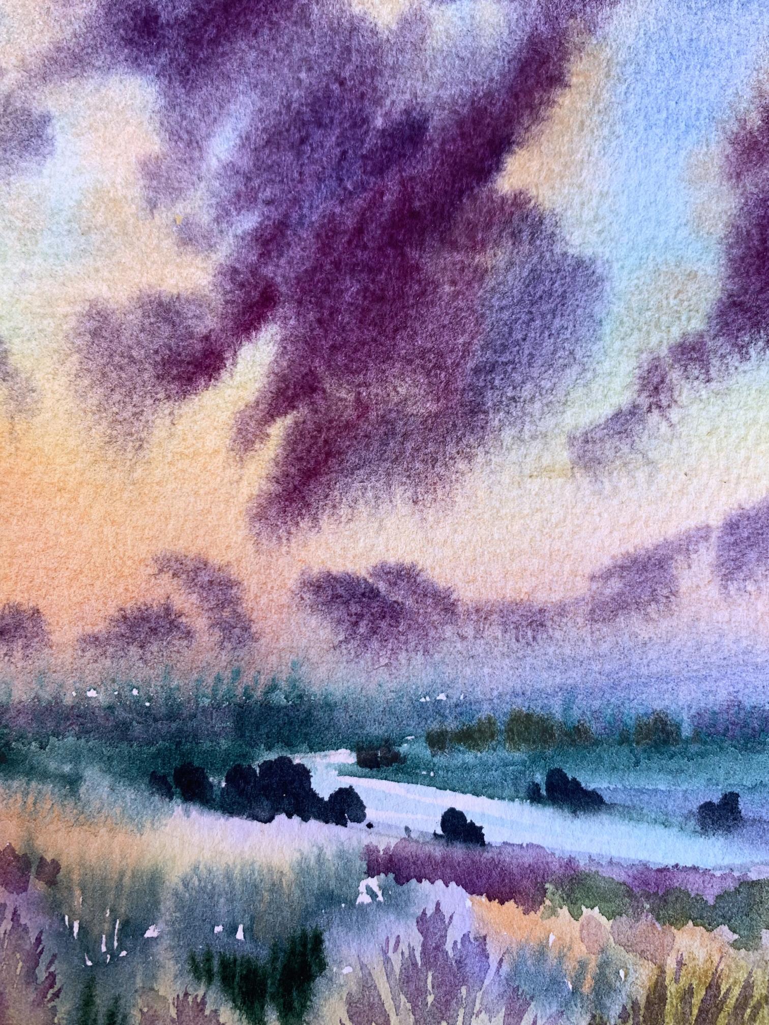 "The Shore is Covered with Clouds" is a mesmerizing watercolor painting that beautifully captures the serene and mystical atmosphere of a shoreline under a dramatic sky. The artist has expertly used color and texture to create a sense of depth and movement, bringing the scene to life. The sky dominates the painting with its striking display of clouds in deep purples and soft pinks. The colors transition smoothly from darker hues at the top to lighter shades near the horizon, suggesting the time of either dawn or dusk. The foreground is filled with lush vegetation in shades of green and purple, creating a rich, textured effect. The midground features a subtle hint of the shore and water, painted in soft blues and greens, which blend harmoniously with the rest of the landscape. The clouds are the focal point of the painting, rendered in bold, sweeping strokes. Their dark, dramatic presence contrasts beautifully with the lighter sky, adding a dynamic and almost ethereal quality to the scene. The foreground is densely populated with grasses and shrubs, painted in a mix of purples and greens. This area provides texture and depth, leading the viewer's eye toward the middle ground and the distant shore. The middle ground features the shoreline, with the water reflecting the colors of the sky. The soft, blurred edges of the water and land create a dreamy effect, enhancing the painting’s tranquil mood. The background is dominated by the expansive sky, filled with dramatic clouds. The use of deep purples and lighter pinks creates a striking contrast, adding depth and a sense of vastness to the scene. The clouds are the most prominent feature, their bold, sweeping forms adding a sense of movement and drama to the painting. Their varying shades of purple and pink add complexity and interest. The detailed depiction of the vegetation in the foreground adds texture and realism, grounding the scene and providing a contrast to the ethereal sky. The subtle portrayal of the shoreline and water adds a sense of calm and continuity, balancing the dynamic sky with a serene landscape. The overall mood of "The Shore is Covered with Clouds" is one of tranquility mixed with a touch of drama. The contrasting elements of the calm shoreline and the dramatic sky create a harmonious balance, evoking a sense of peace and contemplation. "The Shore is Covered with Clouds" can be interpreted as a representation of nature’s beauty and its ever-changing moods. The dramatic clouds suggest a moment of transformation, while the serene shoreline offers a place of calm and reflection. The painting invites viewers to pause and appreciate the fleeting beauty of the natural world. Overall, "The Shore is Covered with Clouds" is a captivating watercolor painting that masterfully combines color, texture, and composition to create a scene of serene beauty and quiet drama. Its dynamic sky and tranquil shore make it a compelling piece that draws the viewer into a moment of peaceful contemplation.