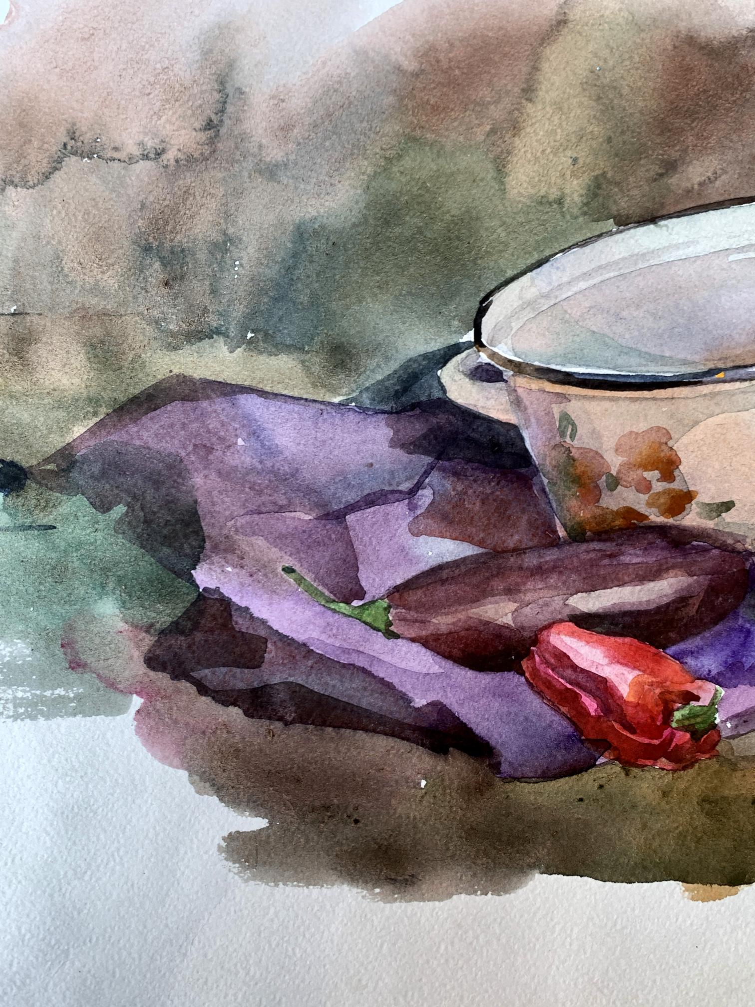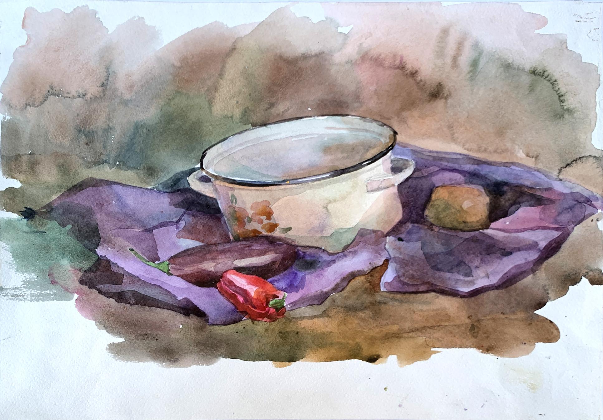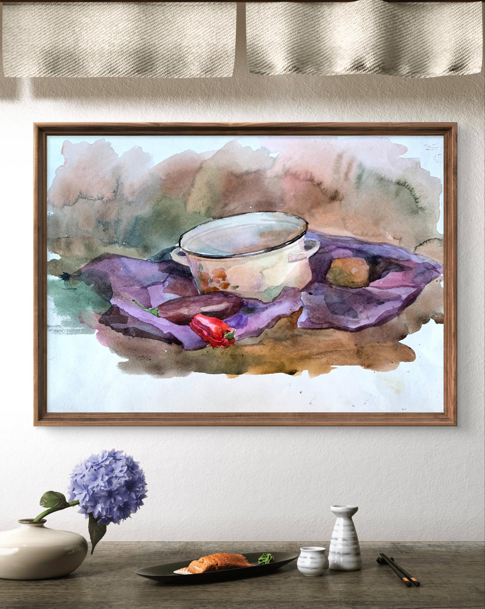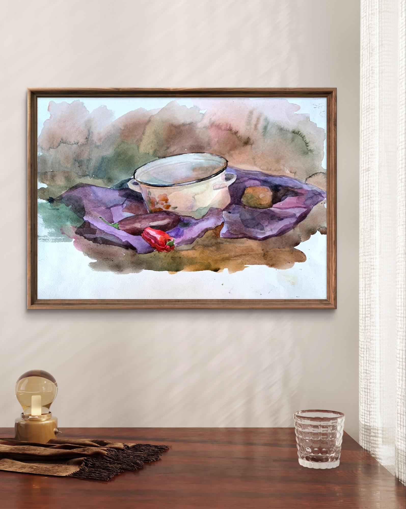 The painting titled "Start Cooking" is a charming still life rendered in delicate watercolor on paper. It captures the simple yet profound beauty of everyday objects, highlighting their role in the rituals of daily life. At the center of the composition is an enamel pot with floral decorations, placed on a soft, draped purple cloth. Surrounding the pot are fresh ingredients—a vibrant red pepper, a deep purple eggplant, and a golden potato—each rendered with careful attention to their natural textures and colors.The watercolor medium lends a soft, fluid quality to the artwork, with gentle blending and transparent layers that evoke a sense of quiet domesticity. The colors are earthy and muted, with the purples and browns of the cloth and background harmonizing with the brighter tones of the vegetables. The loose brushstrokes and soft edges give the painting an impressionistic feel, creating a mood of spontaneity and warmth.The background is an abstract blend of earthy greens and browns, suggesting a rustic setting. This simplicity emphasizes the central objects, drawing the viewer’s attention to the interplay between form and color. The pot, slightly worn and reflective of its utilitarian purpose, becomes a symbol of tradition and the nurturing act of cooking. The vegetables, freshly harvested, speak to the connection between humanity and nature, celebrating the cycles of growth and sustenance.Through "Start Cooking," the artist seeks to remind us of the beauty in the mundane and the importance of simple, everyday acts that connect us to our roots. Cooking, as an act of creation and care, is elevated in this painting to something more significant—a ritual that brings warmth, nourishment, and community. The choice of watercolor adds to this sentiment, as the medium’s light and airy qualities mirror the artist’s intent to focus on simplicity and authenticity.This painting resonates with viewers by evoking a sense of nostalgia and appreciation for the small, meaningful moments in life. The composition invites us to pause and reflect on the quiet beauty of preparing a meal and the timeless tradition of cooking as an expression of love and connection. Through its understated elegance, "Start Cooking" becomes a celebration of life's most essential and intimate moments.