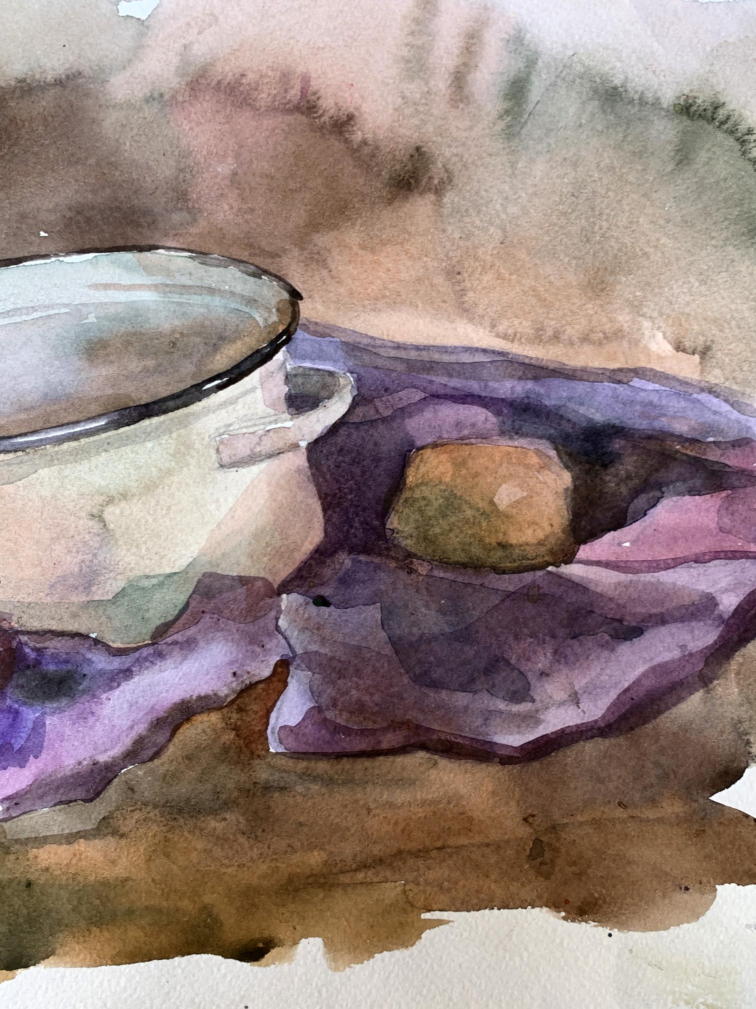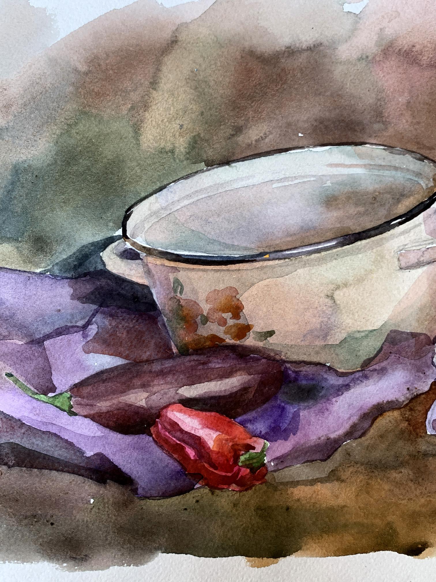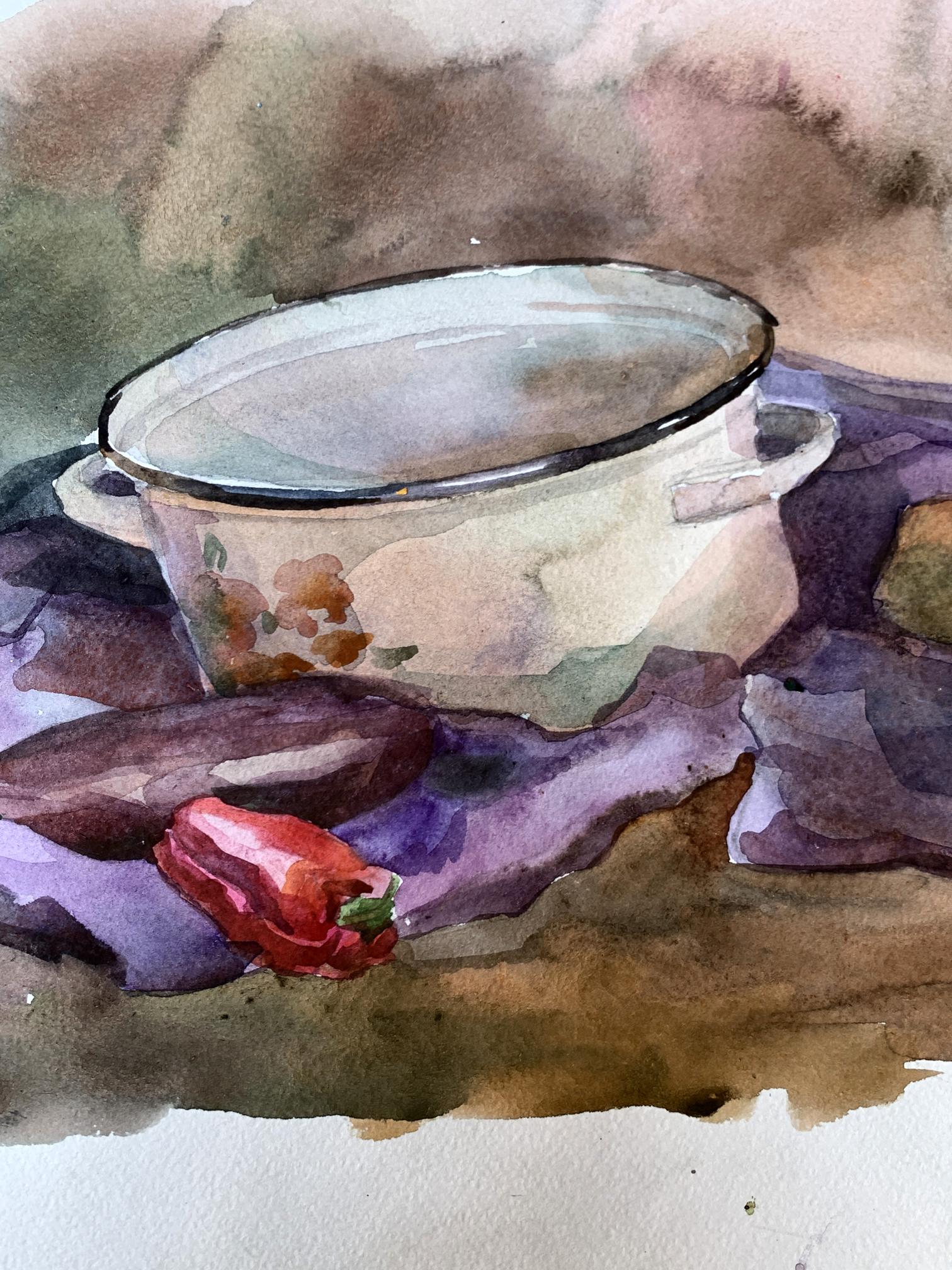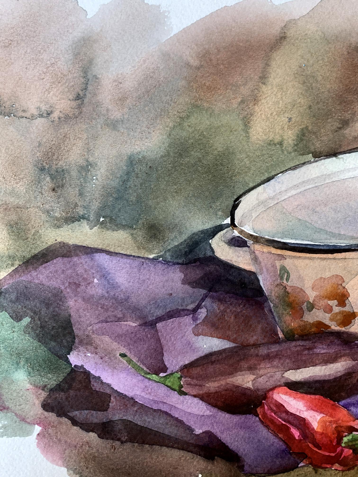 The painting titled "Start Cooking" is a charming still life rendered in delicate watercolor on paper. It captures the simple yet profound beauty of everyday objects, highlighting their role in the rituals of daily life. At the center of the composition is an enamel pot with floral decorations, placed on a soft, draped purple cloth. Surrounding the pot are fresh ingredients—a vibrant red pepper, a deep purple eggplant, and a golden potato—each rendered with careful attention to their natural textures and colors.The watercolor medium lends a soft, fluid quality to the artwork, with gentle blending and transparent layers that evoke a sense of quiet domesticity. The colors are earthy and muted, with the purples and browns of the cloth and background harmonizing with the brighter tones of the vegetables. The loose brushstrokes and soft edges give the painting an impressionistic feel, creating a mood of spontaneity and warmth.The background is an abstract blend of earthy greens and browns, suggesting a rustic setting. This simplicity emphasizes the central objects, drawing the viewer’s attention to the interplay between form and color. The pot, slightly worn and reflective of its utilitarian purpose, becomes a symbol of tradition and the nurturing act of cooking. The vegetables, freshly harvested, speak to the connection between humanity and nature, celebrating the cycles of growth and sustenance.Through "Start Cooking," the artist seeks to remind us of the beauty in the mundane and the importance of simple, everyday acts that connect us to our roots. Cooking, as an act of creation and care, is elevated in this painting to something more significant—a ritual that brings warmth, nourishment, and community. The choice of watercolor adds to this sentiment, as the medium’s light and airy qualities mirror the artist’s intent to focus on simplicity and authenticity.This painting resonates with viewers by evoking a sense of nostalgia and appreciation for the small, meaningful moments in life. The composition invites us to pause and reflect on the quiet beauty of preparing a meal and the timeless tradition of cooking as an expression of love and connection. Through its understated elegance, "Start Cooking" becomes a celebration of life's most essential and intimate moments.