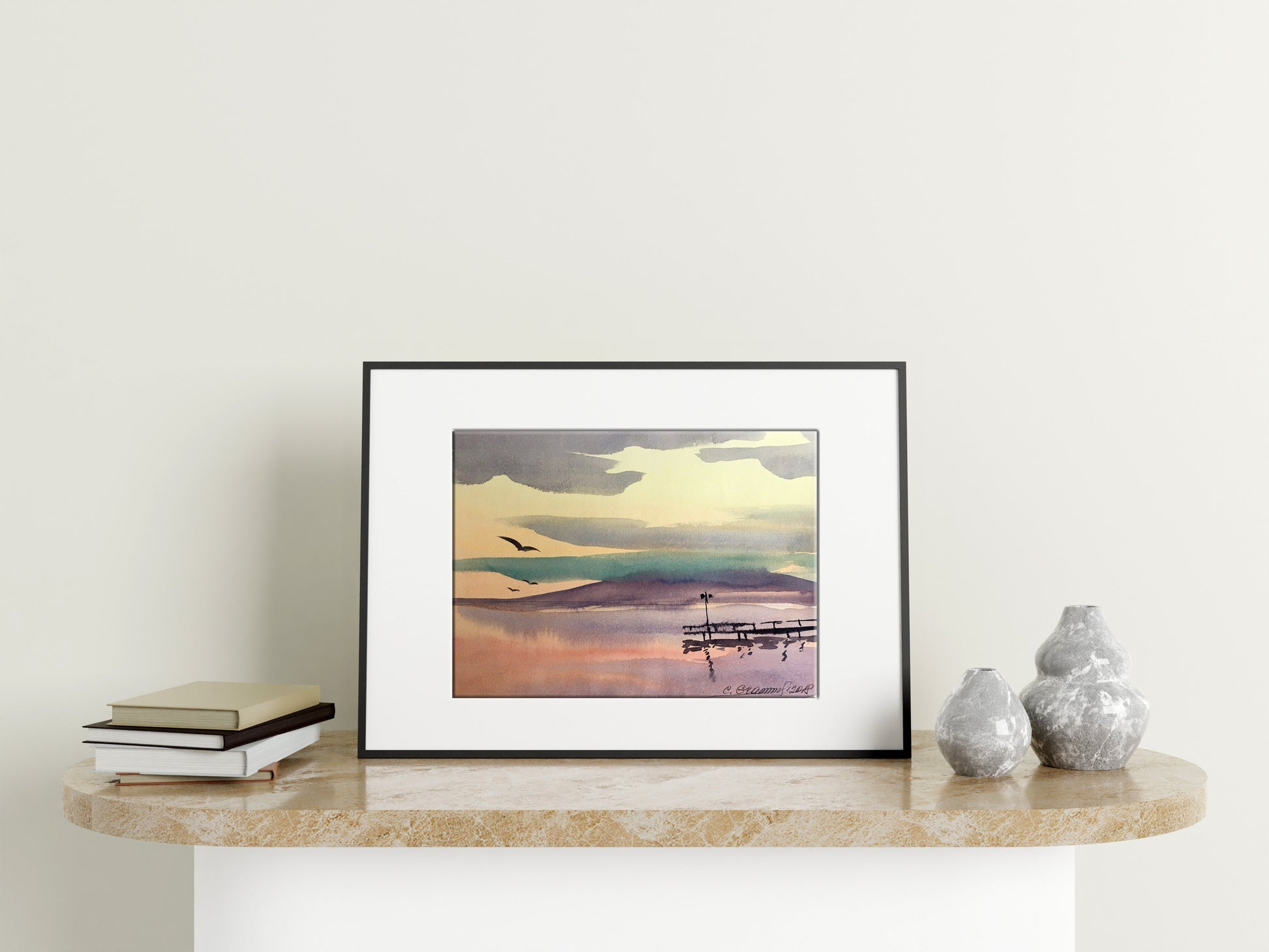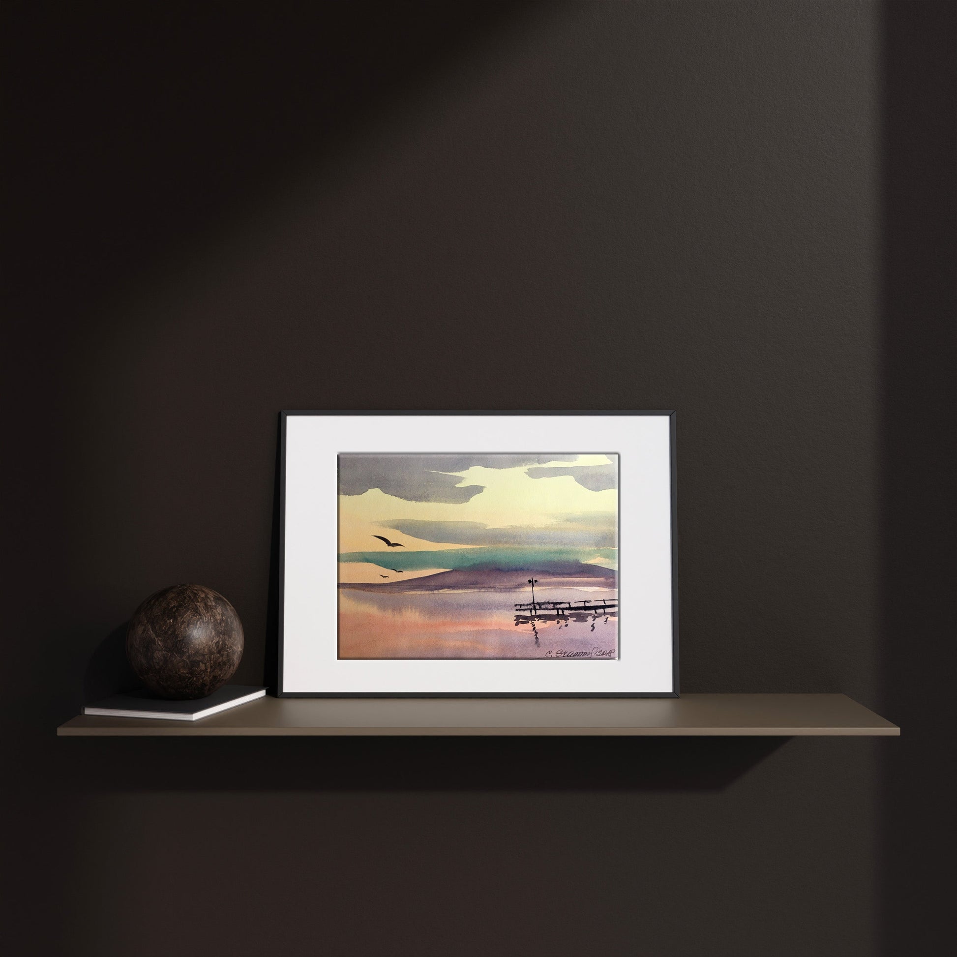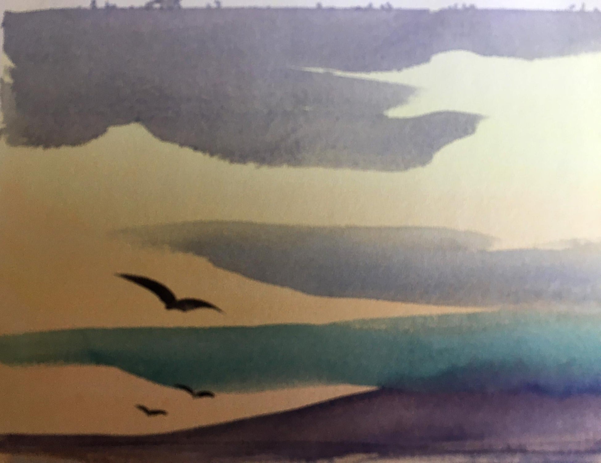 The watercolor painting depicts a serene early morning scene at the seaside during summertime. In the foreground, the vast sea with its shimmering waves takes center stage, creating a sense of tranquility and calmness. A majestic mountain range rises in the distance, adding depth and perspective to the painting. Next to the sea, a ferry is anchored, seemingly waiting for its passengers to embark on a new adventure. The ferry's silhouette against the sea adds to the overall mood of the painting, evoking a sense of wanderlust and a yearning for adventure. The sky is painted in shades of yellow and gray, capturing the early dawn atmosphere with its soft and subtle hues. A few birds are seen flying on the left, adding movement and life to the scene. Overall, the painting conveys a peaceful and idyllic summertime moment at the seaside, inviting the viewer to pause and soak in the natural beauty of the world around us.