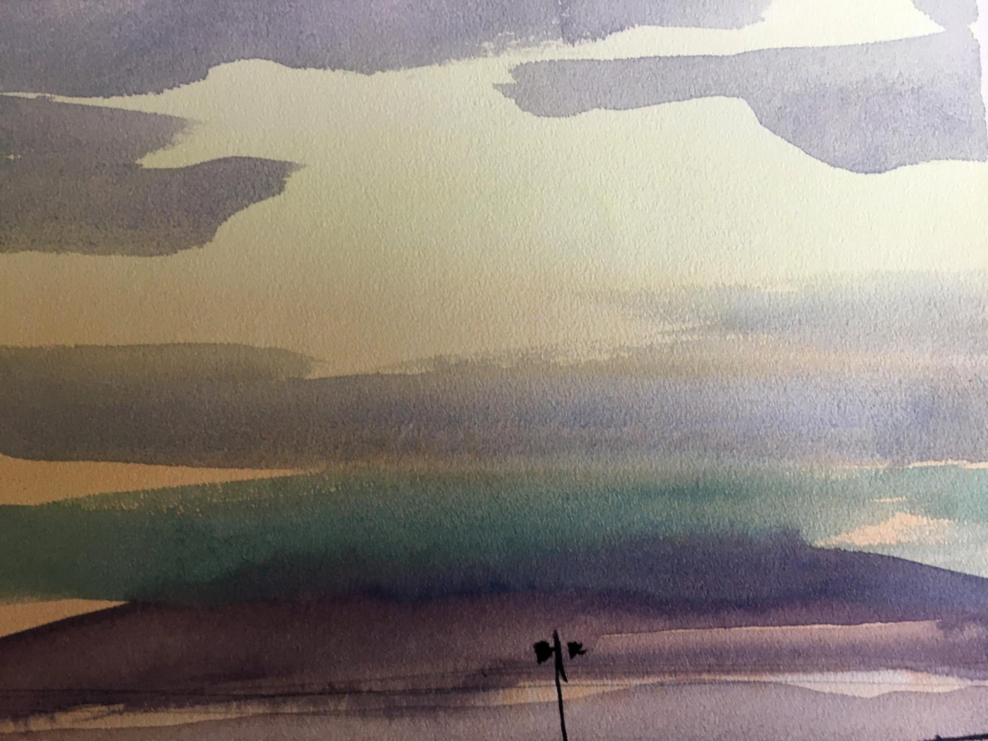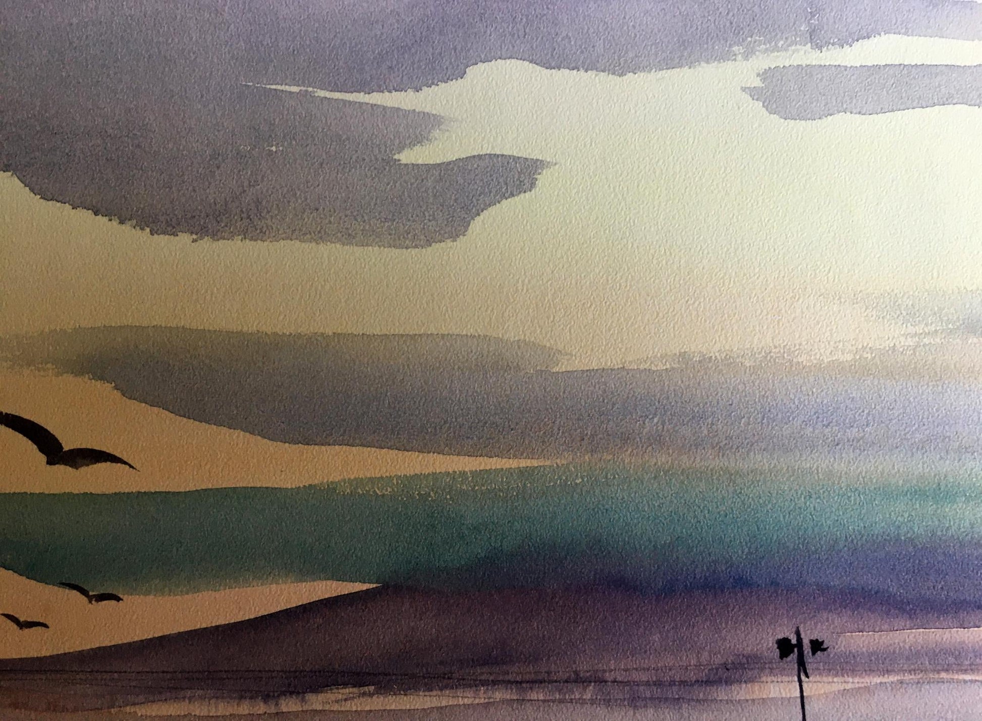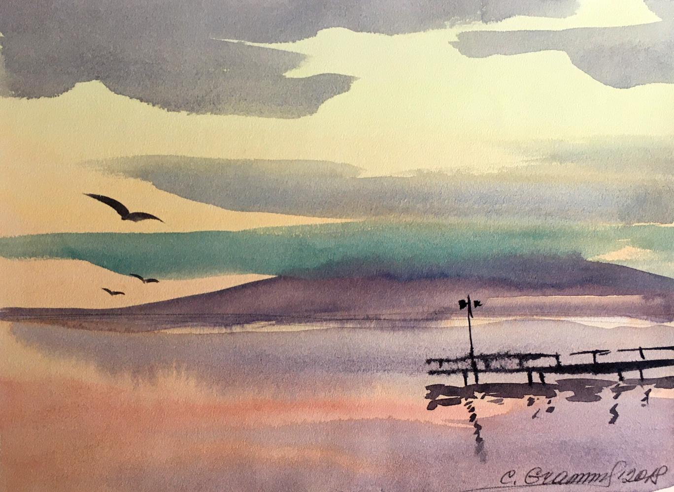 The watercolor painting depicts a serene early morning scene at the seaside during summertime. In the foreground, the vast sea with its shimmering waves takes center stage, creating a sense of tranquility and calmness. A majestic mountain range rises in the distance, adding depth and perspective to the painting. Next to the sea, a ferry is anchored, seemingly waiting for its passengers to embark on a new adventure. The ferry's silhouette against the sea adds to the overall mood of the painting, evoking a sense of wanderlust and a yearning for adventure. The sky is painted in shades of yellow and gray, capturing the early dawn atmosphere with its soft and subtle hues. A few birds are seen flying on the left, adding movement and life to the scene. Overall, the painting conveys a peaceful and idyllic summertime moment at the seaside, inviting the viewer to pause and soak in the natural beauty of the world around us.