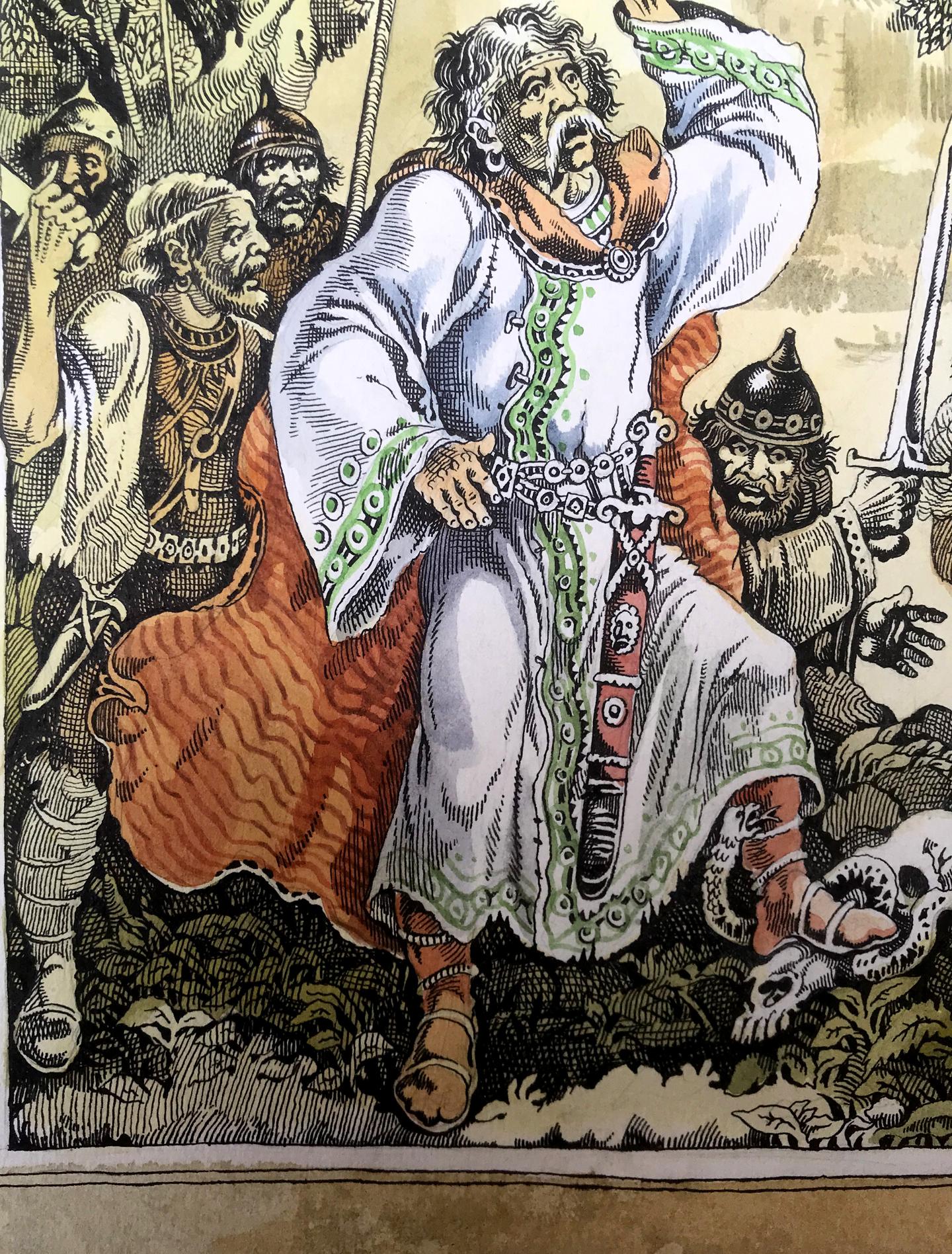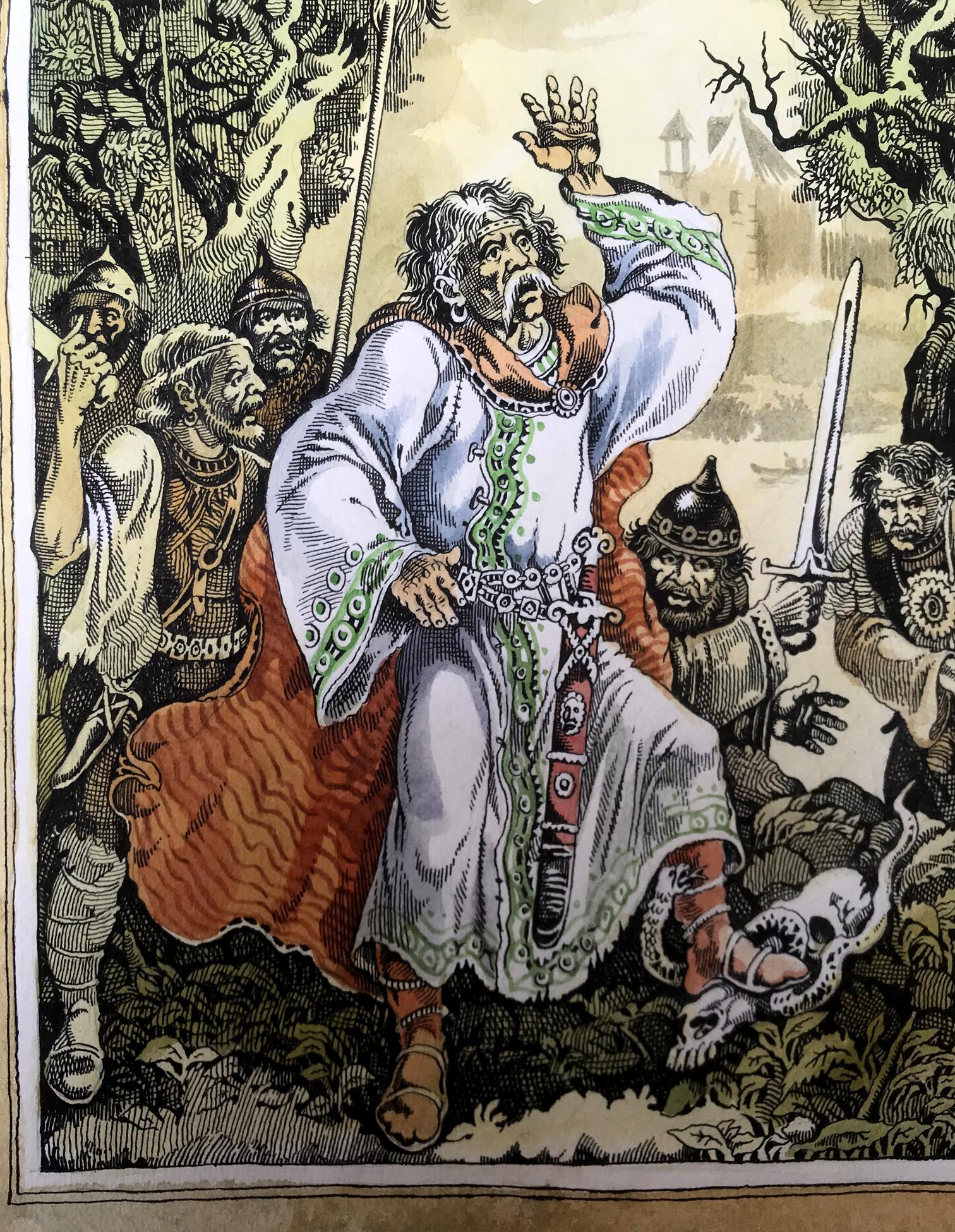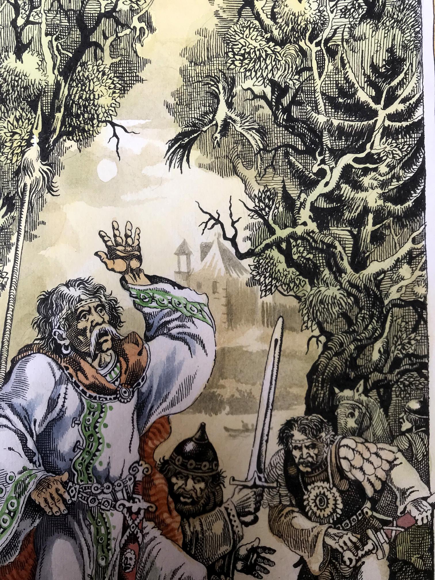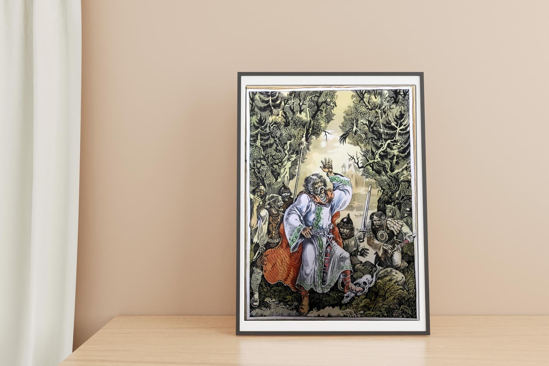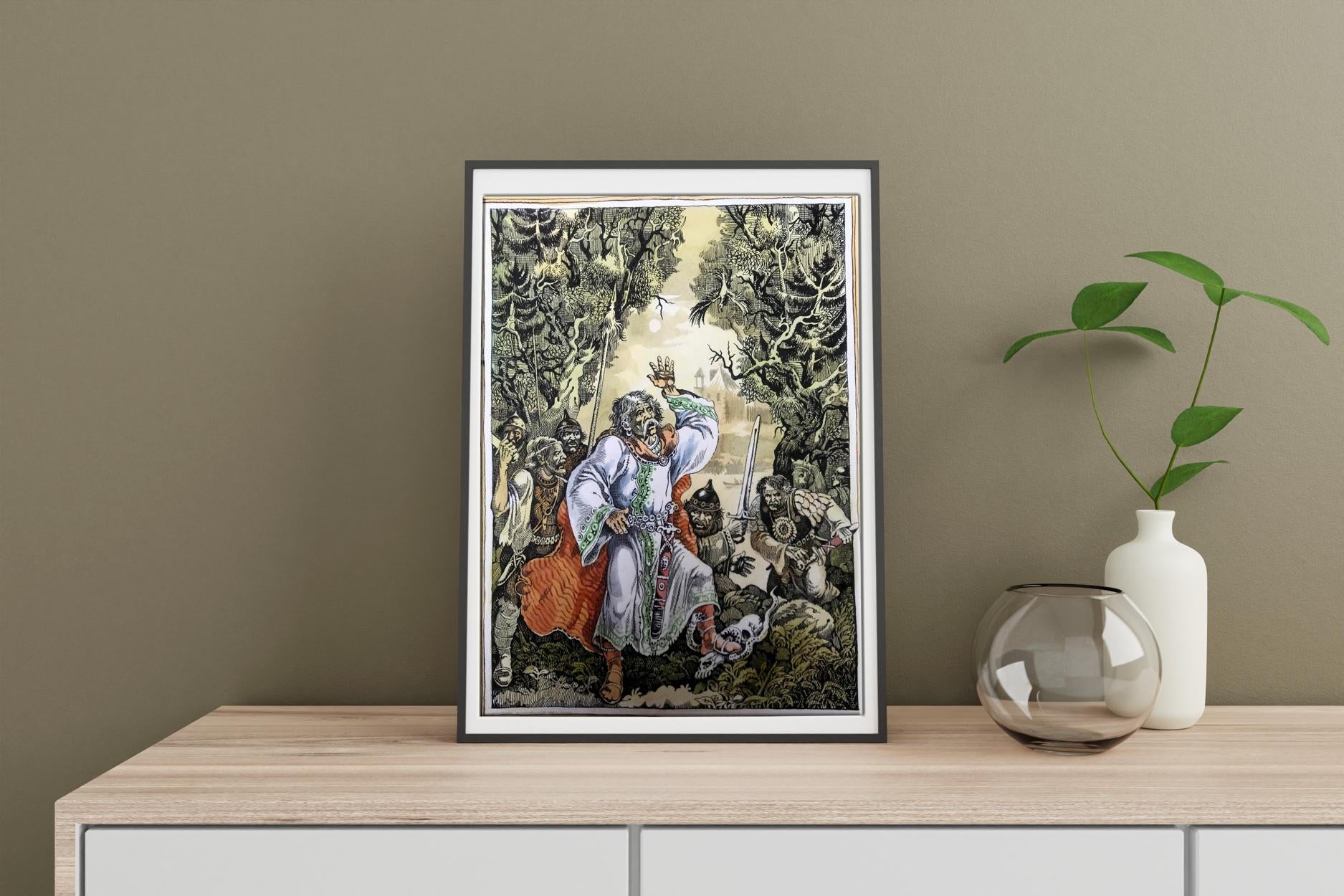"The Limit of Elah" is a captivating watercolor portrait that transports viewers into a world of ancient wisdom and exploration. The central focus of the painting is an elder prophet, exuding an aura of authority and determination. Dressed in a flowing white cassock, he stands tall and resolute, his visage weathered by time and experience. With one hand raised triumphantly towards the heavens, as if beseeching divine guidance, and the other resting confidently on his belt, he embodies both spiritual leadership and unwavering strength. Surrounding the prophet are soldiers, ready to embark on an epic journey into uncharted territories. Clad in their armor and battle attire, they stand steadfast and resolute, echoing the prophet's sense of purpose. Their presence symbolizes the convergence of spirituality and martial prowess, as they heed the prophet's guidance on this momentous expedition. The setting is a dense woodland, shrouded in shades of green and dappled sunlight. Towering trees form a natural canopy overhead, creating a sense of both mystery and protection. The soldiers and the prophet traverse the forest, their determined expressions and purposeful strides hinting at the challenges that lie ahead. The interplay of light and shadows adds depth and dimension to the scene, further enhancing the atmospheric allure of the painting. In the background, a river meanders gracefully through the landscape, its serene waters flowing steadily towards the horizon. The river represents a boundary, the threshold beyond which the prophet and his soldiers venture into unexplored realms. It symbolizes the unknown, inviting contemplation of the risks and rewards of their journey. "The Limit of Elah" captures a pivotal moment in time, where faith and courage converge in pursuit of new horizons. The watercolor technique enhances the ethereal quality of the scene, with soft, delicate brushstrokes giving the painting a dreamlike quality. The colors chosen by the artist, a harmonious blend of earthy tones and subdued hues, evoke a sense of both tranquility and anticipation. As viewers gaze upon "The Limit of Elah," they are invited to reflect on their own boundaries, their aspirations, and the remarkable individuals who dare to lead others beyond the confines of the familiar. It is a work of art that encapsulates the timeless themes of exploration, faith, and the indomitable spirit of human endeavor.