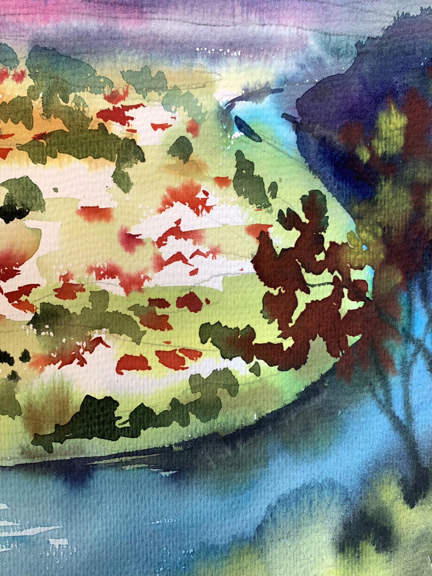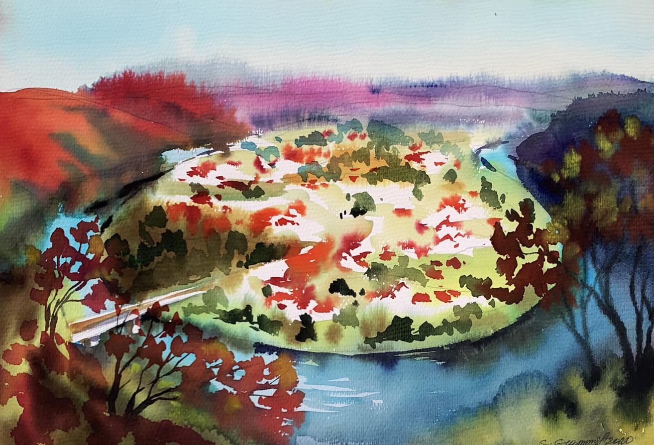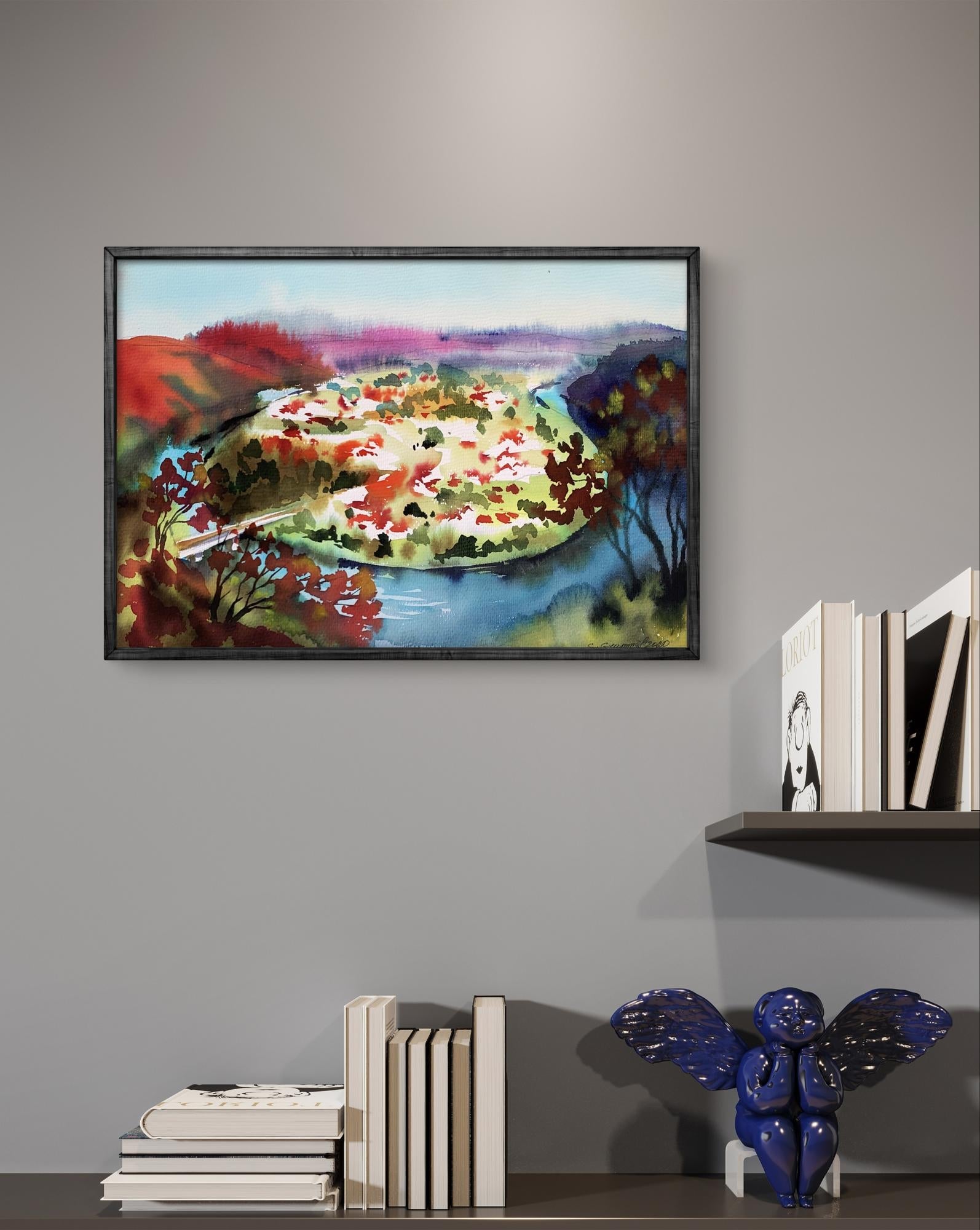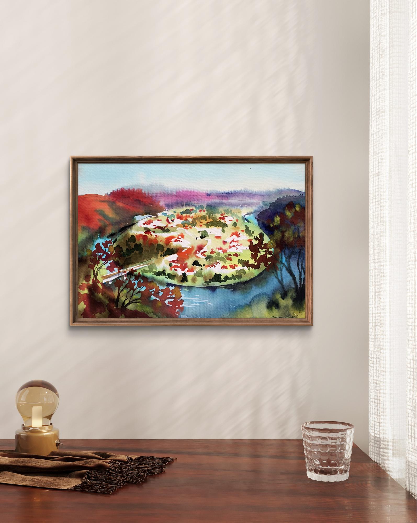 "View of the Reserve" is a vibrant and captivating watercolor painting that depicts a scenic landscape of a nature reserve. The artist uses a rich palette of colors and fluid brushstrokes to convey the beauty and tranquility of the natural environment. The foreground is dominated by rich, autumnal hues of red, orange, and green. The artist uses wet-on-wet techniques to create soft transitions between colors, giving the foliage a lively and dynamic appearance. The leaves and trees are rendered with loose, expressive brushstrokes, capturing the essence of the natural landscape. The midground features a variety of greens and yellows, suggesting fields or open areas within the reserve. The artist employs a mix of wet-on-dry techniques to add details and texture, creating a sense of depth and complexity in the vegetation. The background showcases a gradient of blues and purples, indicating distant hills or mountains. The use of cooler tones creates a sense of distance and atmospheric perspective. The sky transitions from a light, almost white blue at the horizon to deeper purples and reds, hinting at a sunset or early morning light. The painting is composed from an aerial perspective, giving a comprehensive view of the reserve. This viewpoint allows the viewer to take in the vastness and variety of the landscape, from the winding river to the expansive fields and dense forests. A meandering river flows through the reserve, its waters rendered in soft blues and greens. The river serves as a central element, guiding the viewer's eye through the composition and adding a sense of movement and continuity. The composition is balanced with the use of vibrant warm colors in the foreground and cooler, subdued tones in the background. This balance creates a harmonious and visually pleasing scene that captures the beauty of the reserve. The foliage, depicted in rich autumn colors, suggests a season of change and renewal. The artist’s use of loose, expressive brushstrokes conveys the energy and vibrancy of the vegetation. The river, winding through the landscape, adds a sense of tranquility and fluidity to the scene. The reflections in the water and the gentle curves of the river enhance the overall peaceful atmosphere. The distant hills or mountains provide a sense of scale and grandeur to the composition. The use of cooler tones and soft gradients in the background creates a sense of depth and distance, emphasizing the expansive nature of the reserve. The overall mood of "View of the Reserve" is one of serenity and natural beauty. The vibrant colors, fluid brushstrokes, and balanced composition evoke a sense of peace and appreciation for the natural world. The painting invites the viewer to immerse themselves in the tranquil beauty of the reserve, appreciating the harmony and vibrancy of nature. "View of the Reserve" can be interpreted as a celebration of nature’s beauty and the changing seasons. The rich autumnal colors and dynamic brushstrokes convey a sense of life and energy, while the serene river and distant hills evoke peace and tranquility. The painting captures a moment of natural harmony, inviting the viewer to reflect on the beauty and vitality of the natural world. Overall, "View of the Reserve" is a beautifully rendered watercolor painting that captures the vibrant and tranquil essence of a nature reserve. The harmonious colors, fluid brushstrokes, and serene composition create a sense of peace and appreciation for the beauty of nature.
