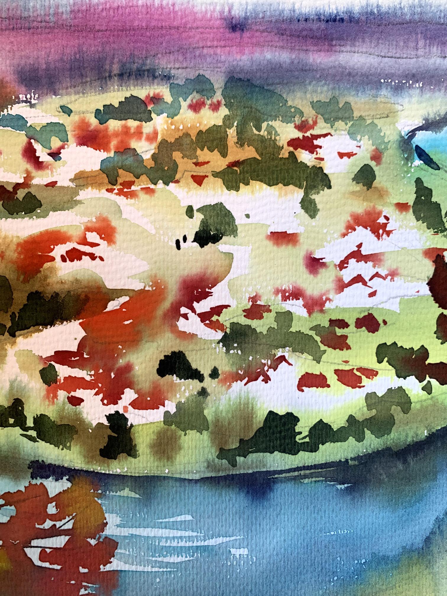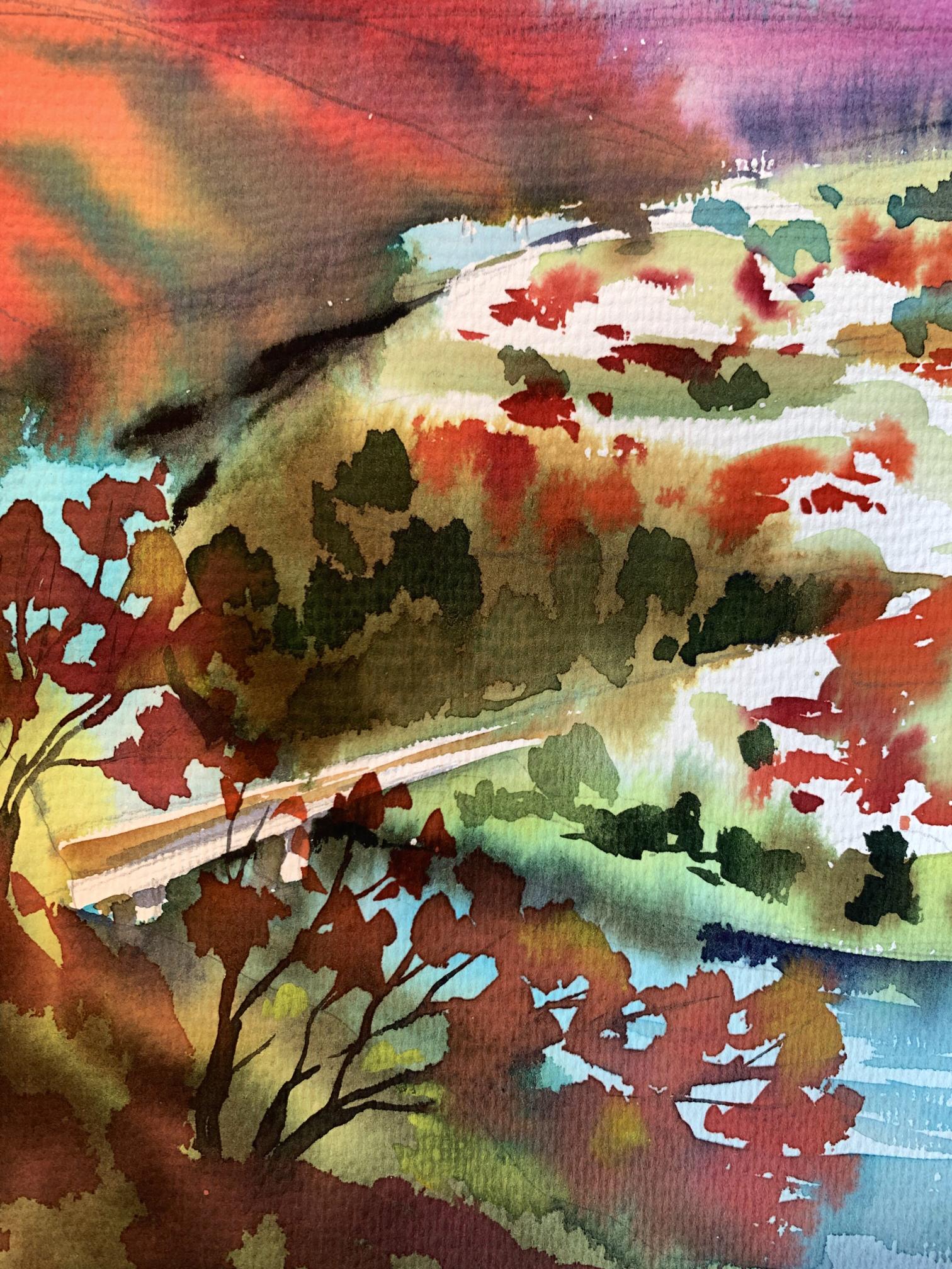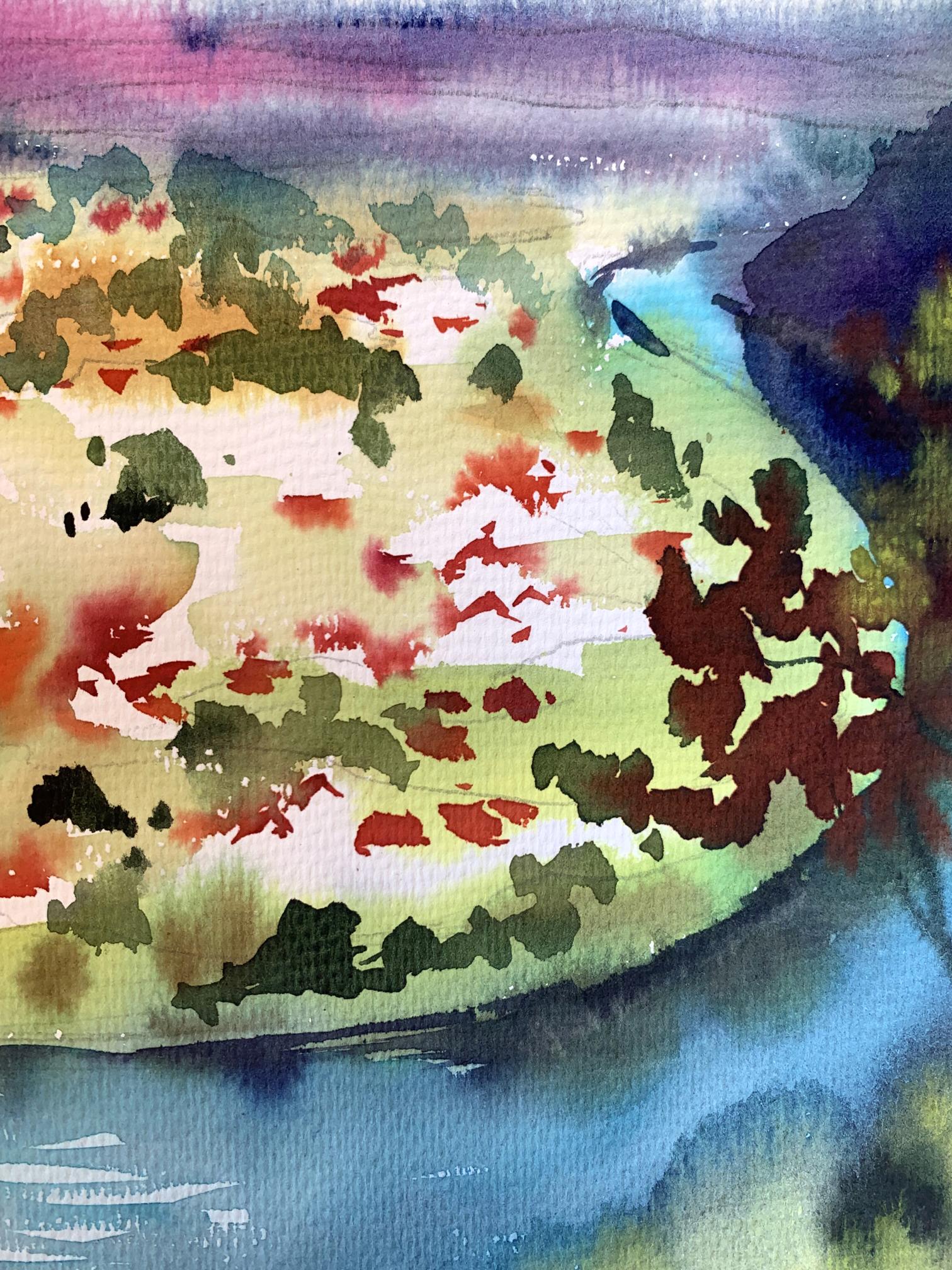 "View of the Reserve" is a vibrant and captivating watercolor painting that depicts a scenic landscape of a nature reserve. The artist uses a rich palette of colors and fluid brushstrokes to convey the beauty and tranquility of the natural environment. The foreground is dominated by rich, autumnal hues of red, orange, and green. The artist uses wet-on-wet techniques to create soft transitions between colors, giving the foliage a lively and dynamic appearance. The leaves and trees are rendered with loose, expressive brushstrokes, capturing the essence of the natural landscape. The midground features a variety of greens and yellows, suggesting fields or open areas within the reserve. The artist employs a mix of wet-on-dry techniques to add details and texture, creating a sense of depth and complexity in the vegetation. The background showcases a gradient of blues and purples, indicating distant hills or mountains. The use of cooler tones creates a sense of distance and atmospheric perspective. The sky transitions from a light, almost white blue at the horizon to deeper purples and reds, hinting at a sunset or early morning light. The painting is composed from an aerial perspective, giving a comprehensive view of the reserve. This viewpoint allows the viewer to take in the vastness and variety of the landscape, from the winding river to the expansive fields and dense forests. A meandering river flows through the reserve, its waters rendered in soft blues and greens. The river serves as a central element, guiding the viewer's eye through the composition and adding a sense of movement and continuity. The composition is balanced with the use of vibrant warm colors in the foreground and cooler, subdued tones in the background. This balance creates a harmonious and visually pleasing scene that captures the beauty of the reserve. The foliage, depicted in rich autumn colors, suggests a season of change and renewal. The artist’s use of loose, expressive brushstrokes conveys the energy and vibrancy of the vegetation. The river, winding through the landscape, adds a sense of tranquility and fluidity to the scene. The reflections in the water and the gentle curves of the river enhance the overall peaceful atmosphere. The distant hills or mountains provide a sense of scale and grandeur to the composition. The use of cooler tones and soft gradients in the background creates a sense of depth and distance, emphasizing the expansive nature of the reserve. The overall mood of "View of the Reserve" is one of serenity and natural beauty. The vibrant colors, fluid brushstrokes, and balanced composition evoke a sense of peace and appreciation for the natural world. The painting invites the viewer to immerse themselves in the tranquil beauty of the reserve, appreciating the harmony and vibrancy of nature. "View of the Reserve" can be interpreted as a celebration of nature’s beauty and the changing seasons. The rich autumnal colors and dynamic brushstrokes convey a sense of life and energy, while the serene river and distant hills evoke peace and tranquility. The painting captures a moment of natural harmony, inviting the viewer to reflect on the beauty and vitality of the natural world. Overall, "View of the Reserve" is a beautifully rendered watercolor painting that captures the vibrant and tranquil essence of a nature reserve. The harmonious colors, fluid brushstrokes, and serene composition create a sense of peace and appreciation for the beauty of nature.